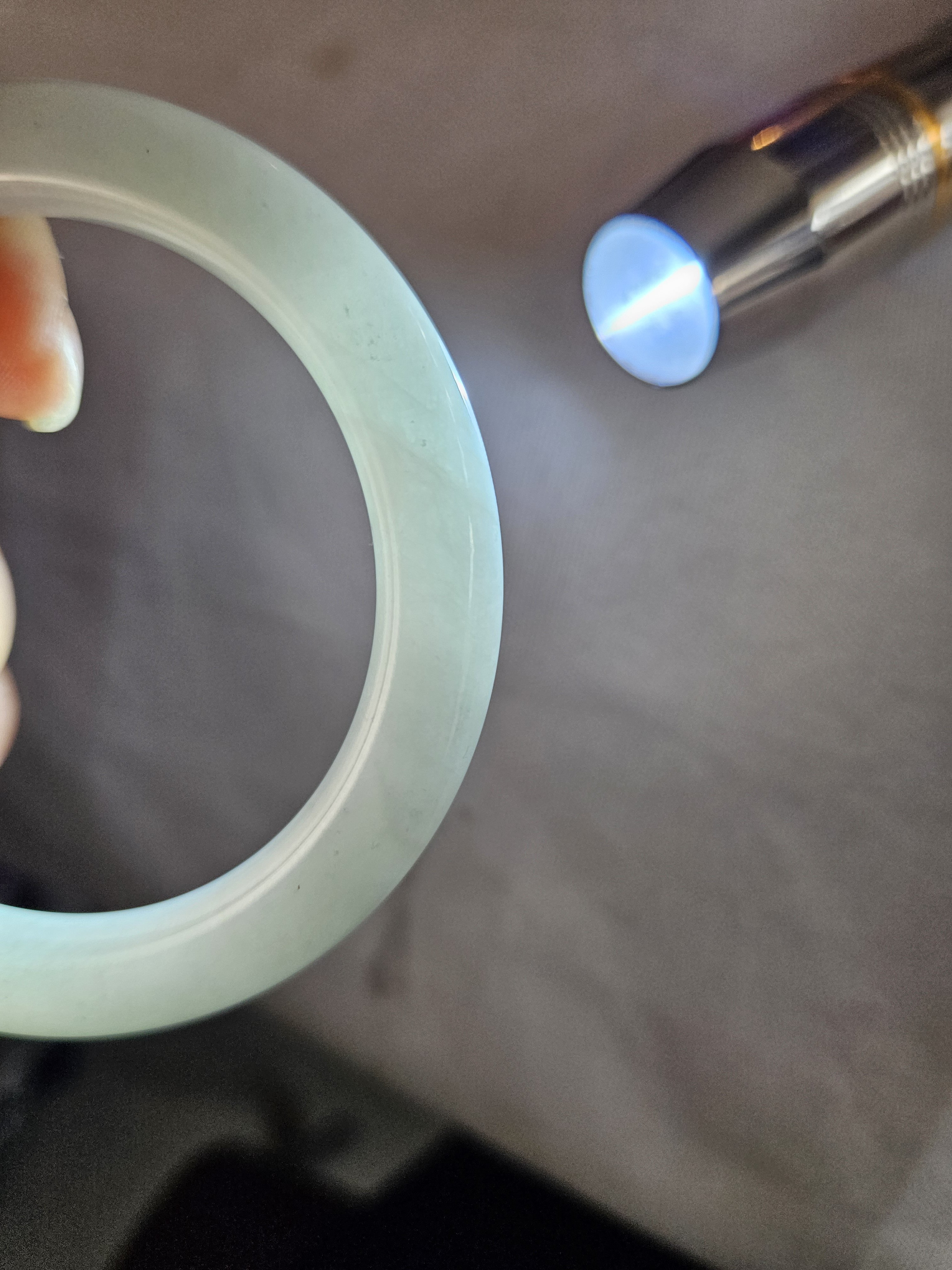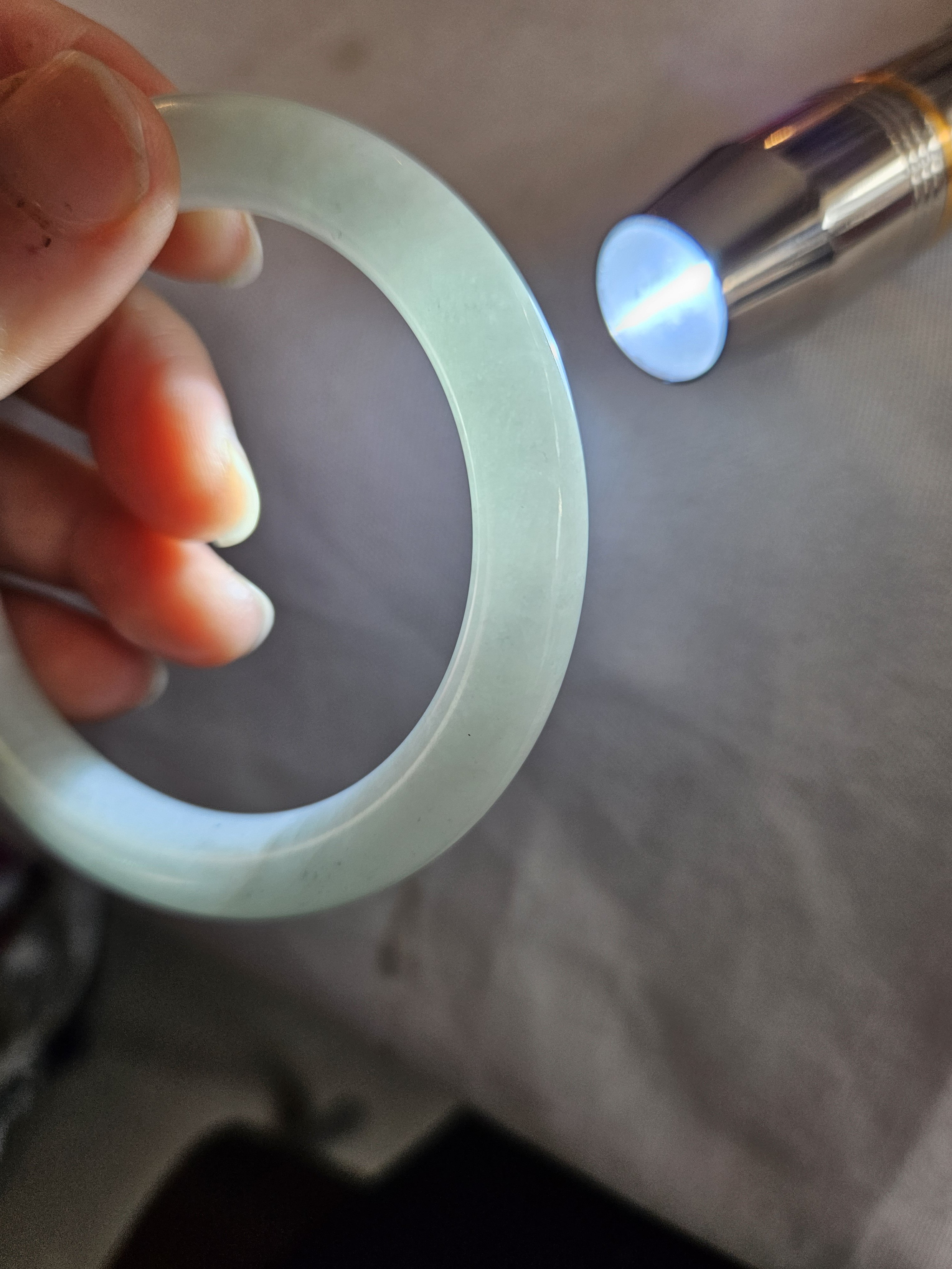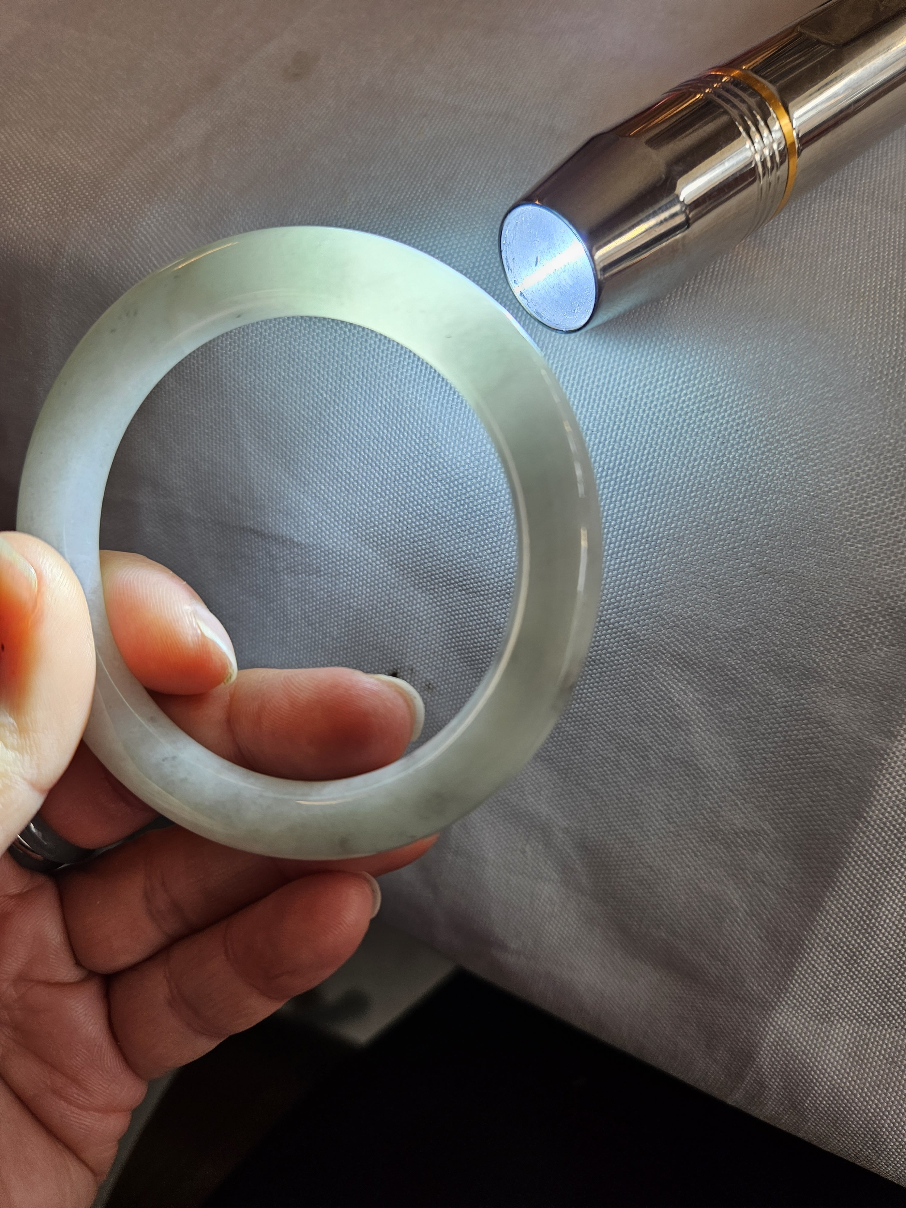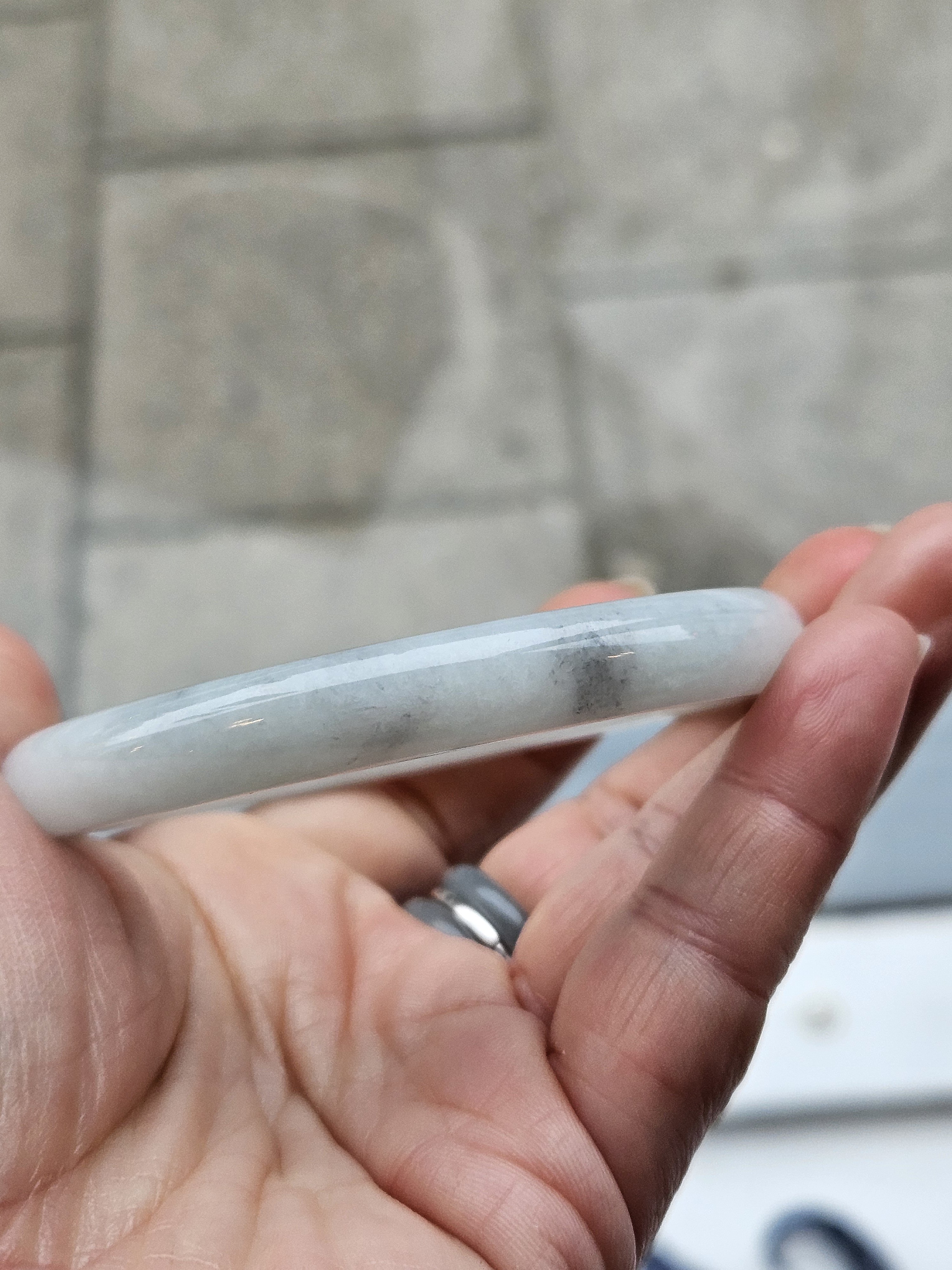Fits up to 57mm, this lovely pale green with smoky grey patch is made of Burmese jadeite bangle measures 55.6 x 9.2 x 9.4mm, weighs 48.43g, comes with a certificate of authenticity £149, it does have internal cracks that is prevalent in natural stones and does not affect usage.