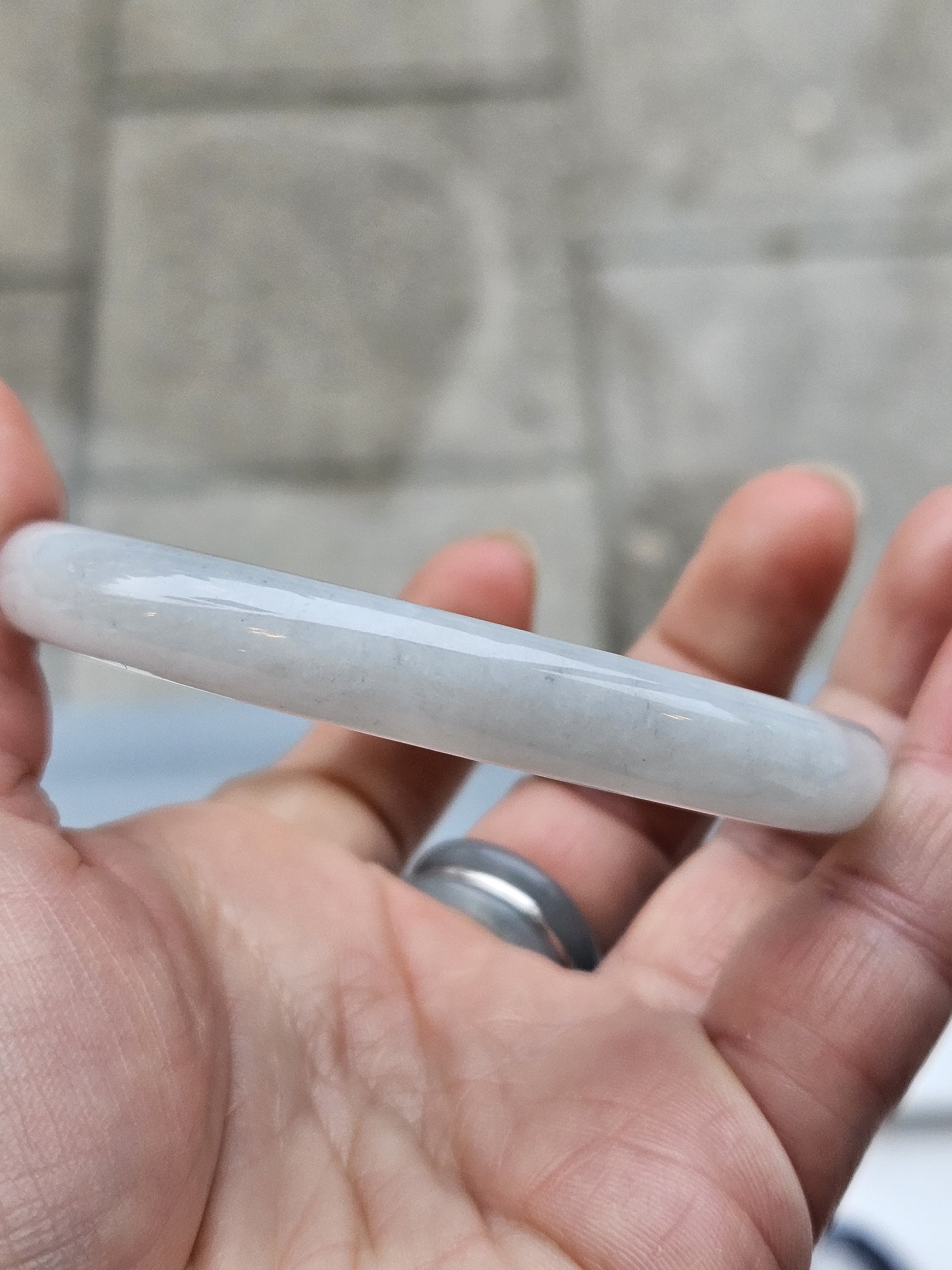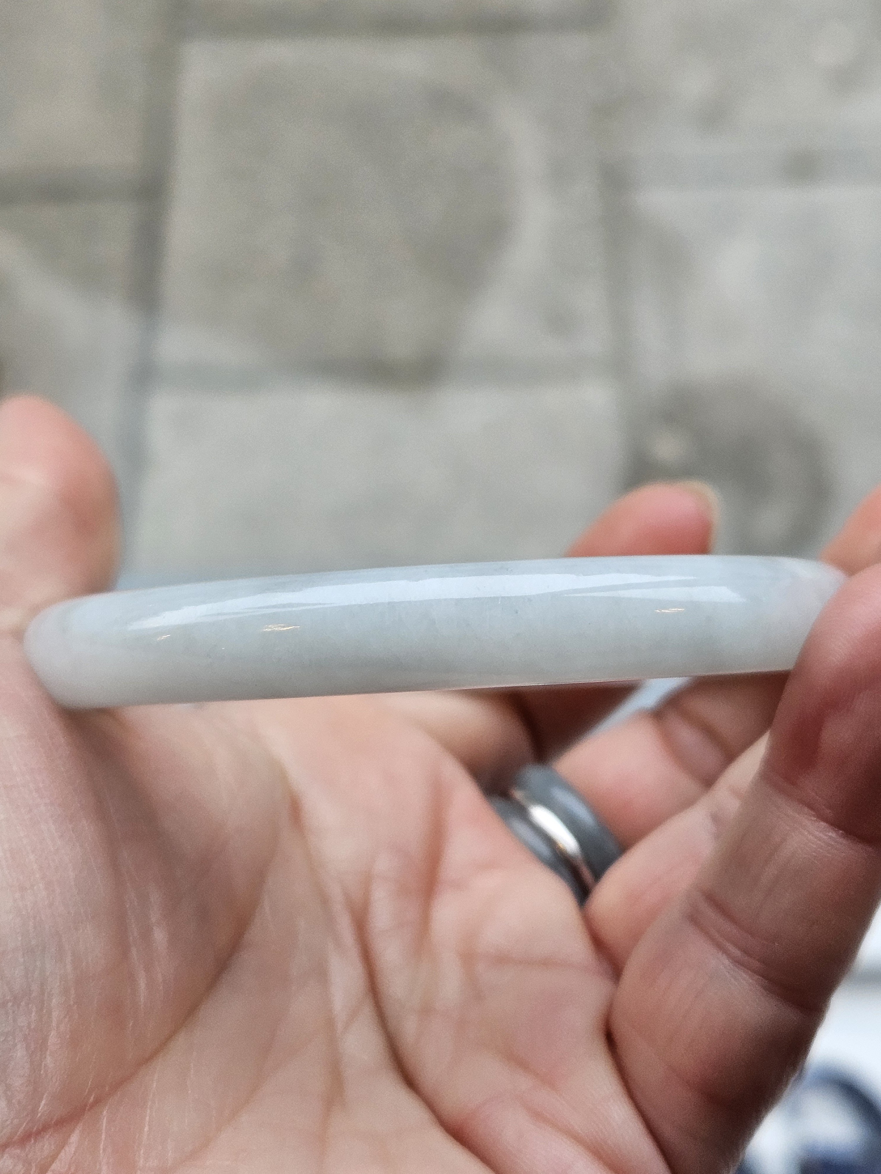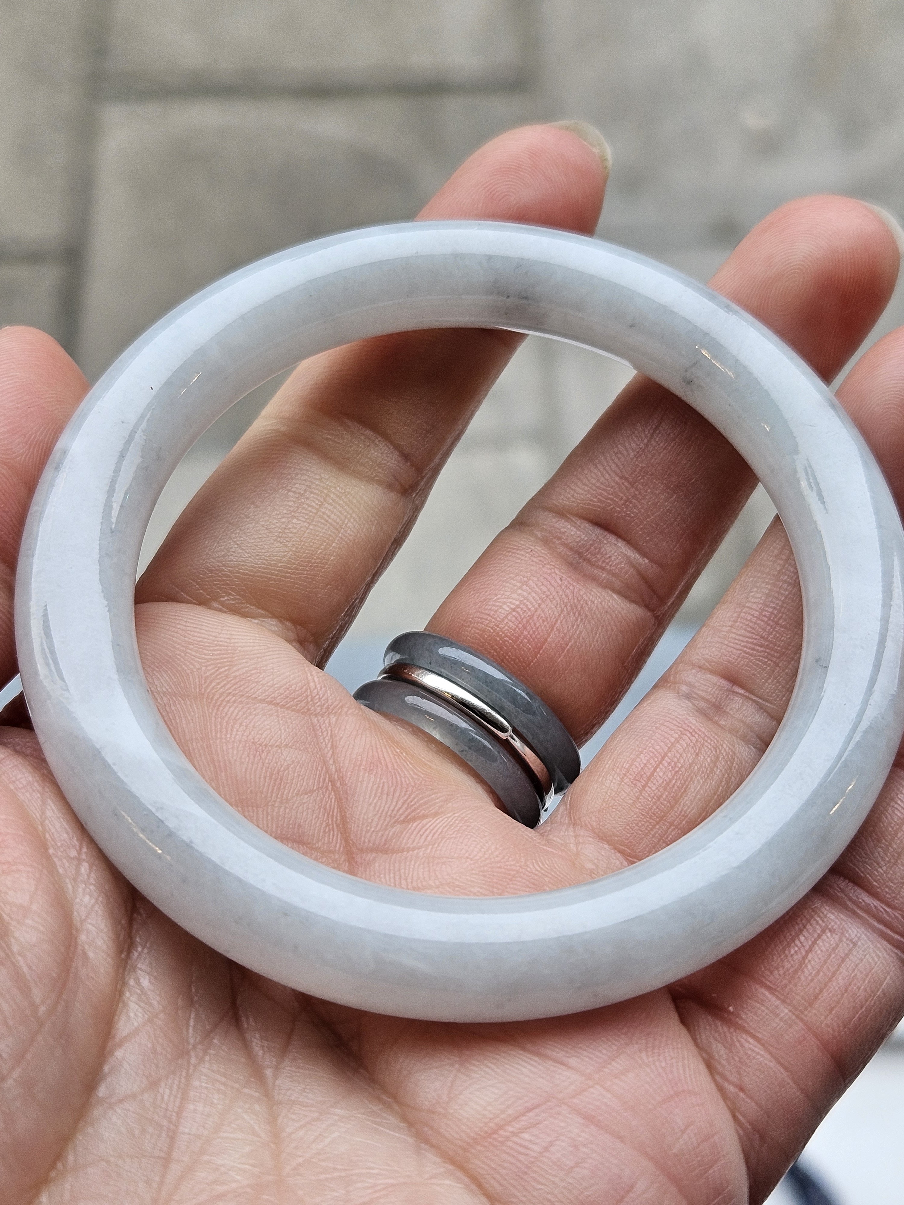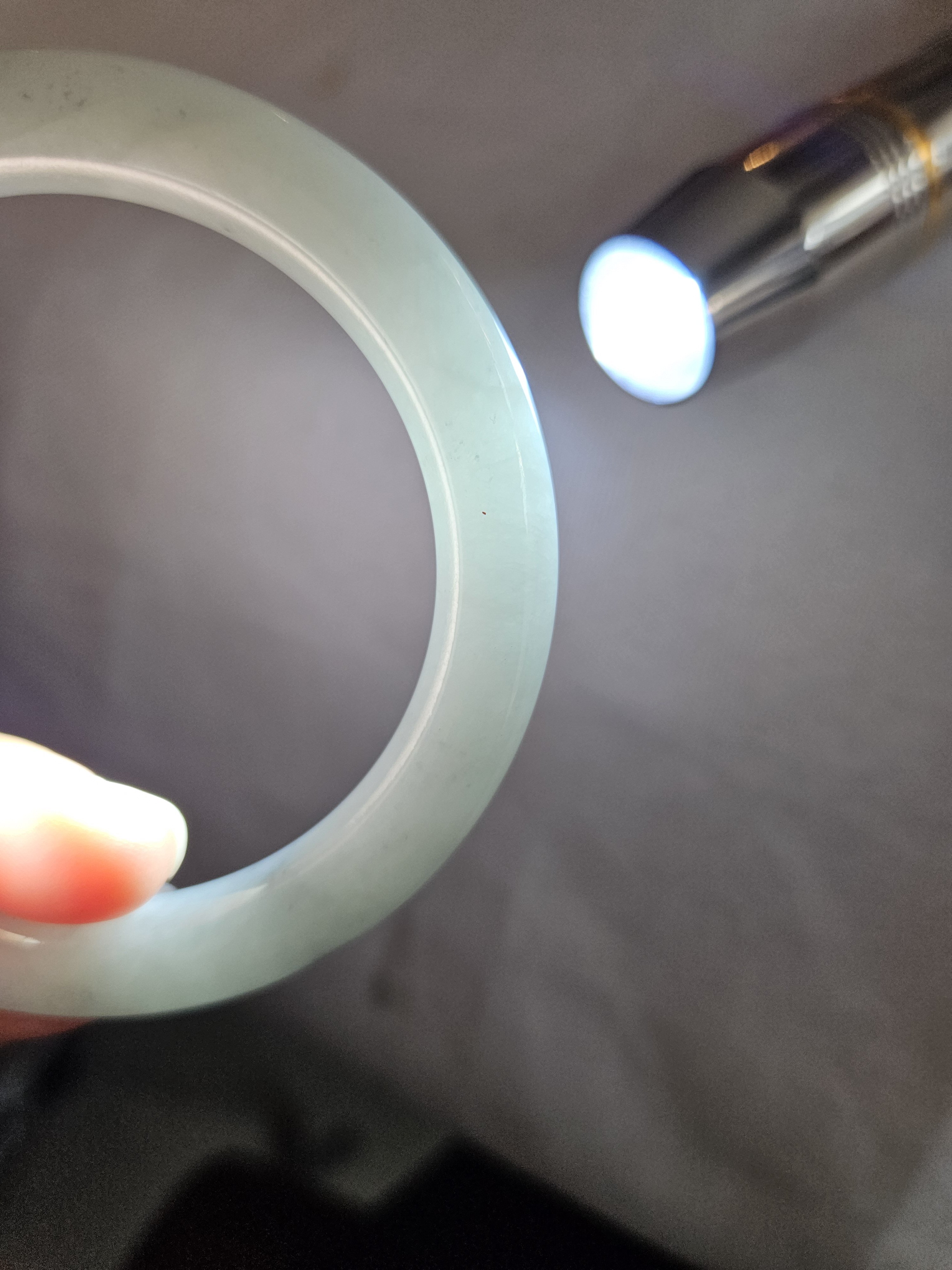 Fits up to 57mm, this lovely pale green with smoky grey patch is made of Burmese jadeite bangle measures 55.6 x 9.2 x 9.4mm, weighs 48.43g, comes with a certificate of authenticity £149, it does have internal cracks that is prevalent in natural stones and does not affect usage.