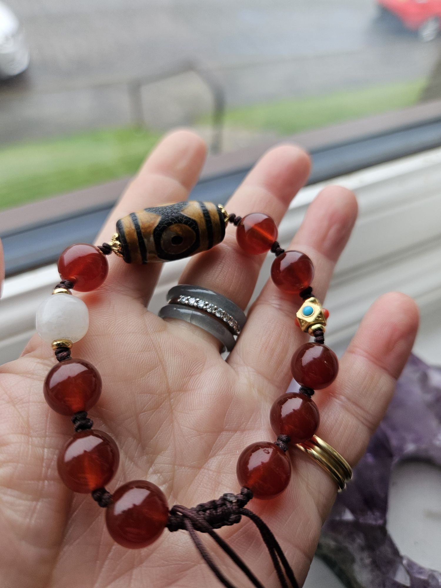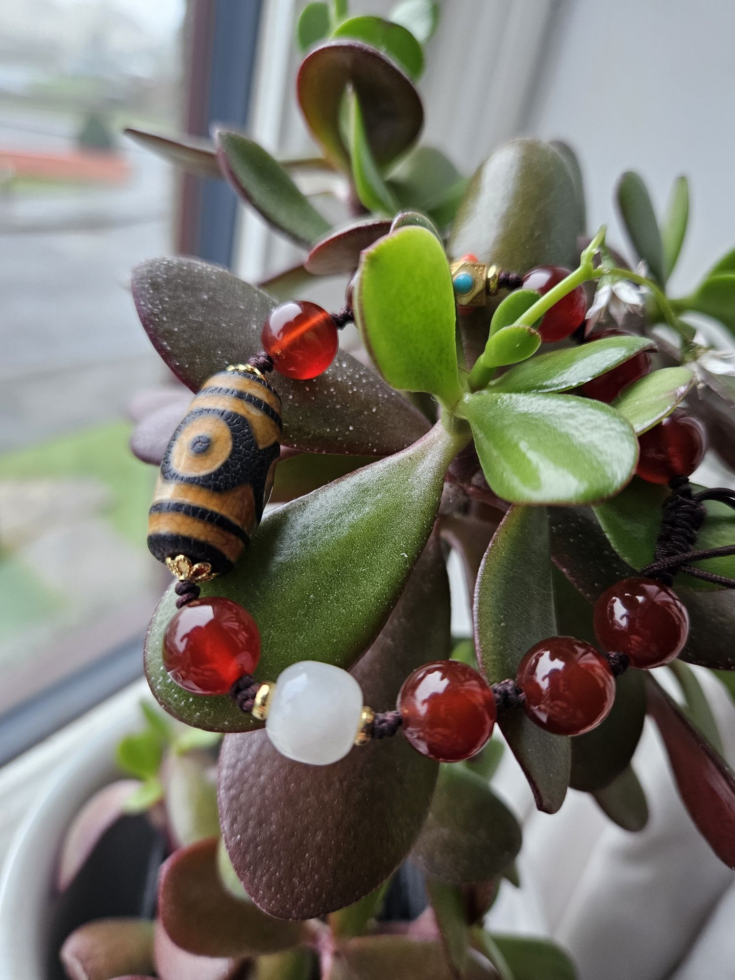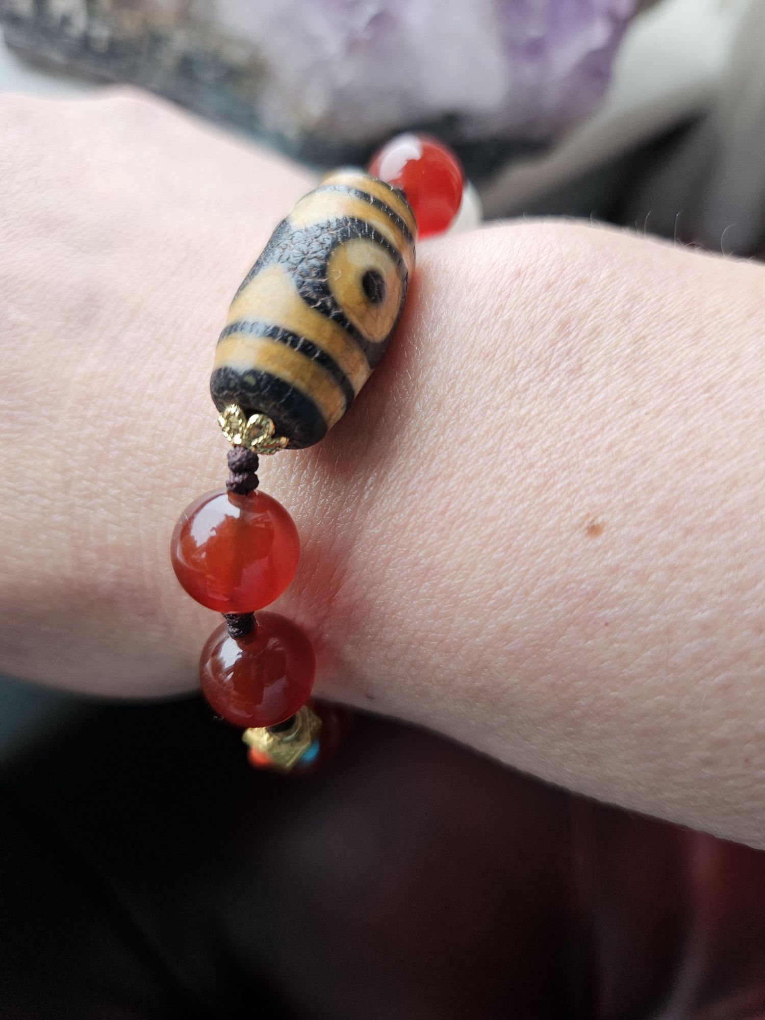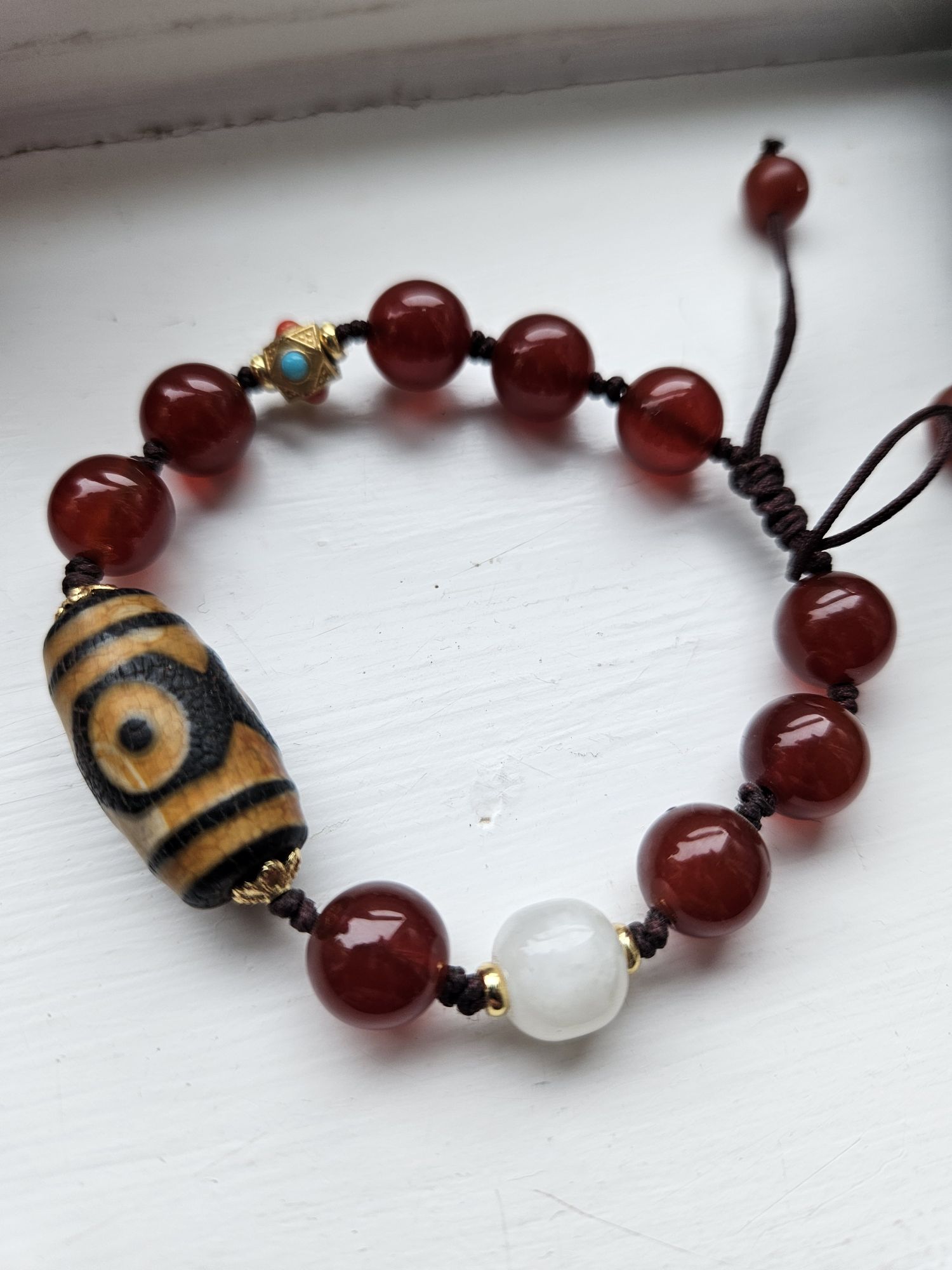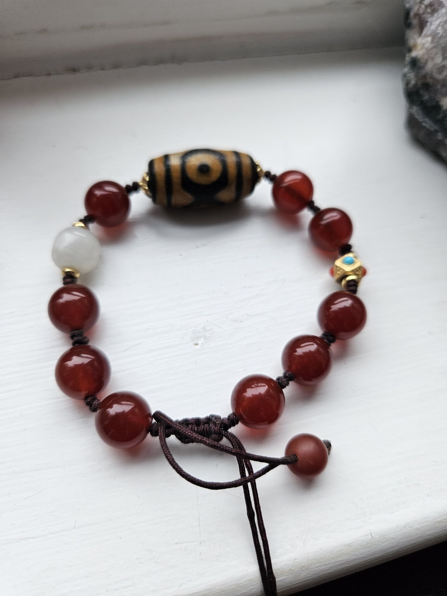 Dzi bead with 3 eyes signify luck, happiness, honour and longevity. Comes with an adjustable bracelet with red and white agate. Suits unisex. £25