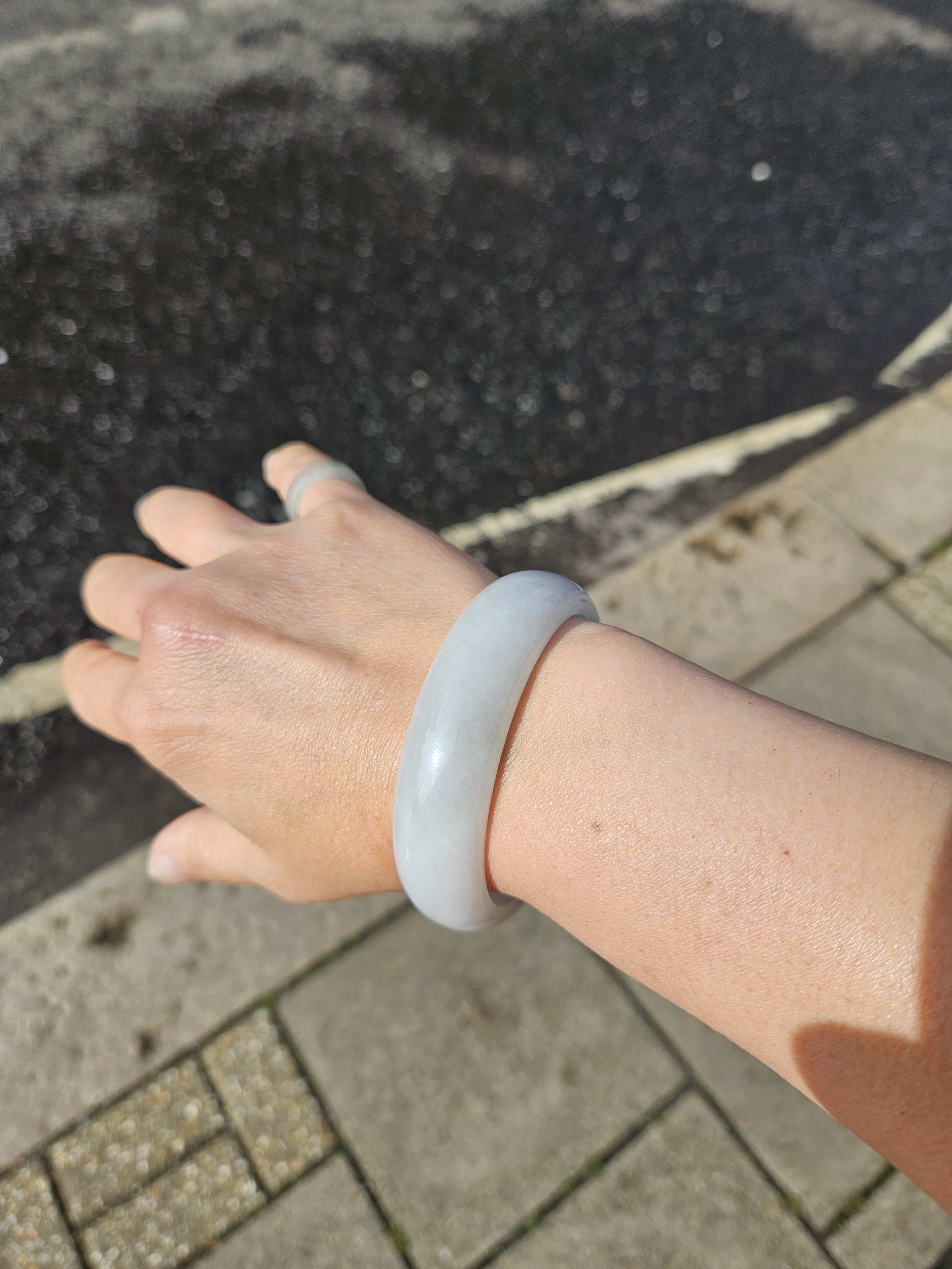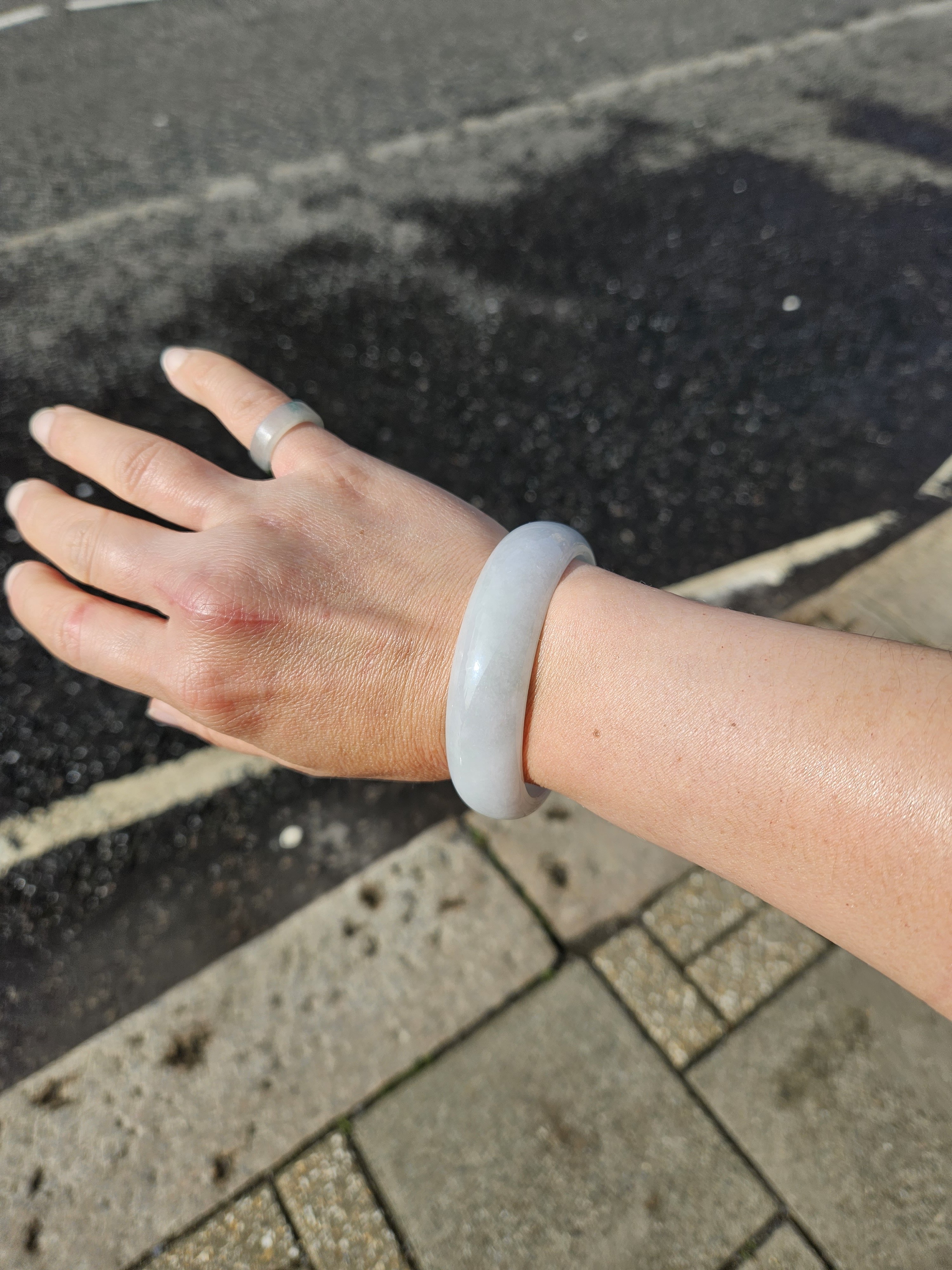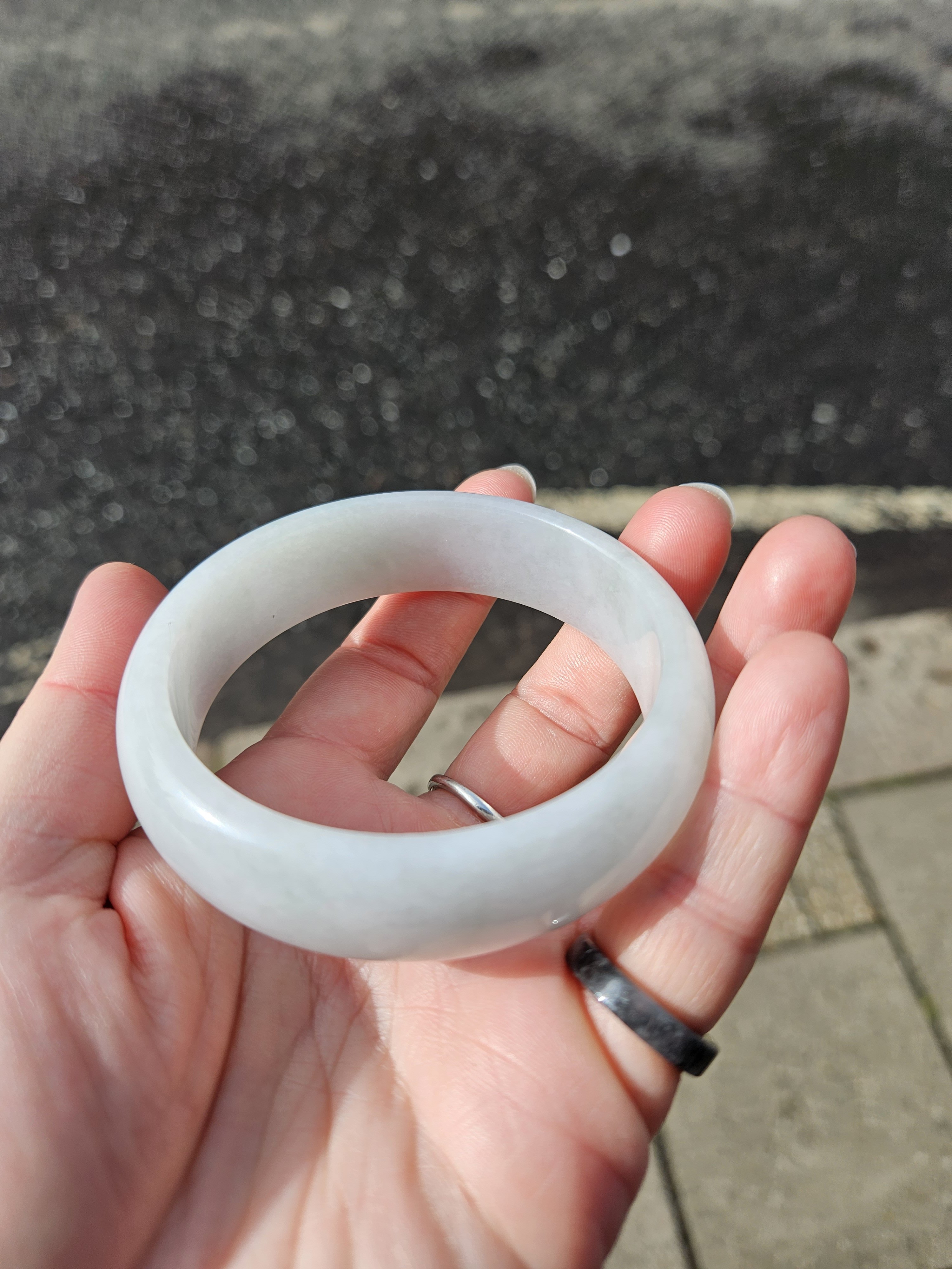 Gorgeous and modern looking Burmese jadeite bangle measures 58.1 x 17.3 x 7.6mm, weighs 71.38g, comes with a certificate of authenticity £538