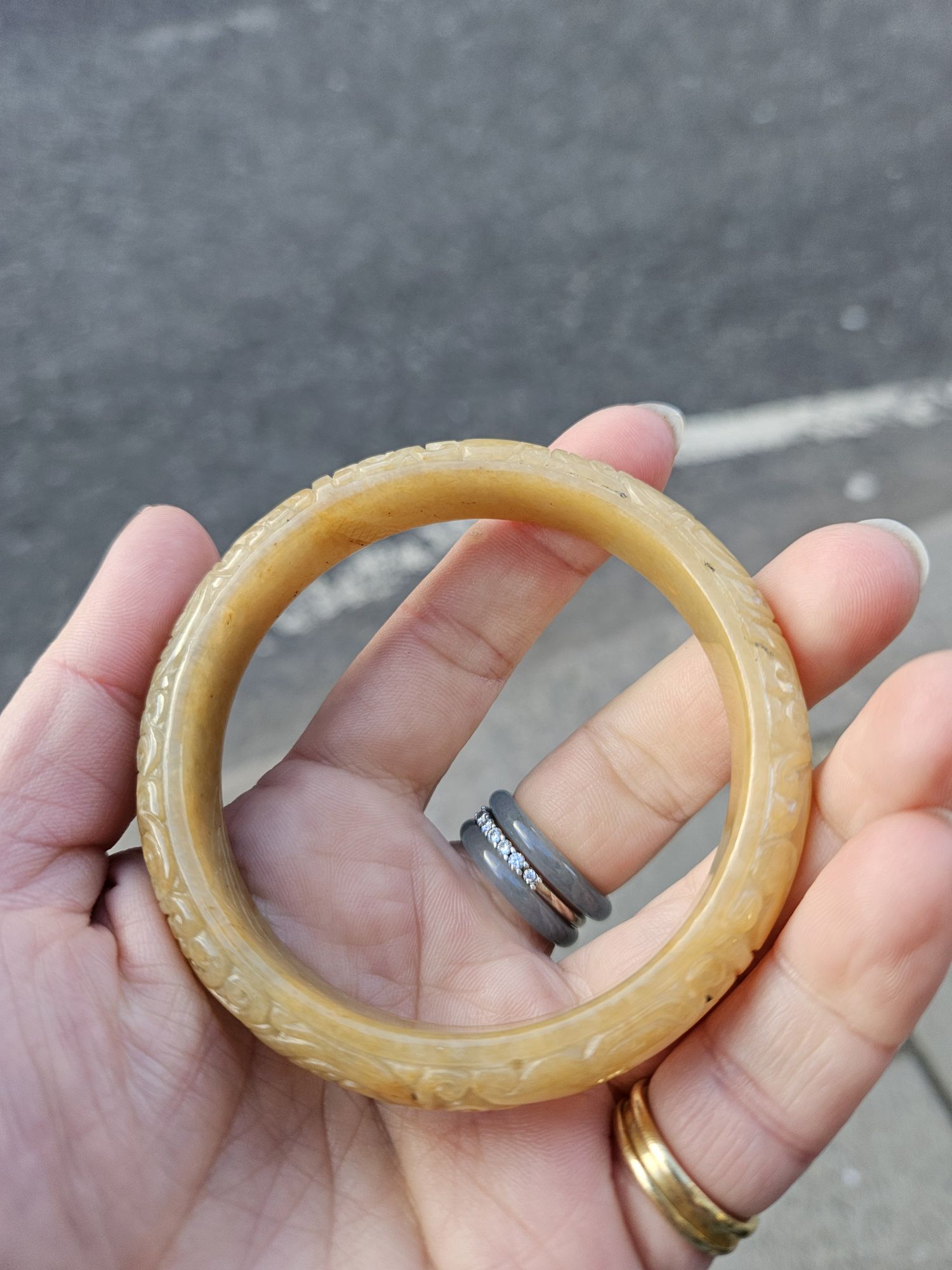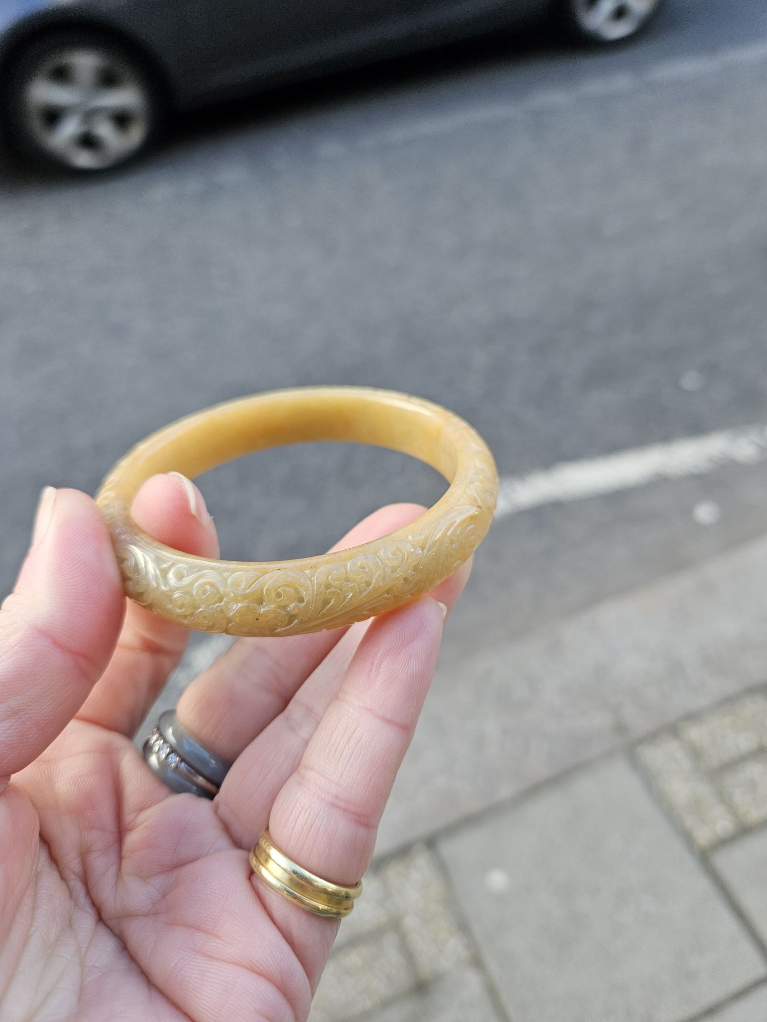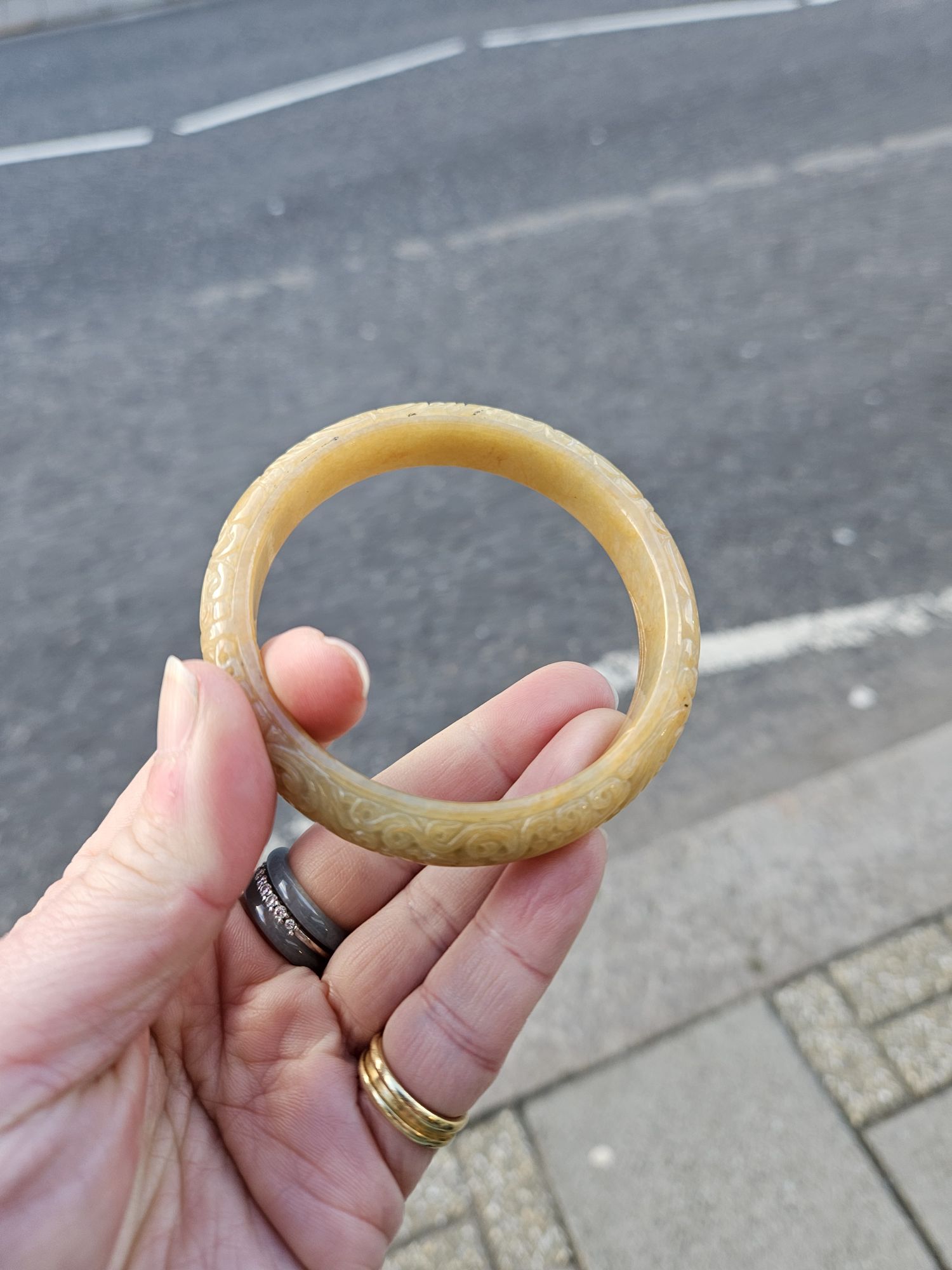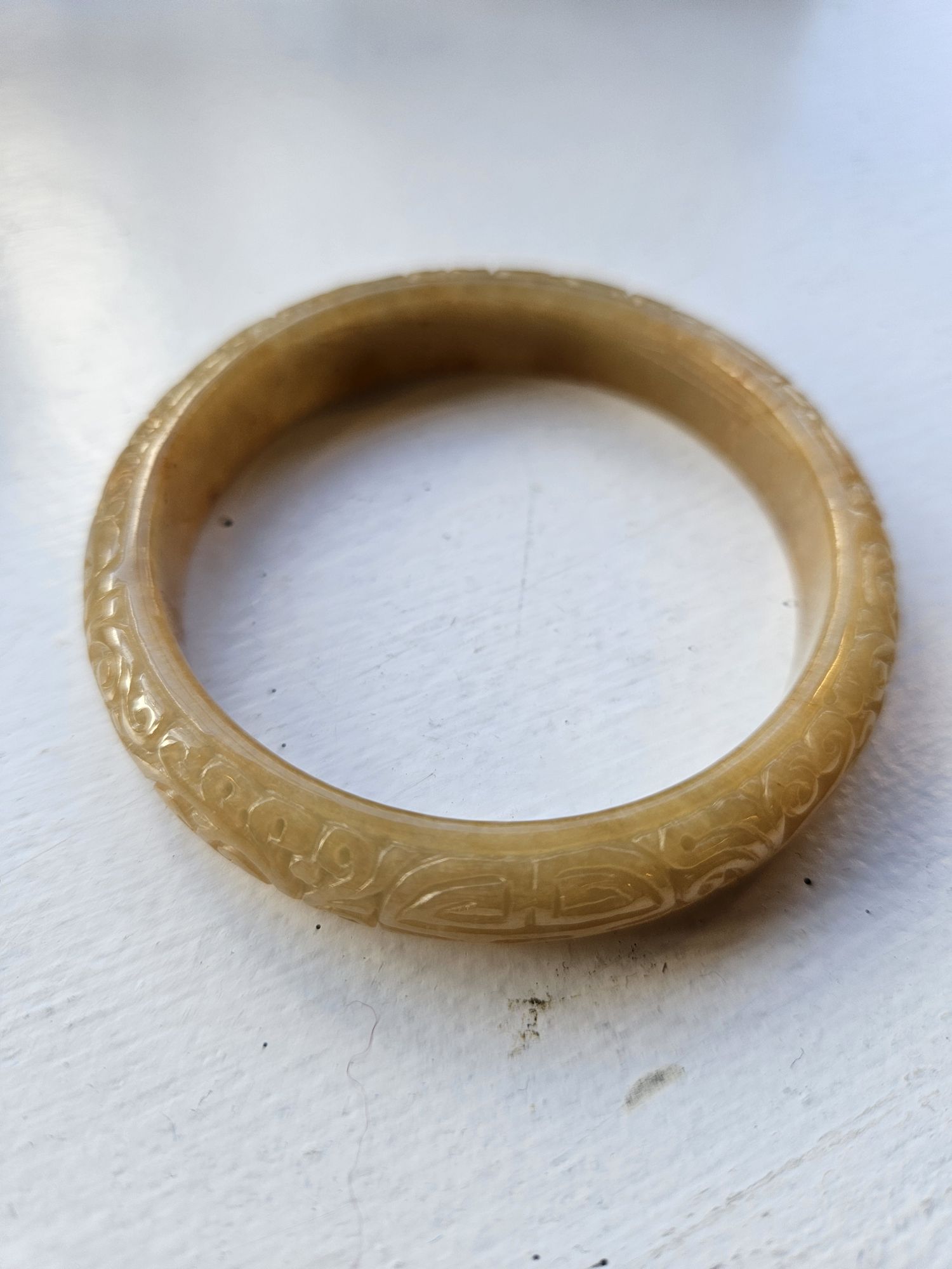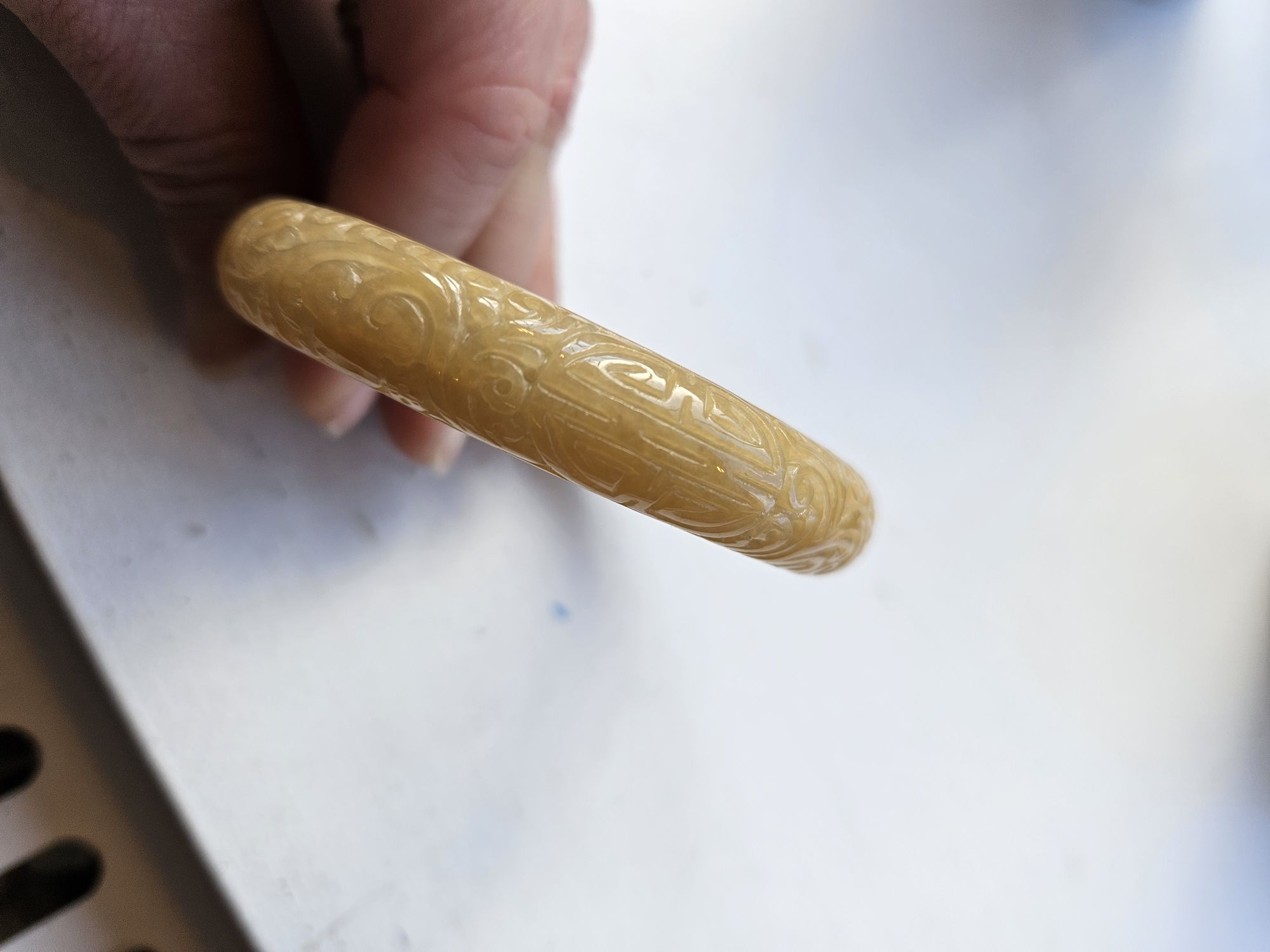 Beautiful full yellow Burmese jadeite bangle carved in a traditional design with luck clouds, money and double happiness. Measures 58.7 x 12 x 8.2mm, weighs 48.66g, comes with a certificate of authenticity. £ 548
