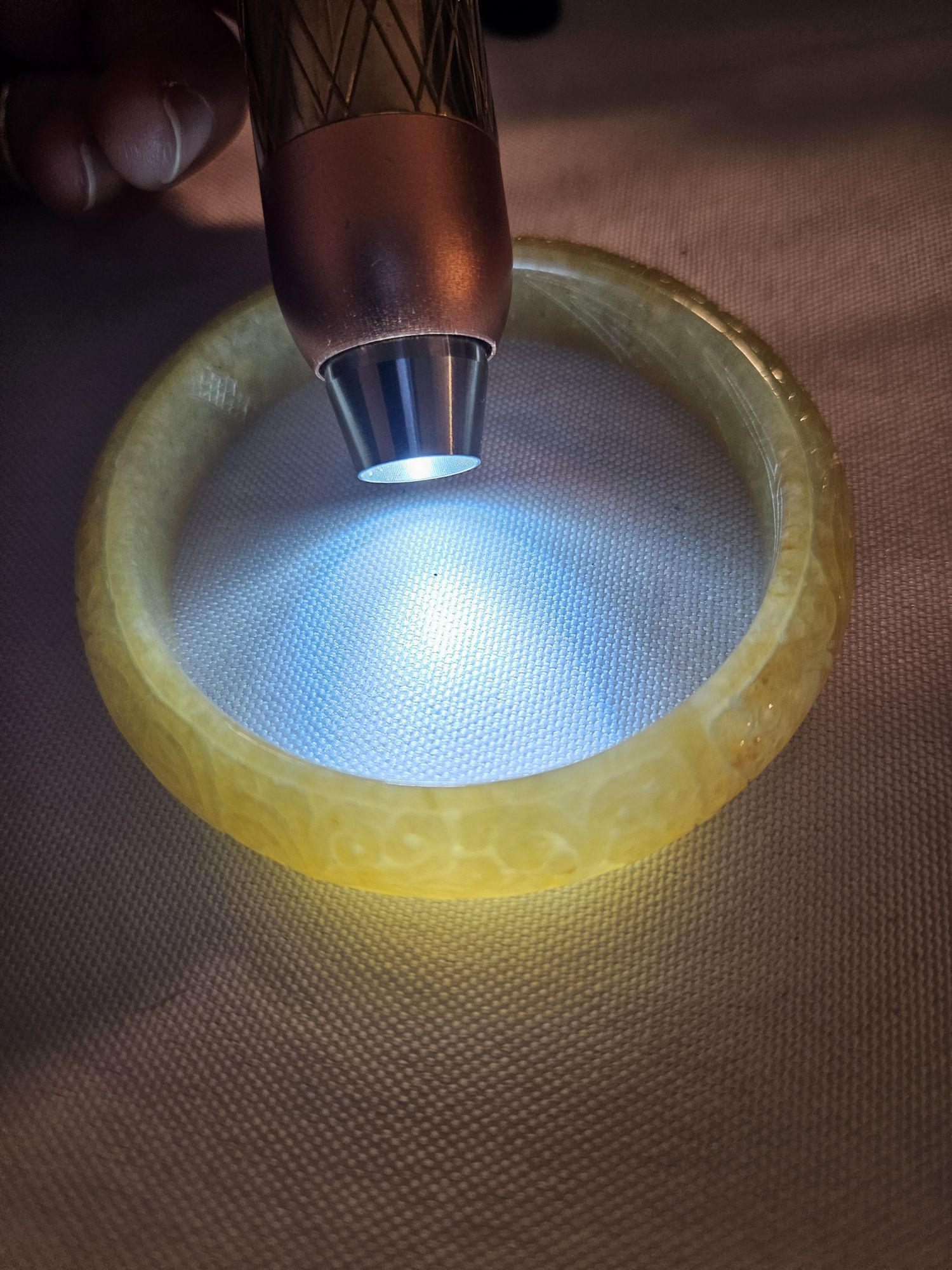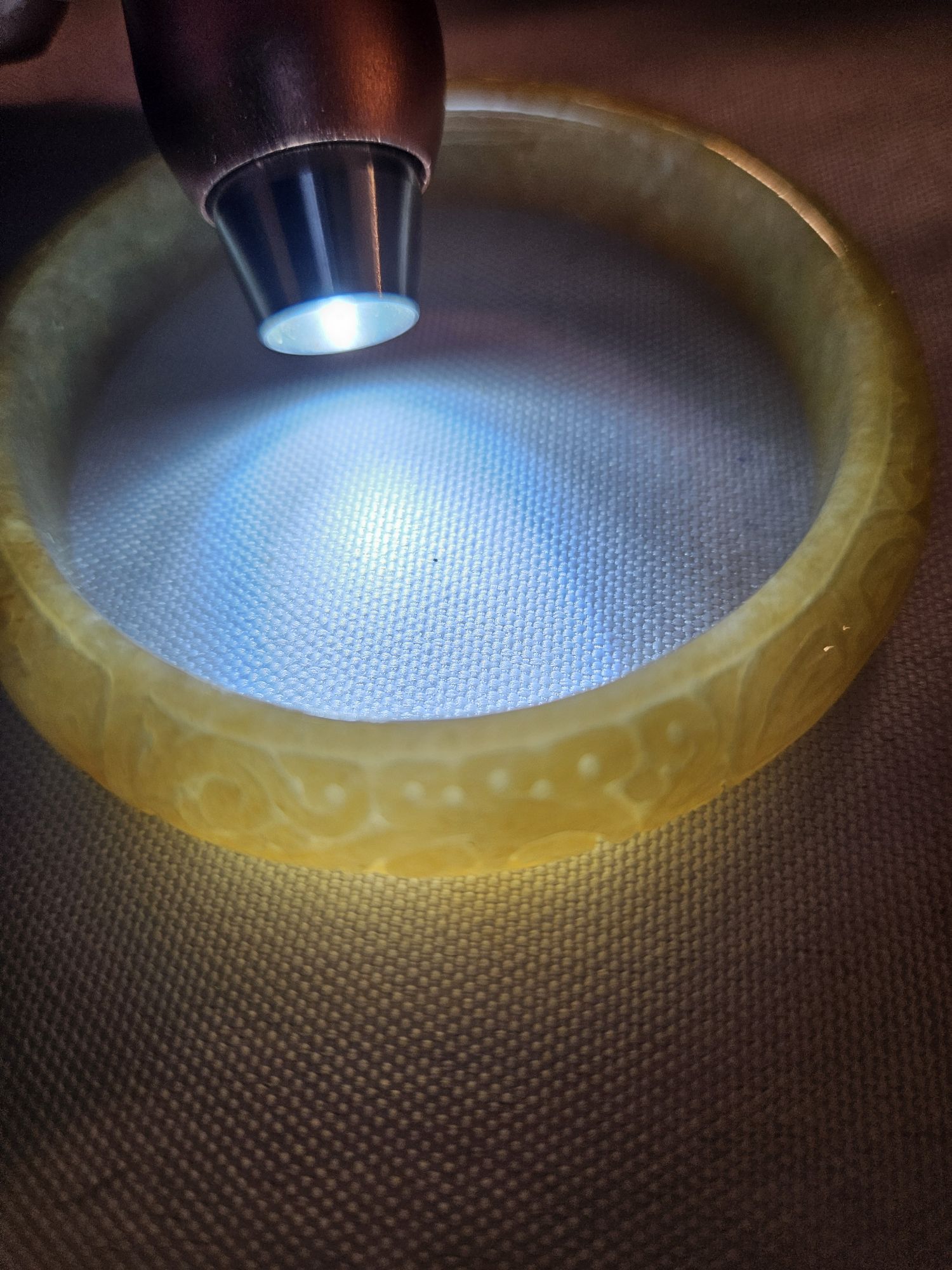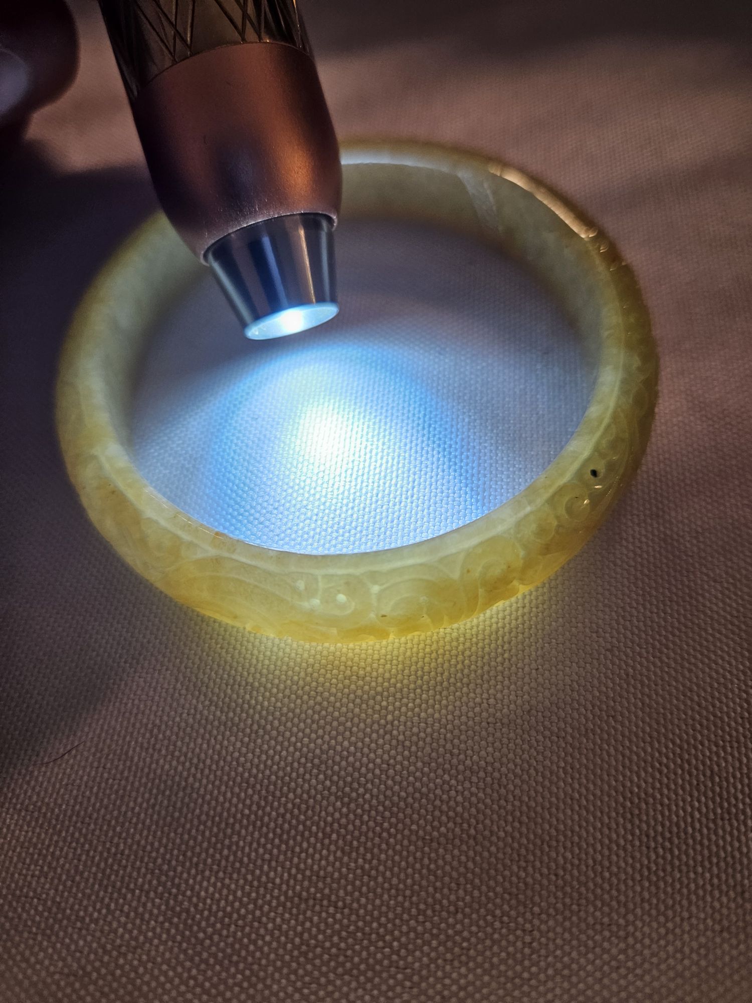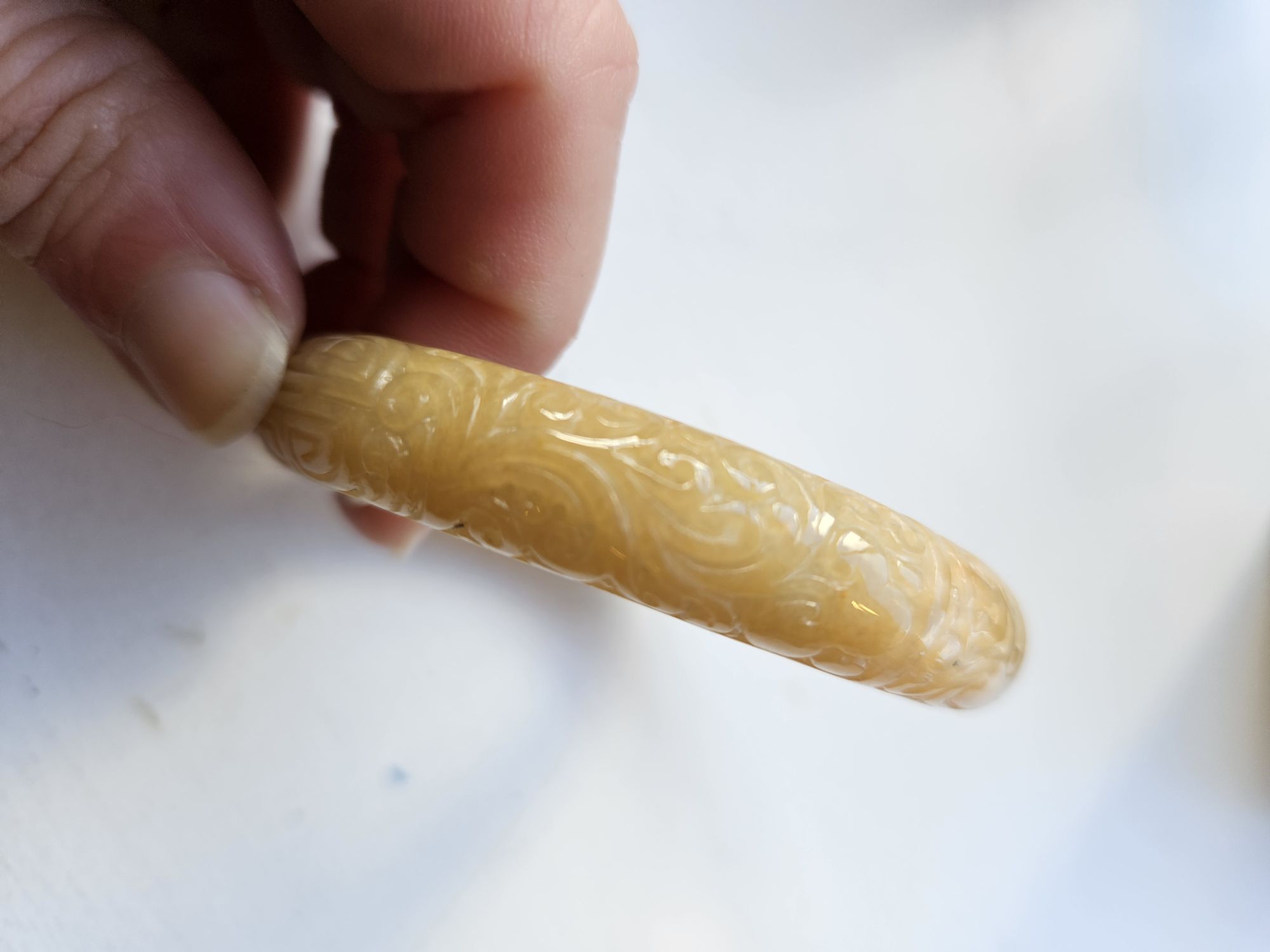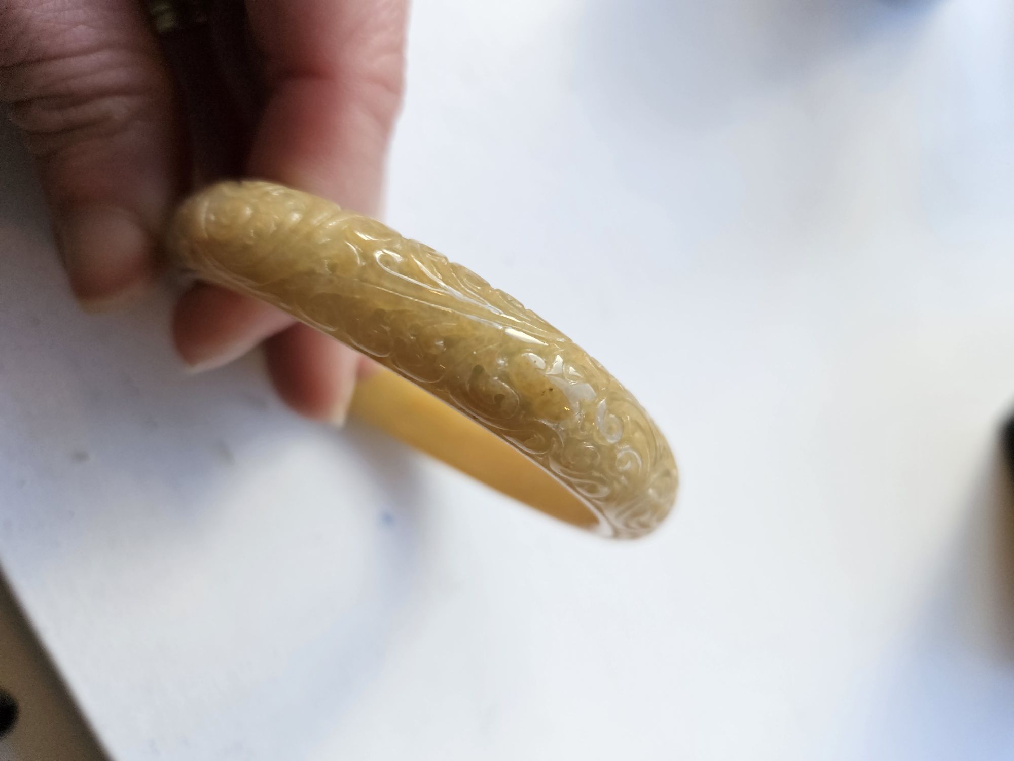 Beautiful full yellow Burmese jadeite bangle carved in a traditional design with luck clouds, money and double happiness. Measures 58.7 x 12 x 8.2mm, weighs 48.66g, comes with a certificate of authenticity. £ 548
