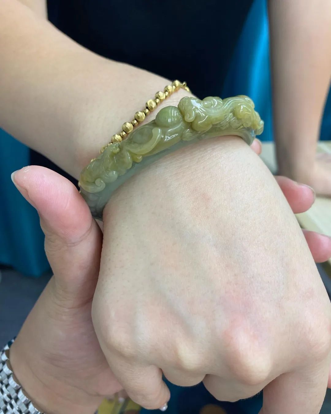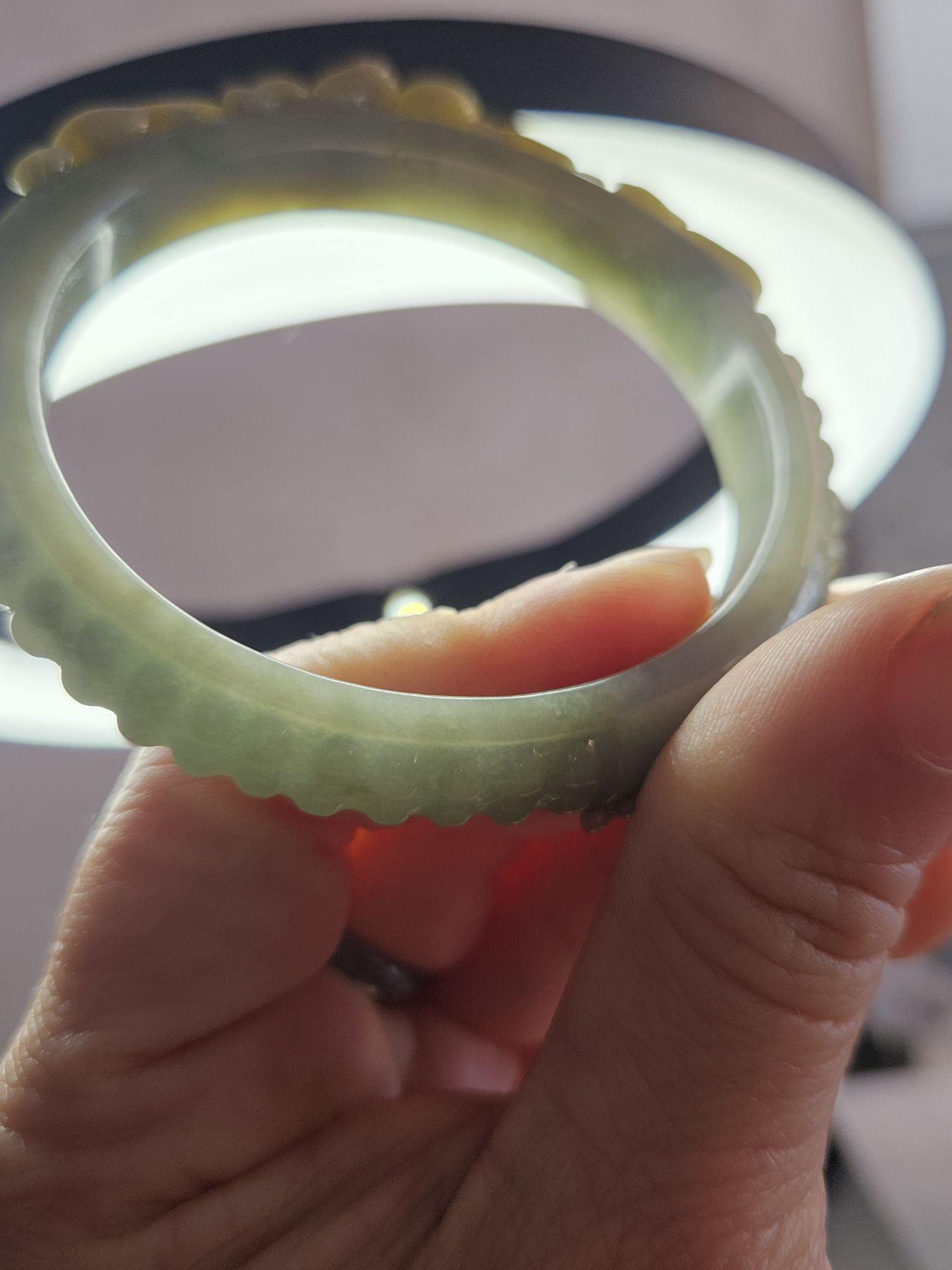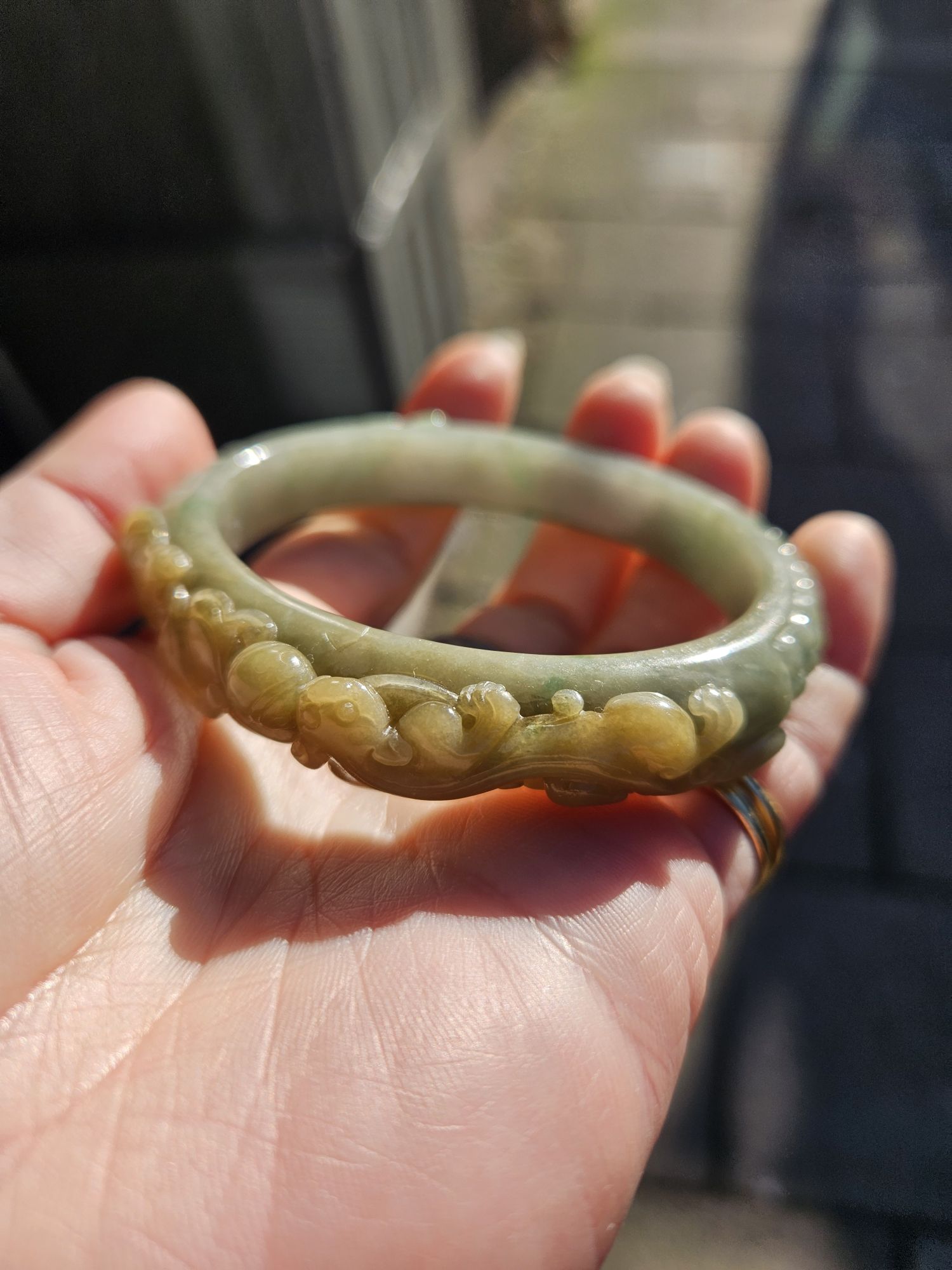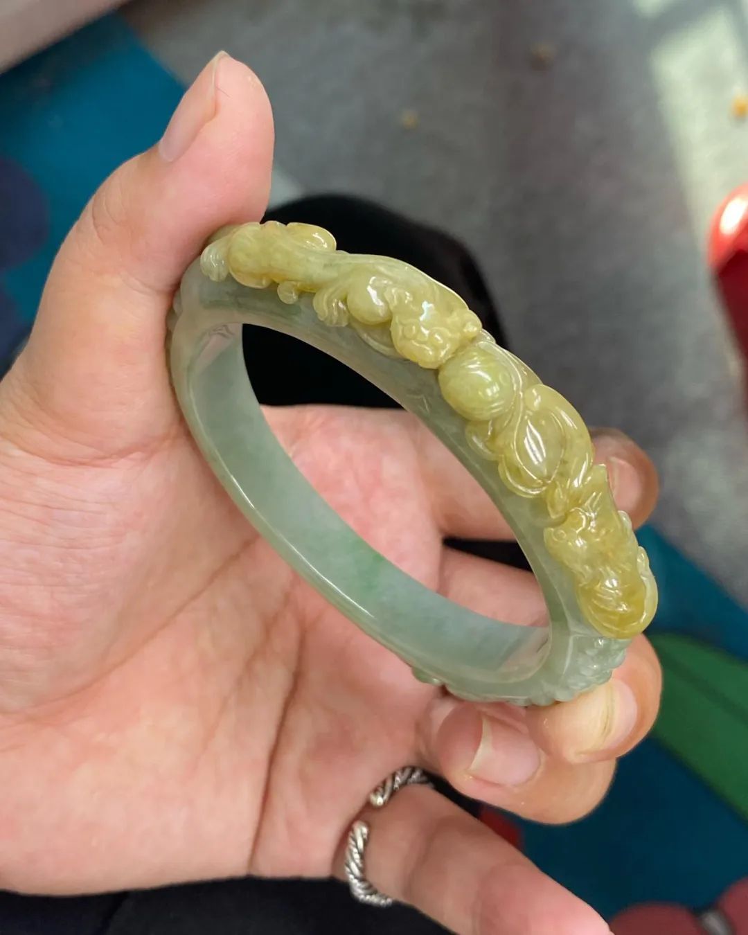 Beautiful bangle in yellow and green engraved with pixiu, bat,and ruyi. Loosely translated, the whole bangle meant the good fortune is right in front of you. Pixiu to attract wealth and deflect bad vibes.