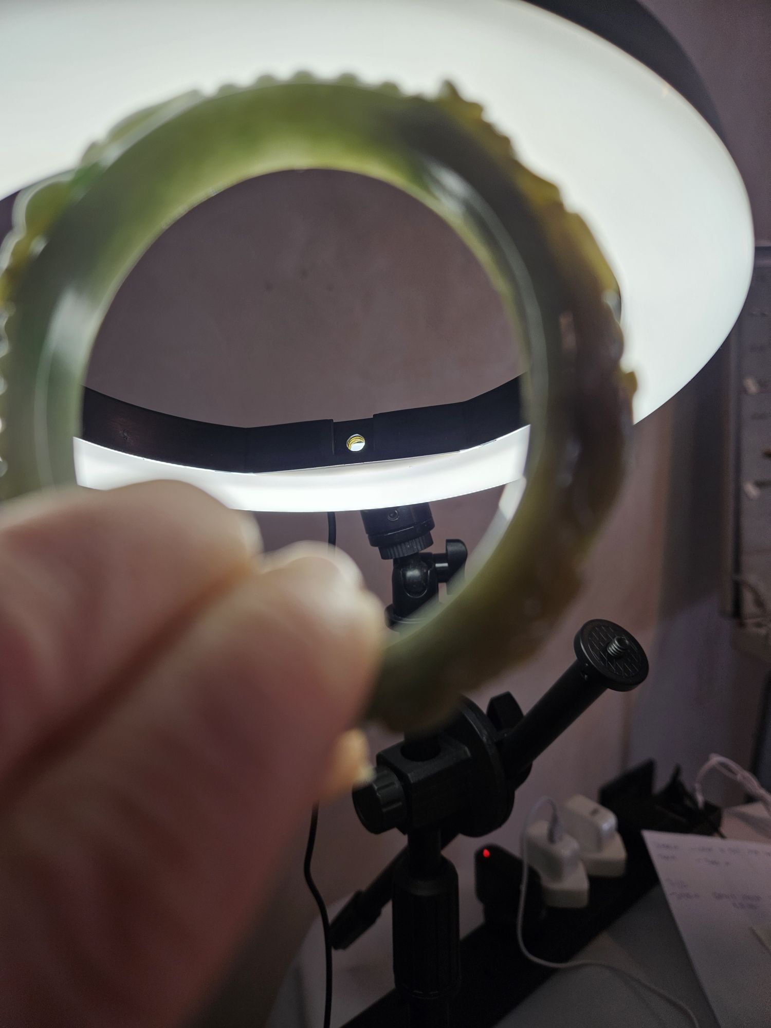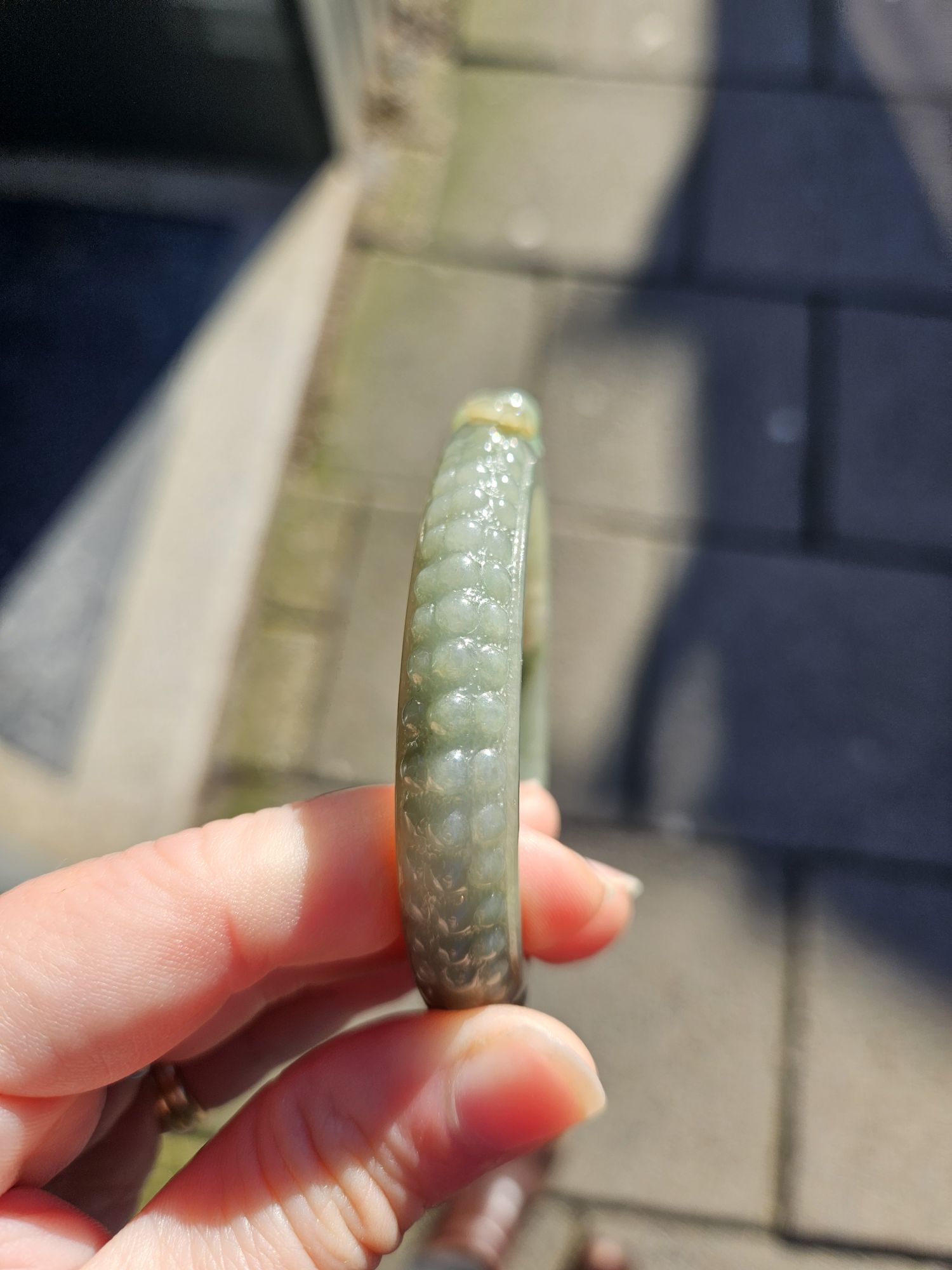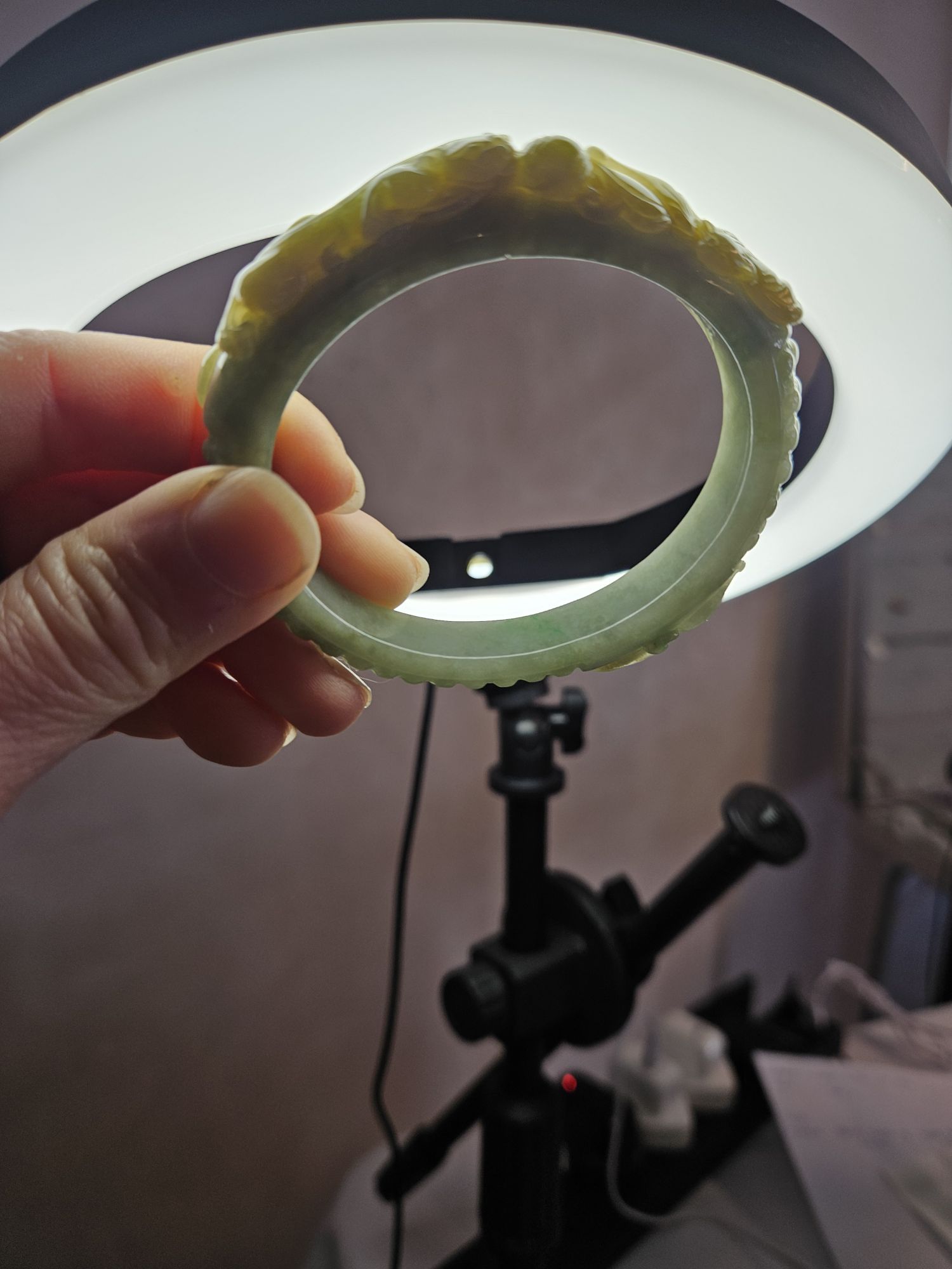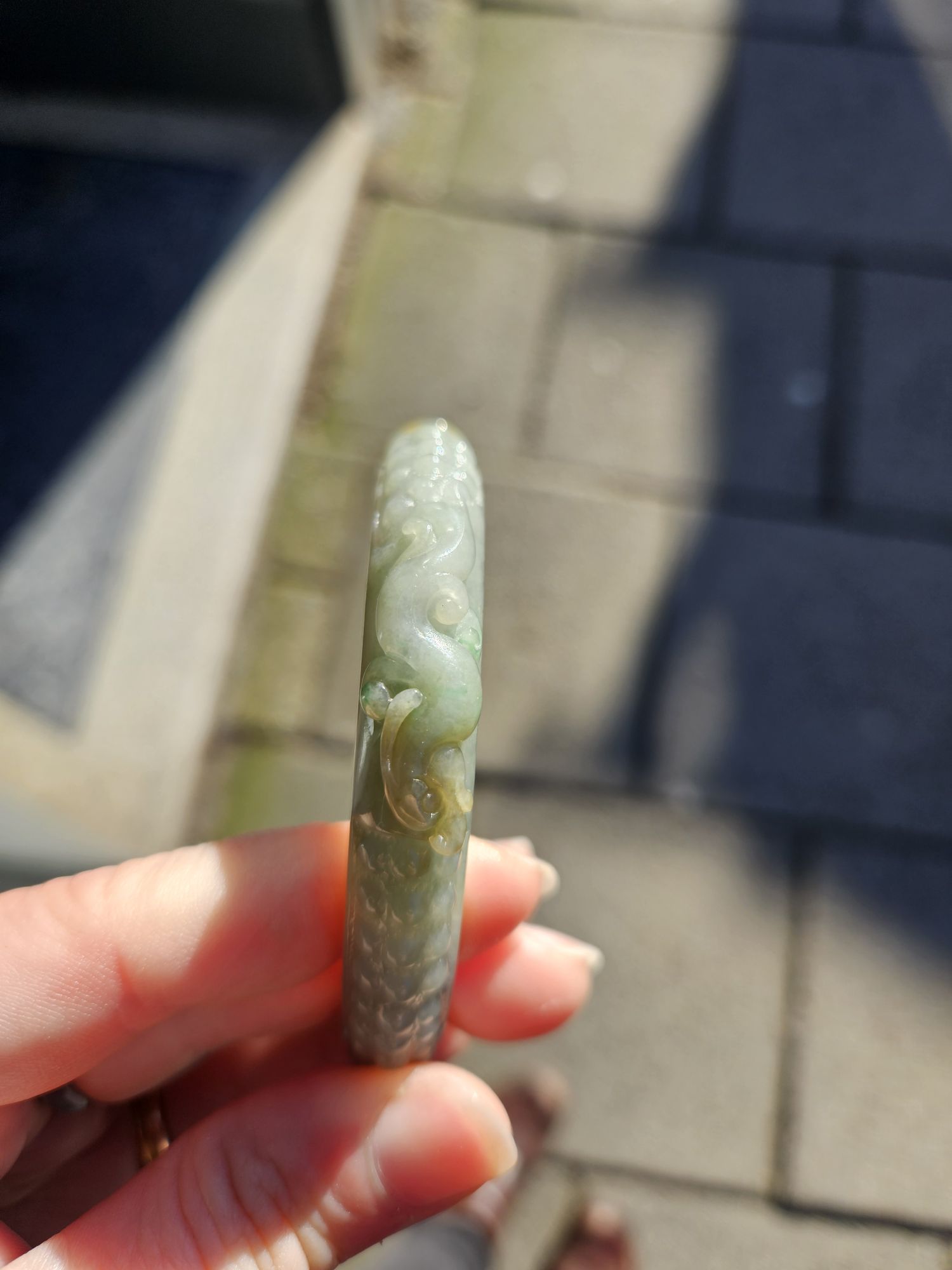 Beautiful bangle in yellow and green engraved with pixiu, bat,and ruyi. Loosely translated, the whole bangle meant the good fortune is right in front of you. Pixiu to attract wealth and deflect bad vibes.