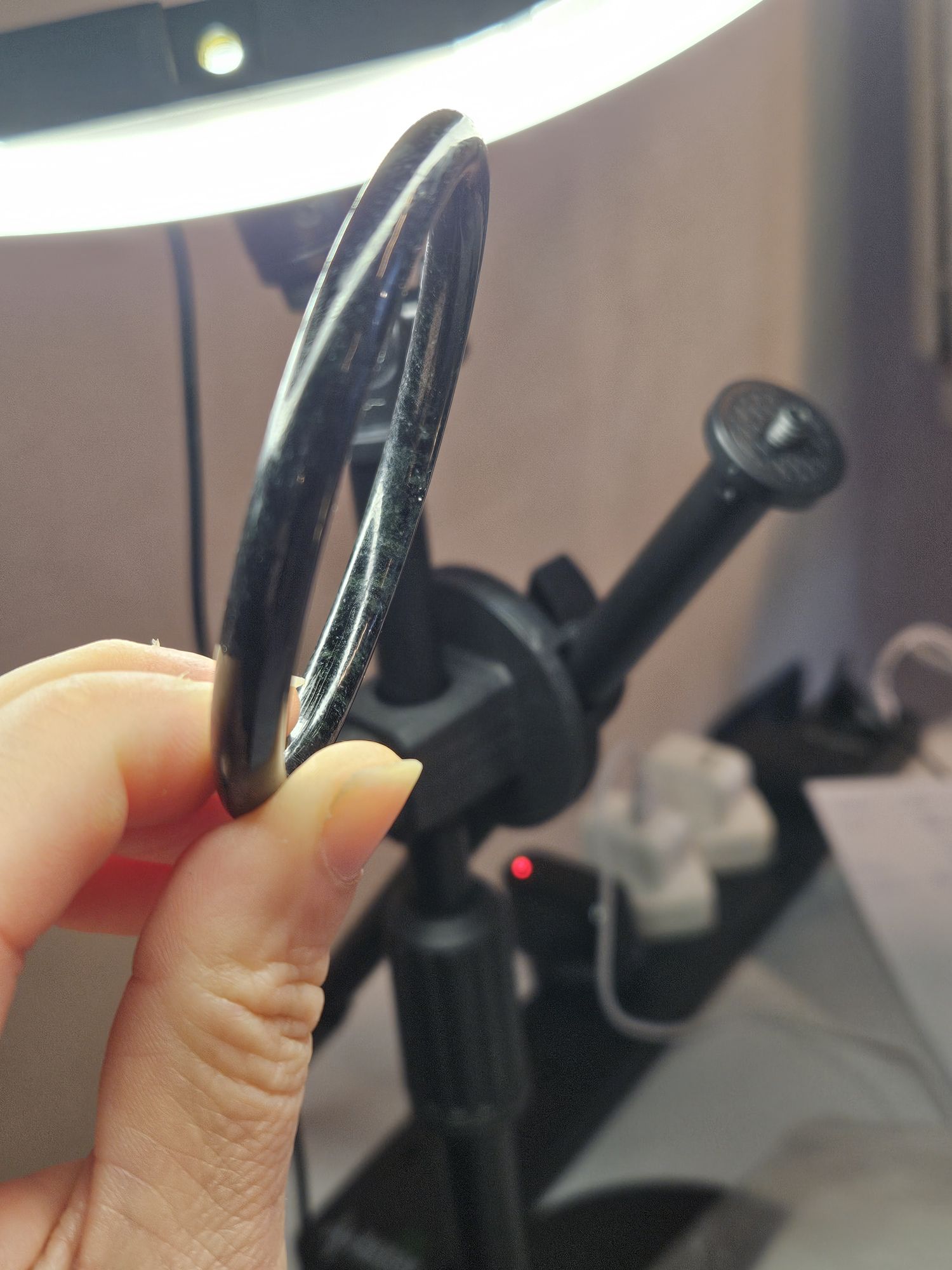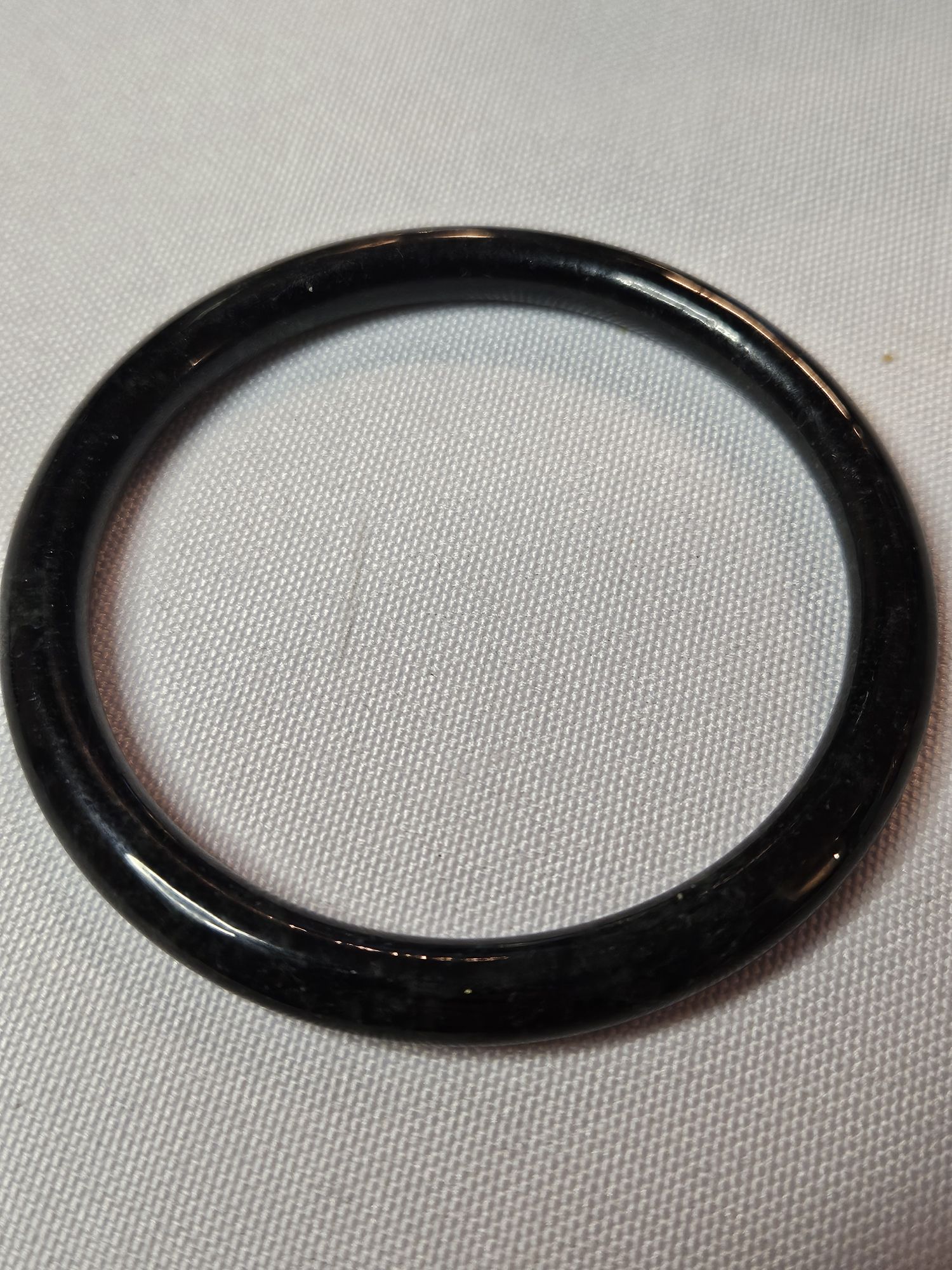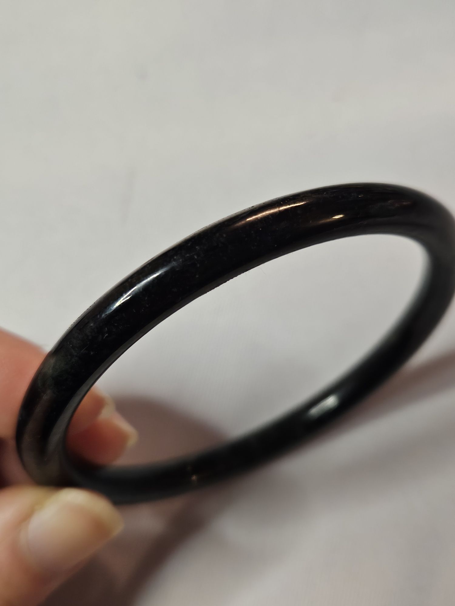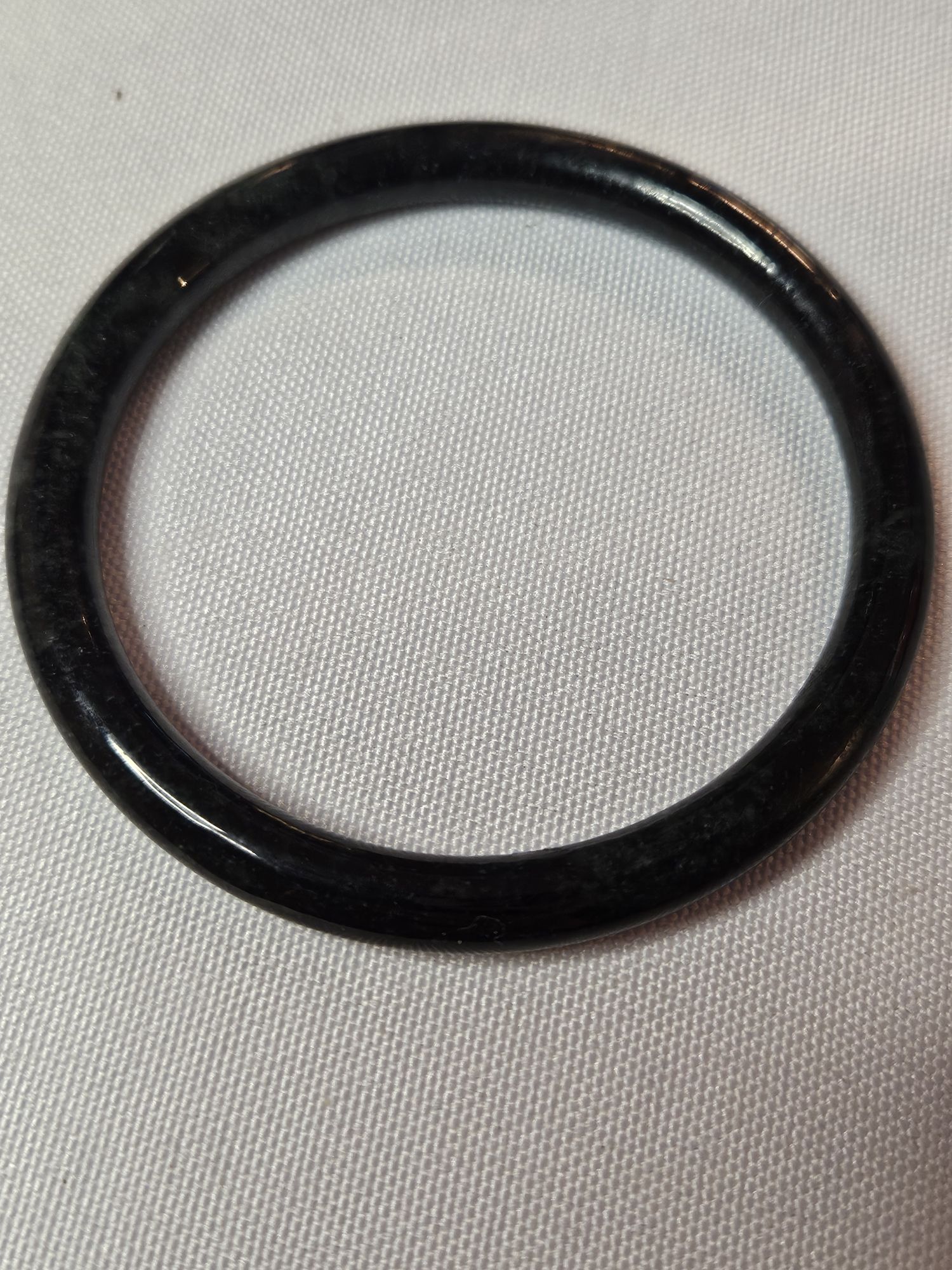 Dark smoky grey that look almost black Burmese jadeite bangle fits up to 60mm. Measures 58.4 x 5.4 x 5.6mm, weighs 21.37g, can be worn on its own or stack either another similar colour and size bangle to form a dingdang that makes beautiful tinkling sound when it knock against each other. £60