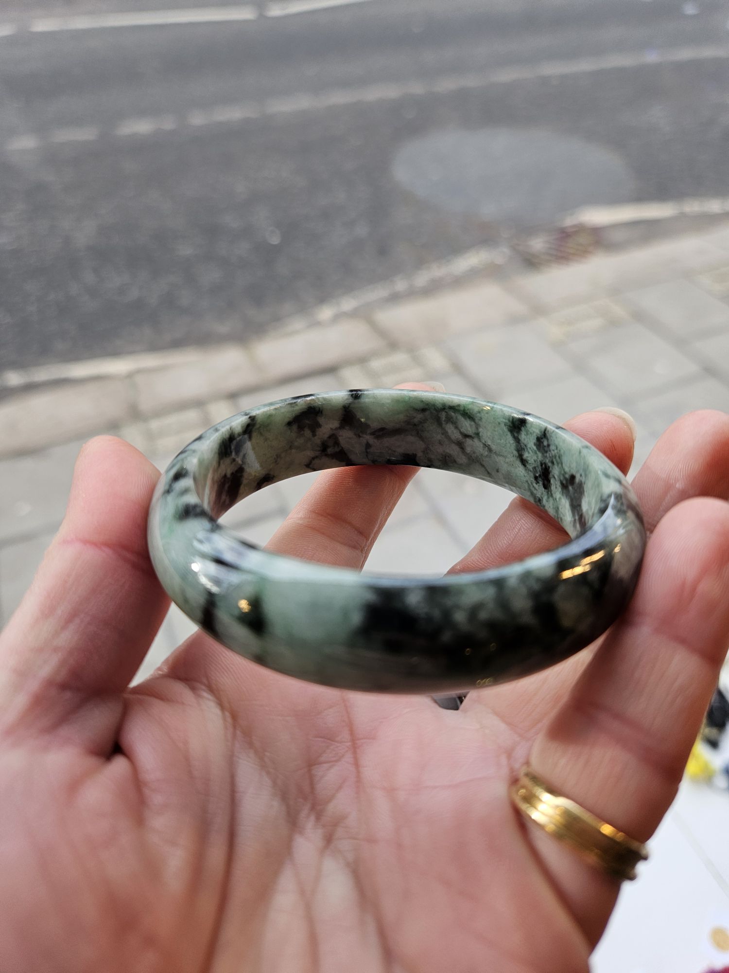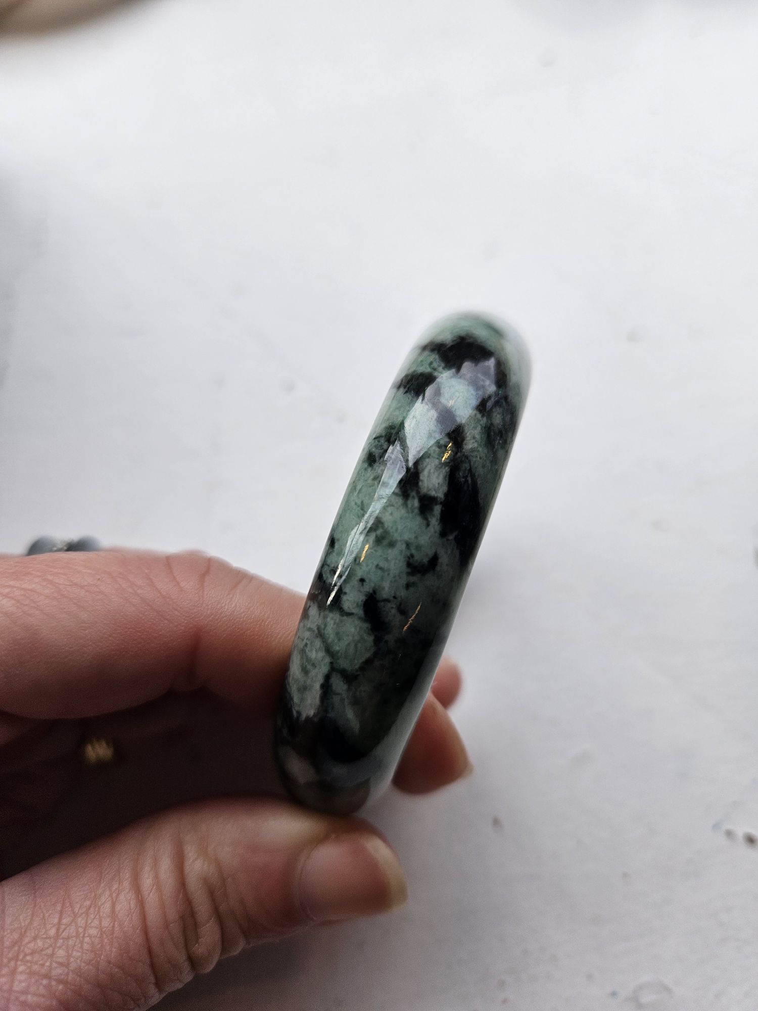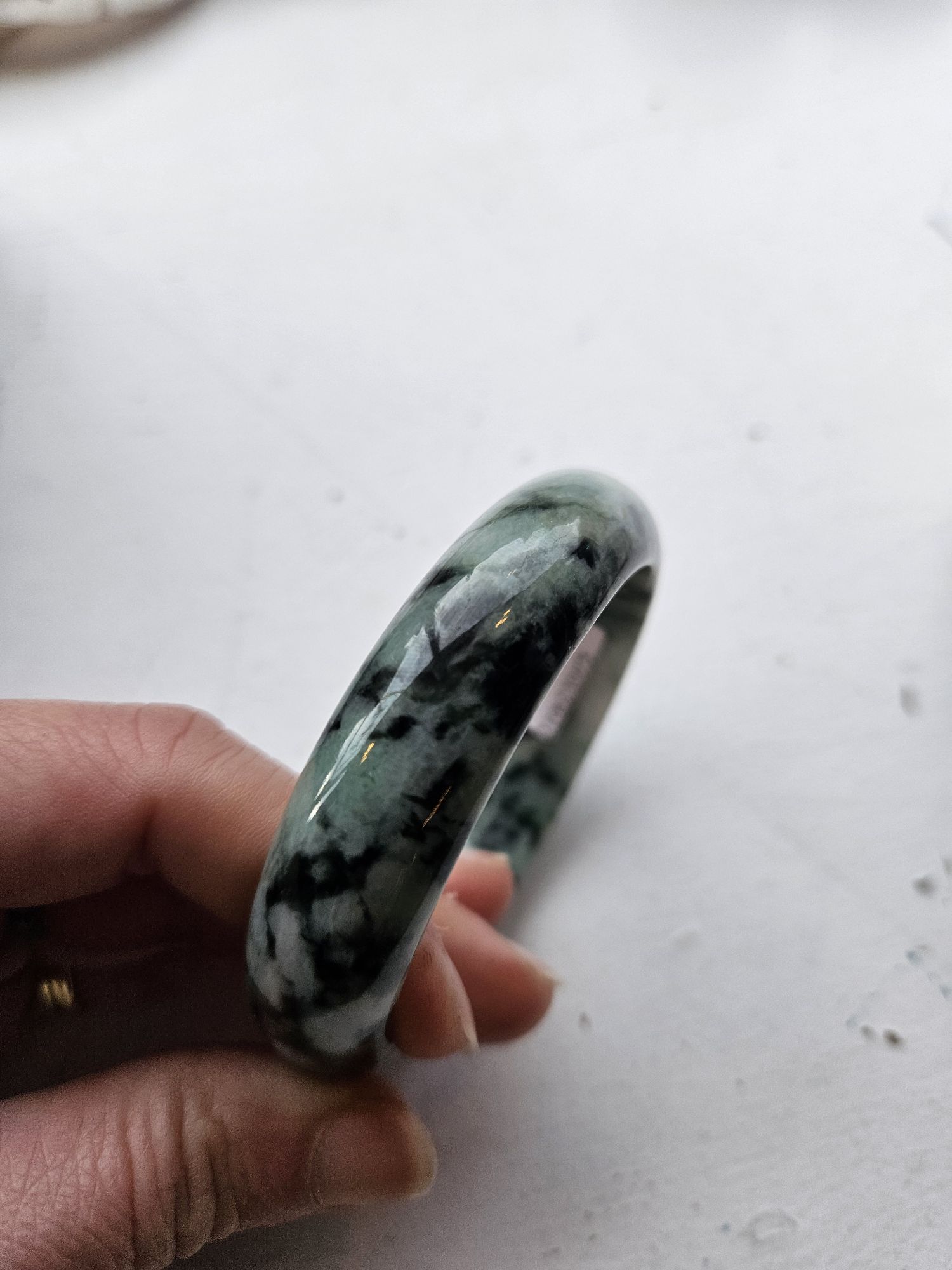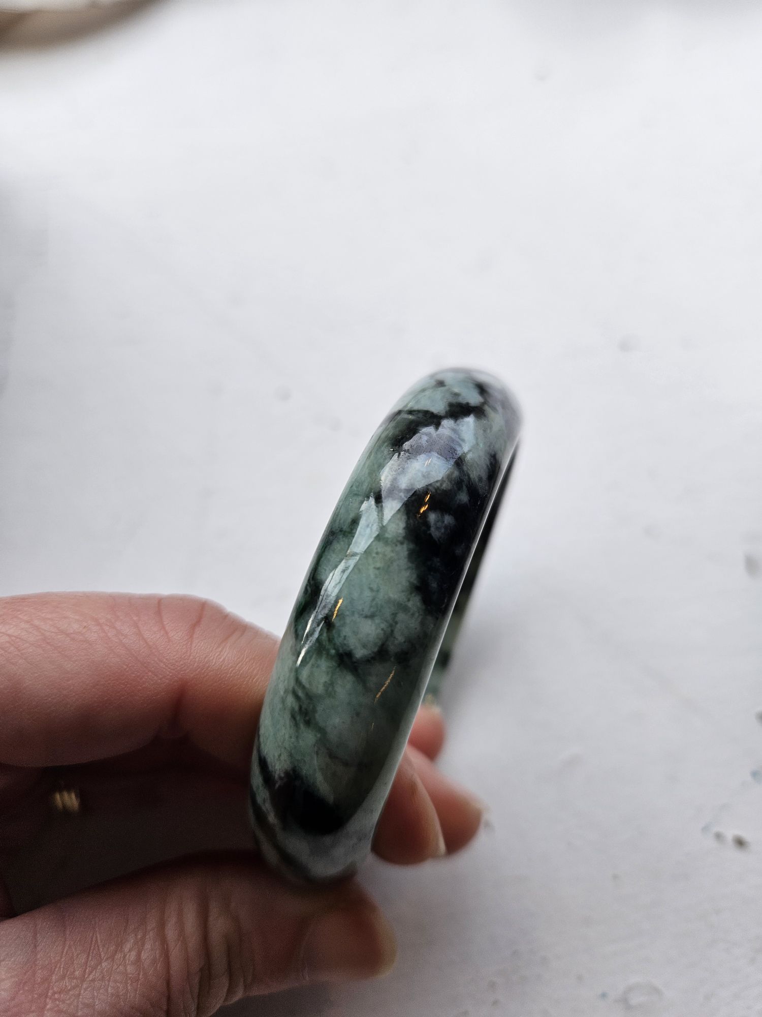 Gorgeous dark blooms on light green Burmese jadeite bangle measures 57.5 x 15.3 x 7.6mm, weighs 60.19g, comes with a certificate of authenticity £99