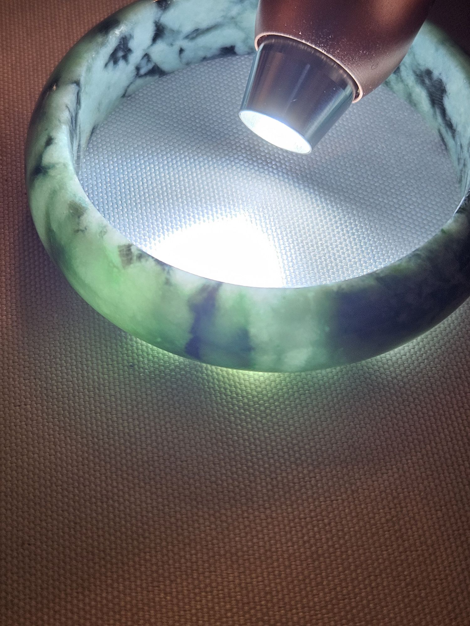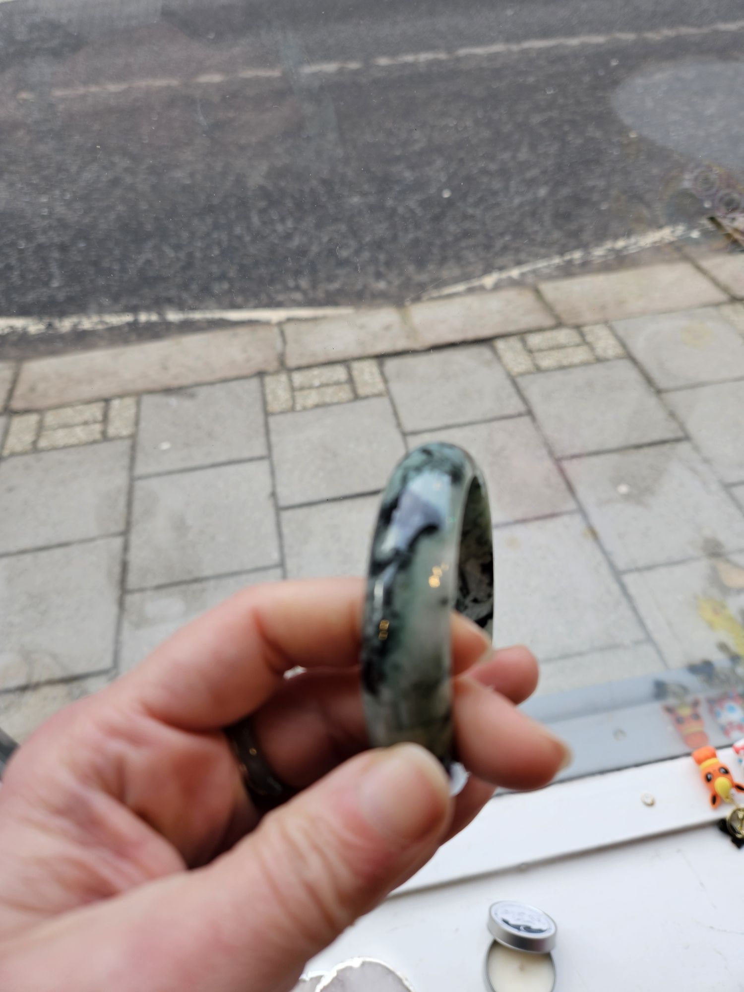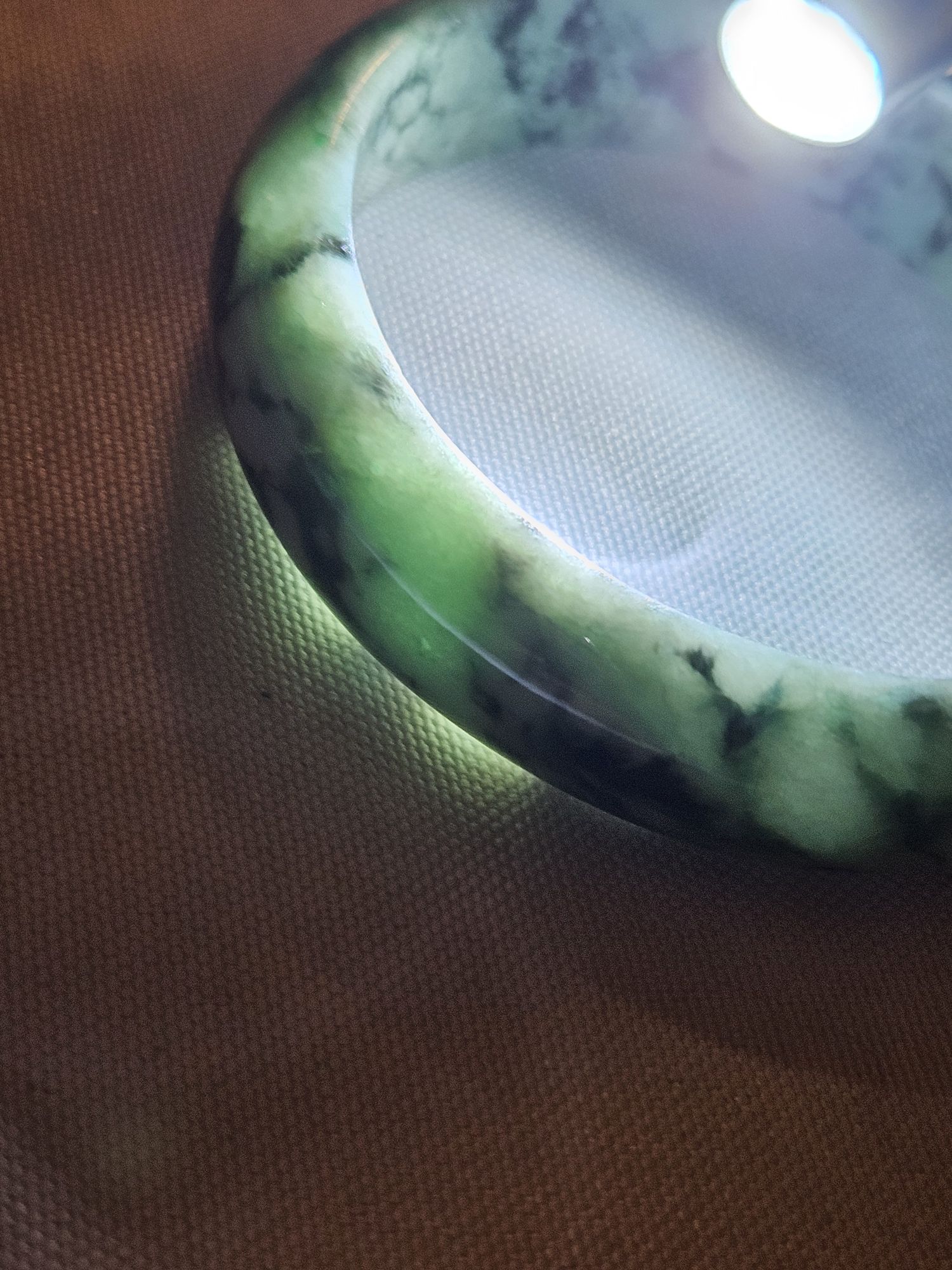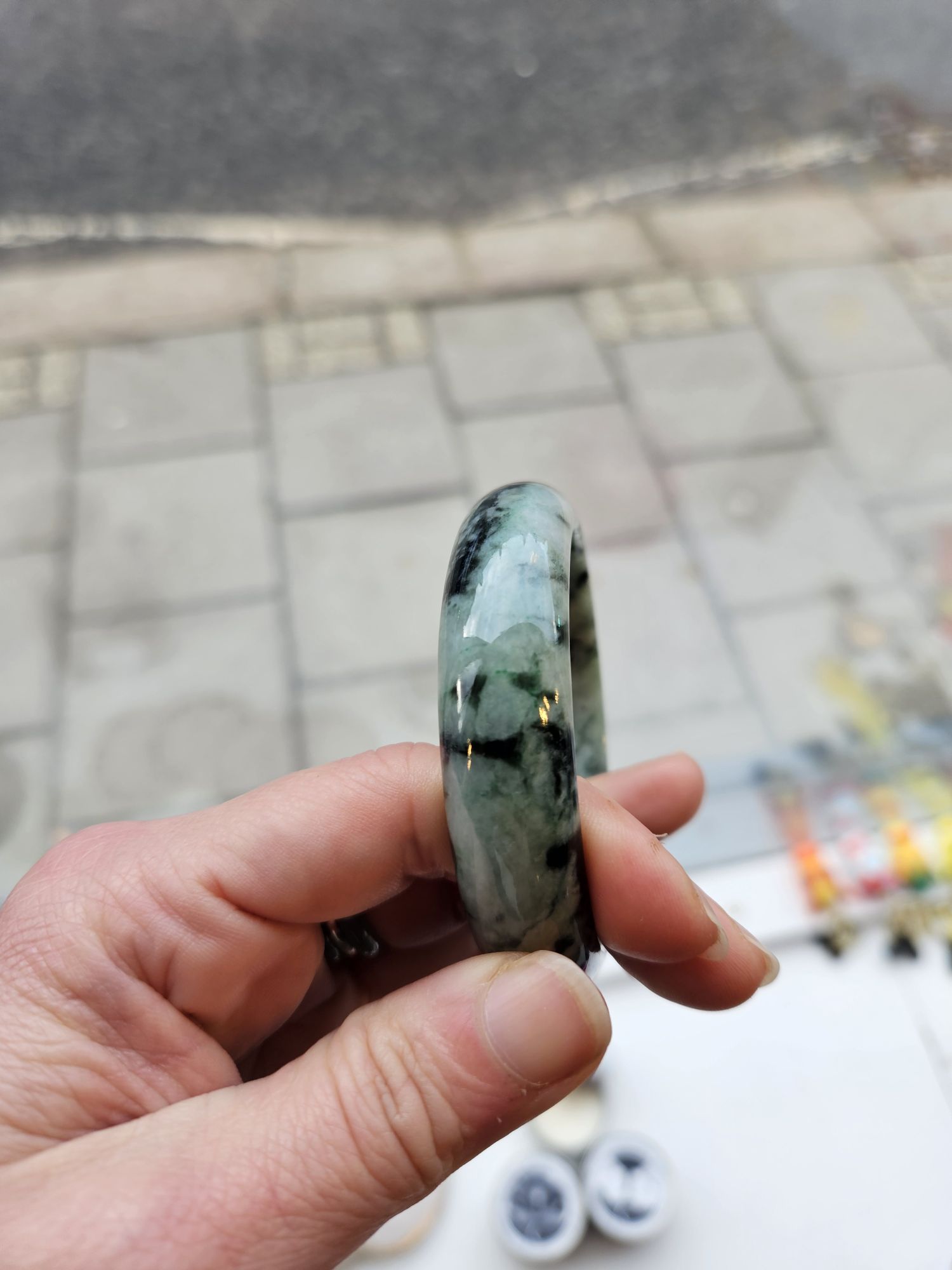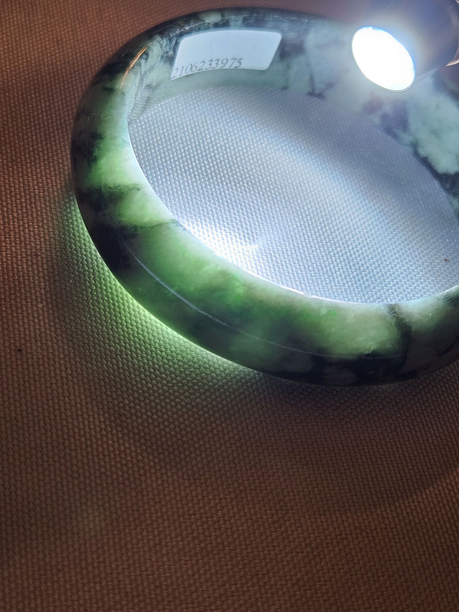 Gorgeous dark blooms on light green Burmese jadeite bangle measures 57.5 x 15.3 x 7.6mm, weighs 60.19g, comes with a certificate of authenticity £99