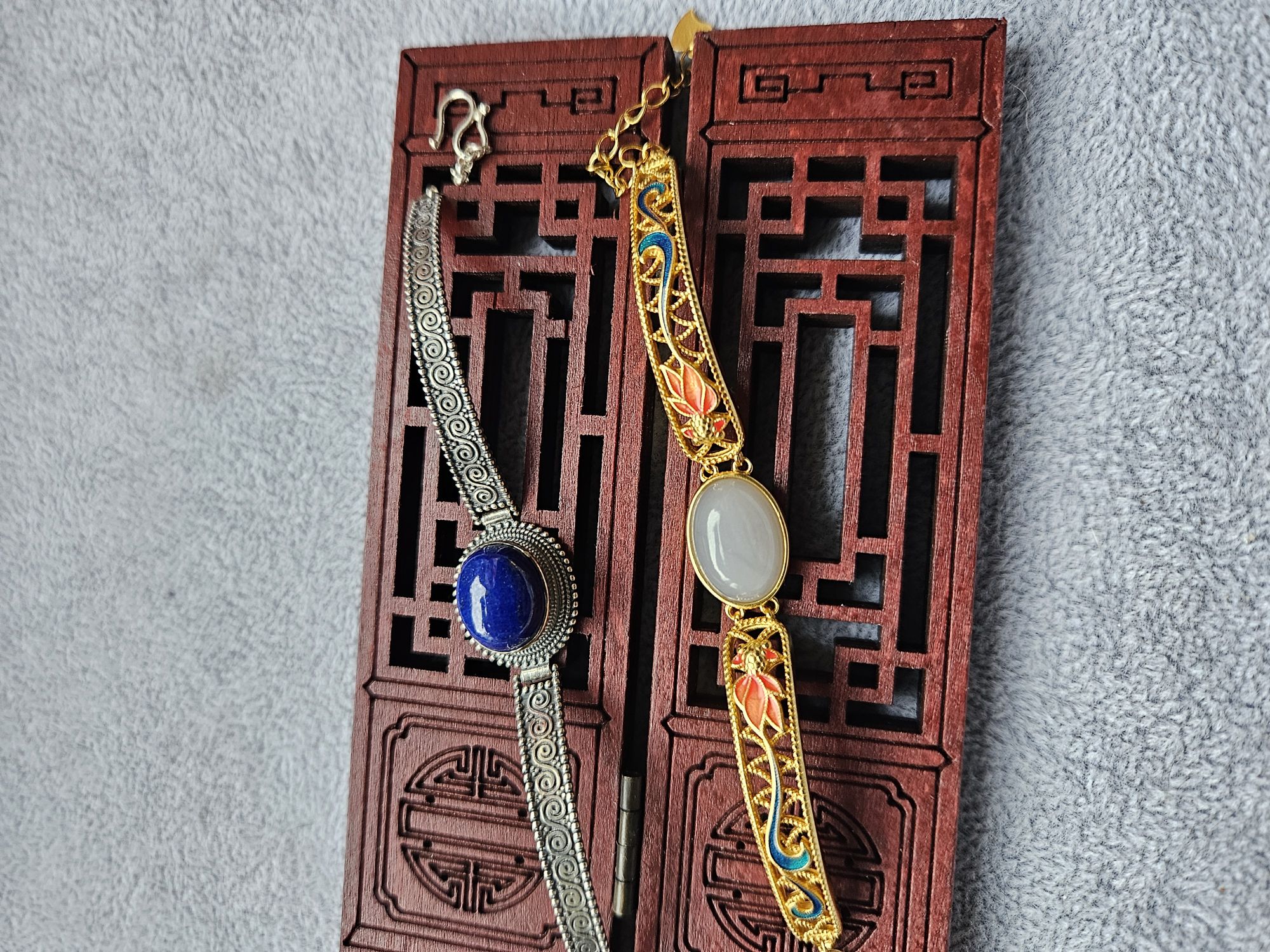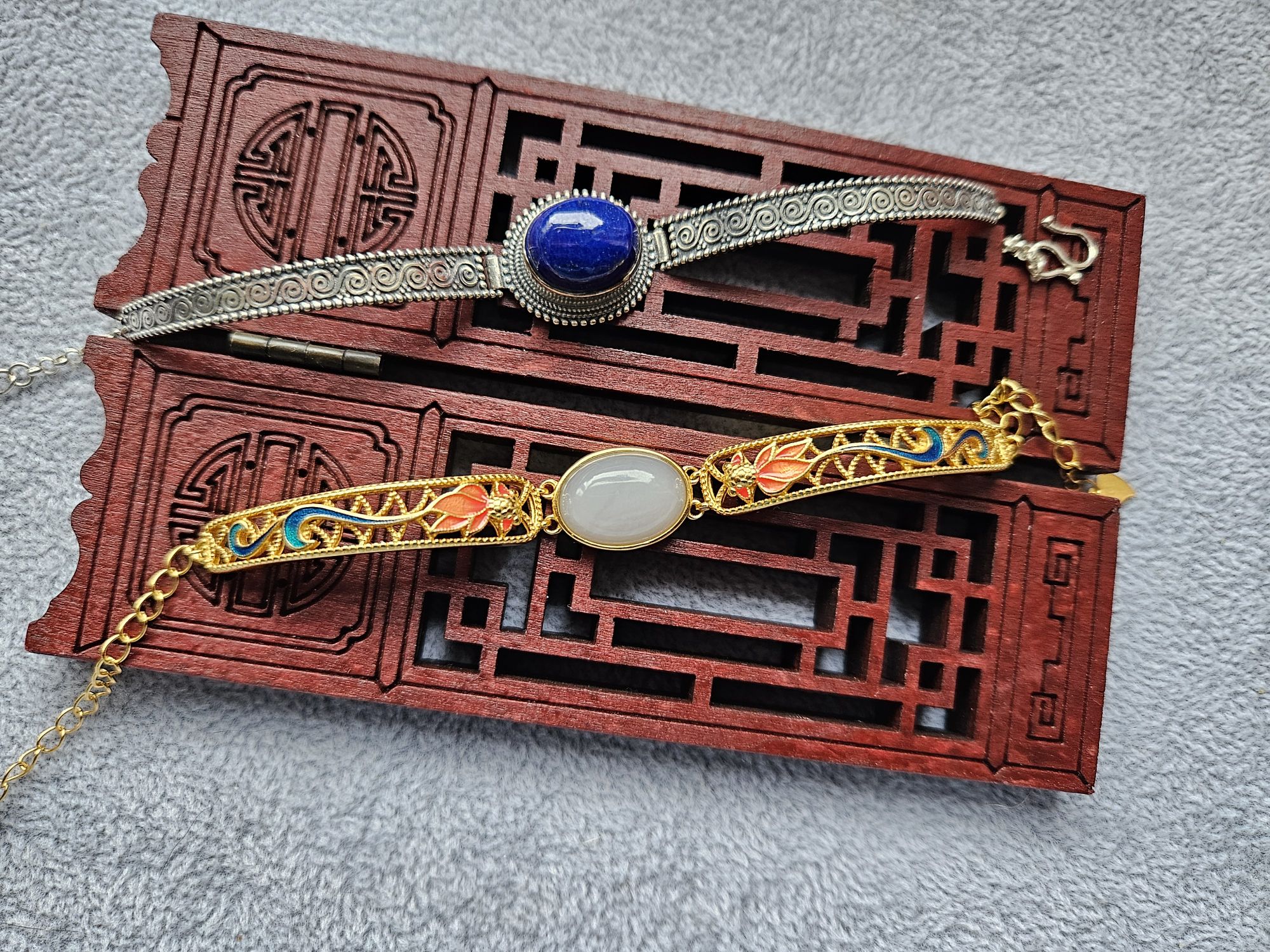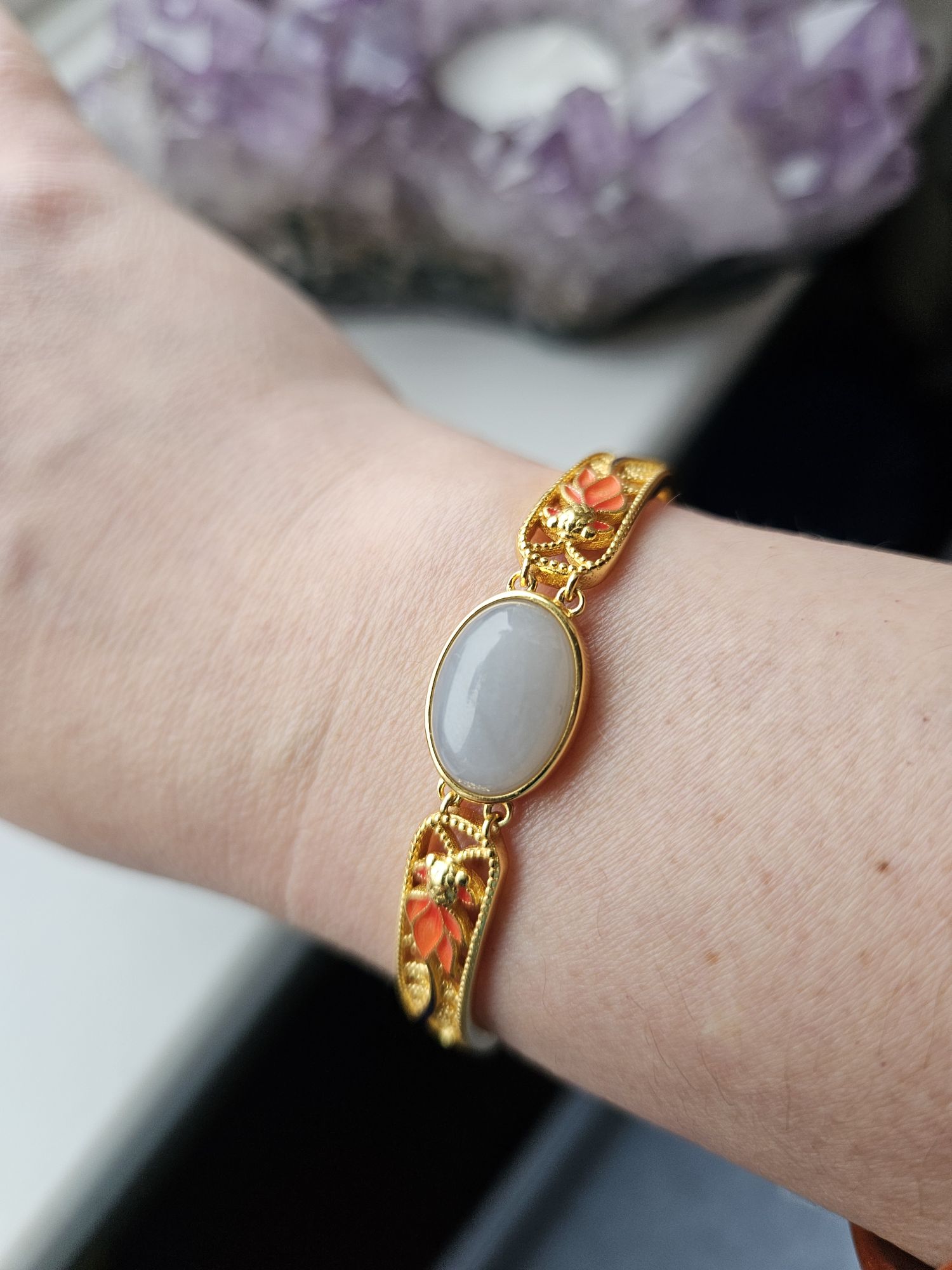 Sterling silver bracelet with a gold finish and enamel depicting gold fish and water symbolize harmony, safety, protection, with a gorgeous purple smoky grey hetian jade measures 15.3 x 11.5mm, £48
