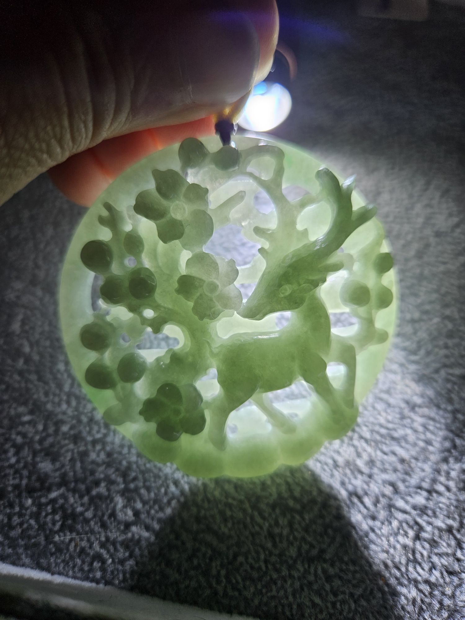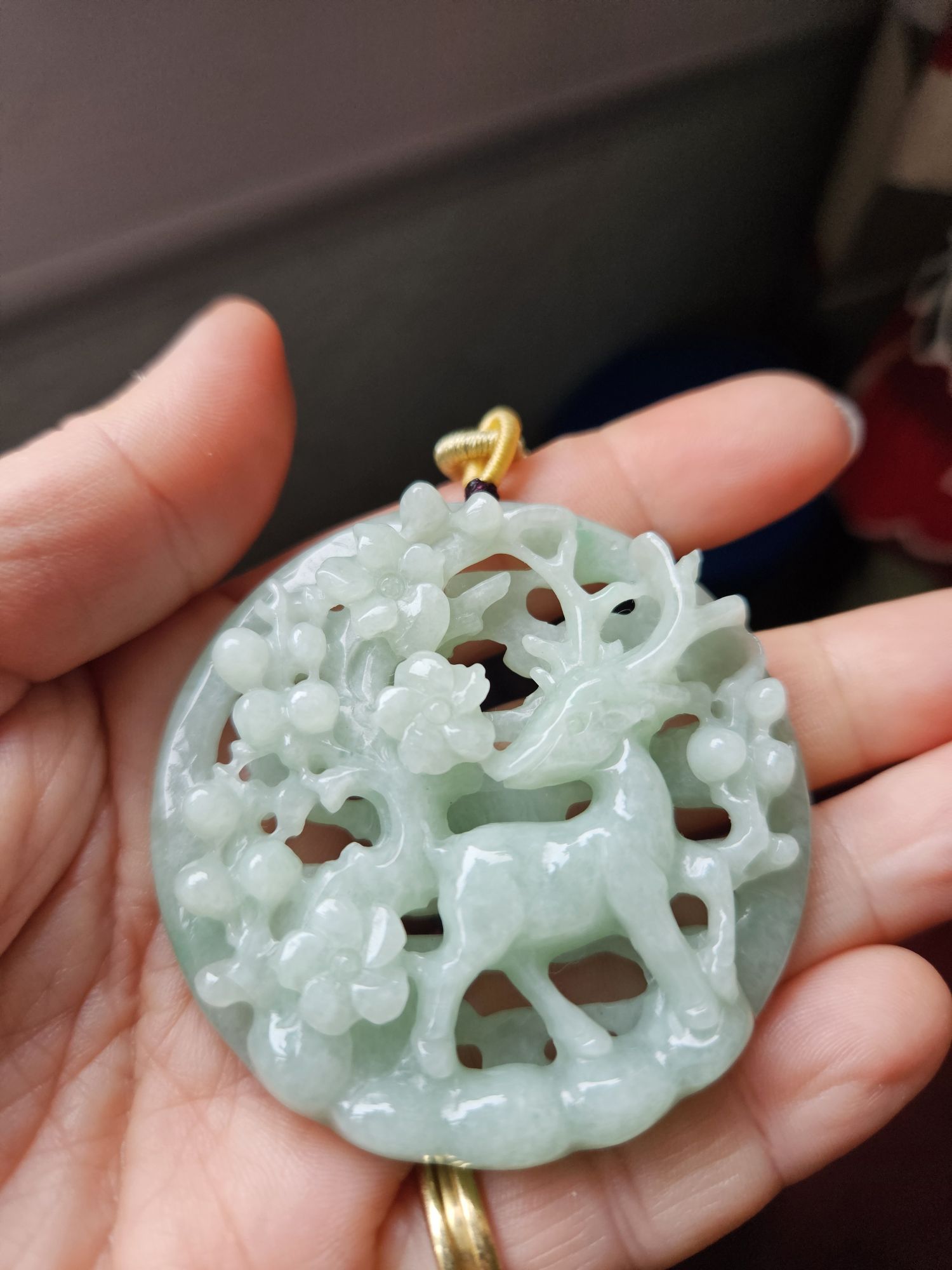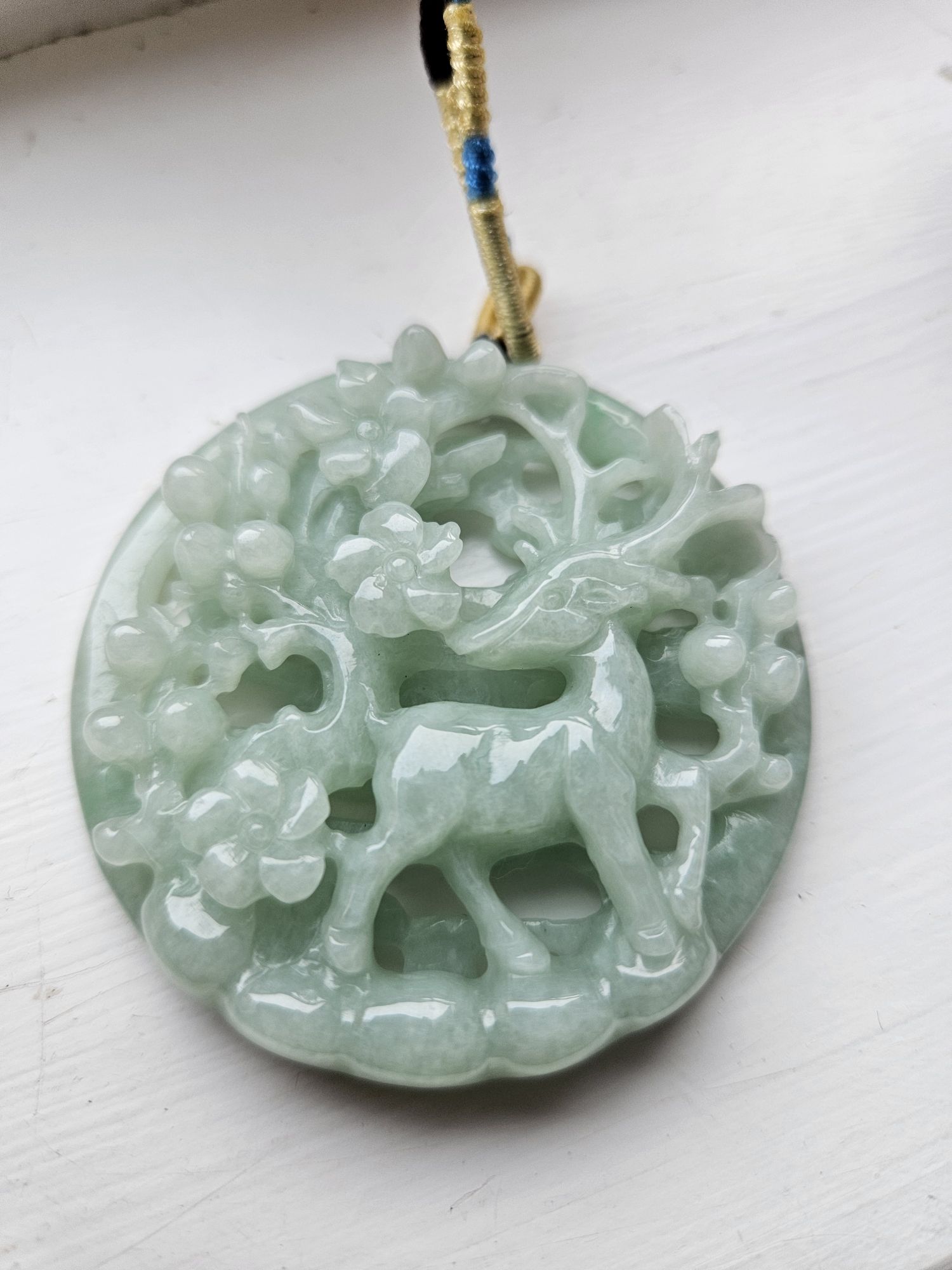 In jade, deer is a symbol of longevity, and as the only animal with the ability to search out the fungus of immortality (靈芝), quite often the deer is depicted with the fungus in its mouth. In Taoist mythology, the deer is an animal who accompanies Shoulao, the God of Longevity, and Magu, the Goddess of Longevity. Peach blossom often represents a symbol of love, romance, and marriage as well as immortality.