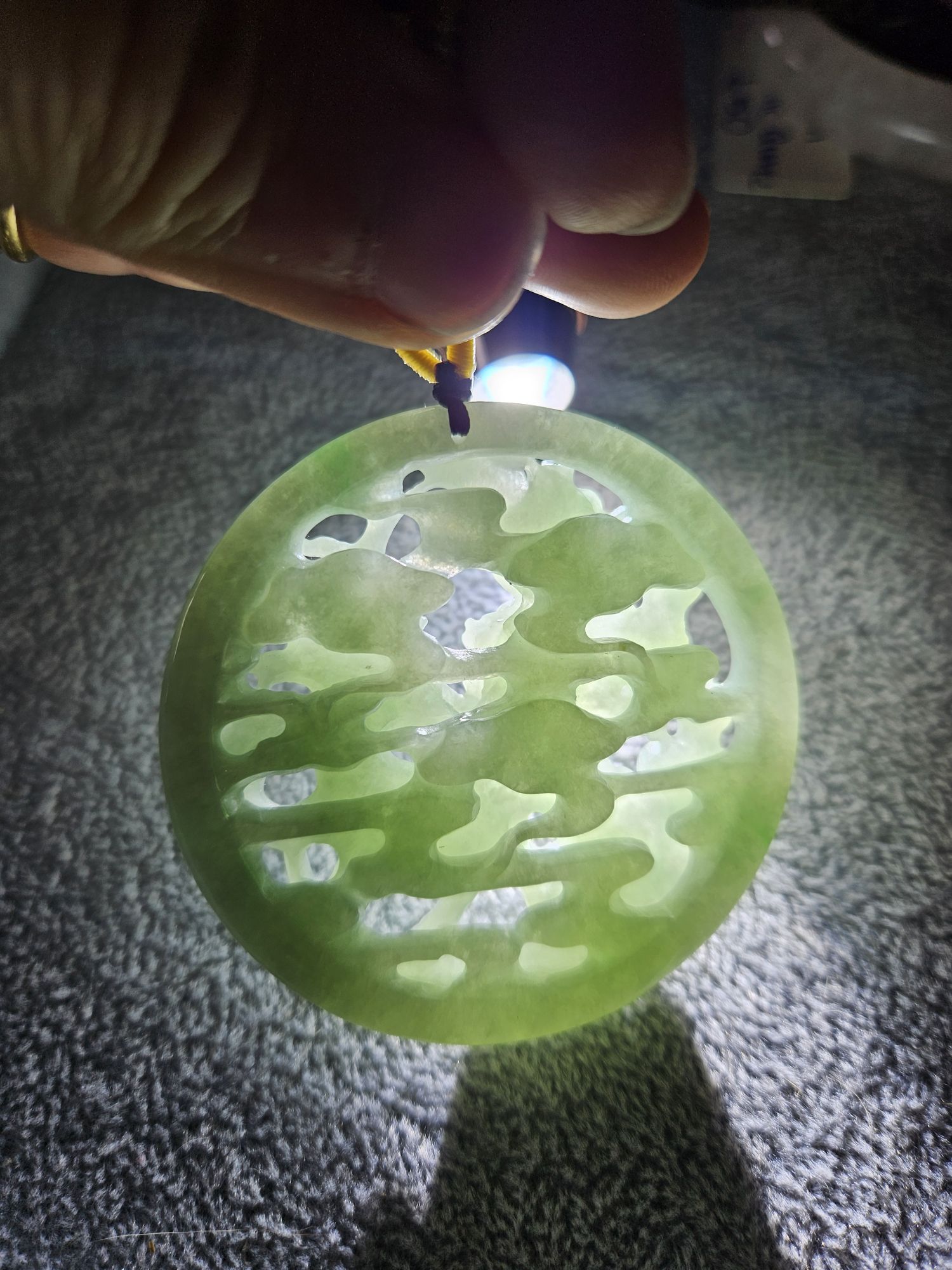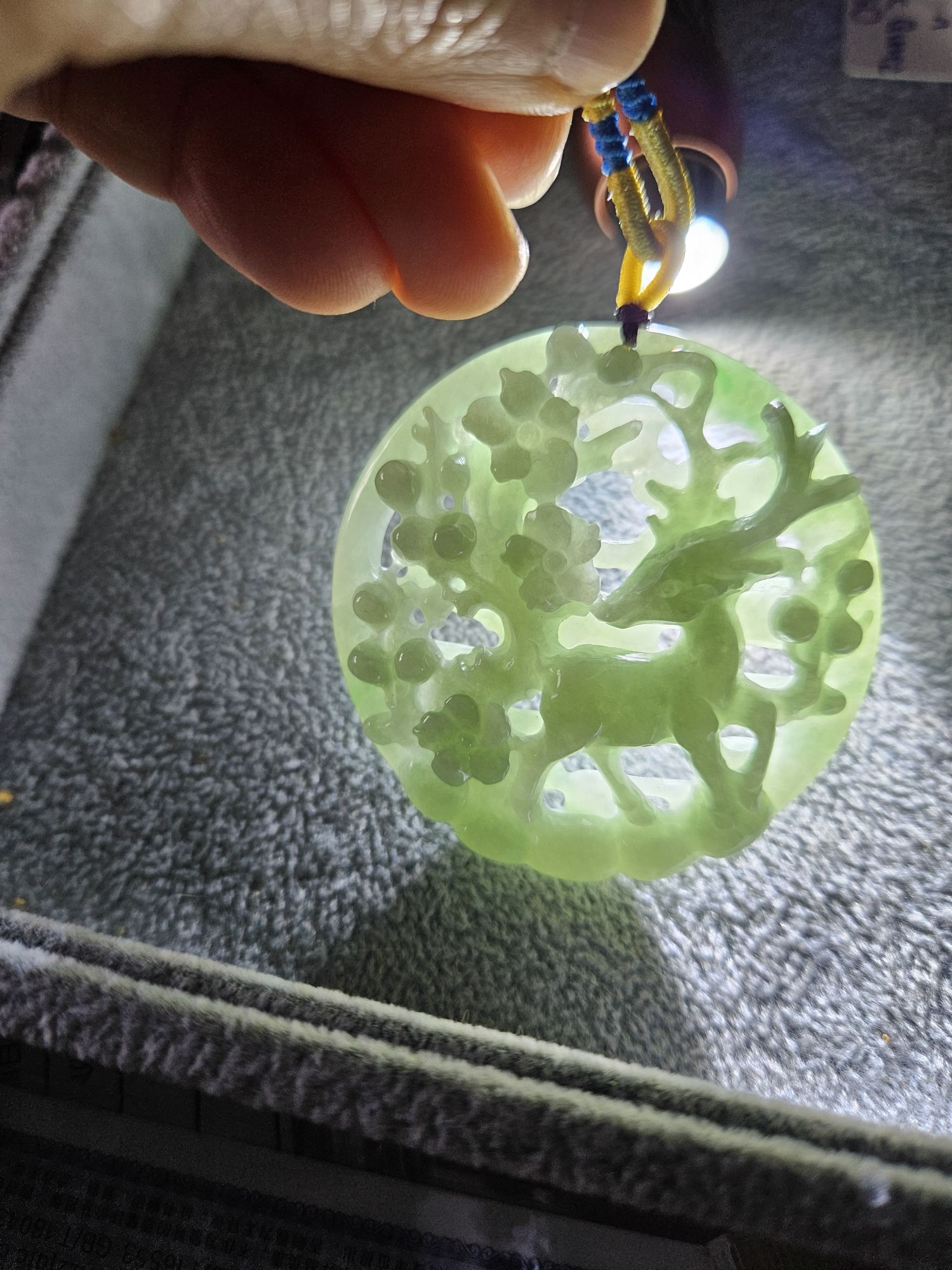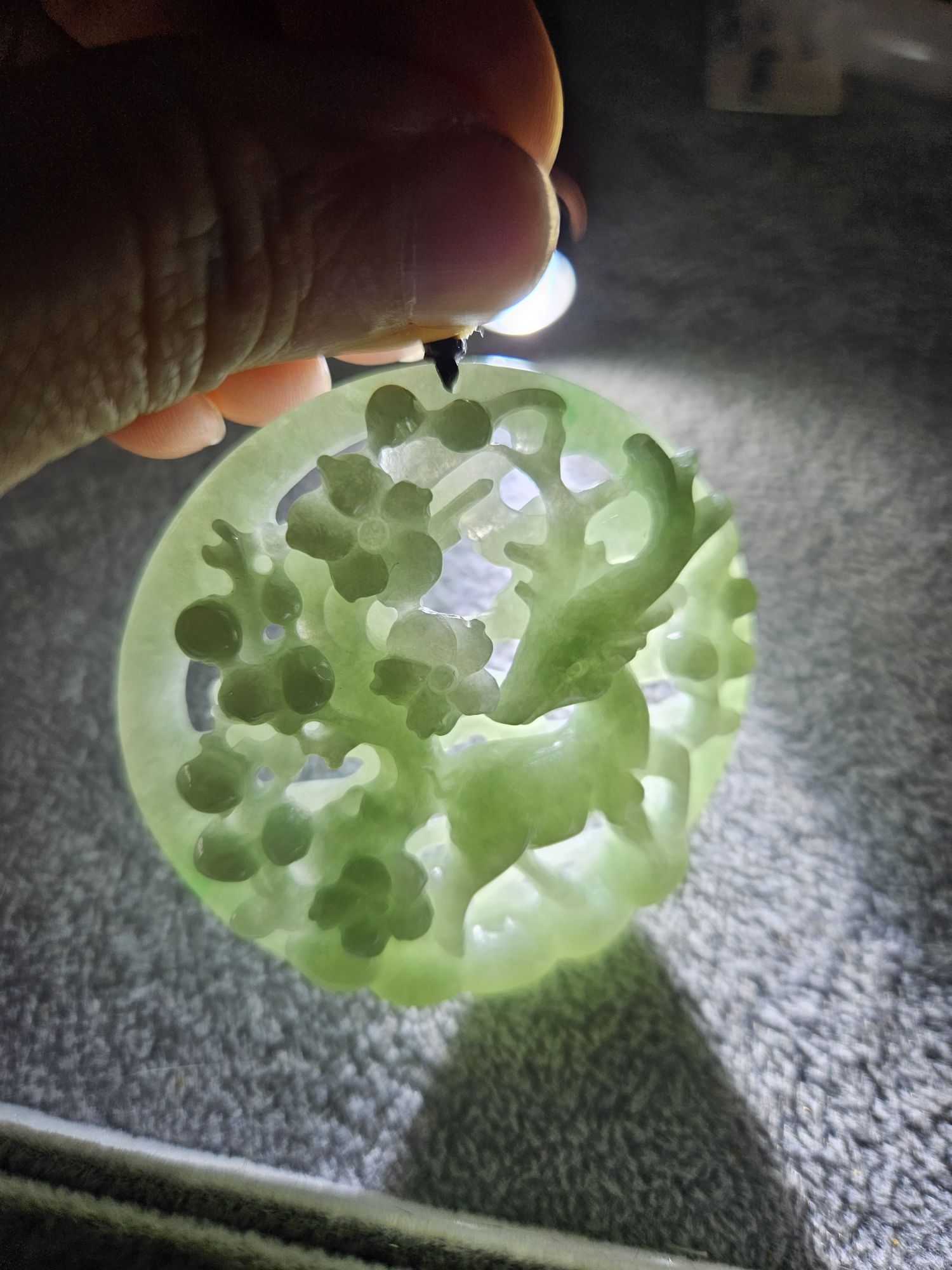 In jade, deer is a symbol of longevity, and as the only animal with the ability to search out the fungus of immortality (靈芝), quite often the deer is depicted with the fungus in its mouth. In Taoist mythology, the deer is an animal who accompanies Shoulao, the God of Longevity, and Magu, the Goddess of Longevity. Peach blossom often represents a symbol of love, romance, and marriage as well as immortality.