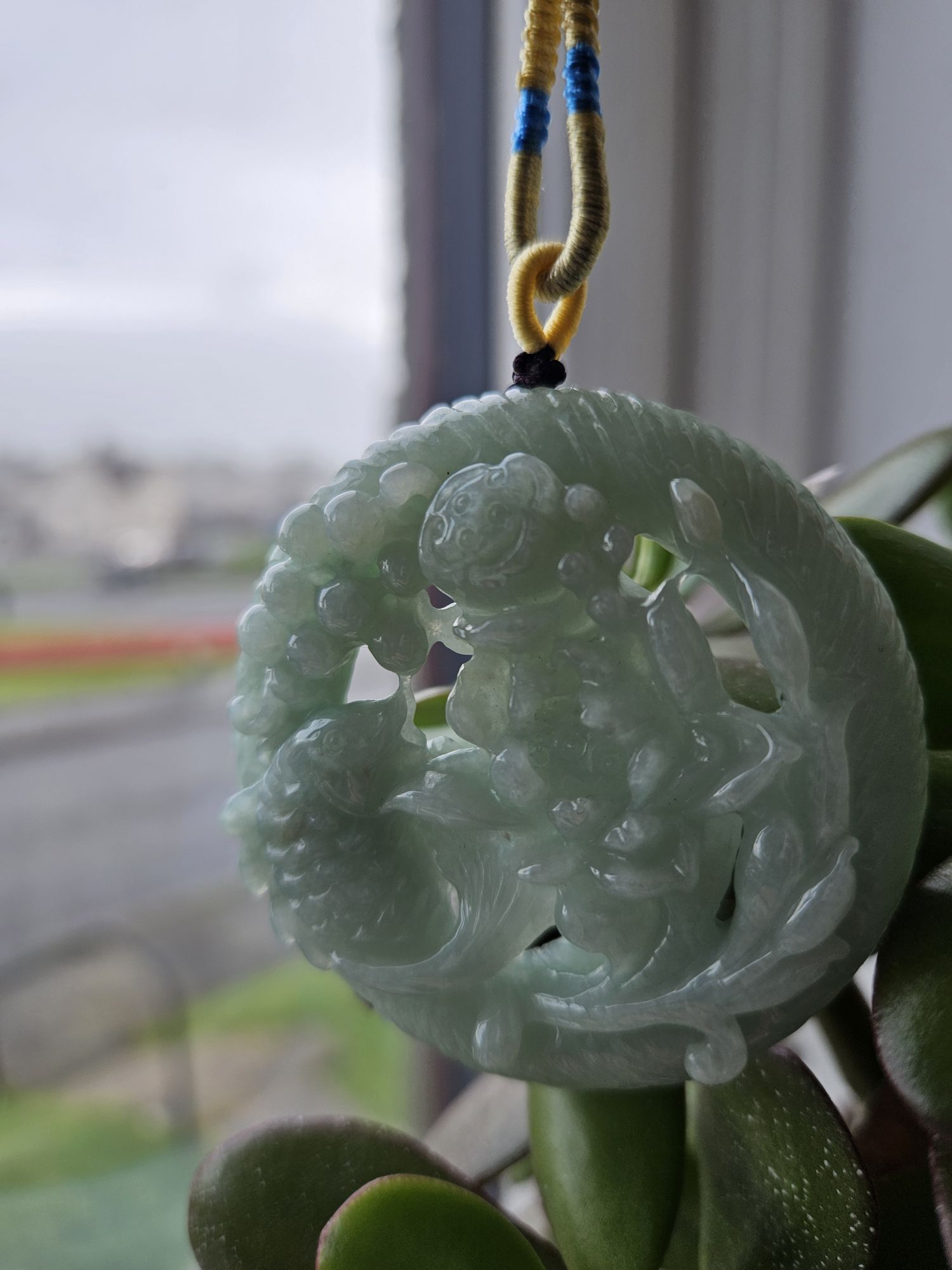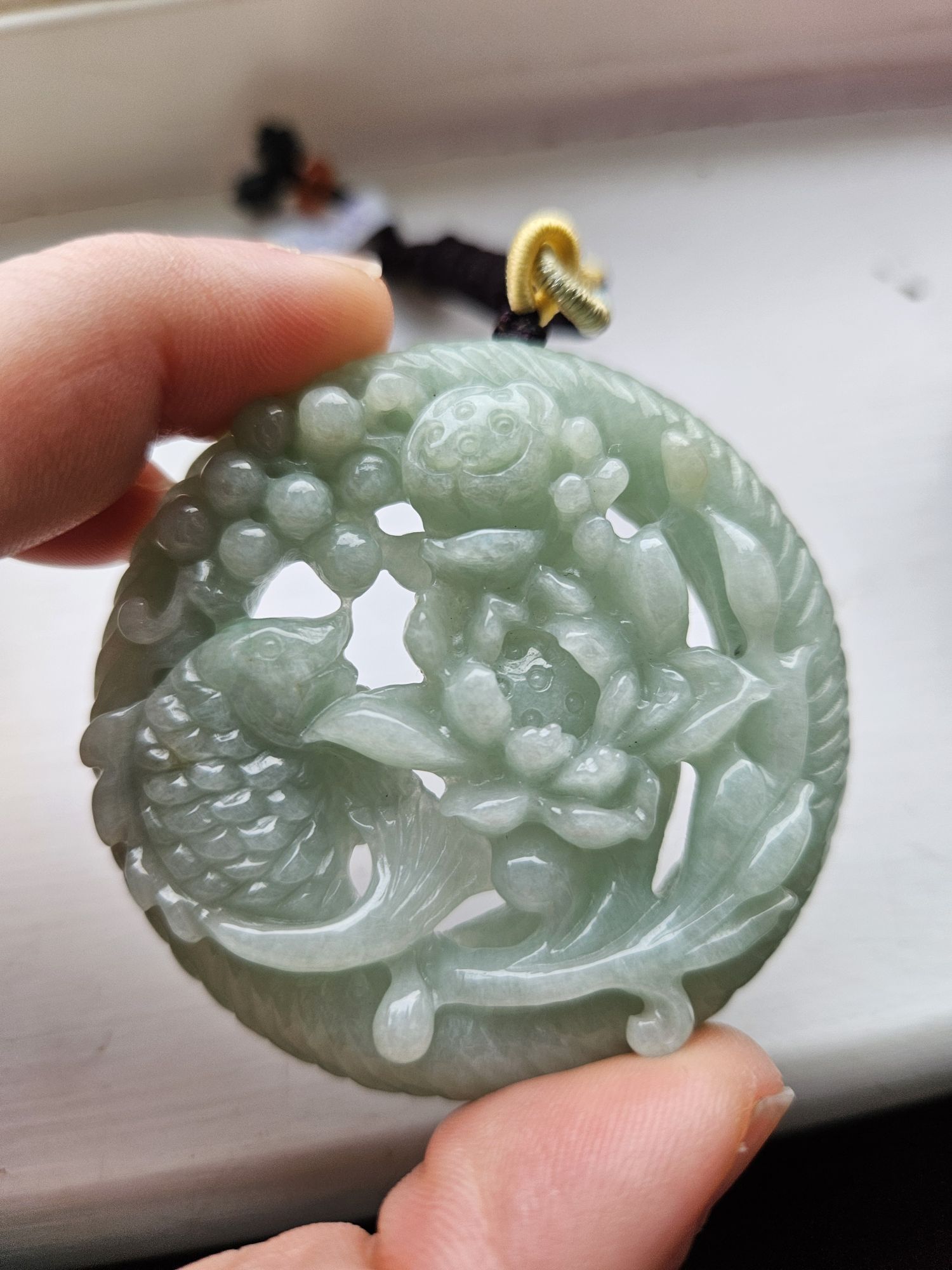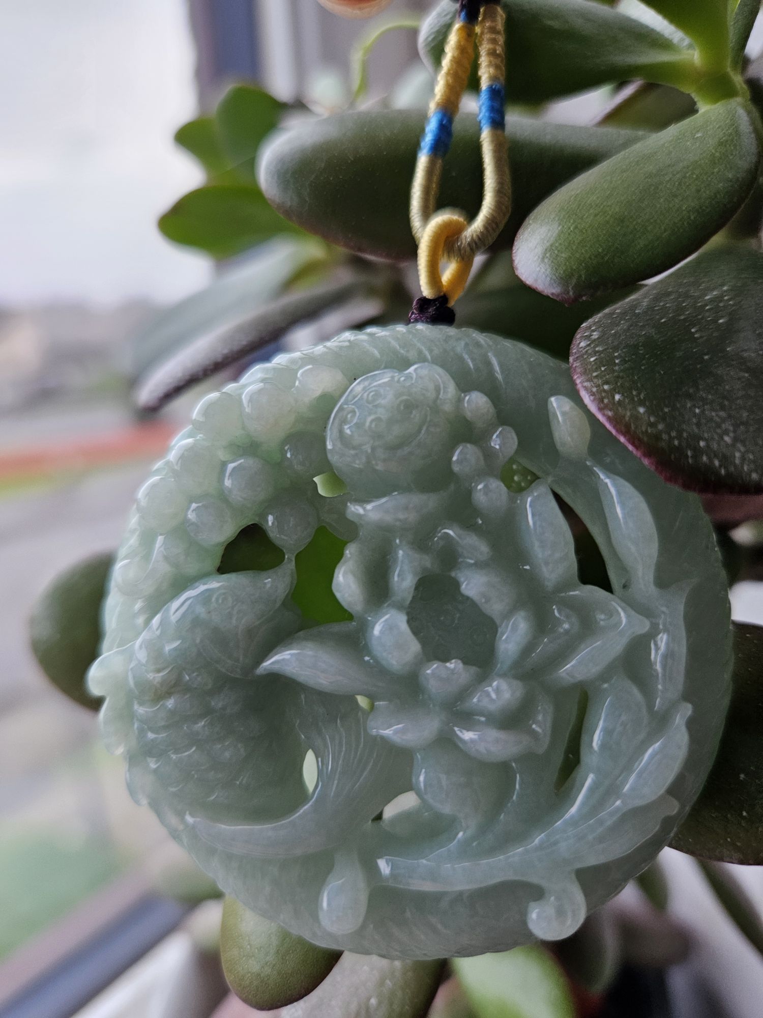 Because lotuses rise from the mud without stains, they are often viewed as a symbol of purity. Since they return to the murky water each evening and open their blooms at the break of day, lotus flowers are also symbols of strength, resilience, and rebirth. Fish is a symbol of wealth & abundance as the chinese pronunciation “Yu” means surplus. It is also believed to attract good luck, good fortune, longevity & more children. Excellent for everyone wishing for a more prosperous life. This lovely burmese jadeite pendant on an adjustable string measures 55 x 11.5mm, weighs 53.21g, comes with a certificate of authenticity £158