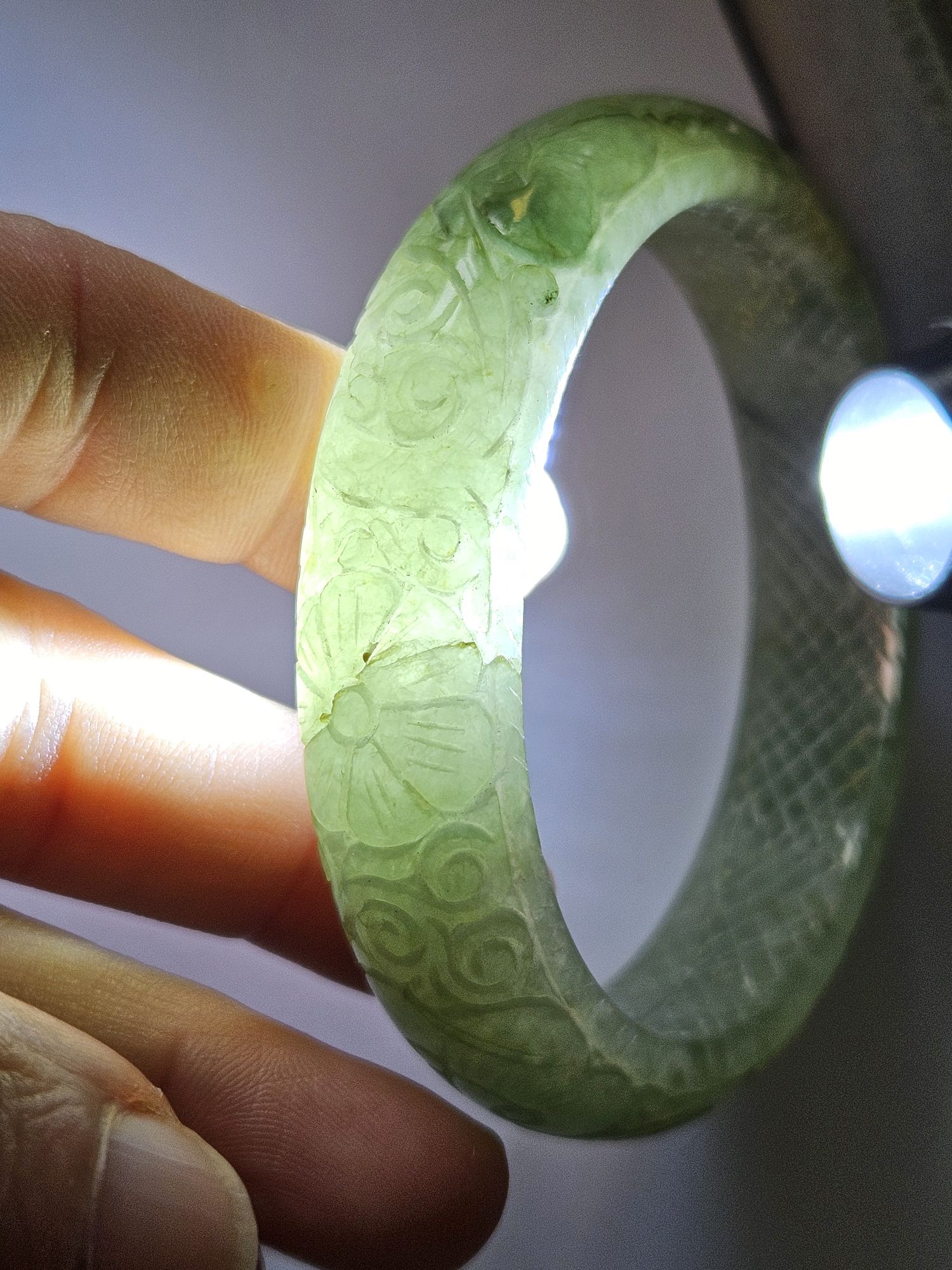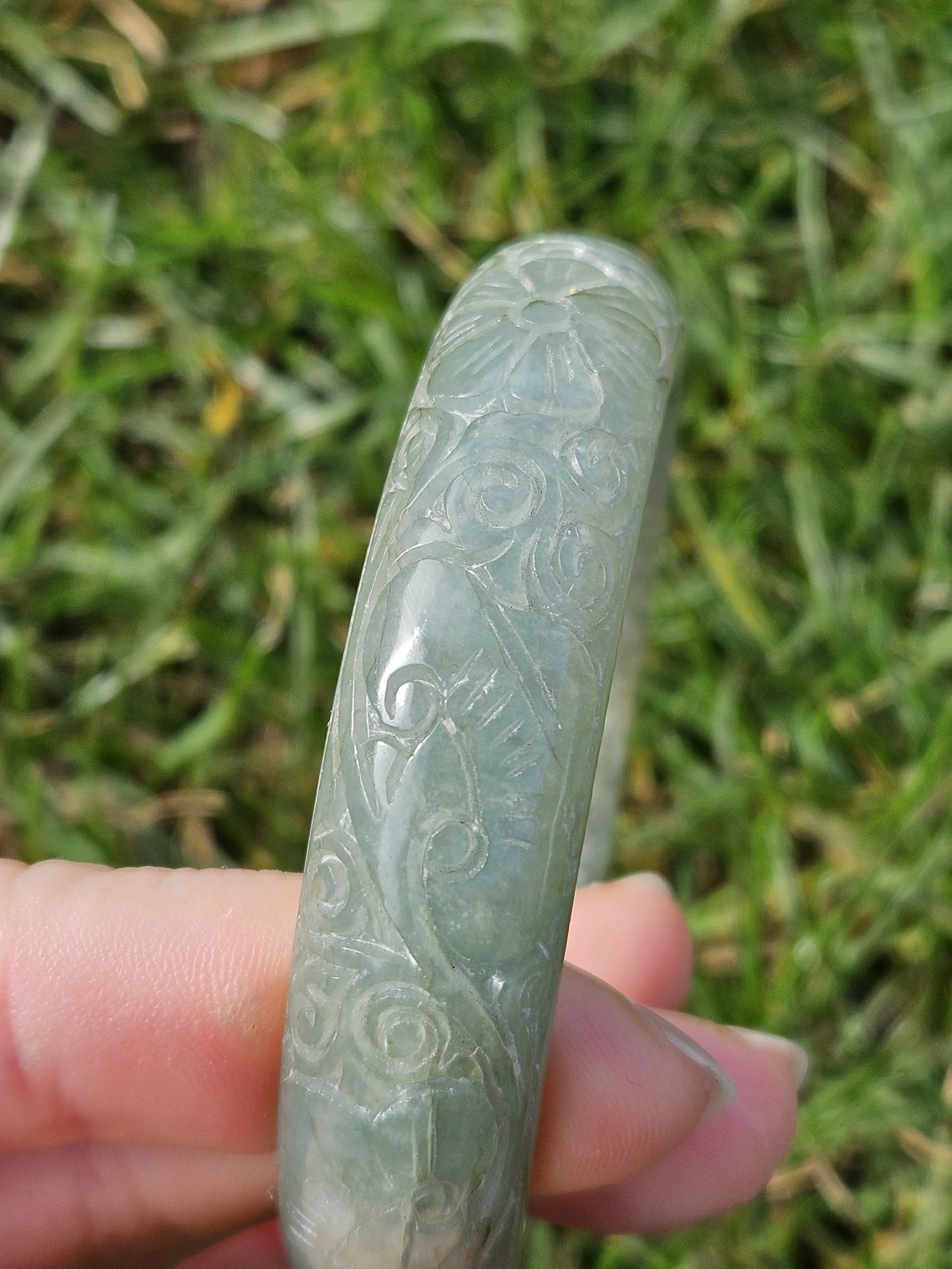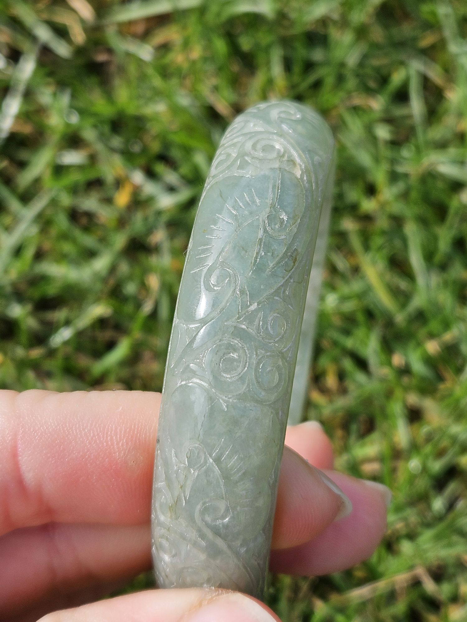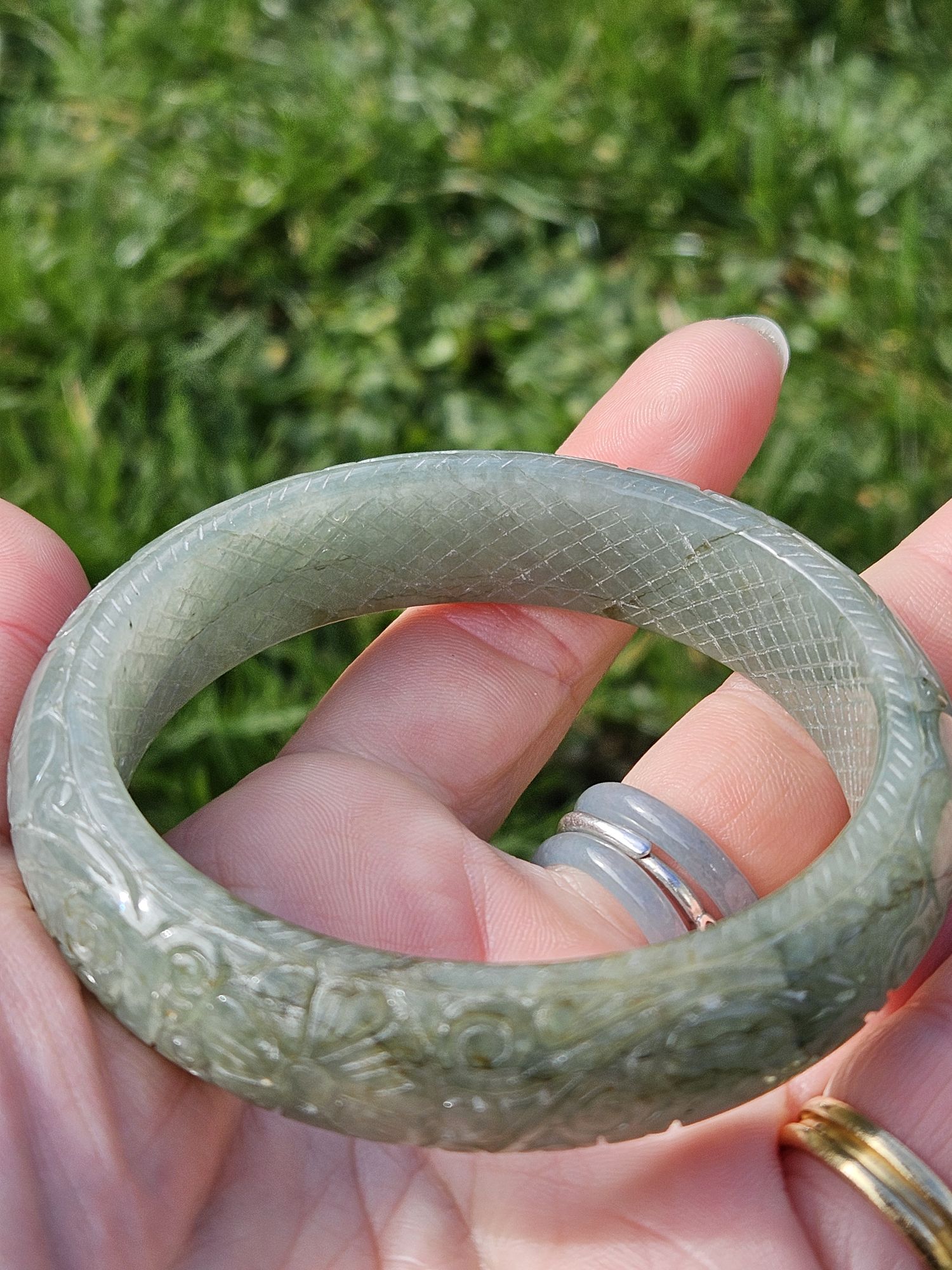 Carved Burmese jadeite bangle with multiple ‘ruyi’ pattern measures 57.7 x 14.8 x 10.9mm, weighs 62.85g, comes with a certificate of authenticity. £198
