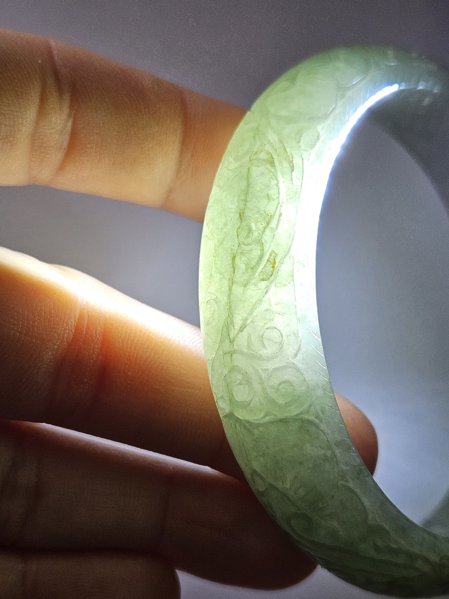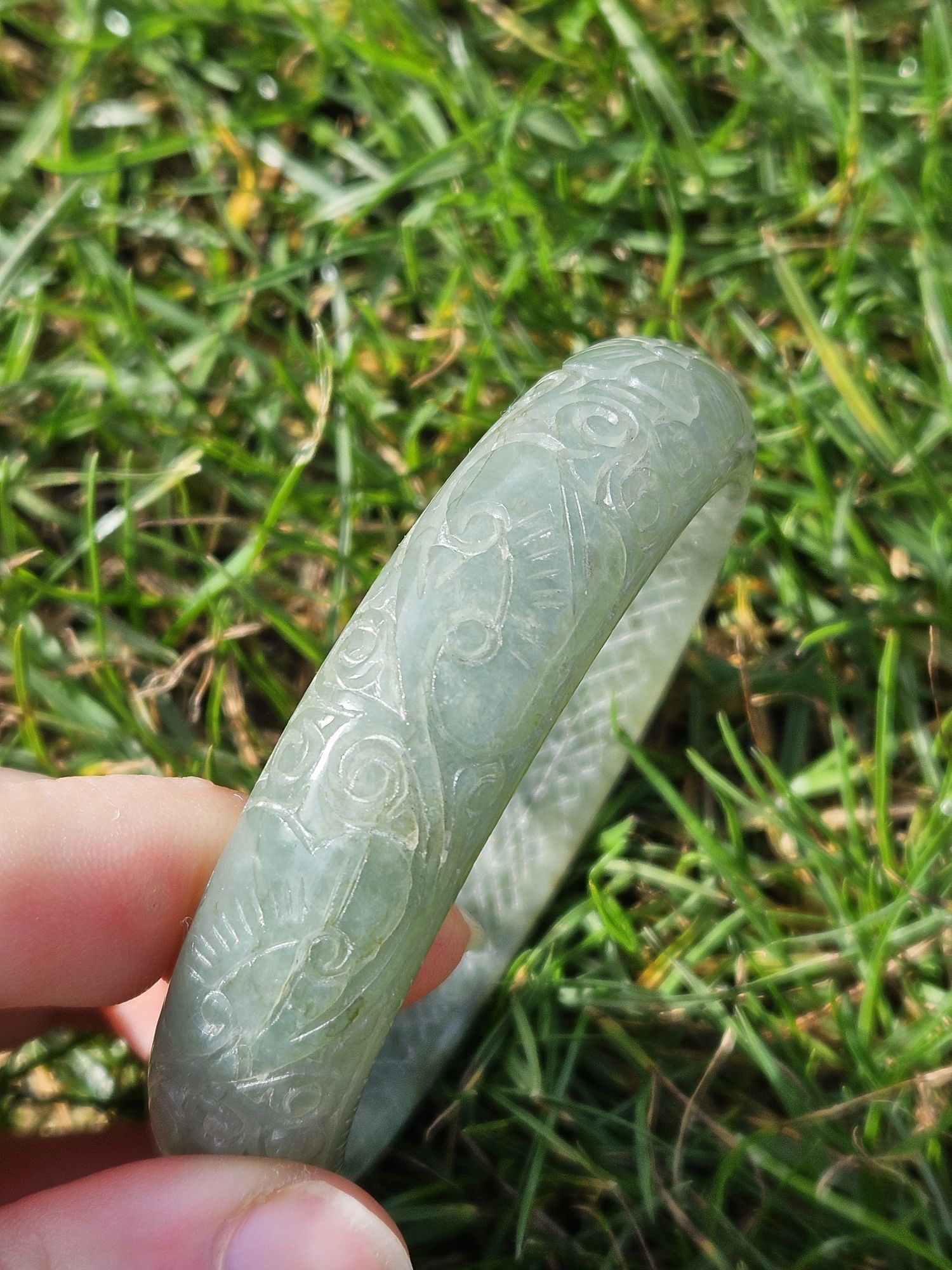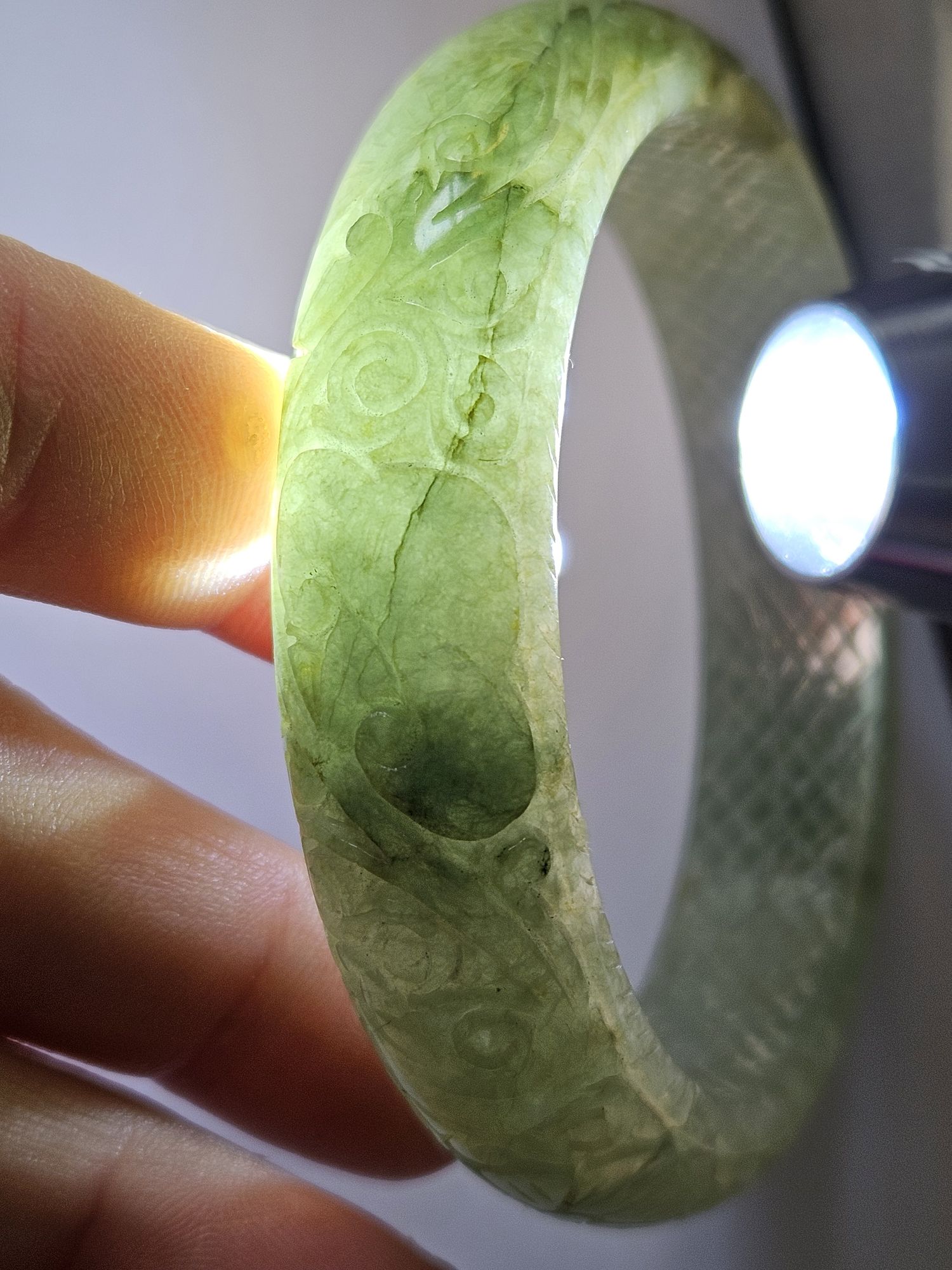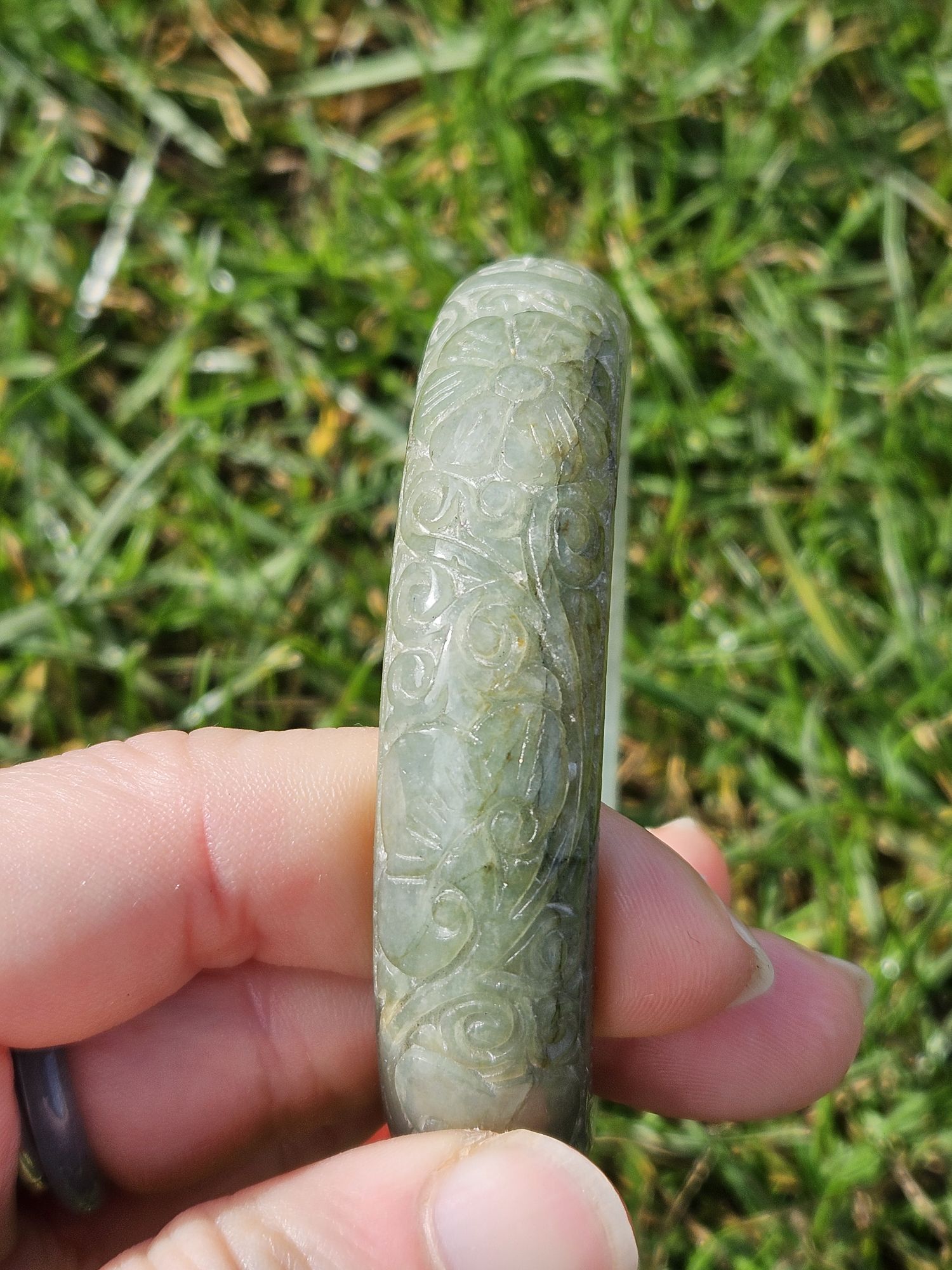 Carved Burmese jadeite bangle with multiple ‘ruyi’ pattern measures 57.7 x 14.8 x 10.9mm, weighs 62.85g, comes with a certificate of authenticity. £198