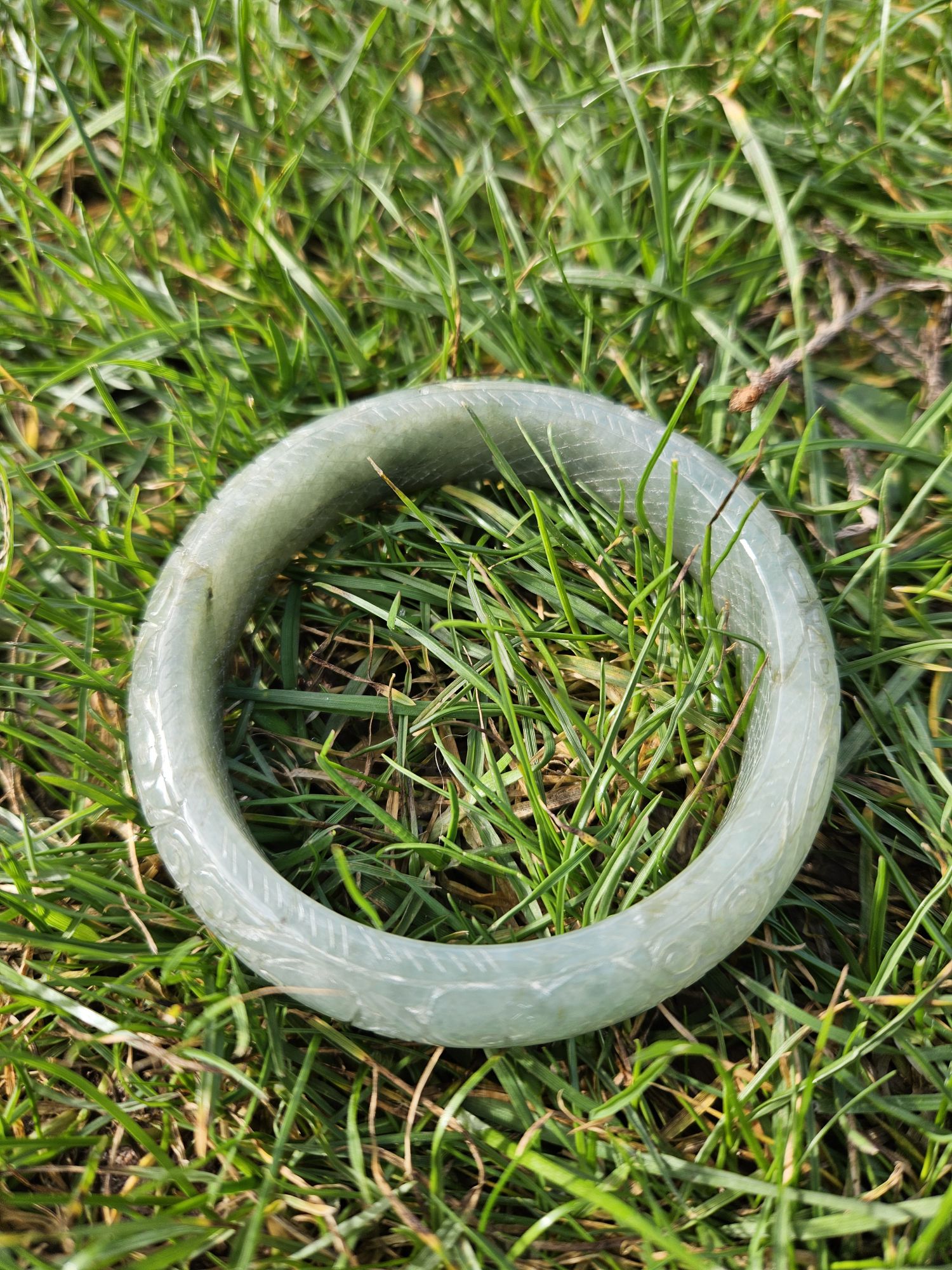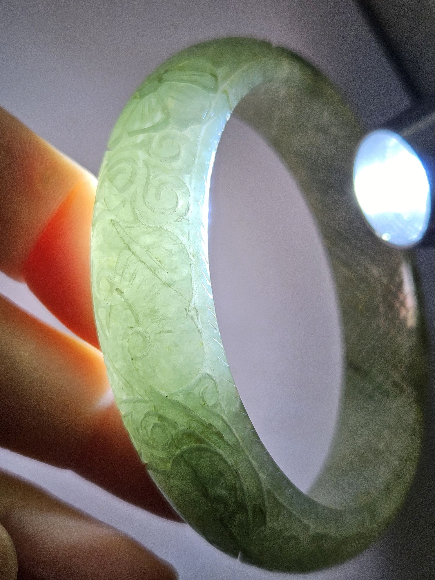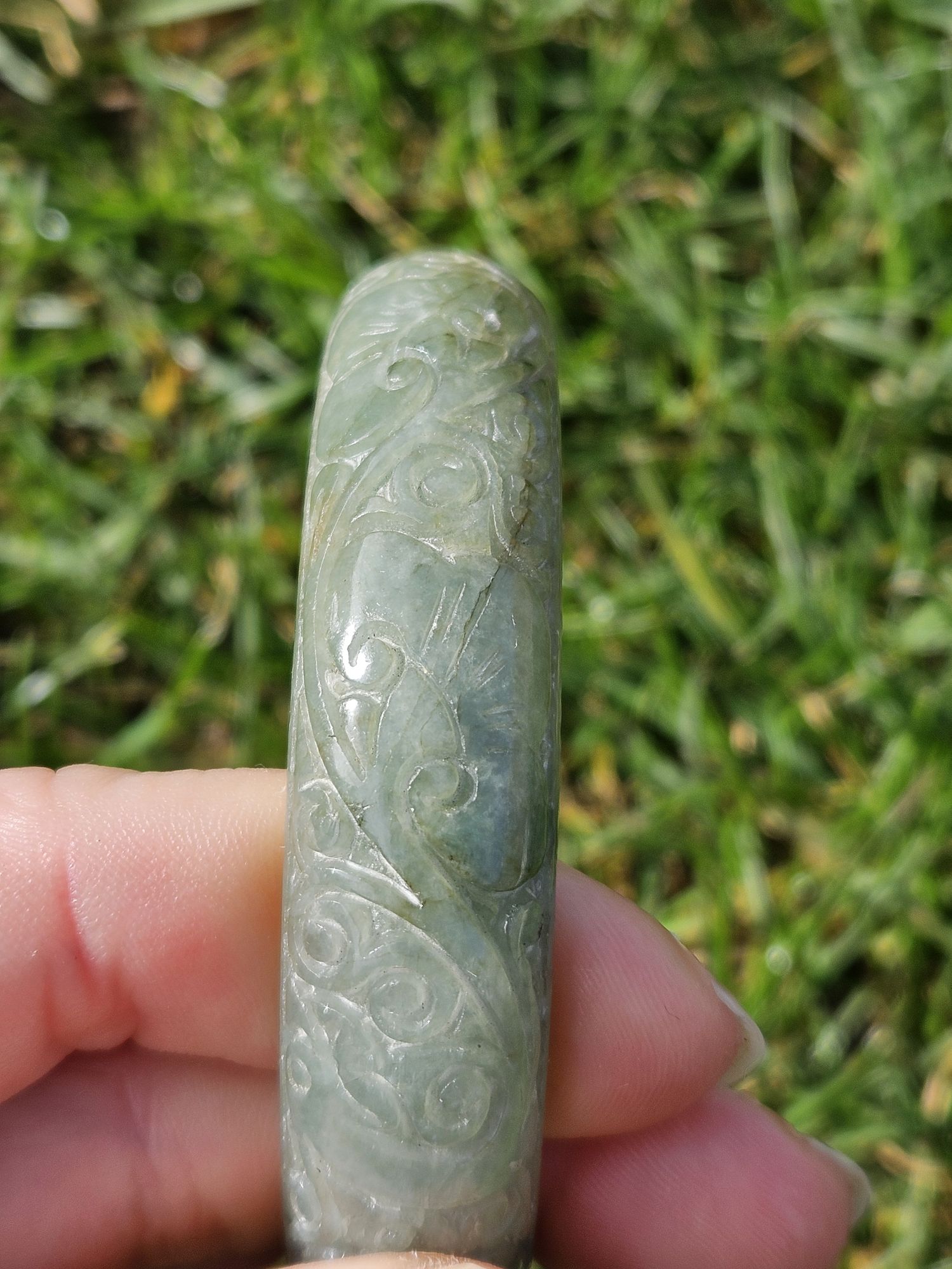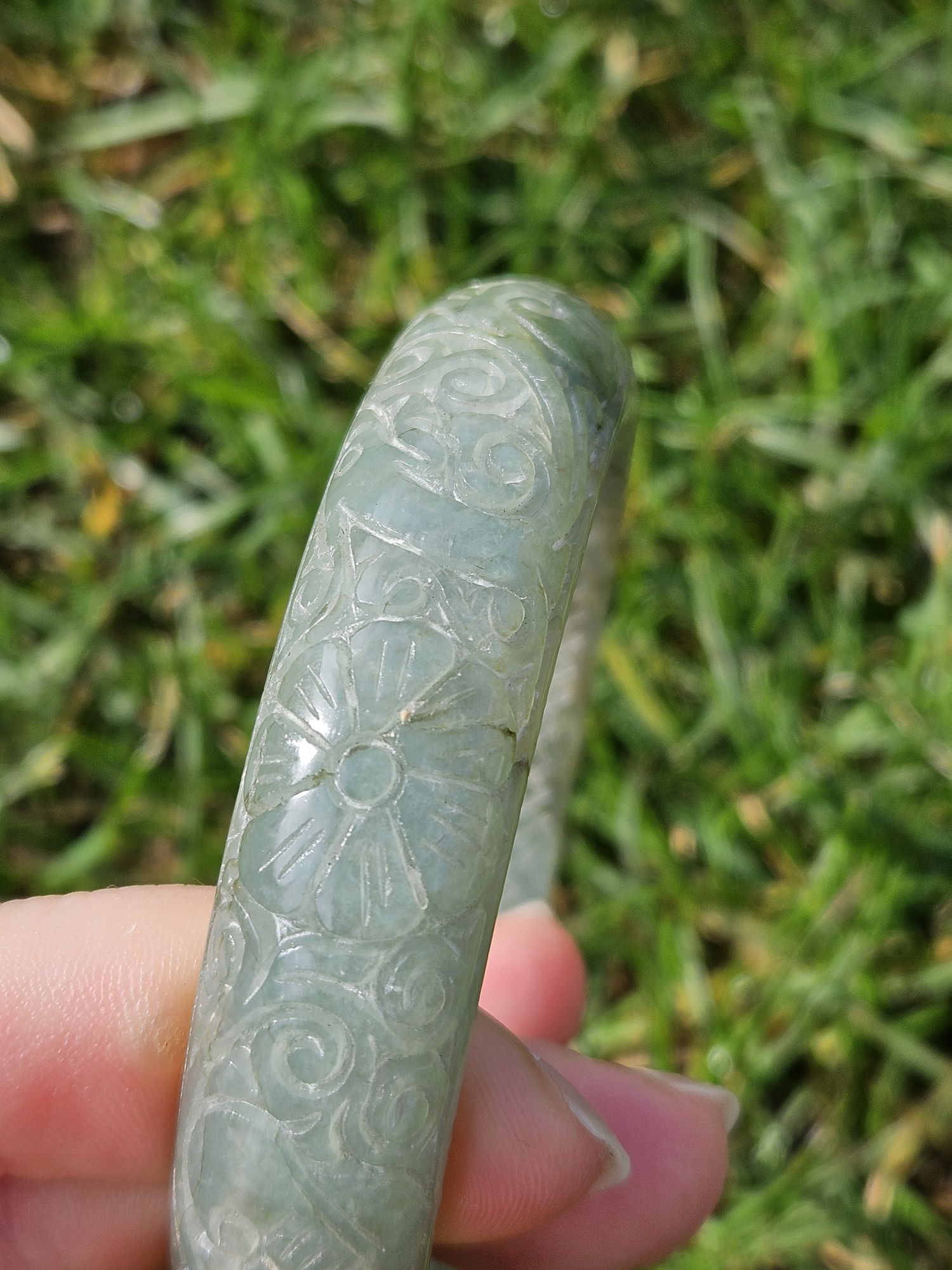 Carved Burmese jadeite bangle with multiple ‘ruyi’ pattern measures 57.7 x 14.8 x 10.9mm, weighs 62.85g, comes with a certificate of authenticity. £198