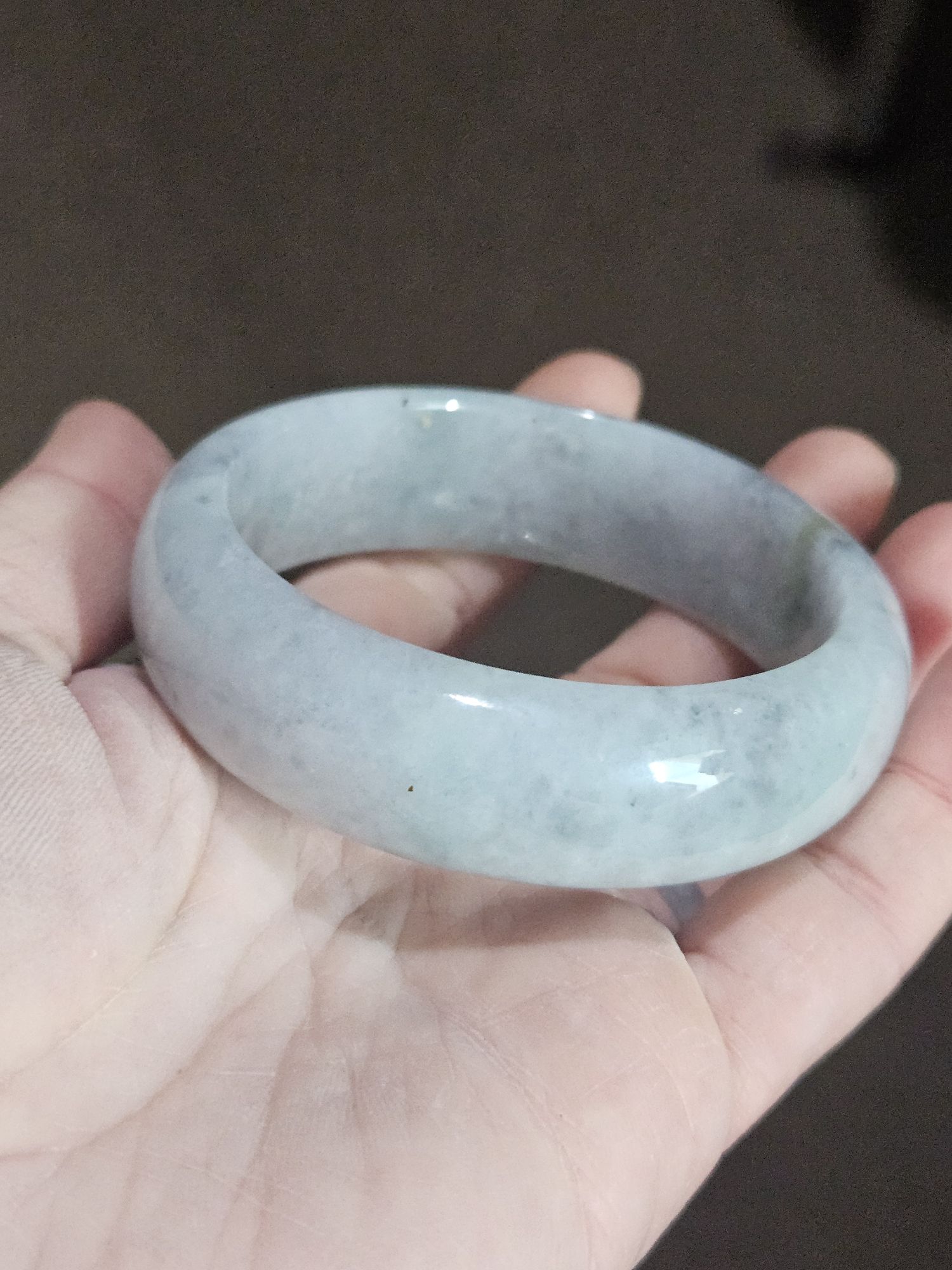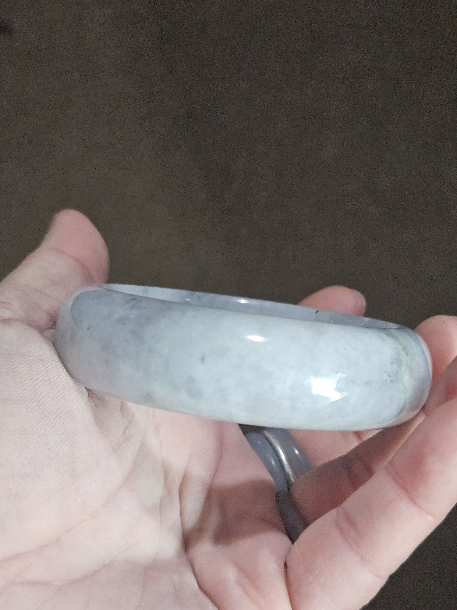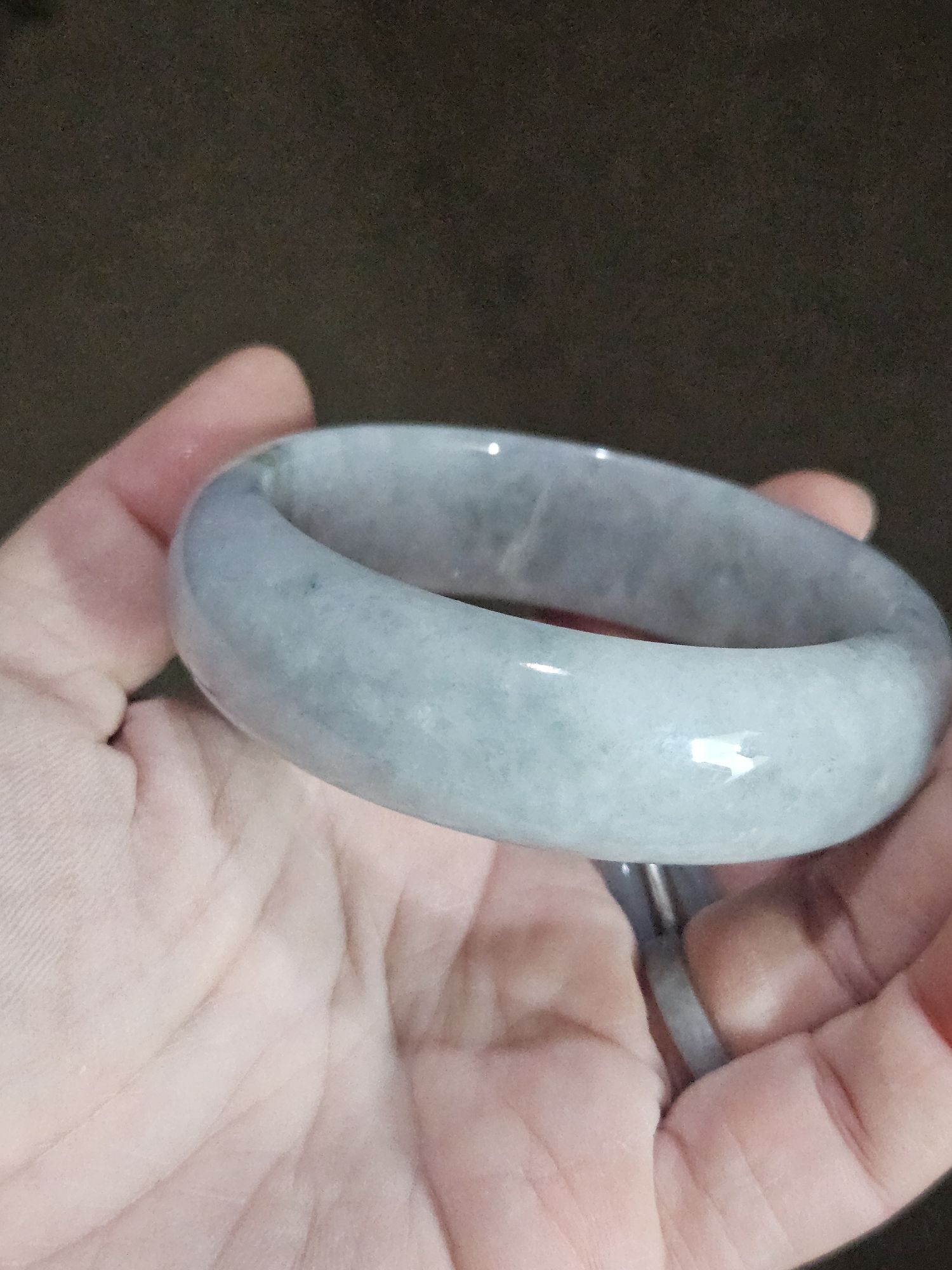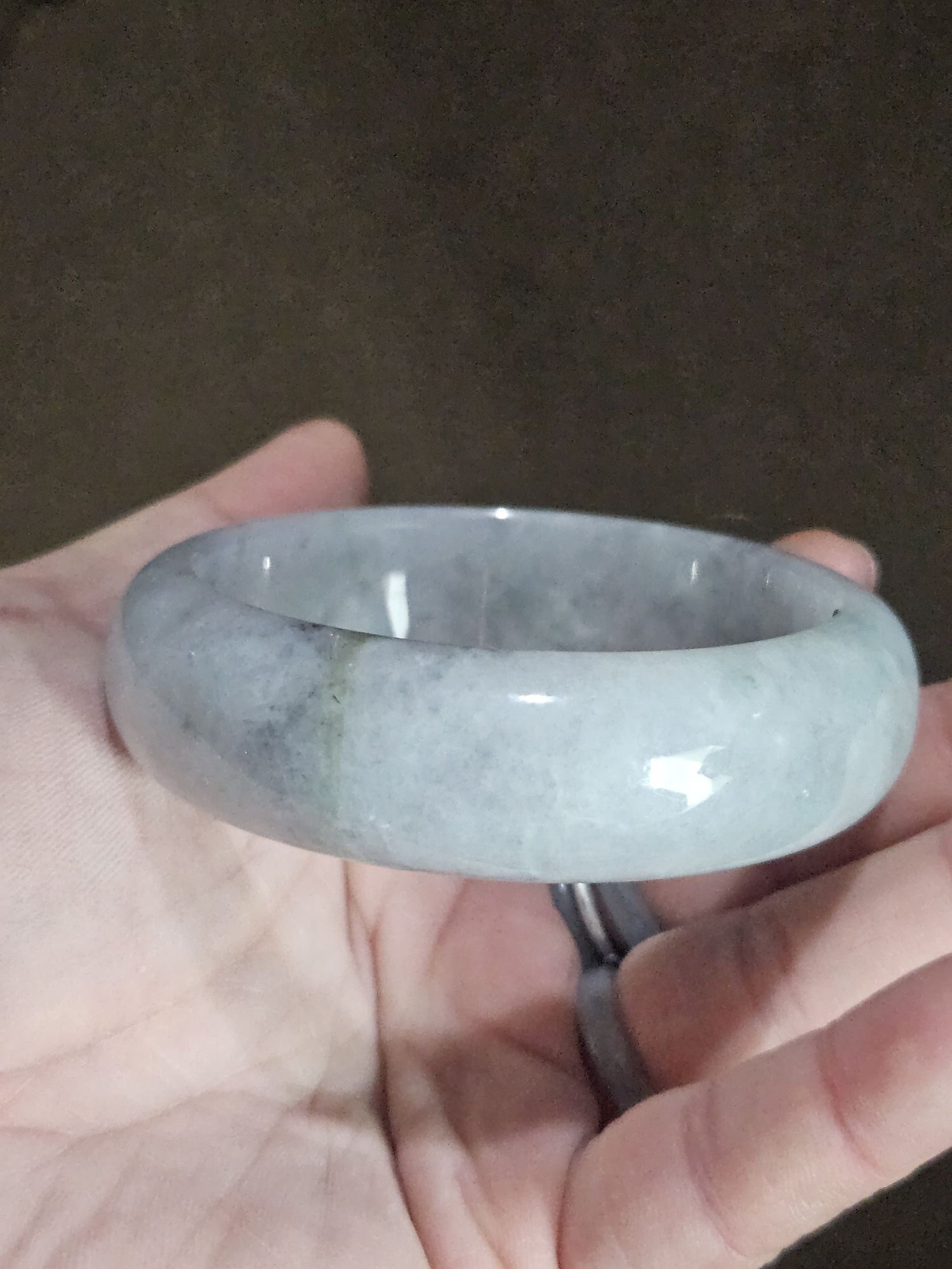 Very modern looking wide Burmese jadeite bangle.in green, purple and bits of smoky grey measures 57.2 x 18.4 x 8.3mm, weighs 84.92g, due to its width, will fit better on 56mm.
