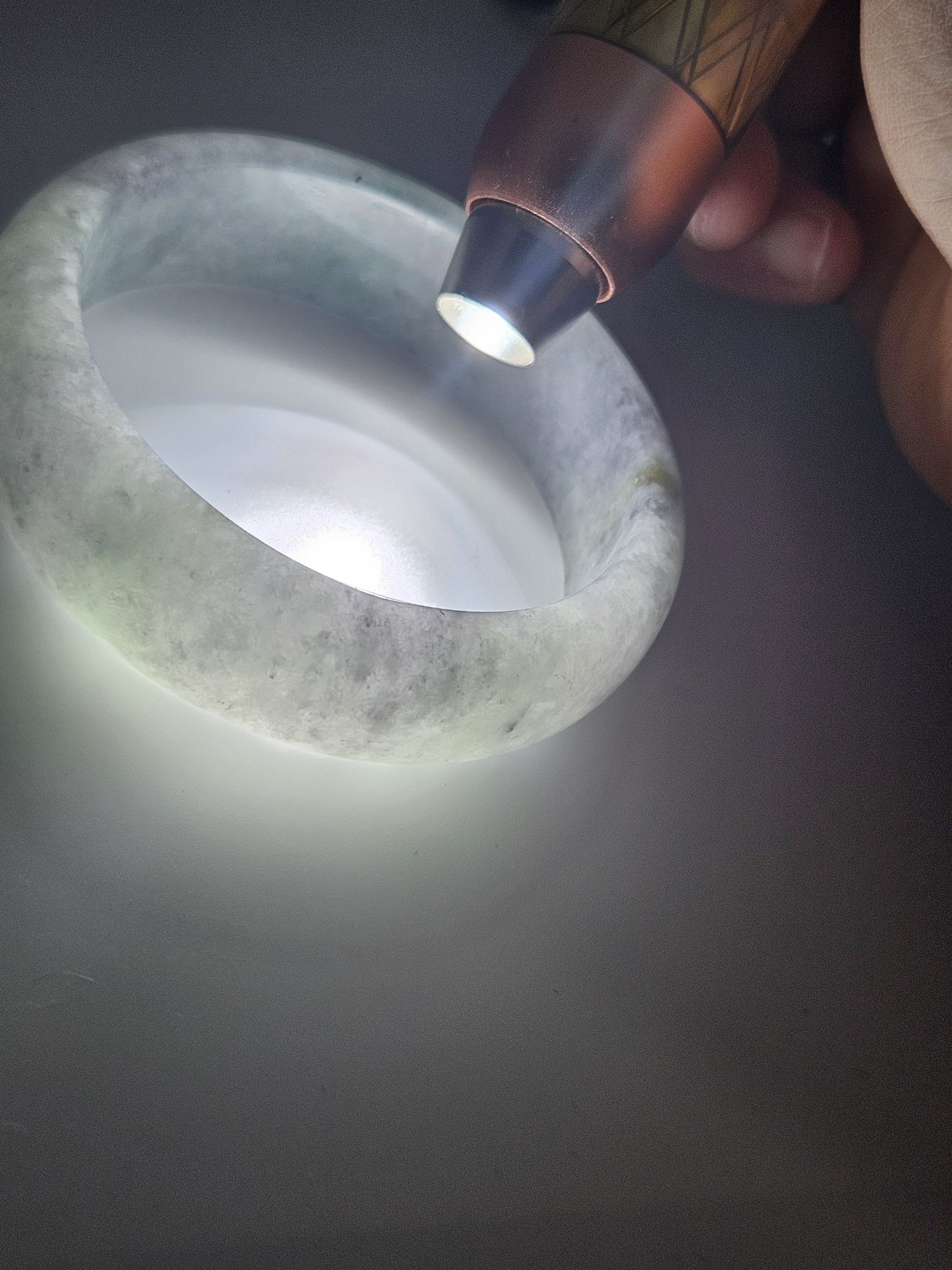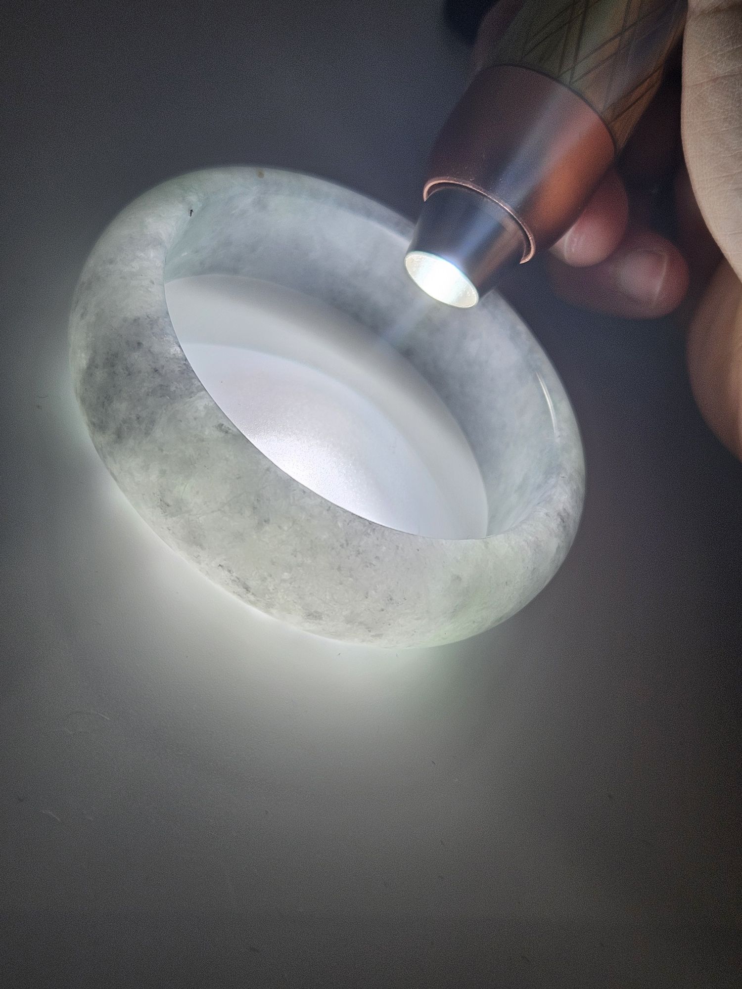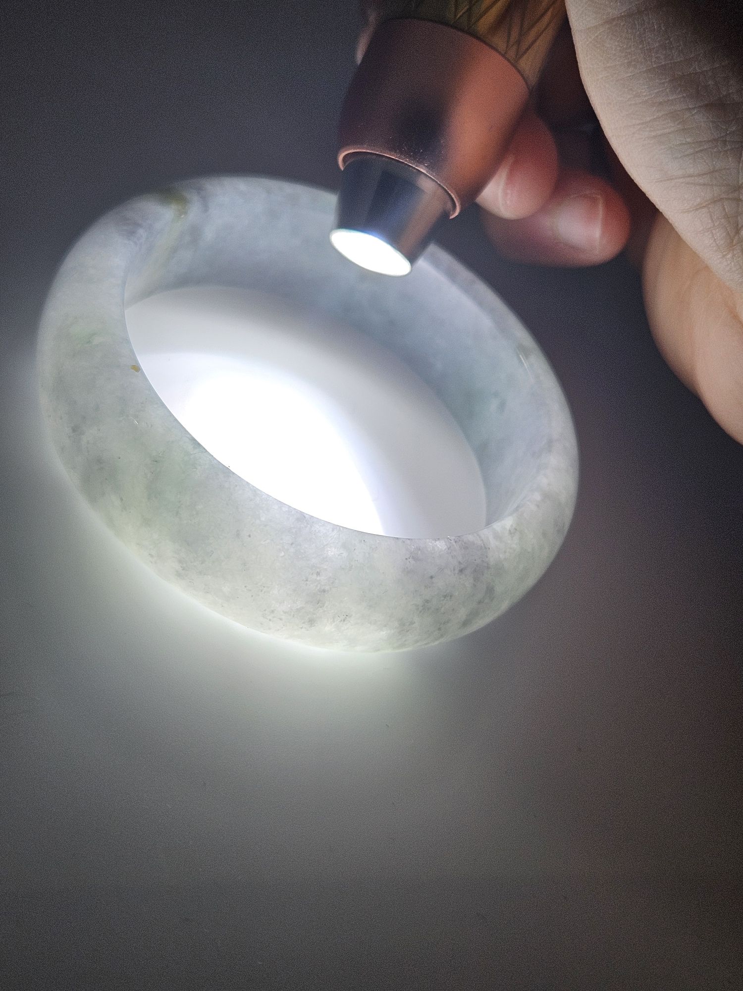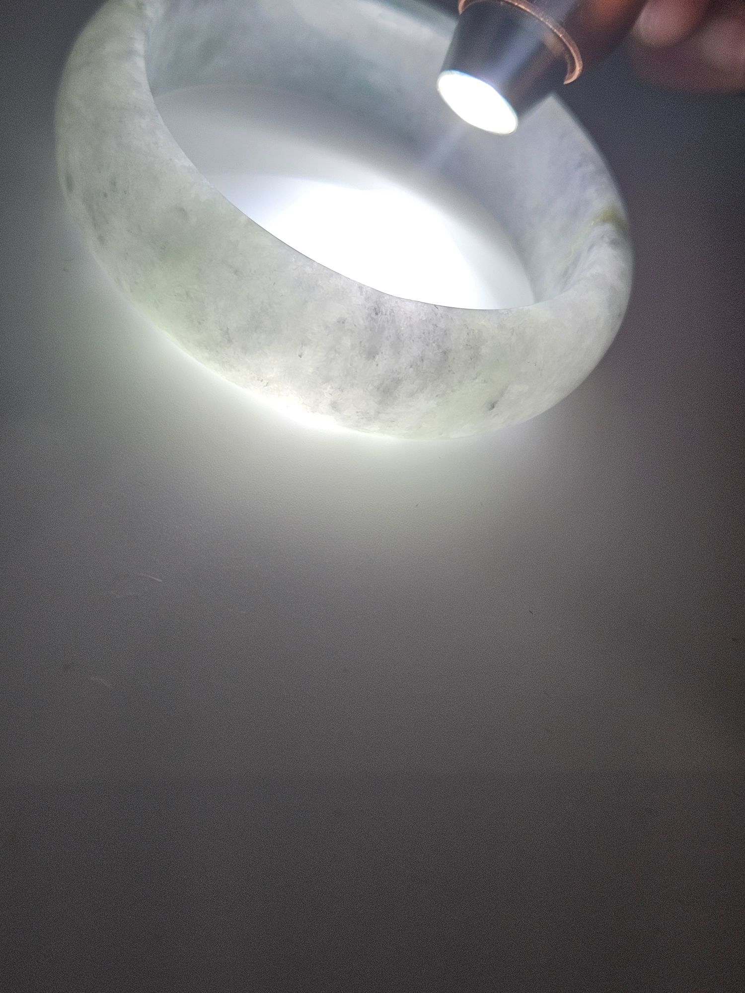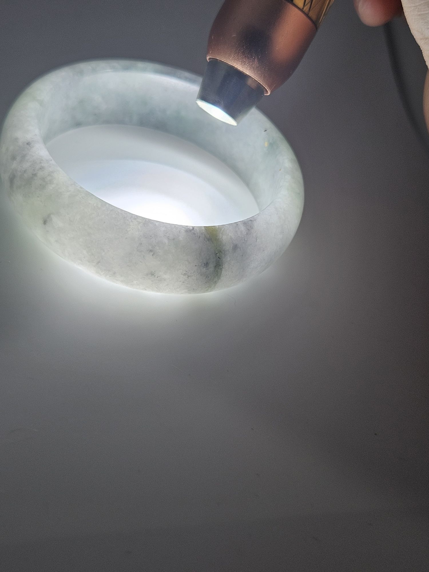 Very modern looking wide Burmese jadeite bangle.in green, purple and bits of smoky grey measures 57.2 x 18.4 x 8.3mm, weighs 84.92g, due to its width, will fit better on 56mm.