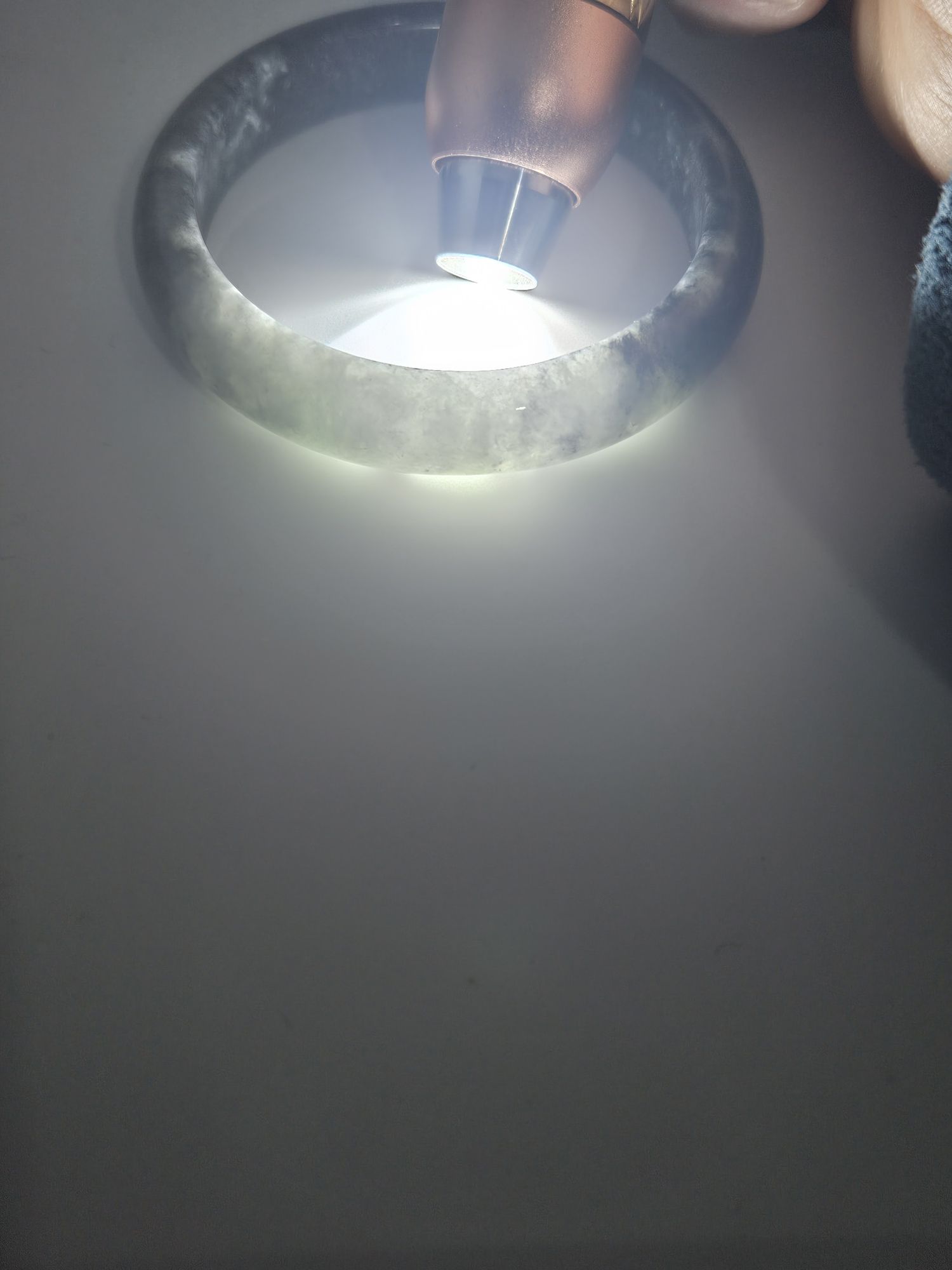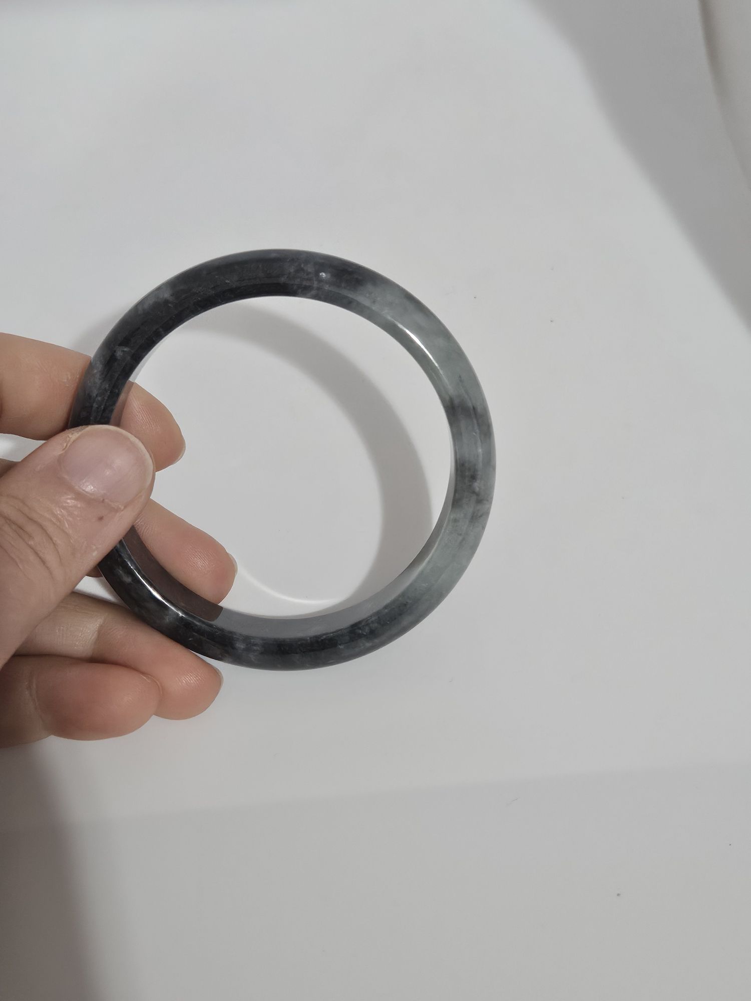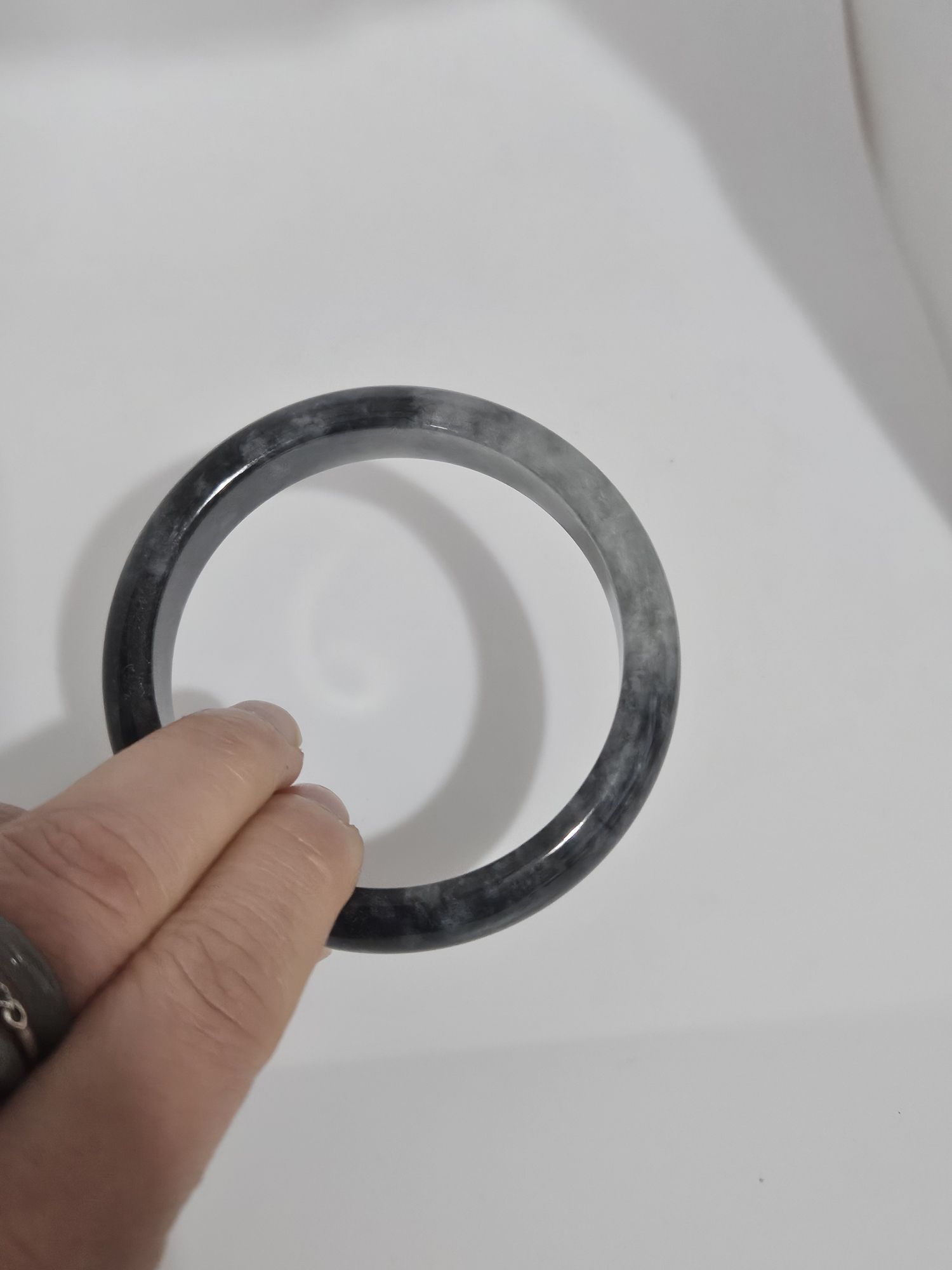 Three quarter smoky grey and green Burmese jadeite bangle. Majority of the smoky grey part is too dark for lights to shine through. Measures 57 x 12.7 x 7.4mm, weighs 51.8g, comes with a certificate of authenticity £109