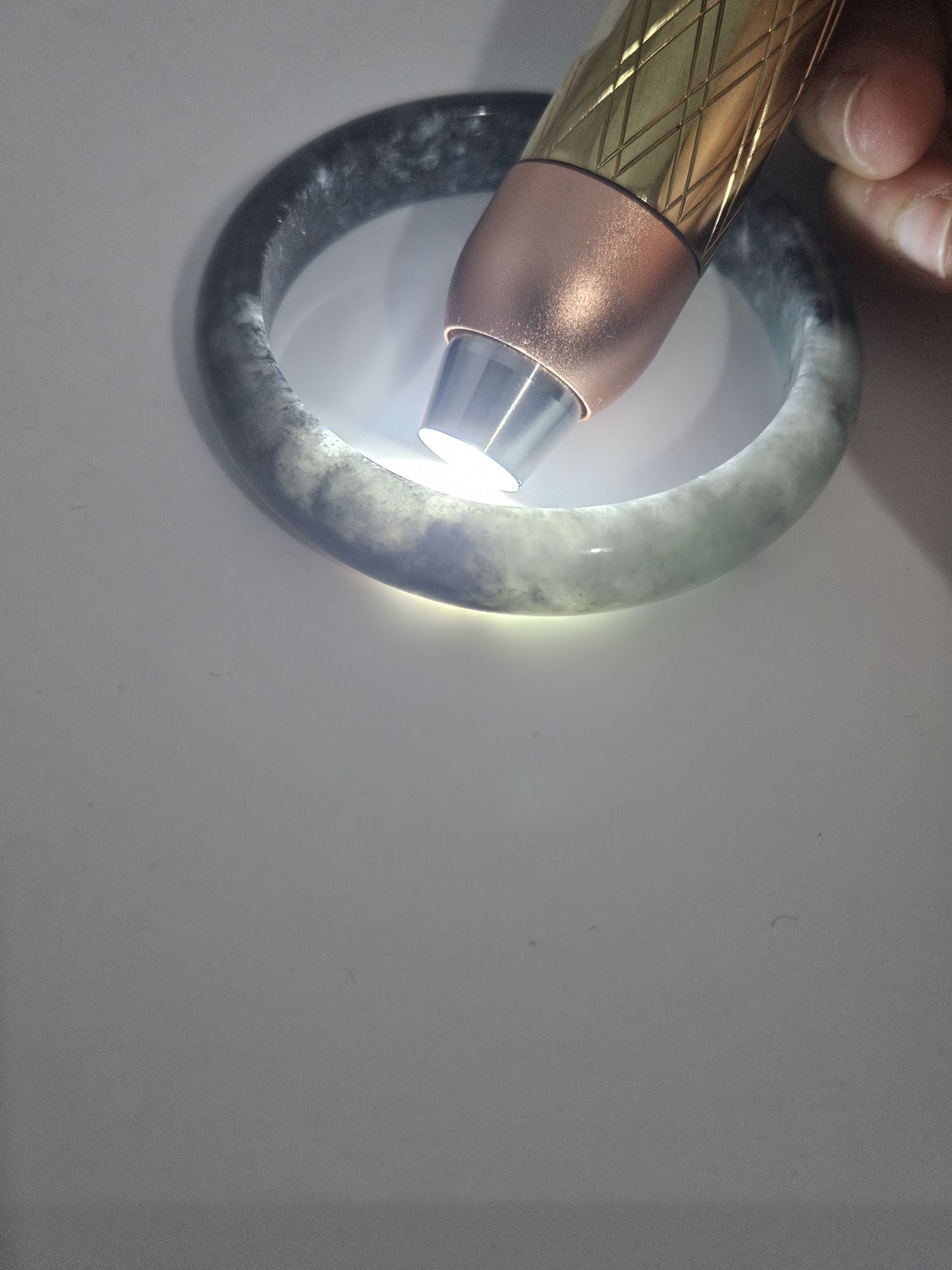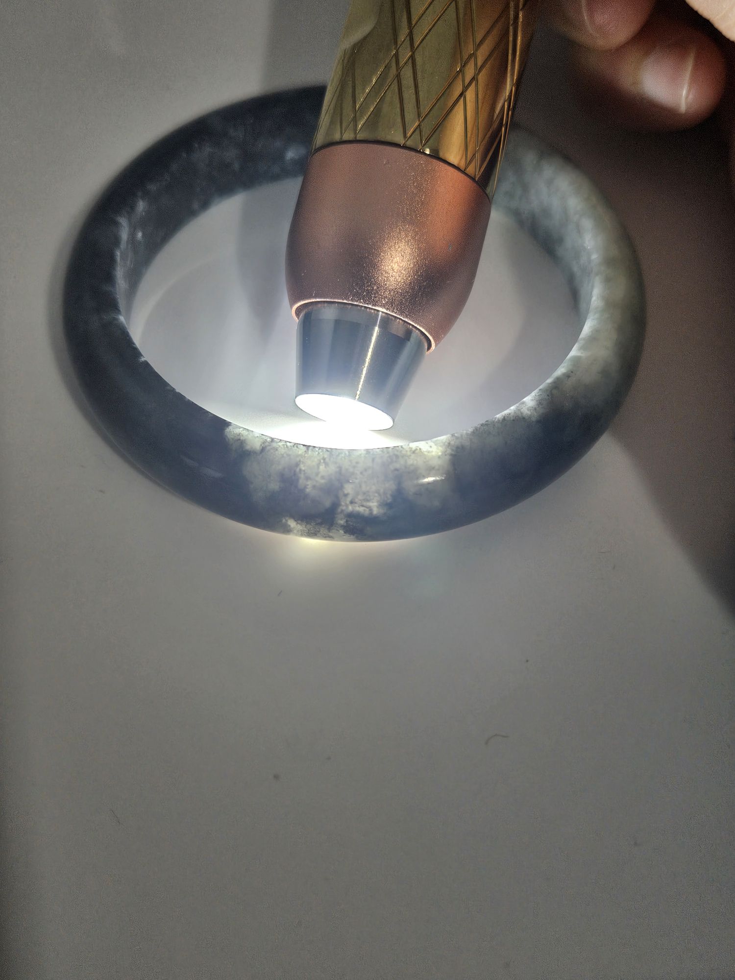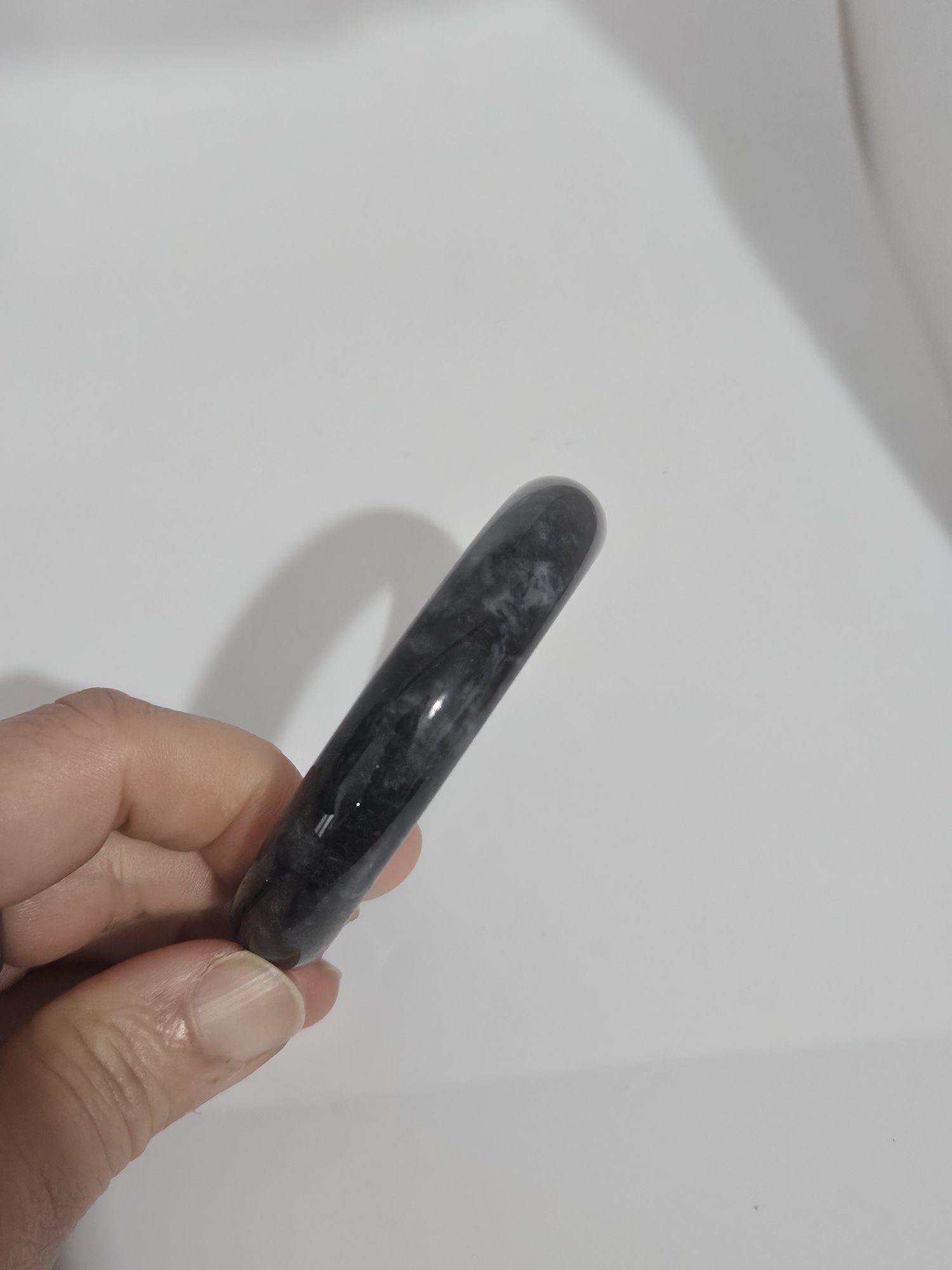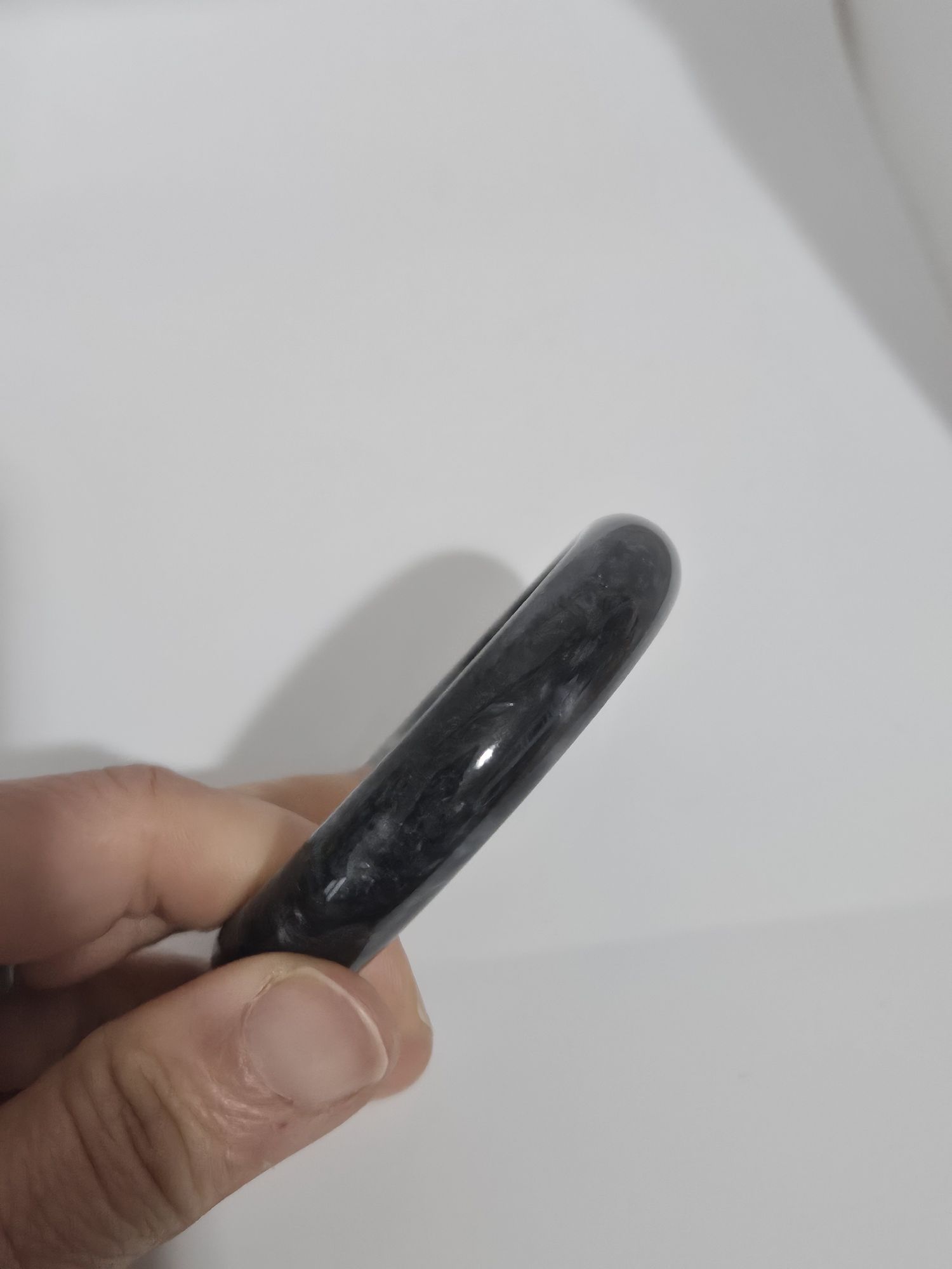 Three quarter smoky grey and green Burmese jadeite bangle. Majority of the smoky grey part is too dark for lights to shine through. Measures 57 x 12.7 x 7.4mm, weighs 51.8g, comes with a certificate of authenticity £109