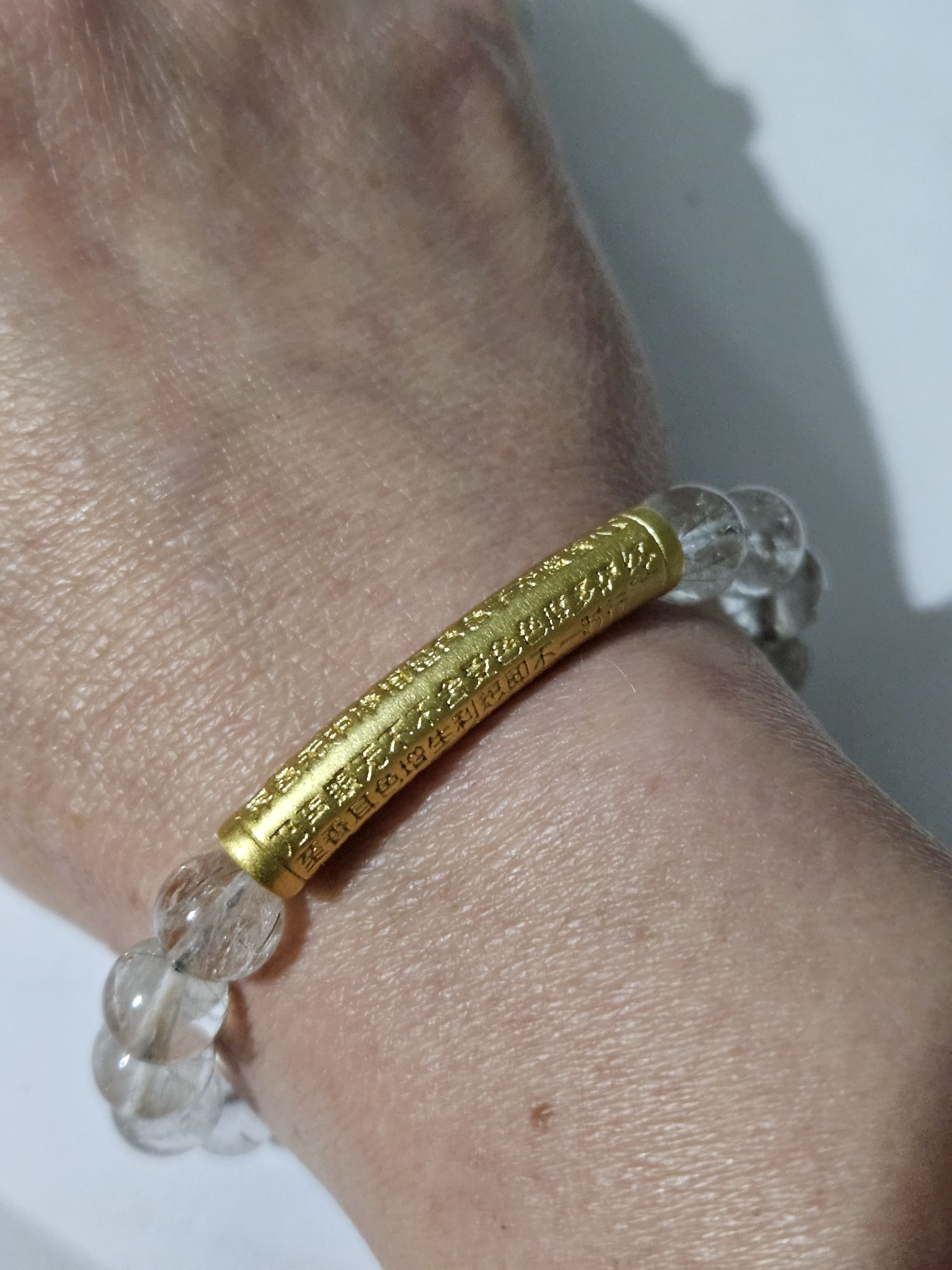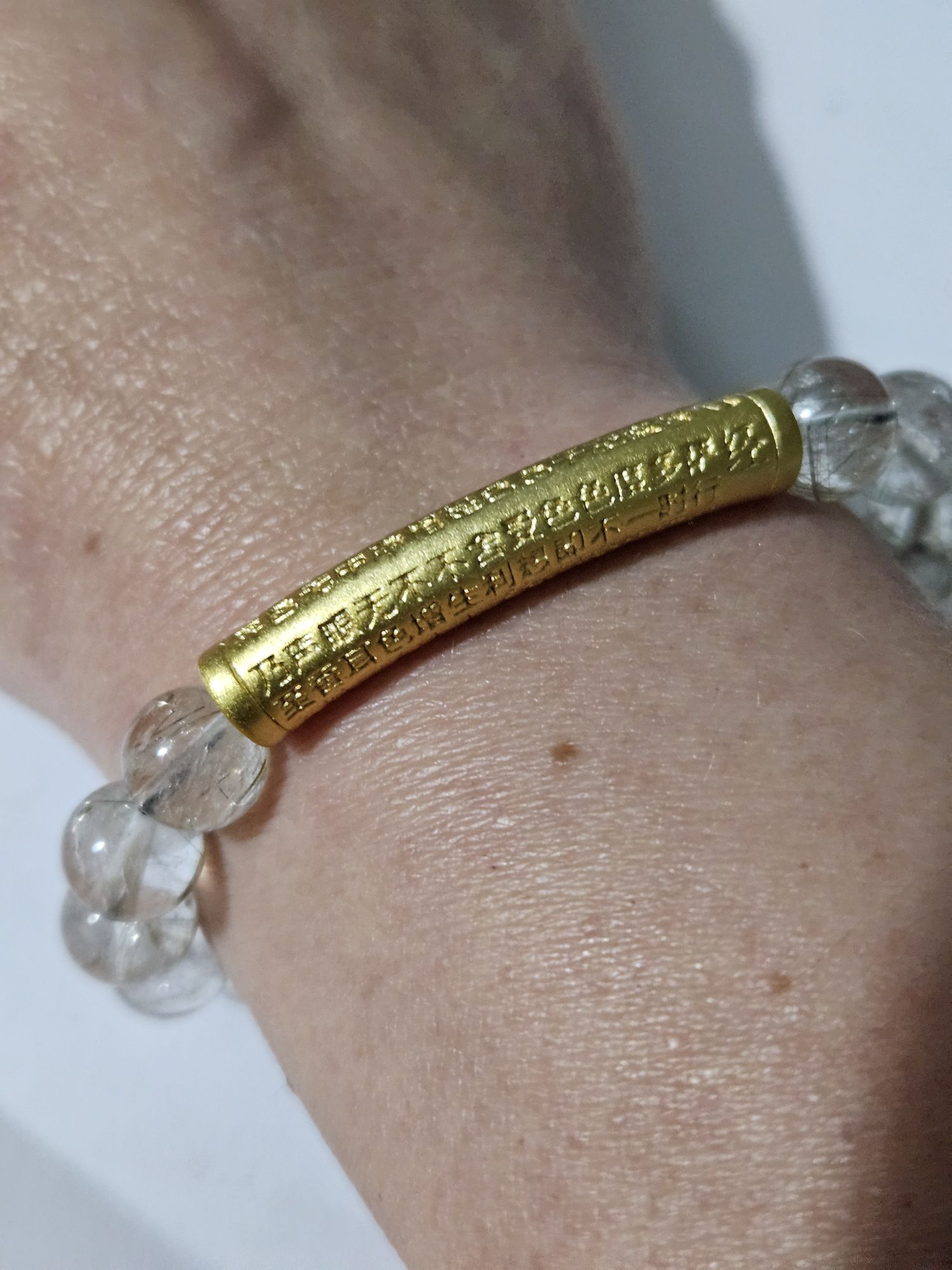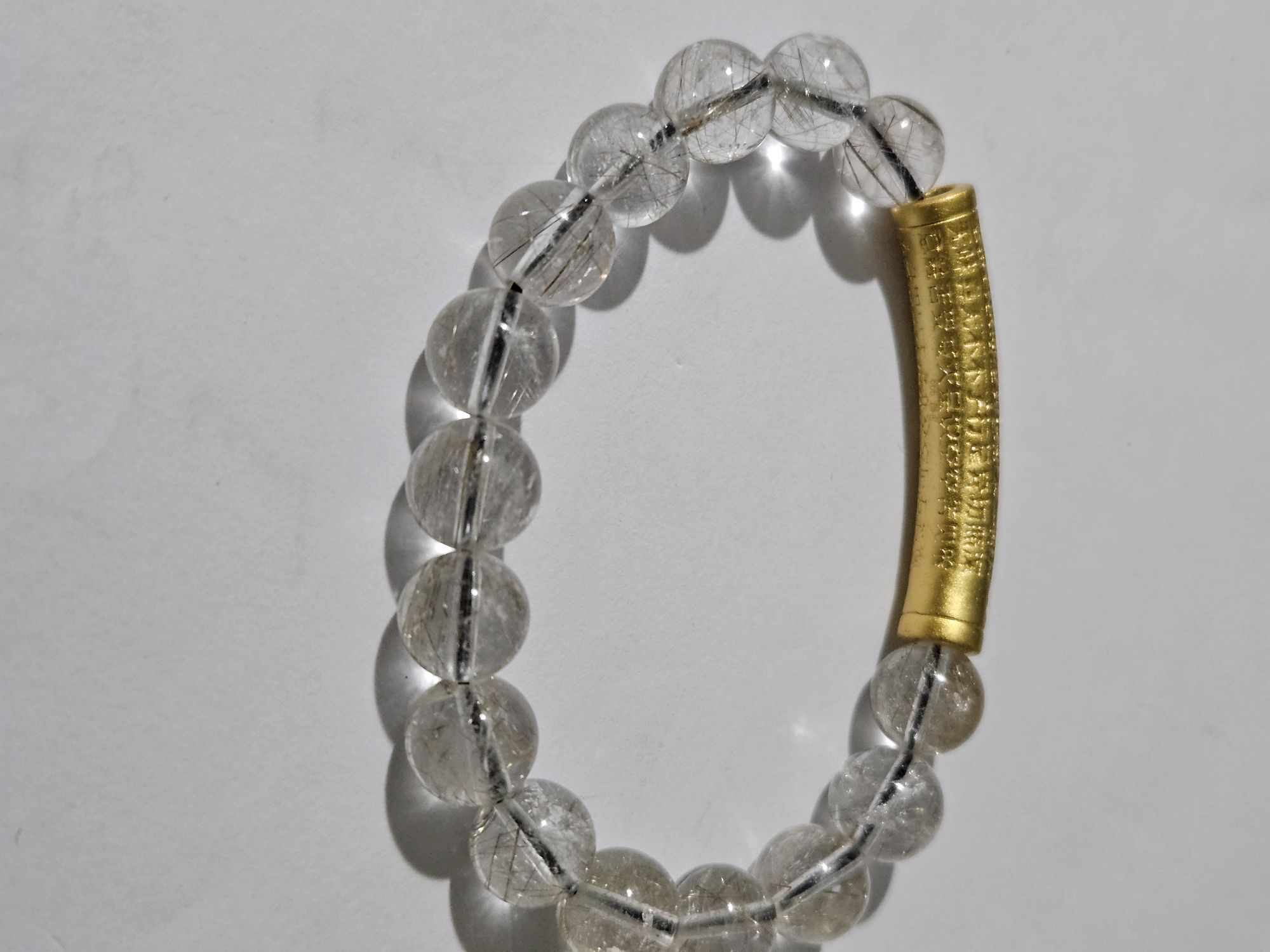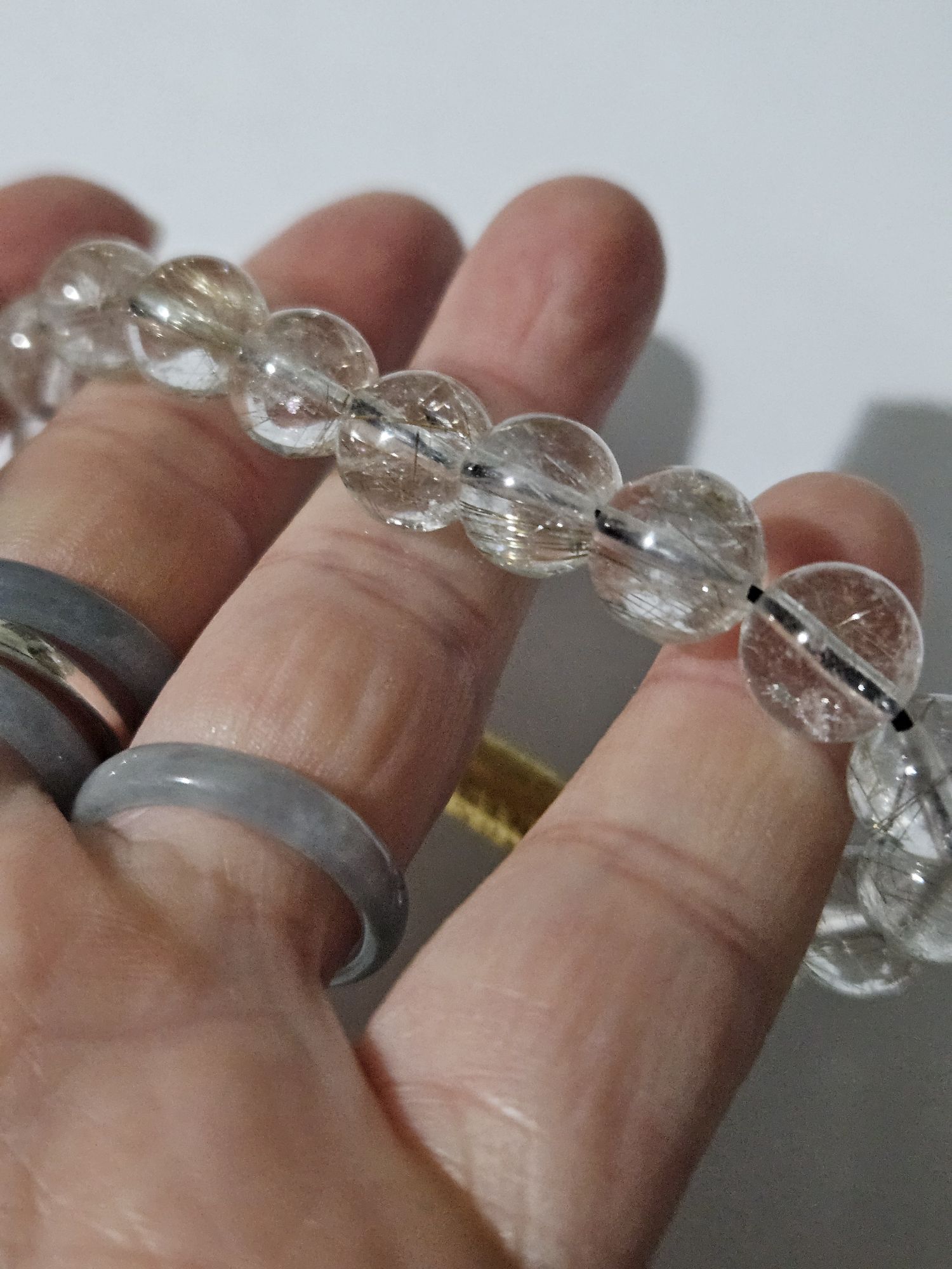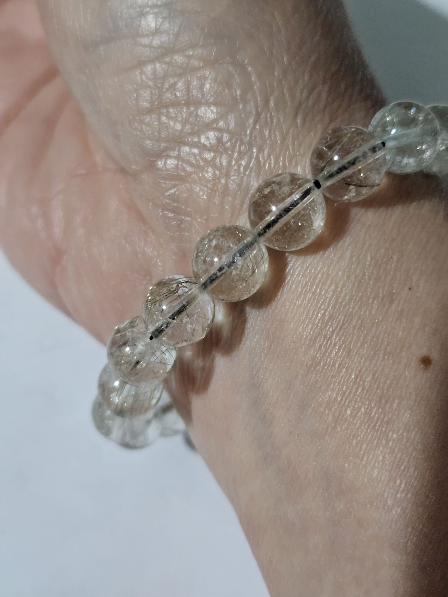 Fits up to 16cm wrist. Healing Properties of Silver Rutilated Quartz include acting as a potent energy filter, purging negative emotions and fostering emotional clarity. The presence of golden or silver rutile needles is believed to infuse the stone with transformative energy that aids in releasing emotional baggage and promoting self-love.