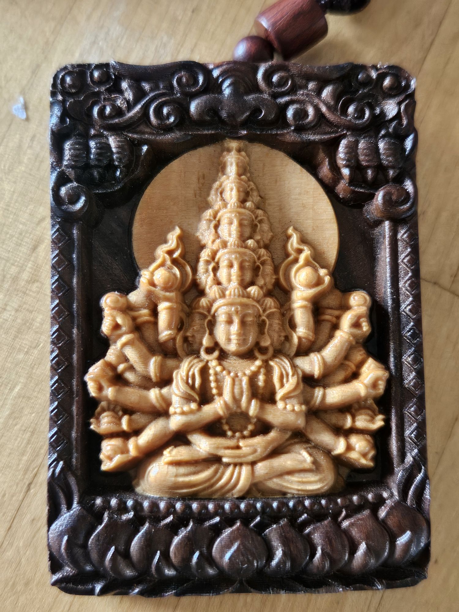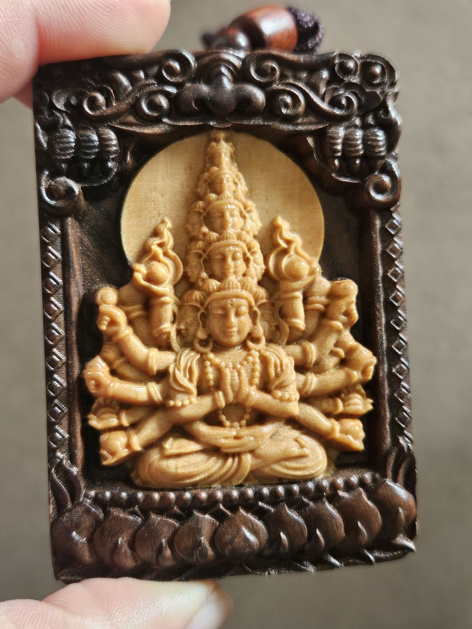 Made of boxwood and agarwood, engraved with the thousand hands Guanyin. It is a symbol of enlightenment and compassion. Thousands of hands Guanyin have a huge number of eyes. Through them, Guan Yin sees everything that happens in the world and this is her great strength.