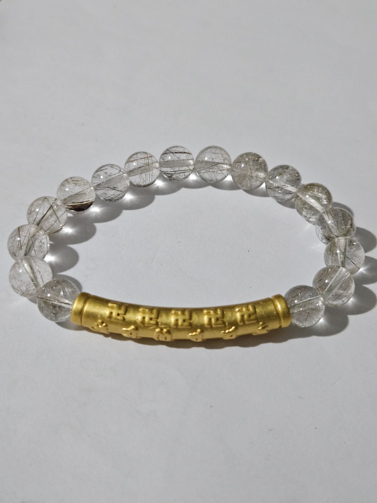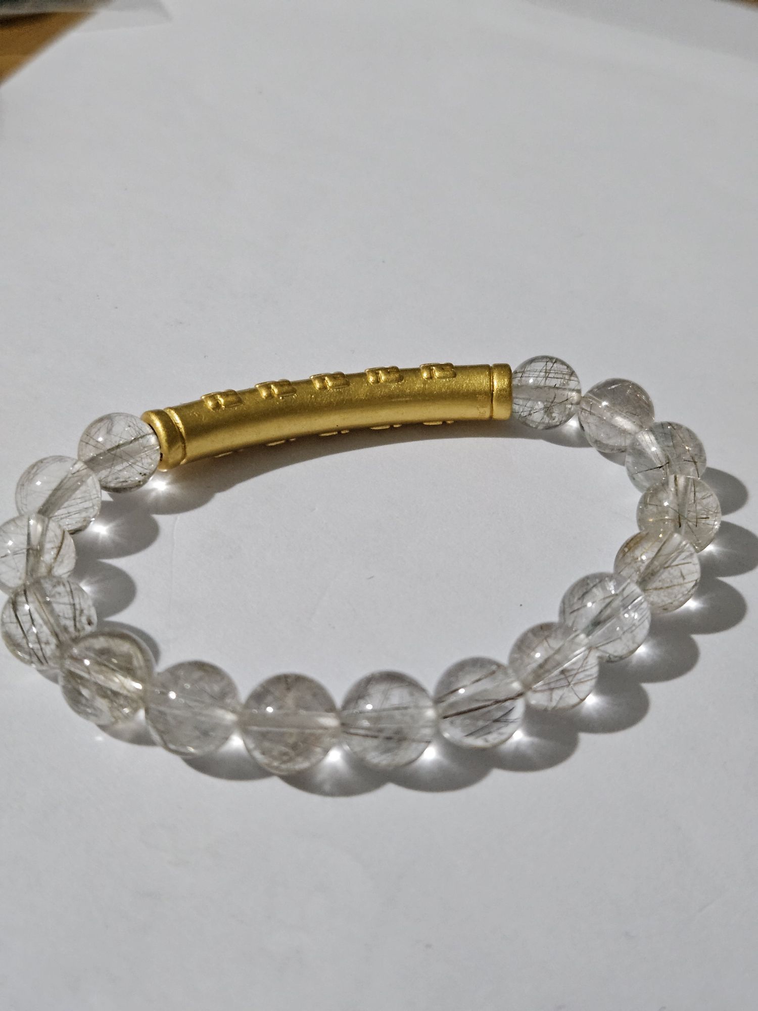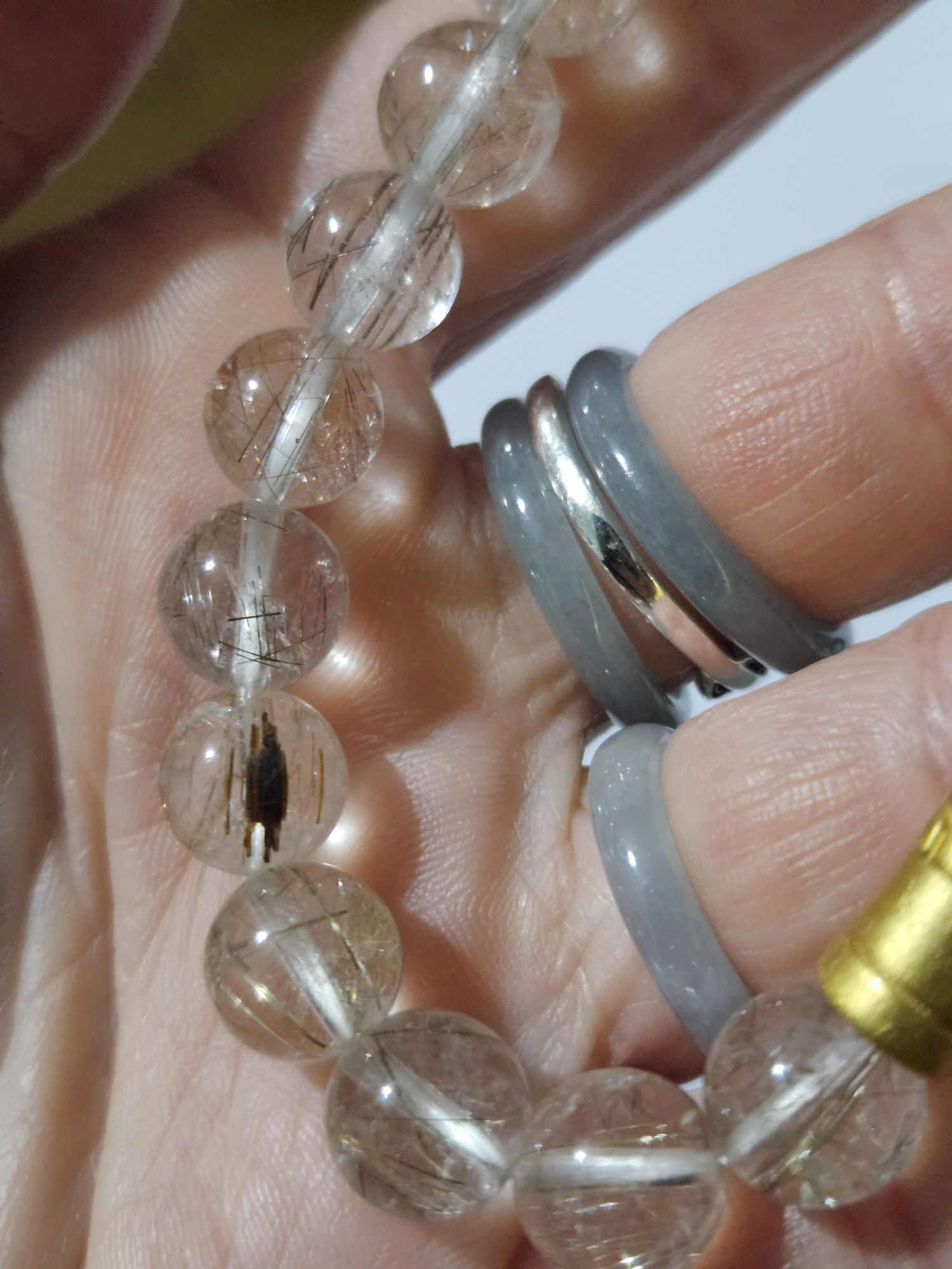 Fits up to 17cm wrist. Healing Properties of Silver Rutilated Quartz include acting as a potent energy filter, purging negative emotions and fostering emotional clarity. The presence of golden or silver rutile needles is believed to infuse the stone with transformative energy that aids in releasing emotional baggage and promoting self-love.