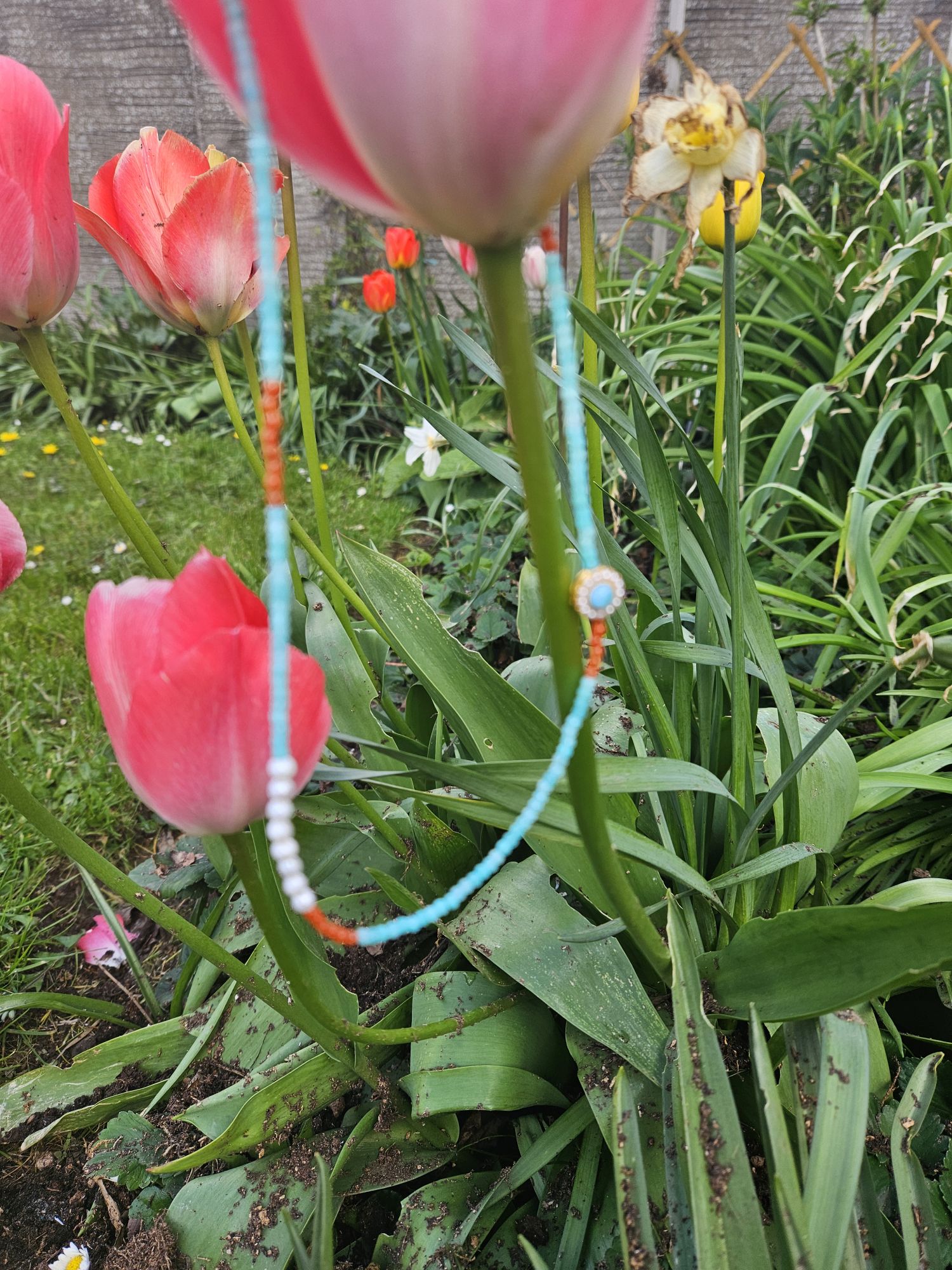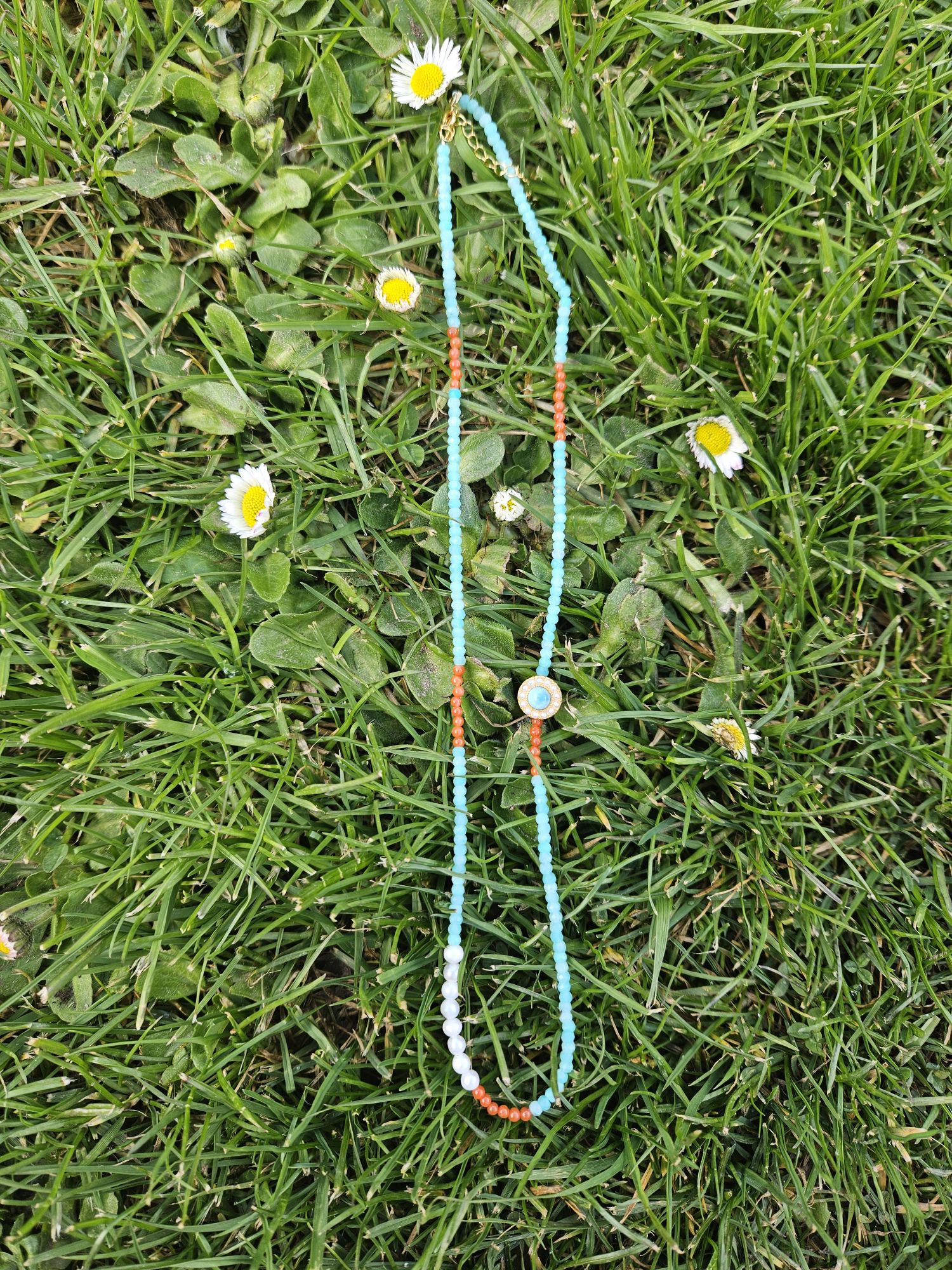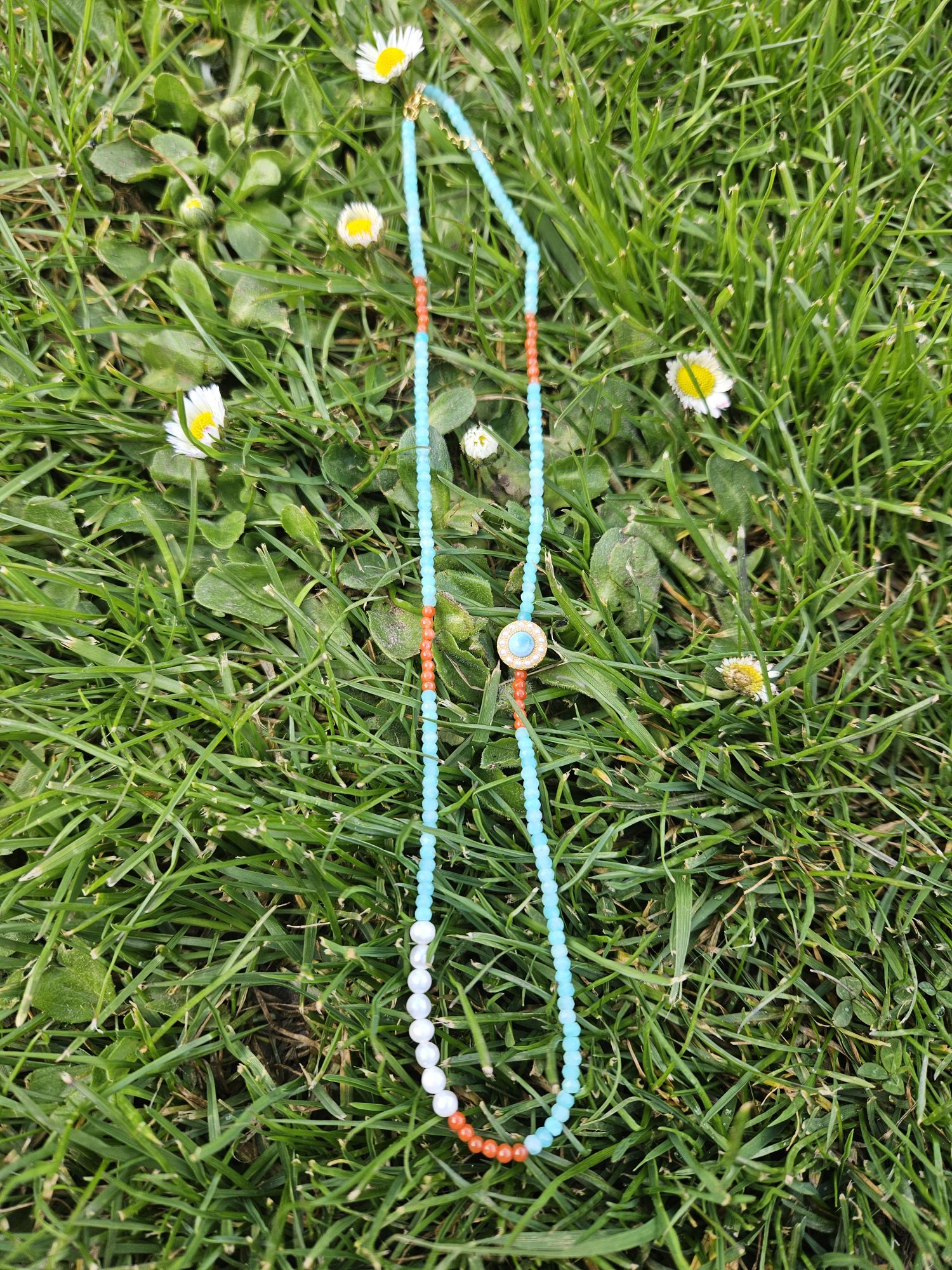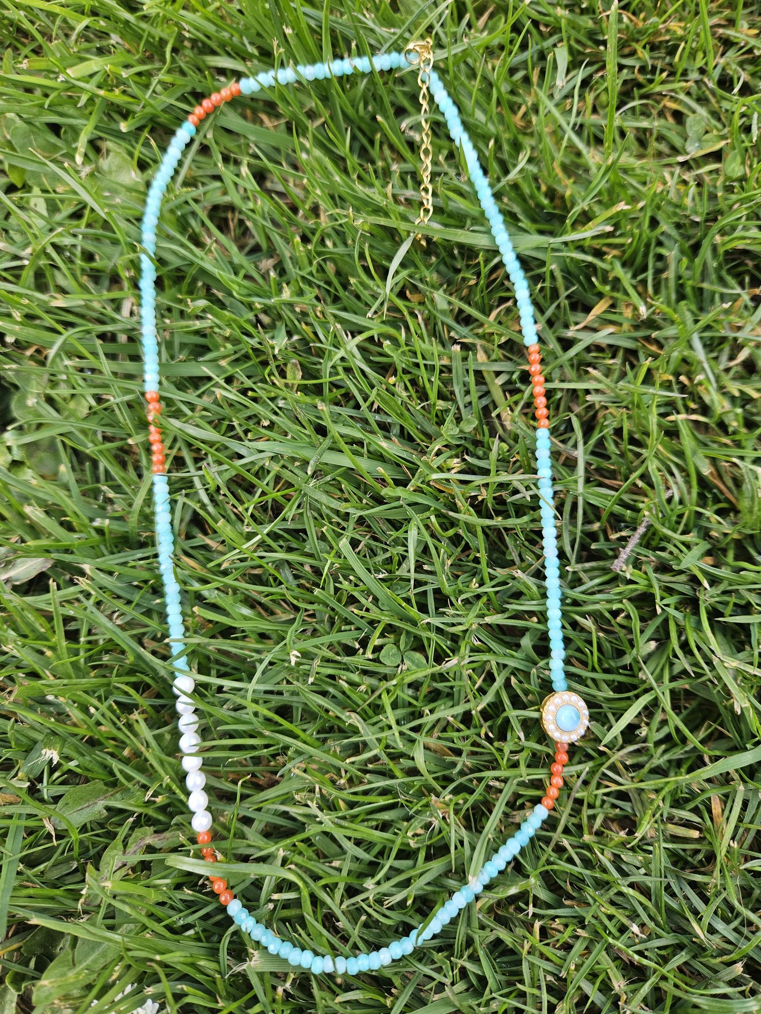 Made up of 3mm Amazonite and Nanhong faceted beads, 4mm freshwater pearls, and one 5mm Amazonite with a halo of pearls around it, the length with extender is about 20 inches. The metal extender is hallmarked S925.