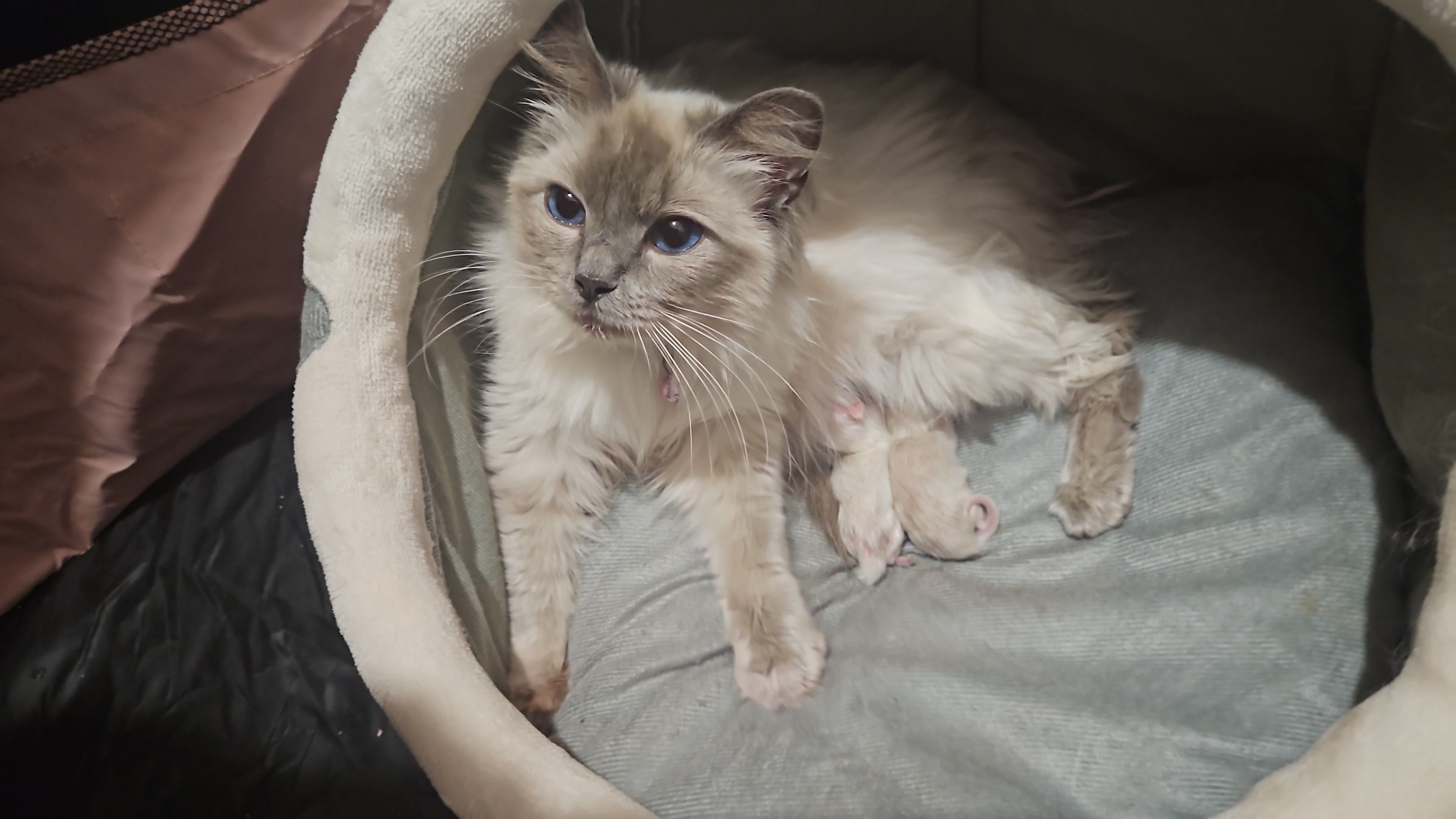 Two days ago, Milo and Miko made me a grandma. We now have two surviving kittens. Miko is such a good mum. It is such a pleasure to watch her looking after her kitties.
