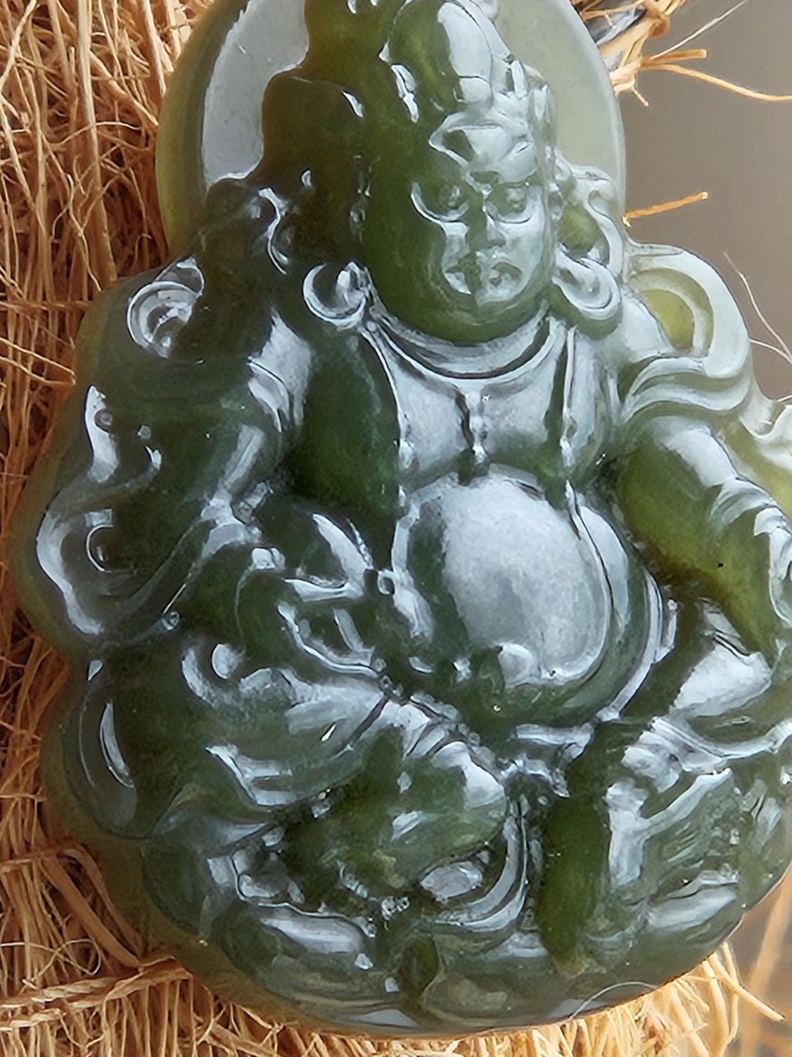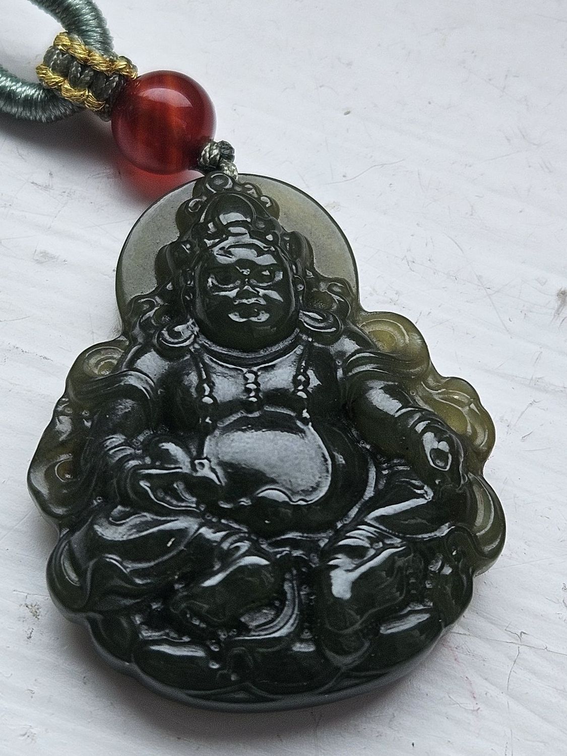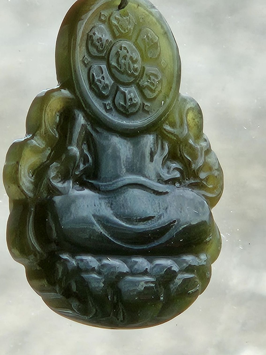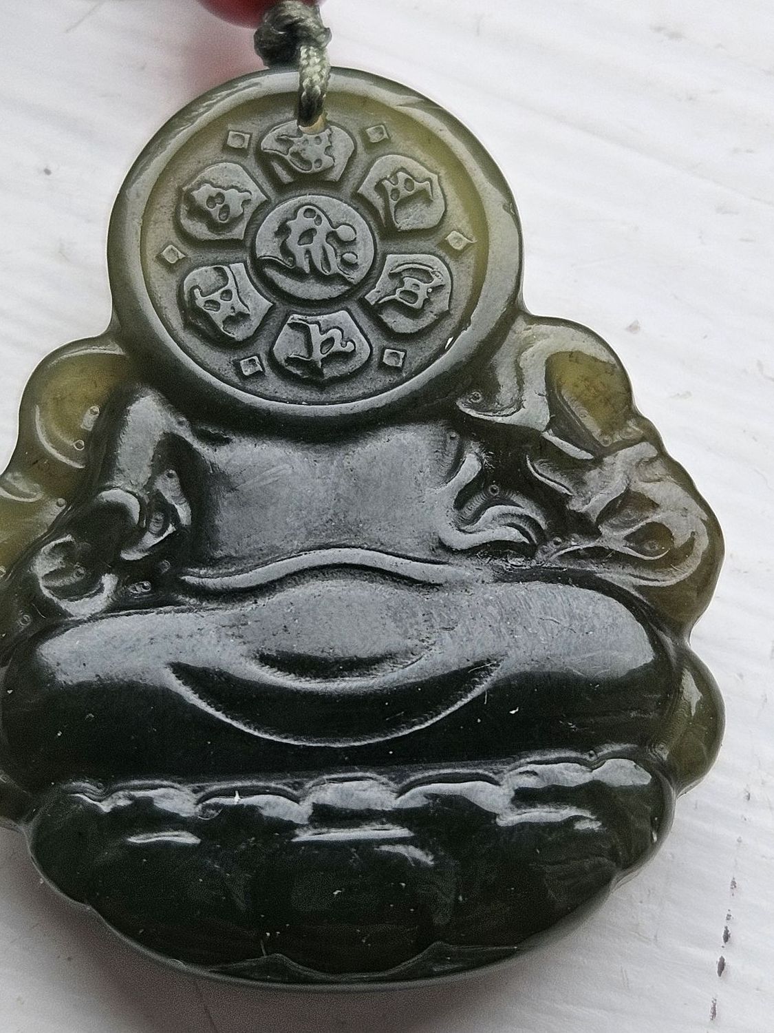 Made of Hetian Biyu, one of the 4 famous jade in China, measures 32.2 x 26.5 x 8.1mm. Comes on an adjustable string chain.£99