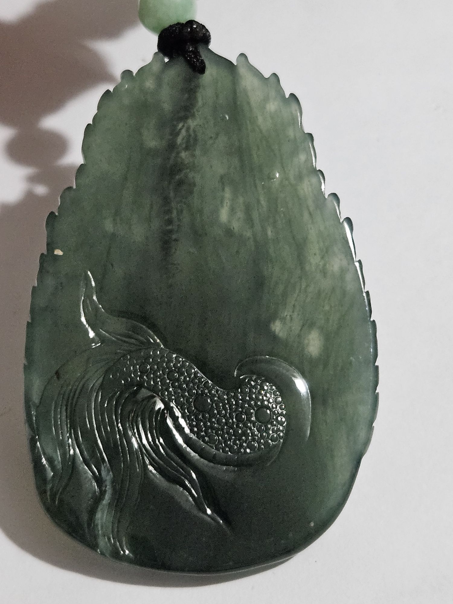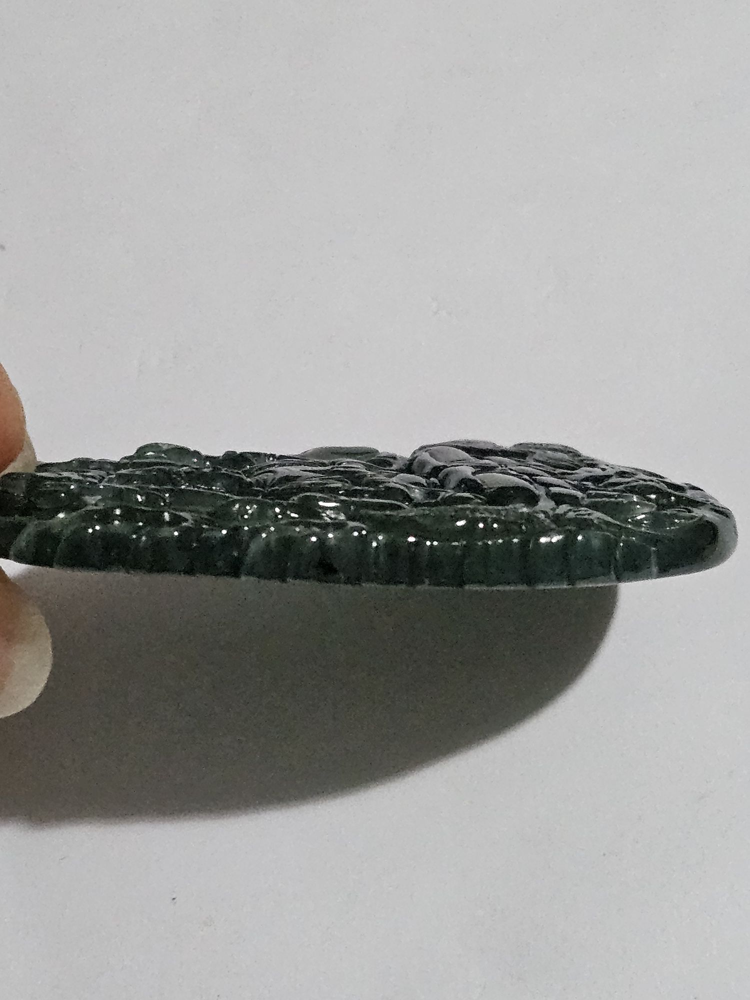 Made of Guatemala jadeite, measures 64 x 44 x 6.2mm, weighs 38.47g, comes on an adjustable string chain and a certificate of authenticity £268