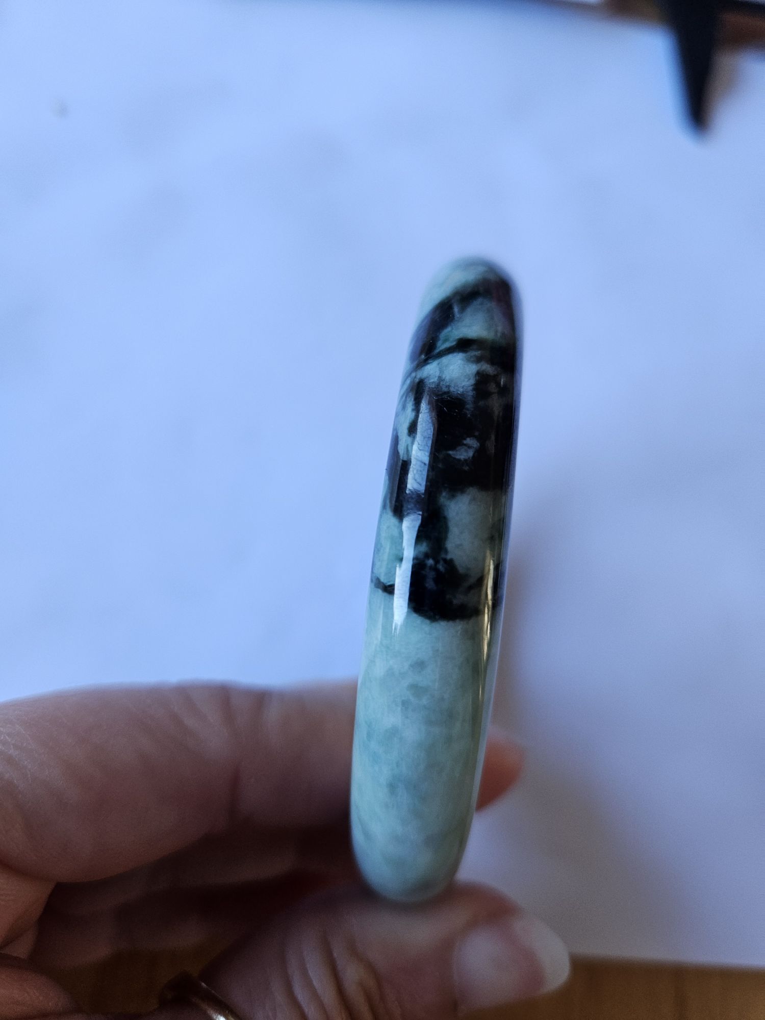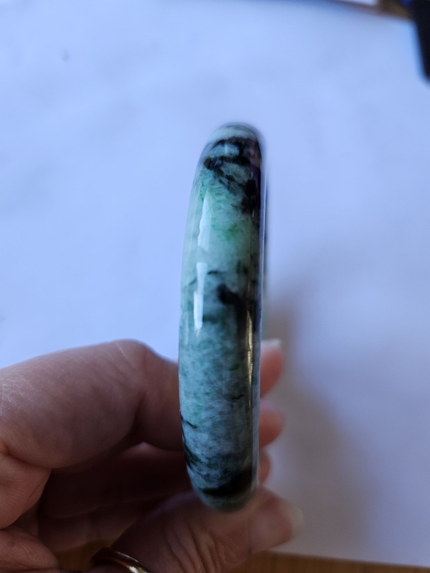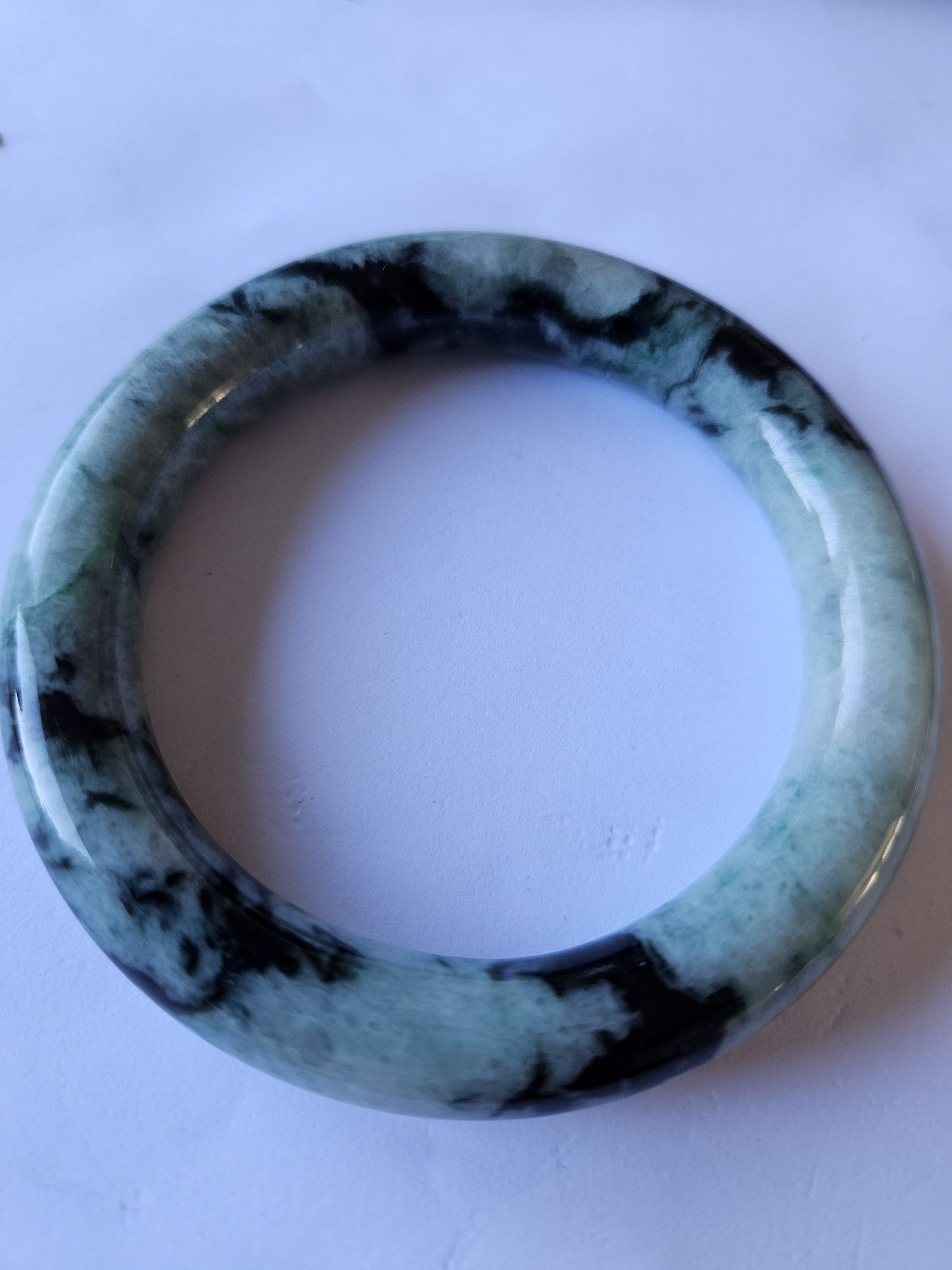 Fits up to 59mm, this is a lovely round green Burmese jadeite bangle with dark green blooms. Measures 57 x 11.5 x 11.3. Comes with a certificate of authenticity £165