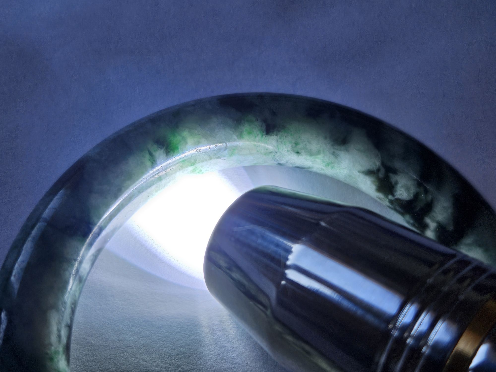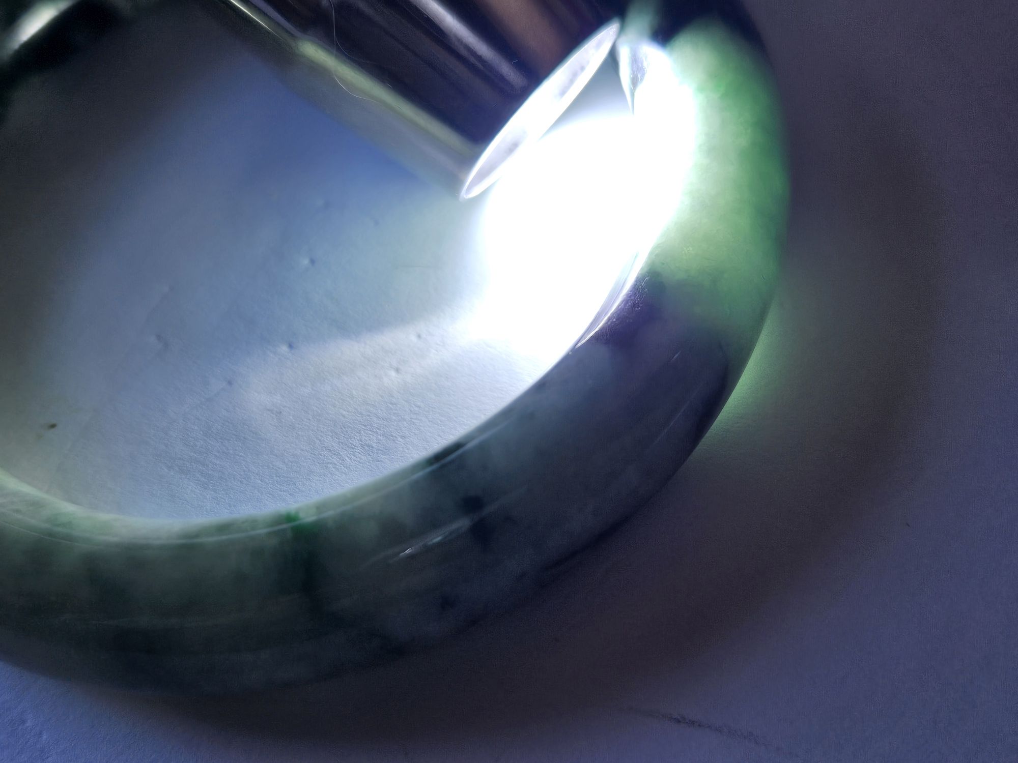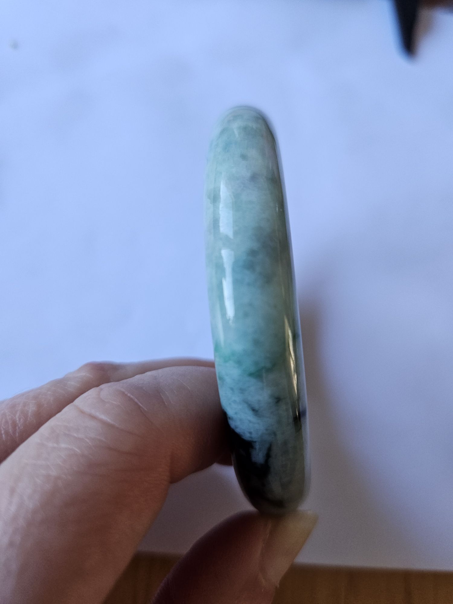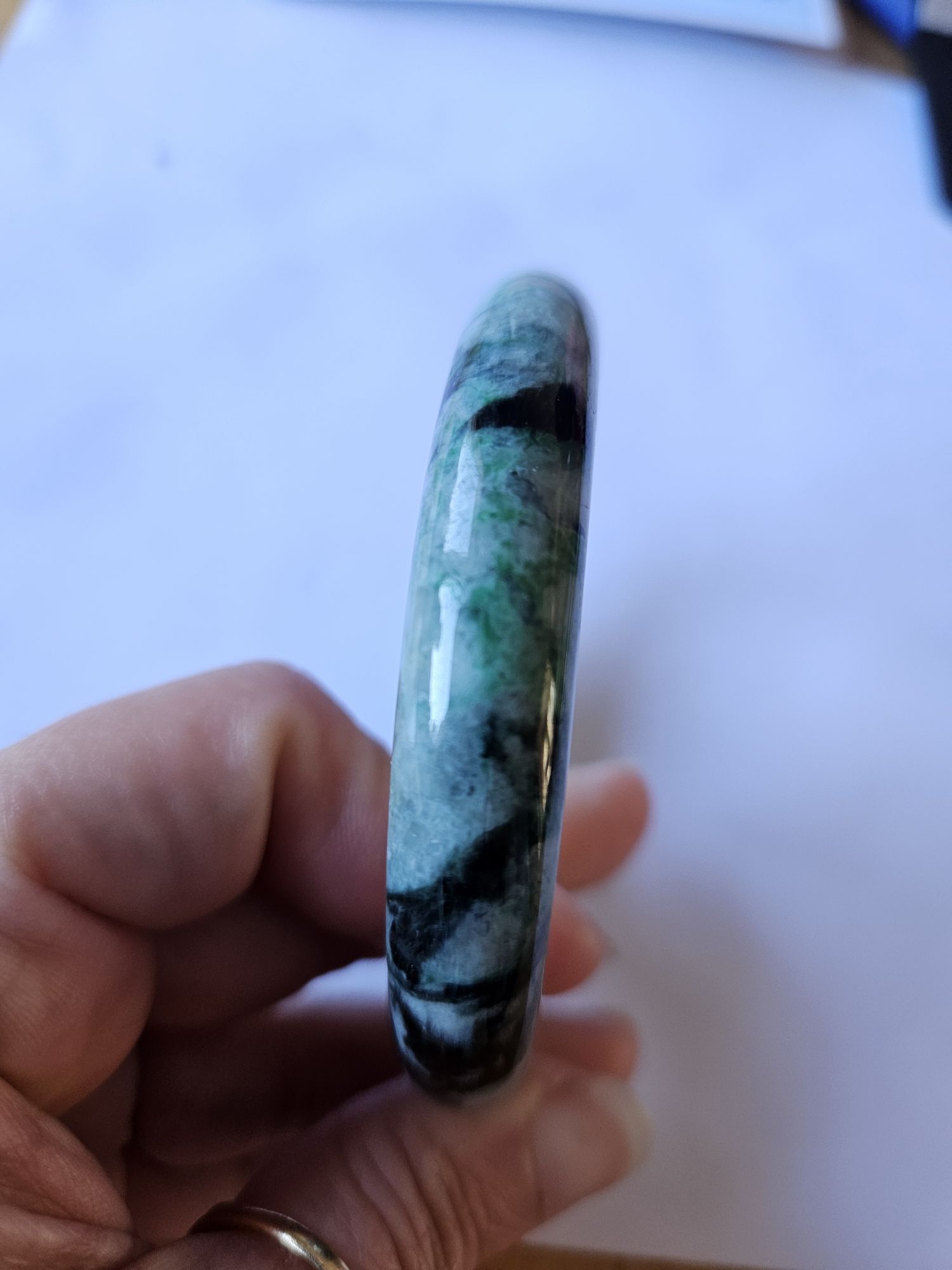 Fits up to 59mm, this is a lovely round green Burmese jadeite bangle with dark green blooms. Measures 57 x 11.5 x 11.3. Comes with a certificate of authenticity £165