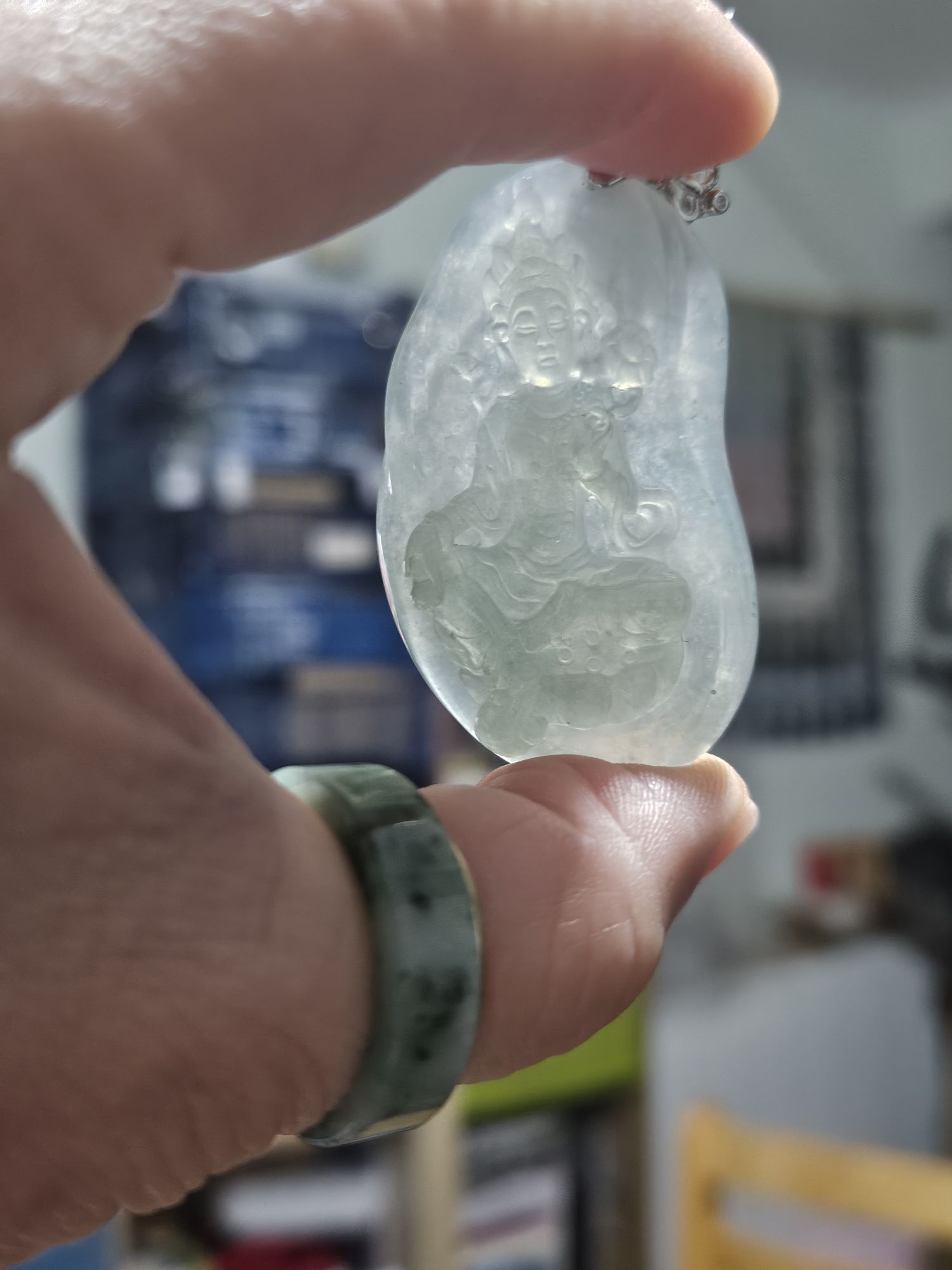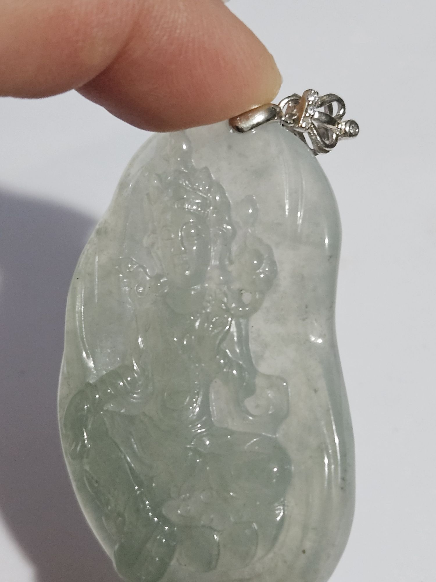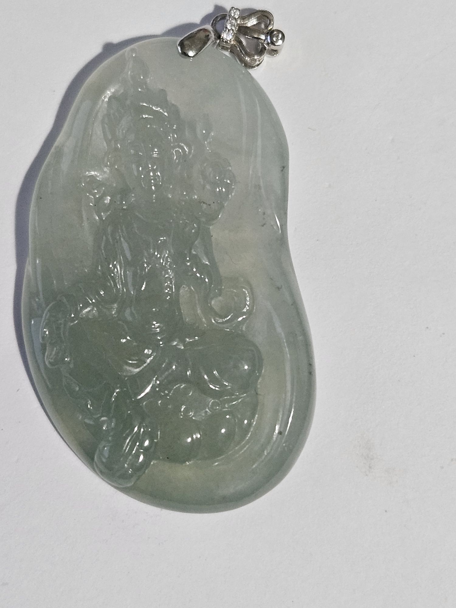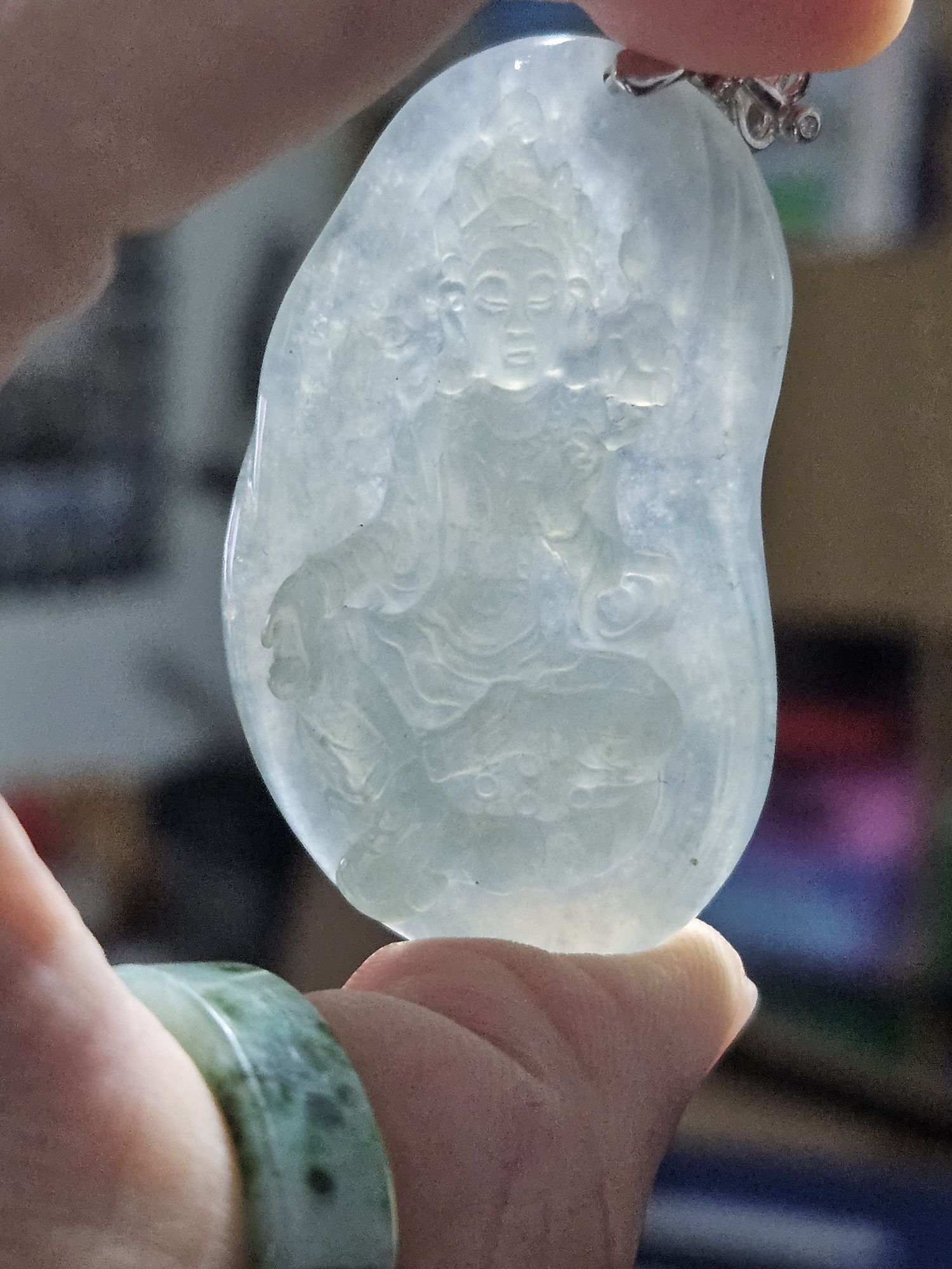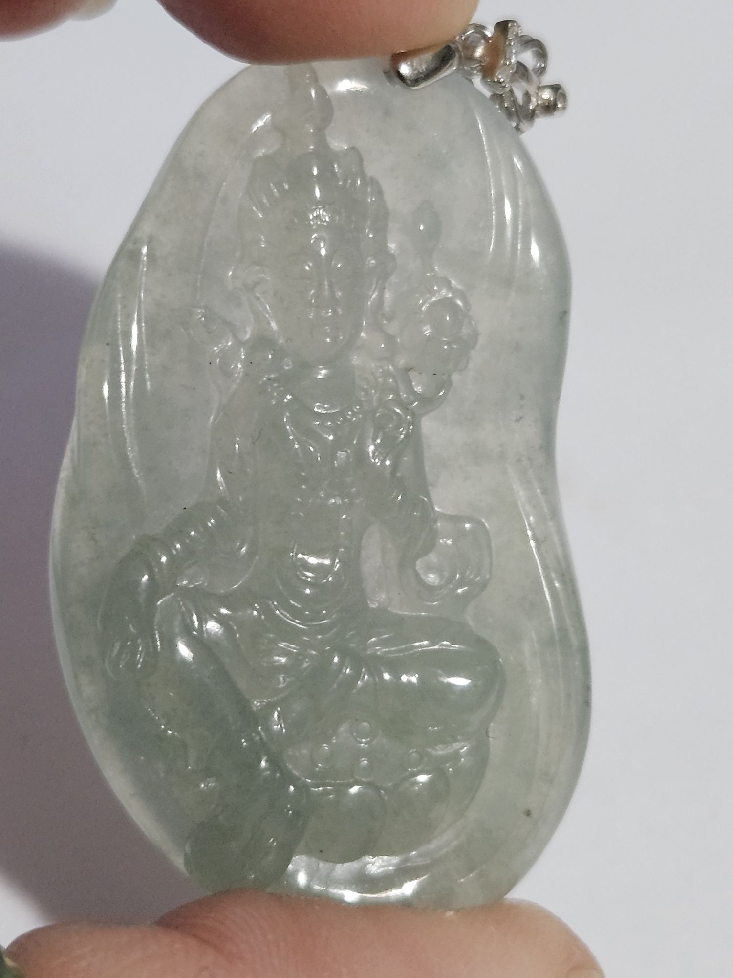 This lovely icy Green Tara made of Burmese jadeite measures 47 x 28 x 6.8mm, weighs 15.78g, comes with a certificate of authenticity £225
