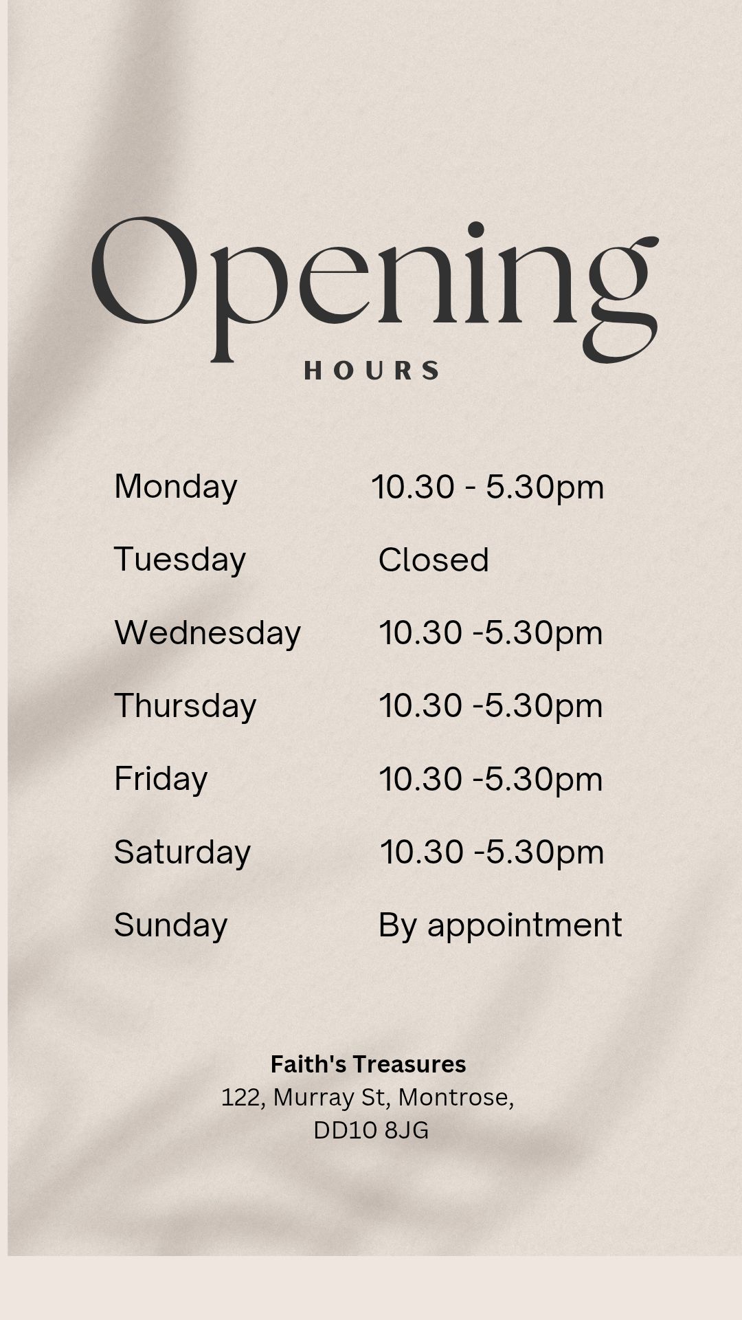 With immediate effect, this is our new opening hours for the shop at 122 Murray St, Montrose.
