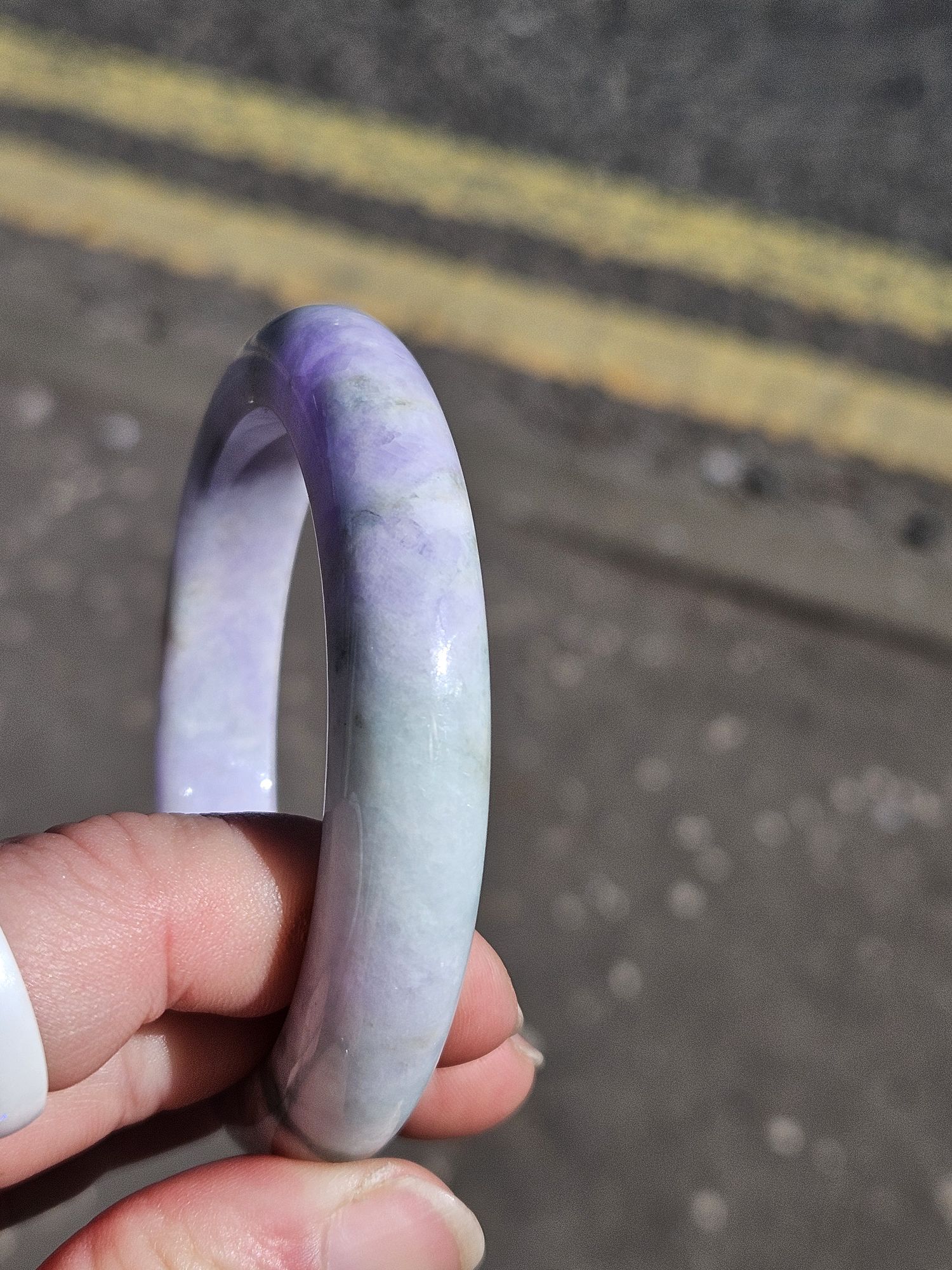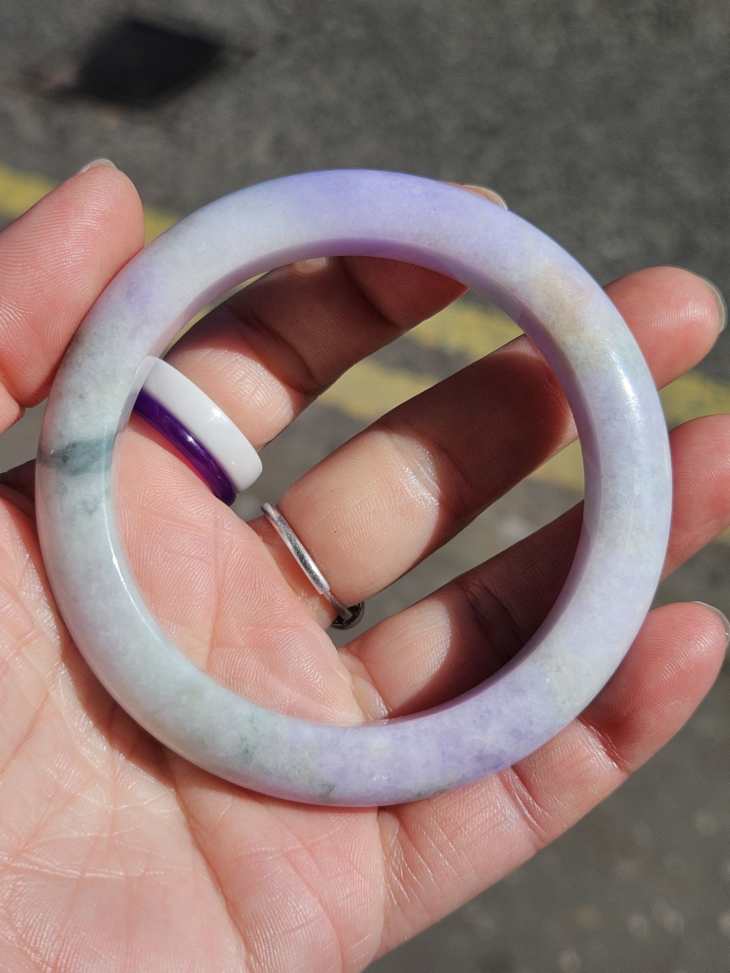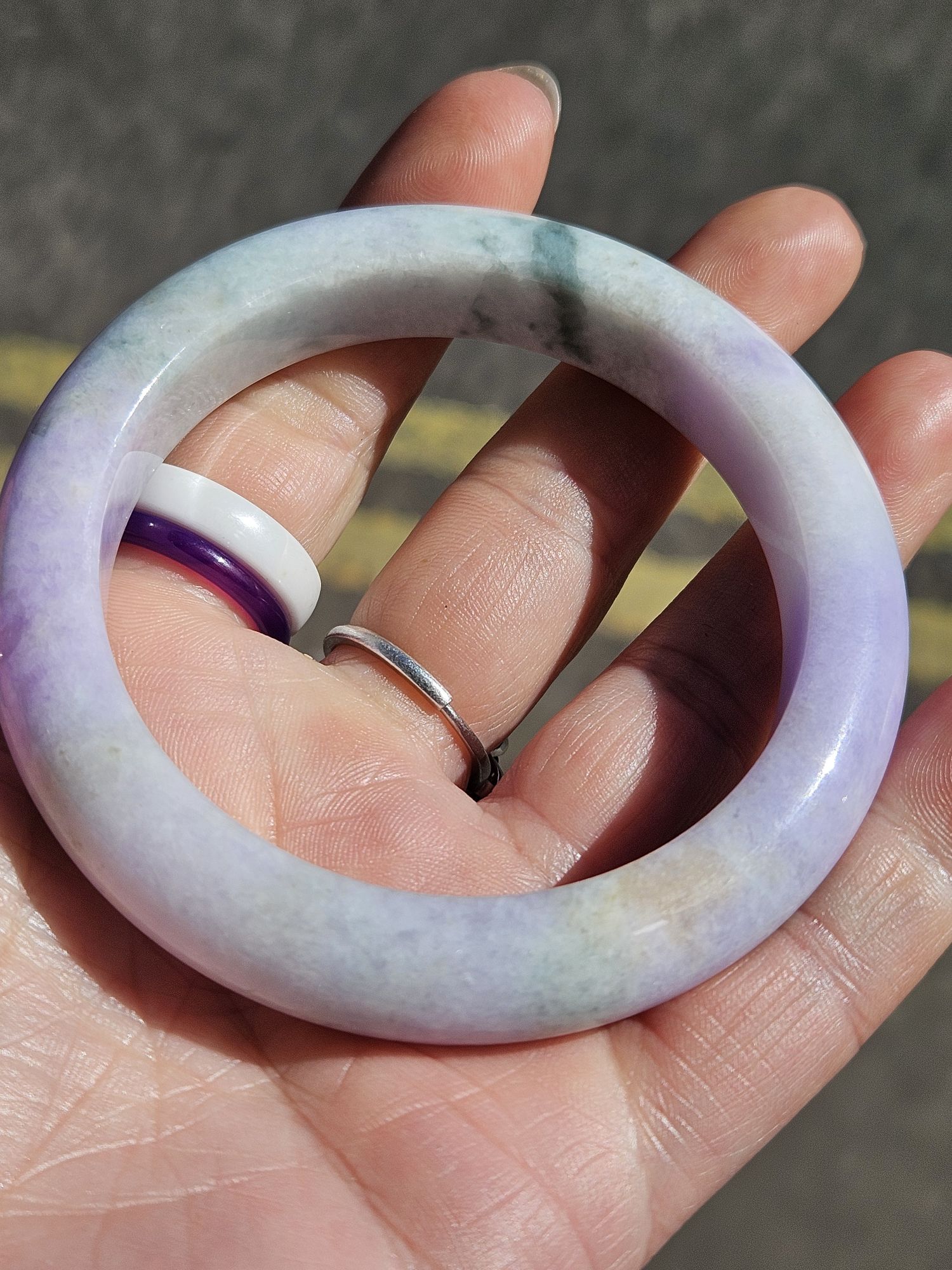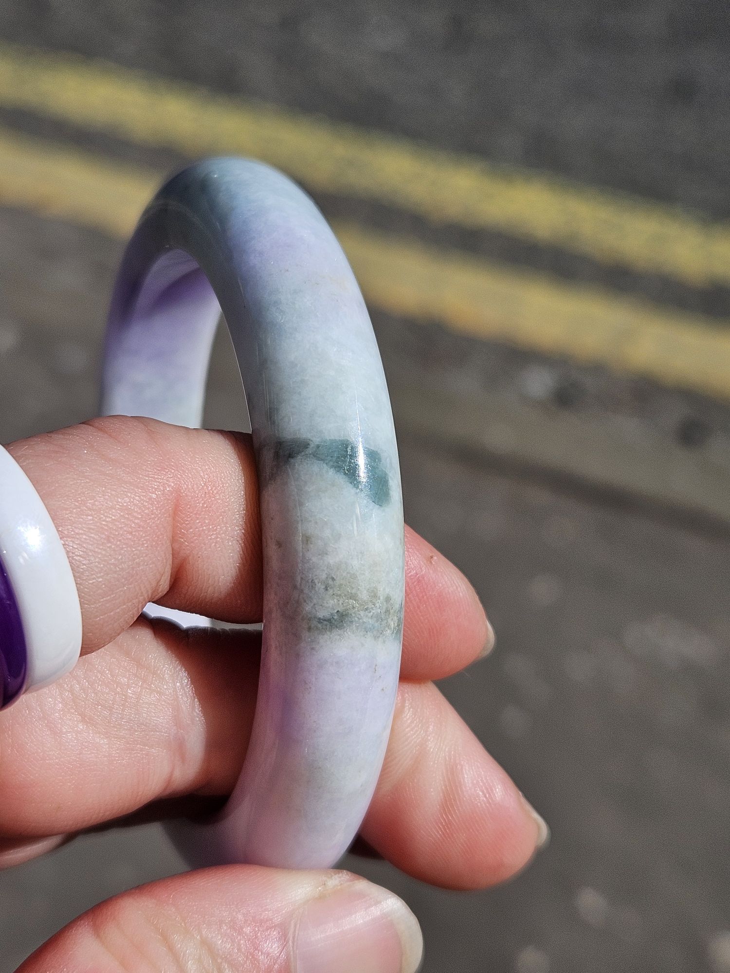 Gorgeous purple and green bangle made of Burmese jadeite. The purple is intense and the green part has gorgeous blooms. Not only that, some of the purple part has green blooms too. There is a small section with yellow. Makes a great addition to your collection.