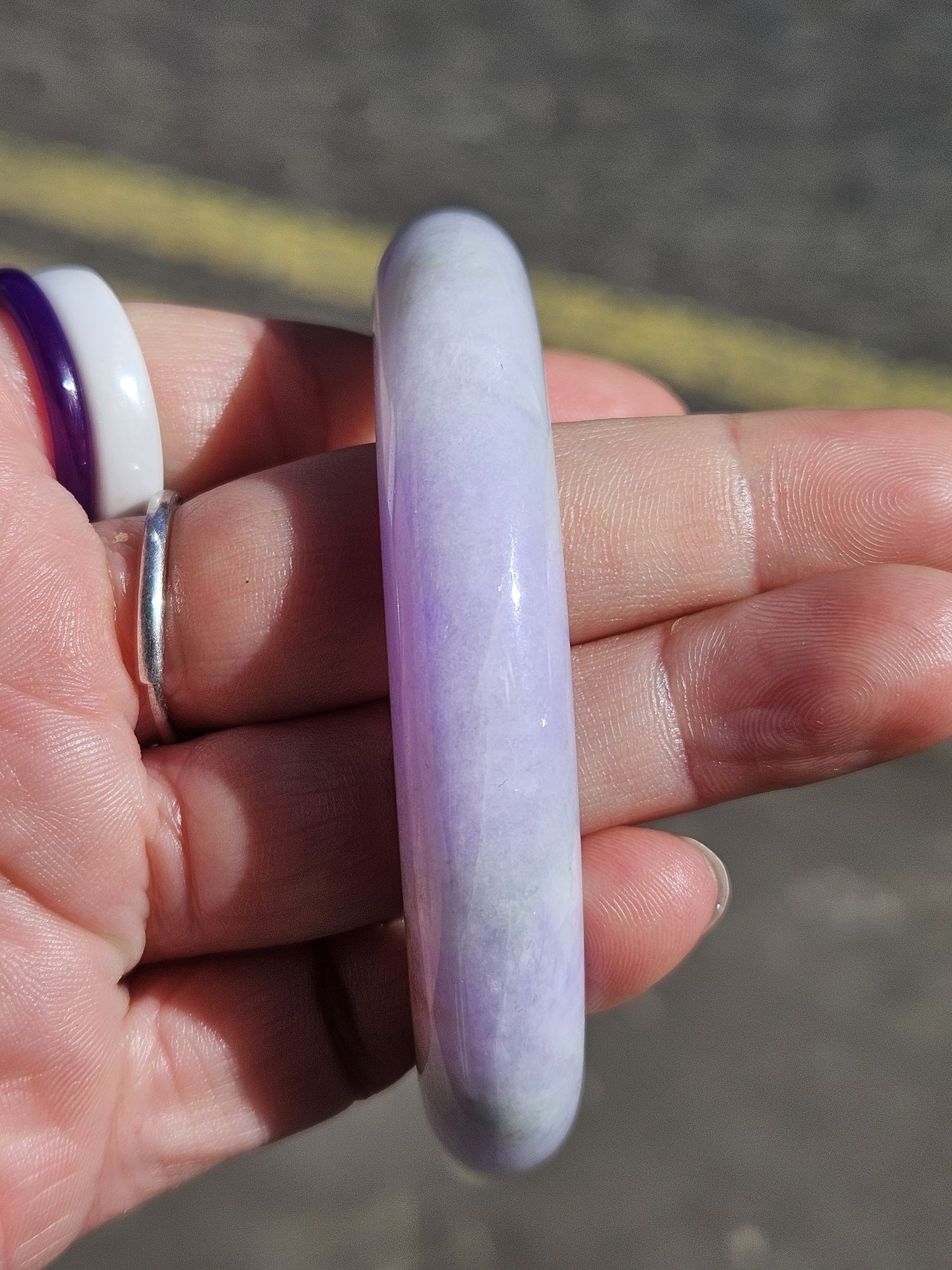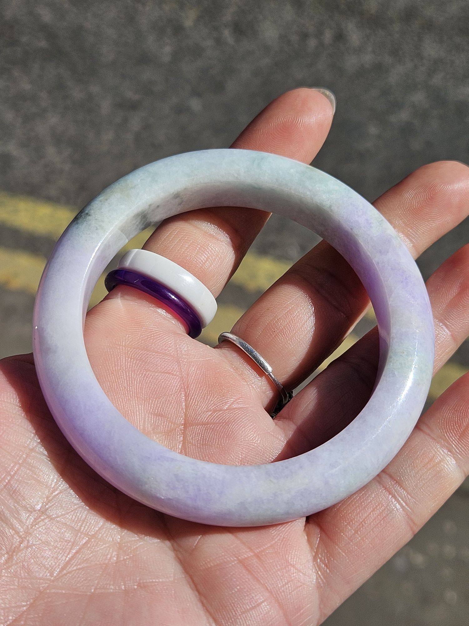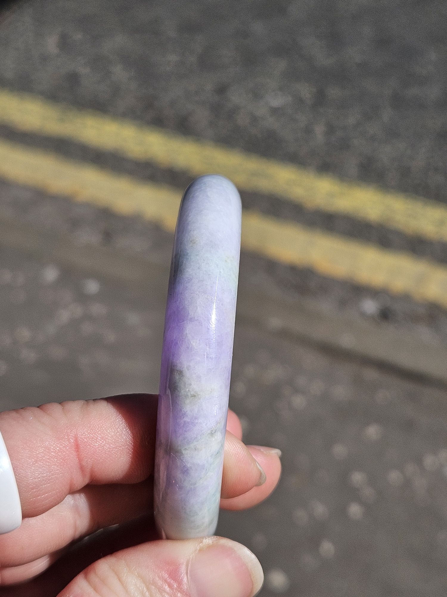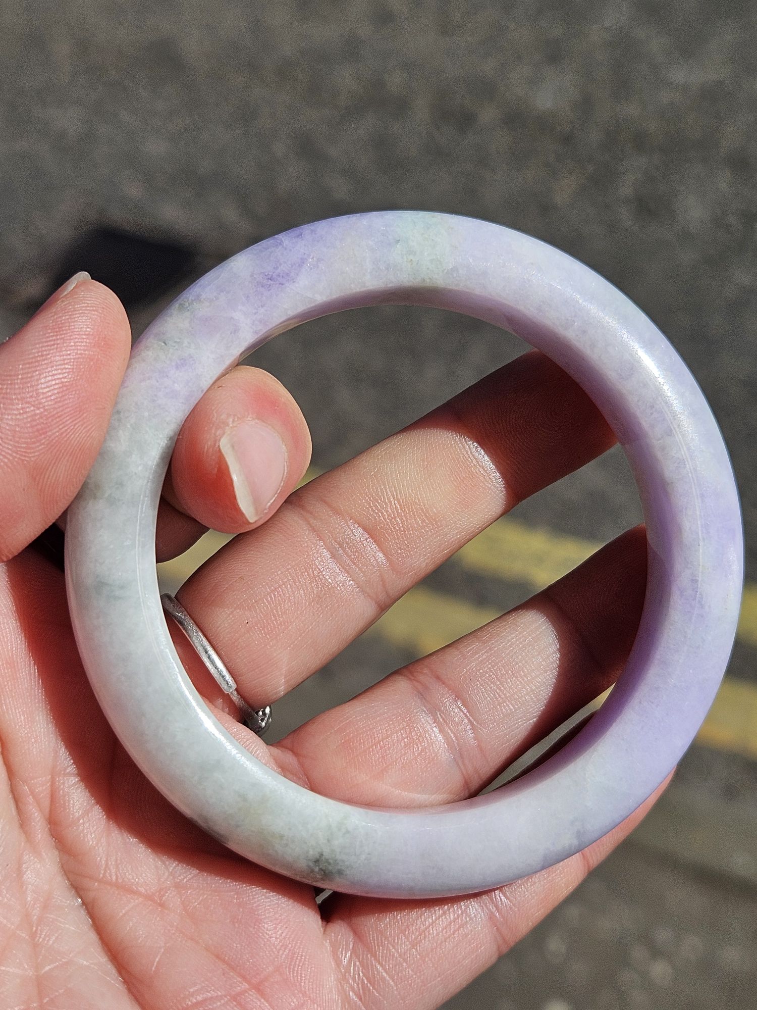 Gorgeous purple and green bangle made of Burmese jadeite. The purple is intense and the green part has gorgeous blooms. Not only that, some of the purple part has green blooms too. There is a small section with yellow. Makes a great addition to your collection.