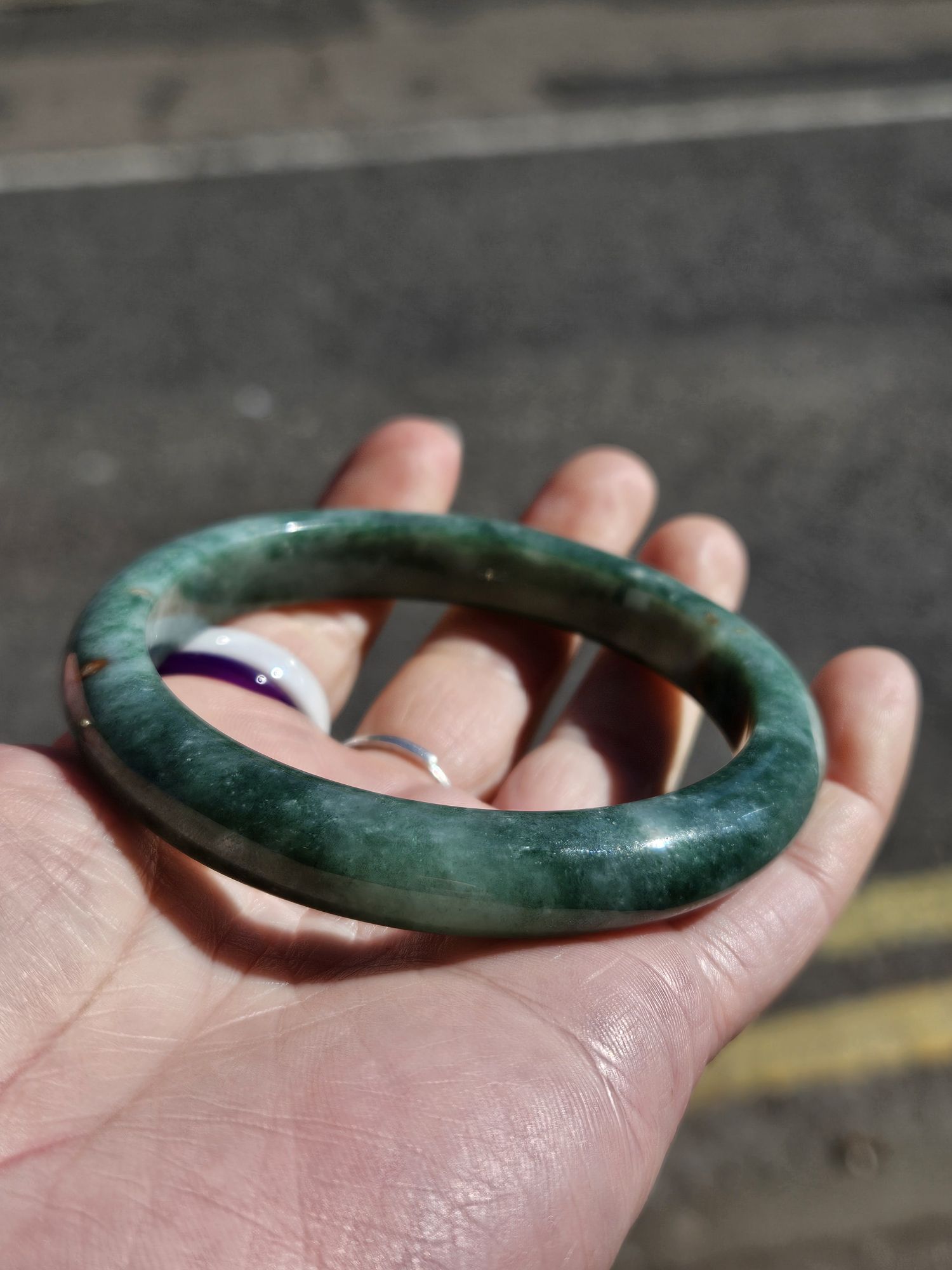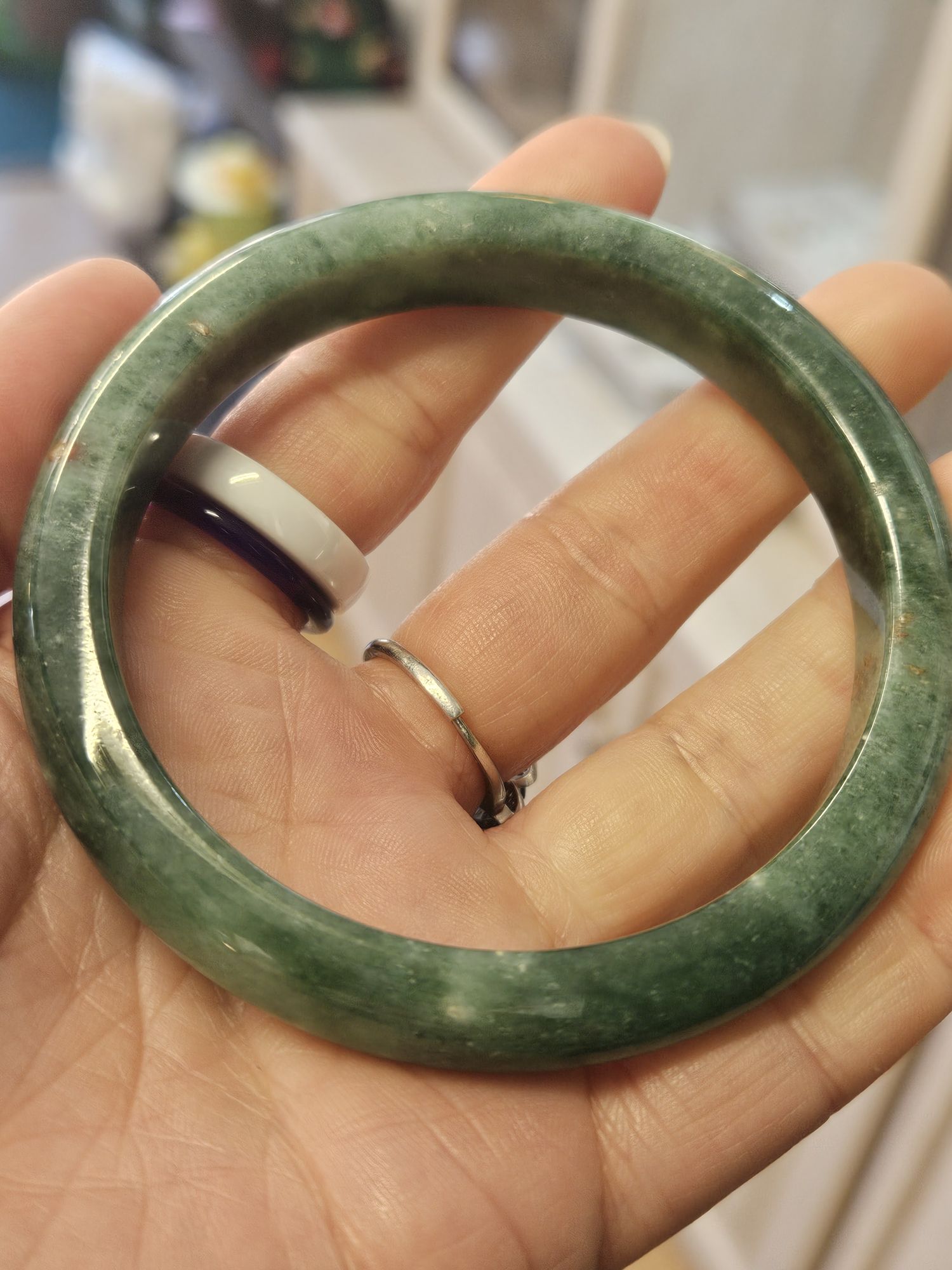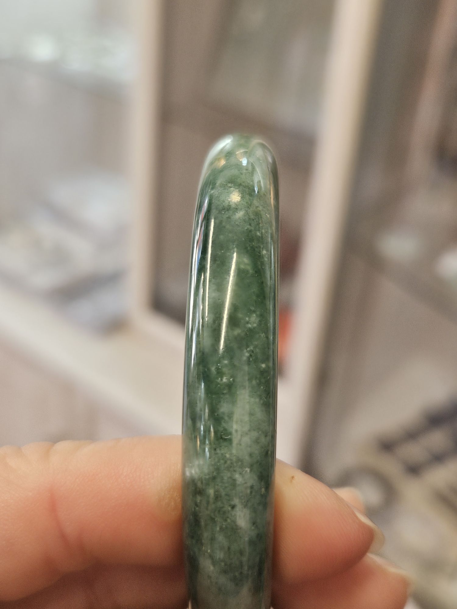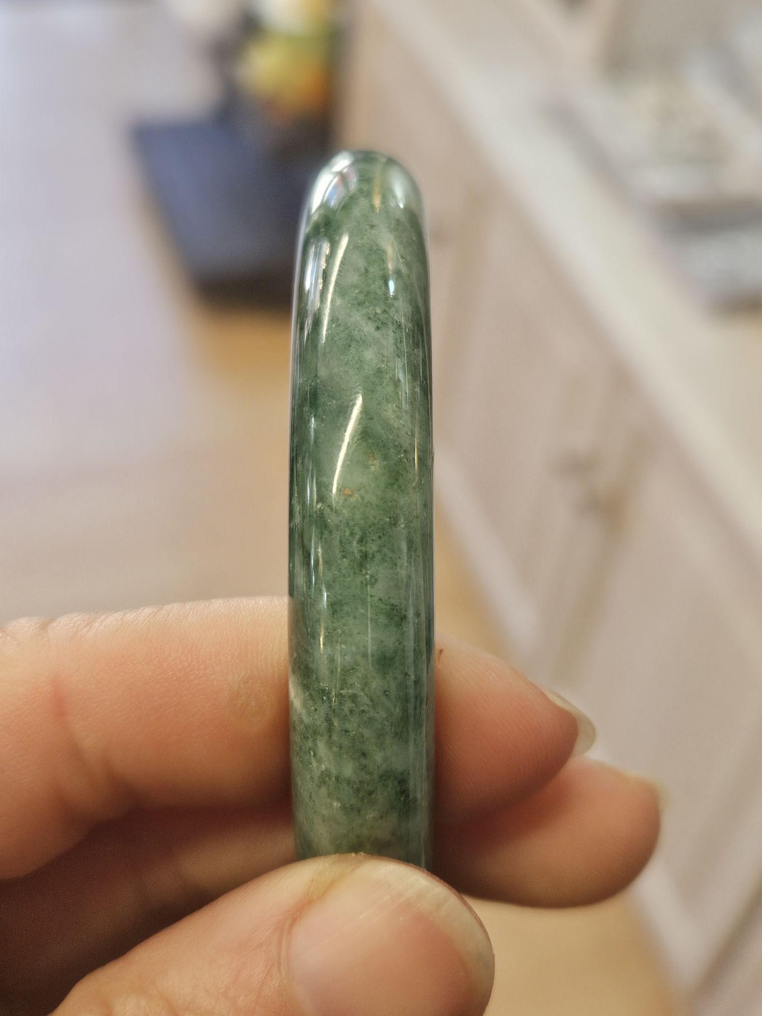 Lovely full green bangle made of Burmese jadeite with spots of yellow which is the skin of the original stone. The bangle has a lot of blooms and a bargain at this price for the size.