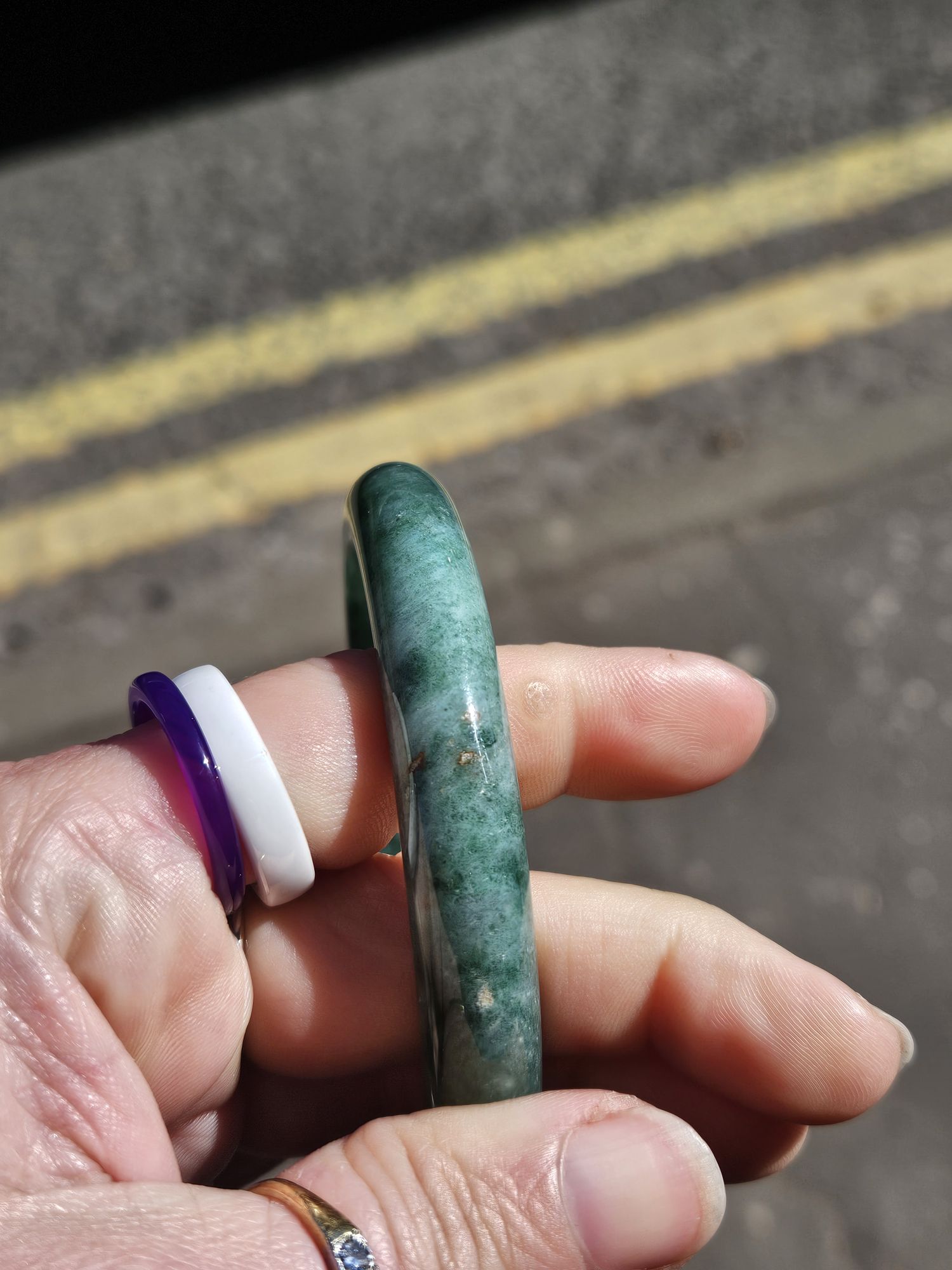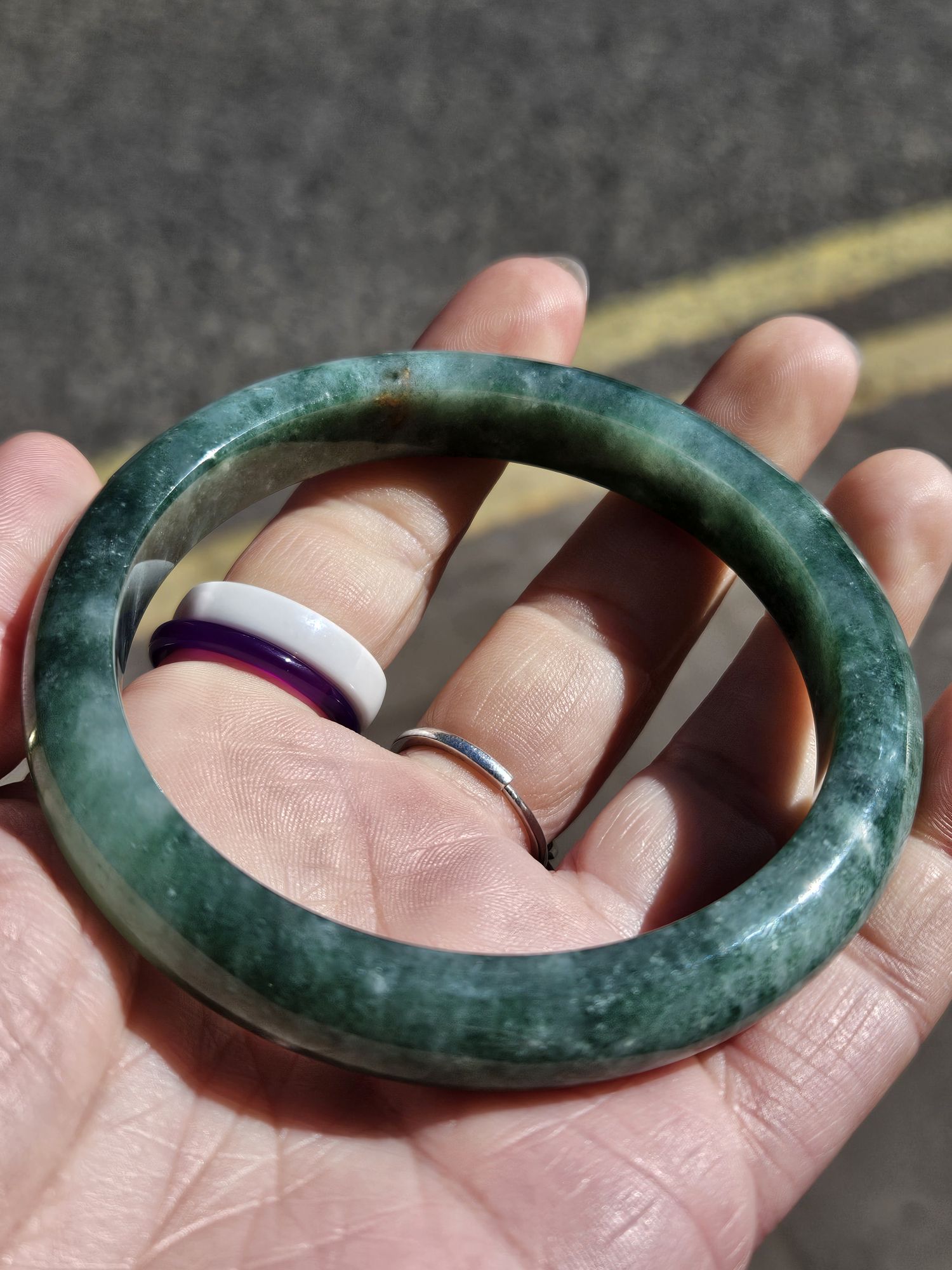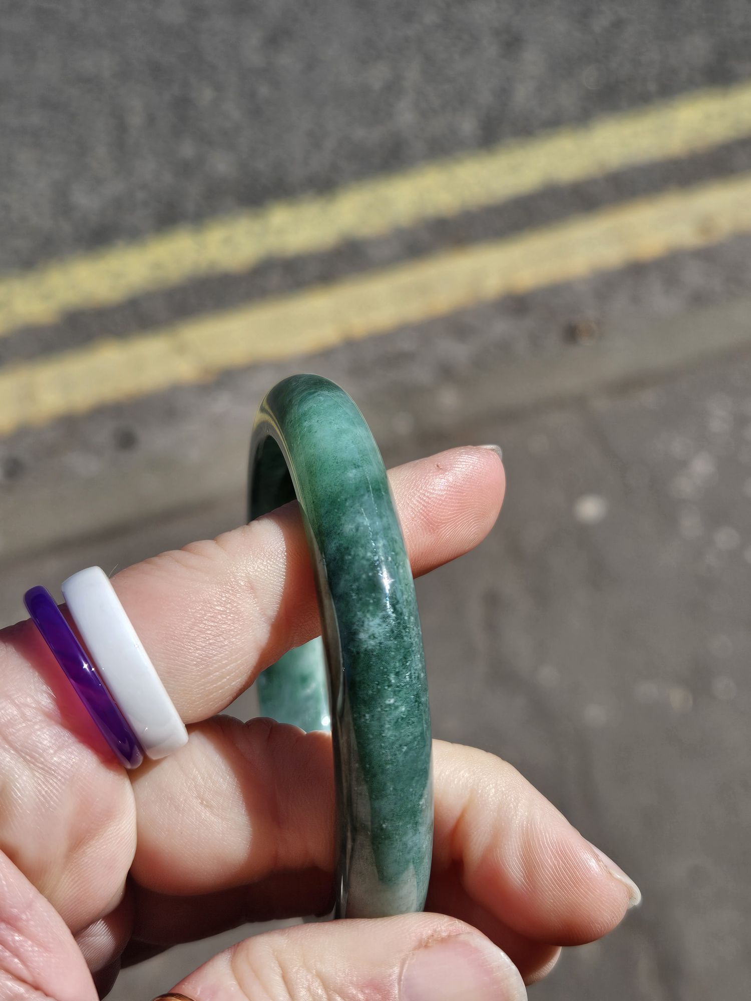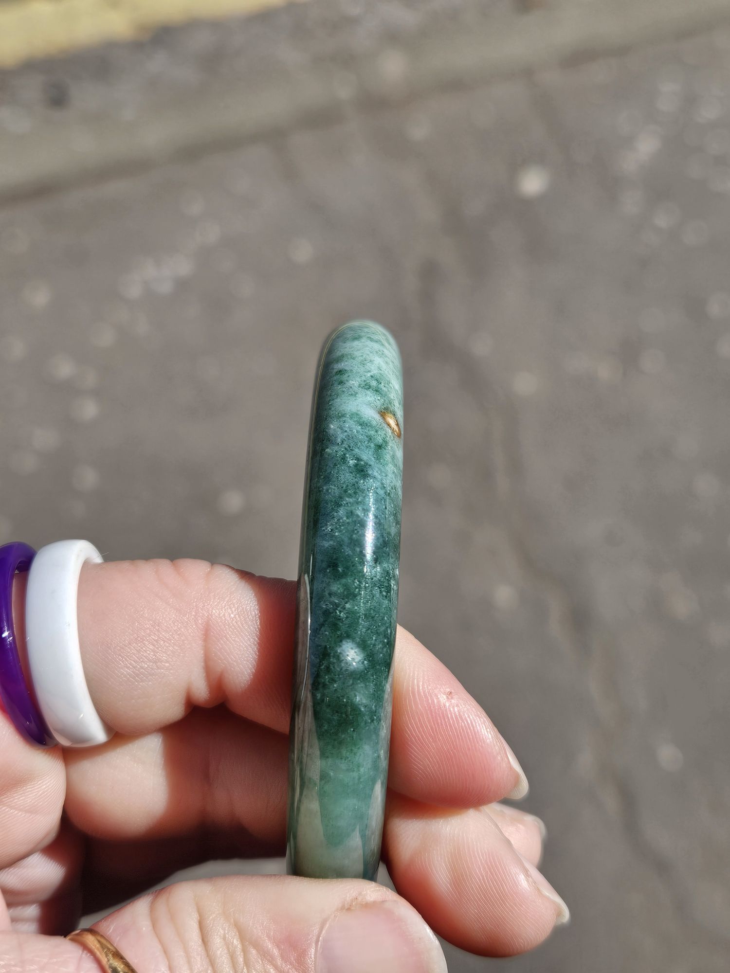 Lovely full green bangle made of Burmese jadeite with spots of yellow which is the skin of the original stone. The bangle has a lot of blooms and a bargain at this price for the size.