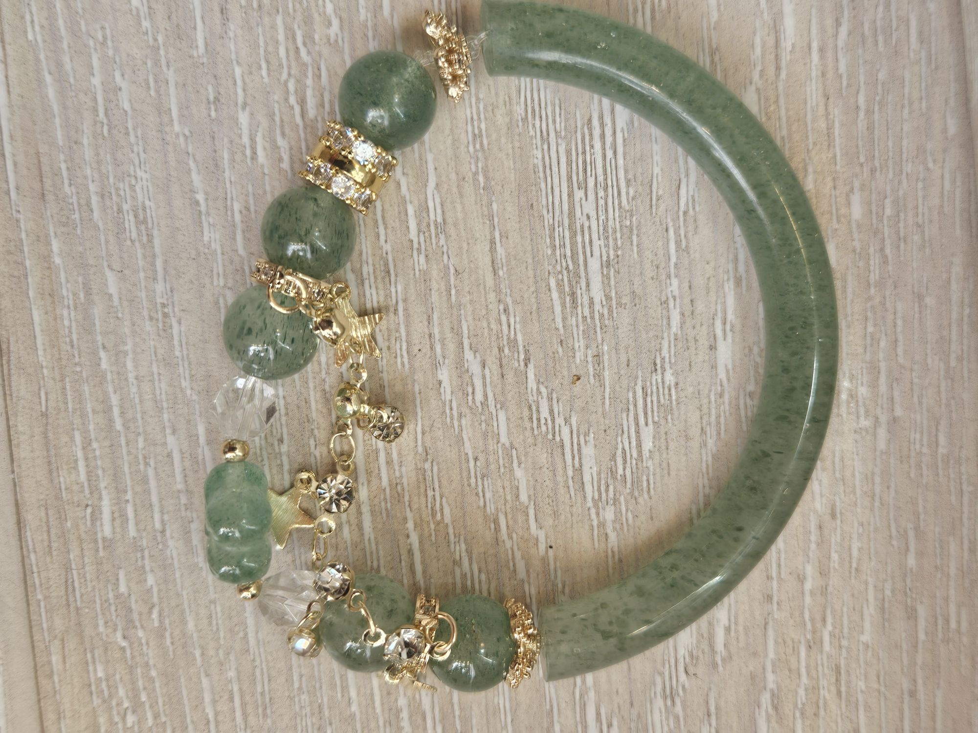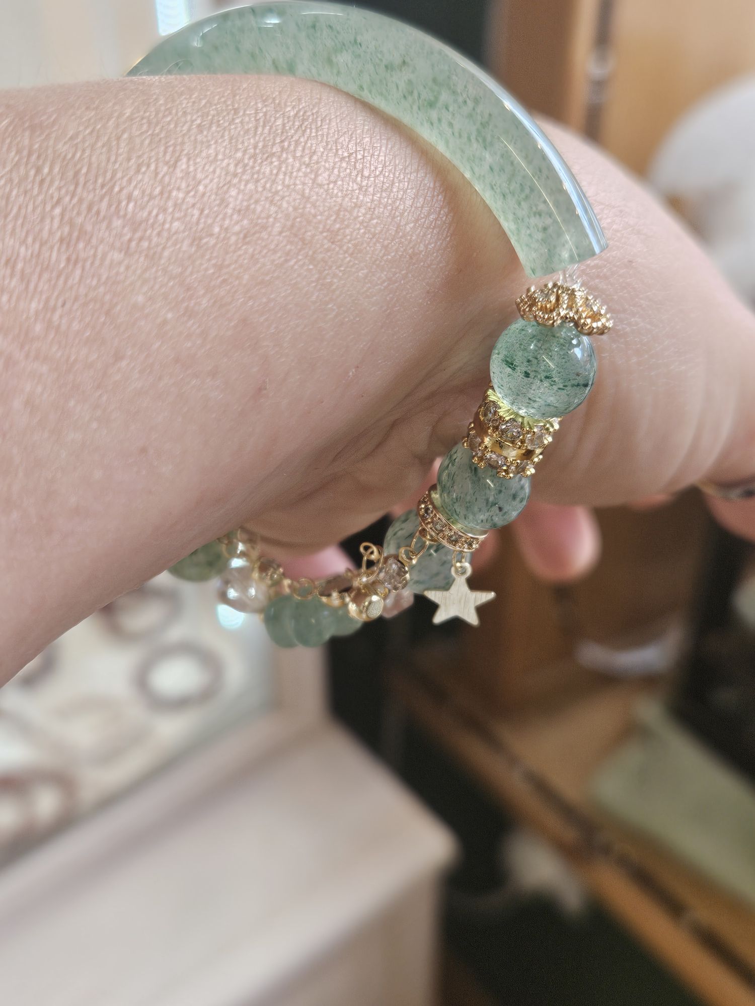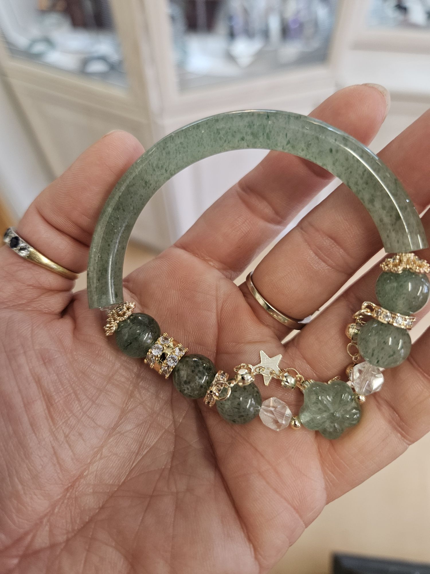Gorgeous Green strawberry quartz half bangle with 5 x 10mm beads and a flower shaped bead designed and made in Scotland.