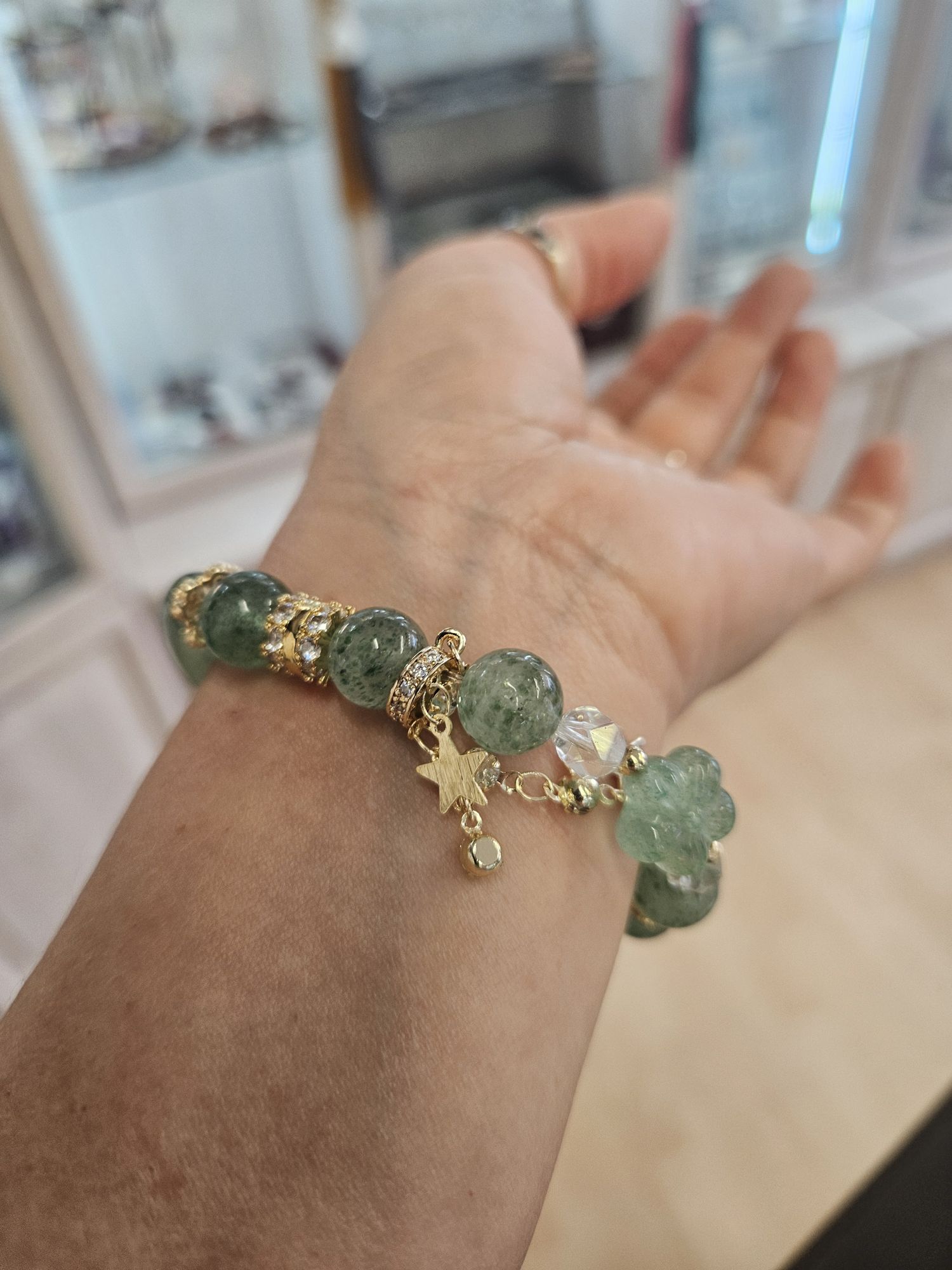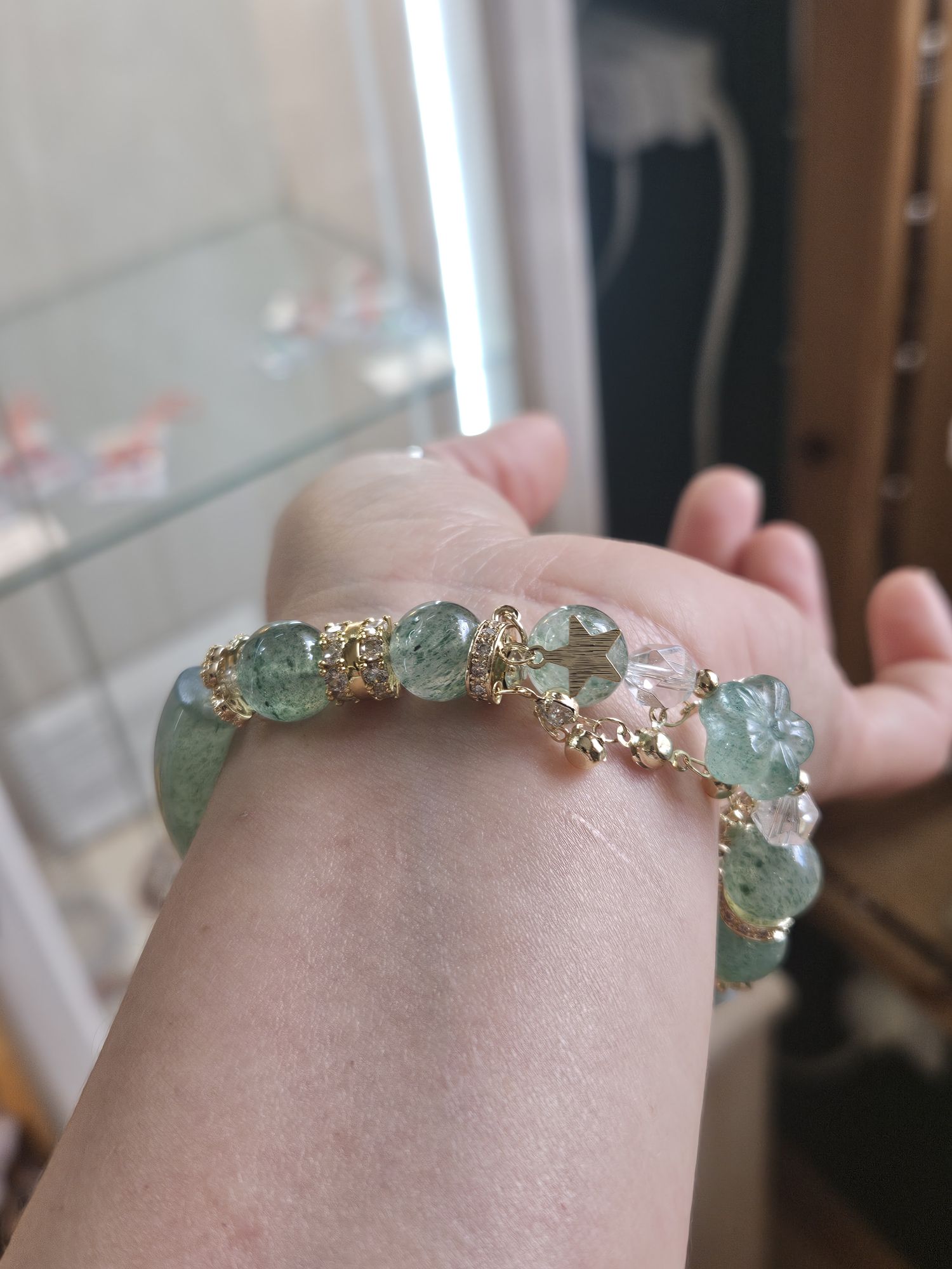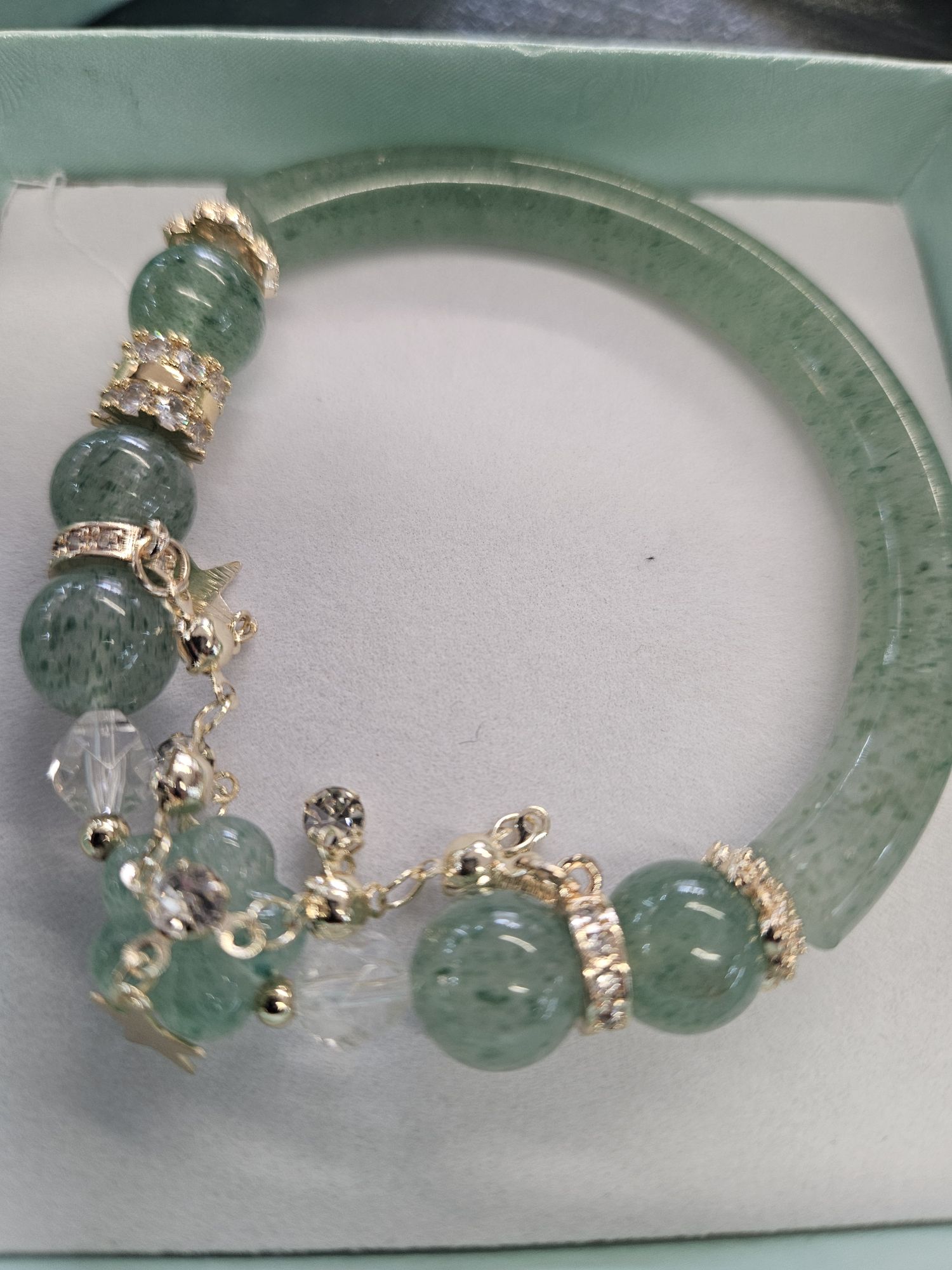 Gorgeous Green strawberry quartz half bangle with 5 x 10mm beads and a flower shaped bead designed and made in Scotland.
