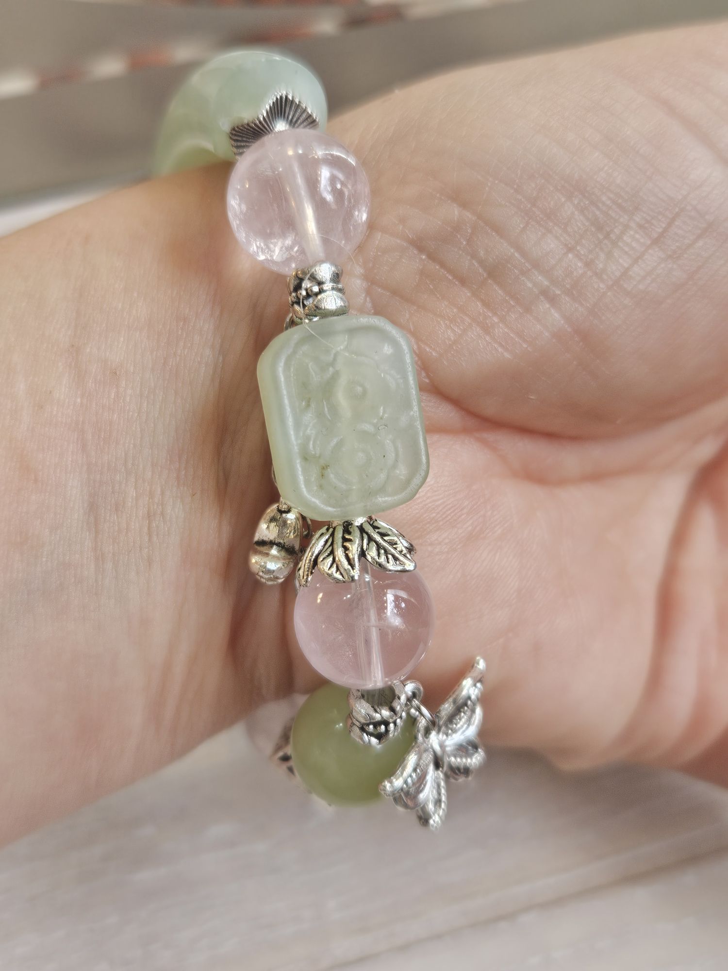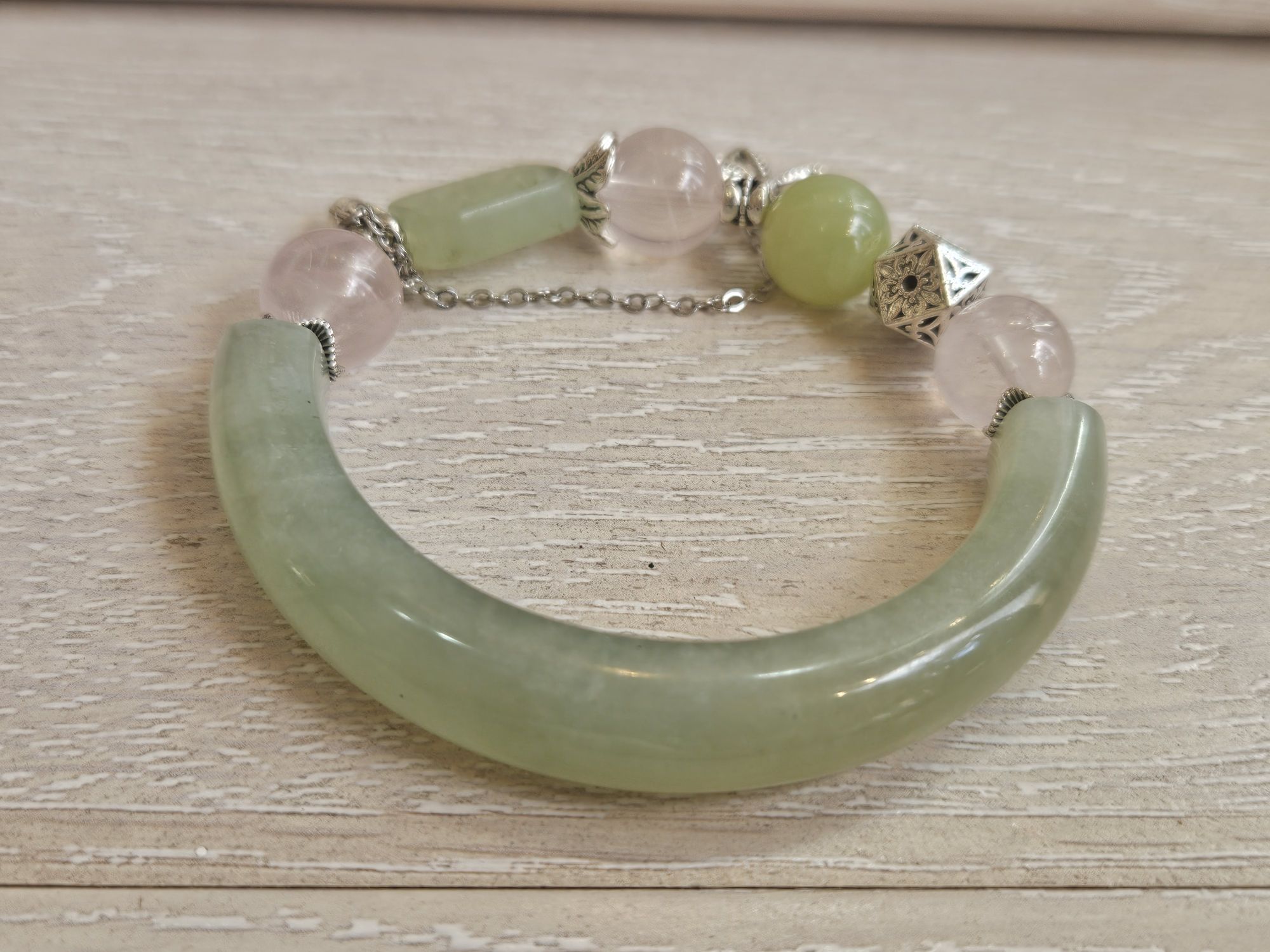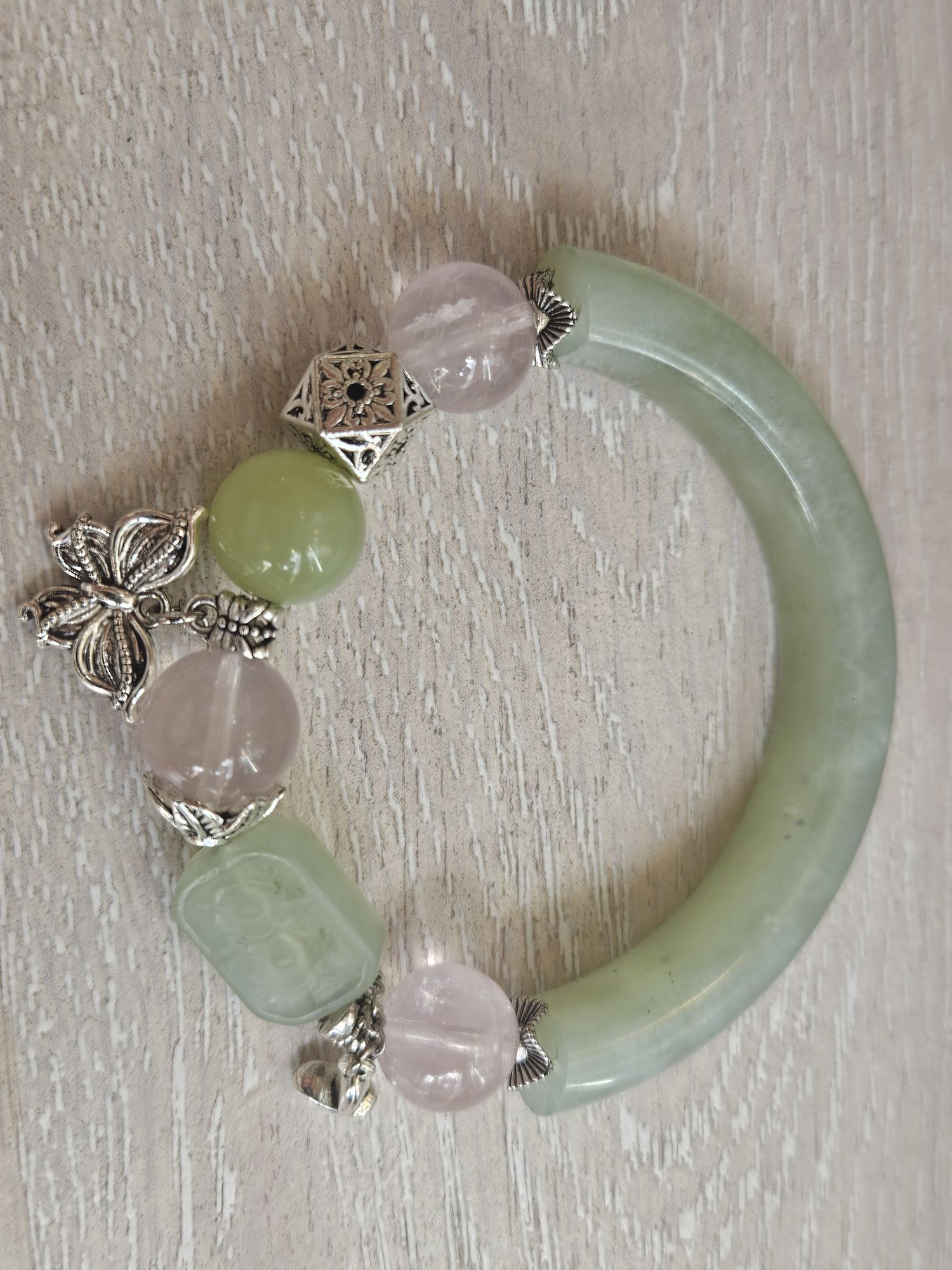 Half bangle style Xiu jade bracelet with 3 x 12mm rose quartz bead, 1 x 12mm Xiu jade bead, and 1 square Xiu jade embossed with flowers dwsigned and made in Scotland. £79