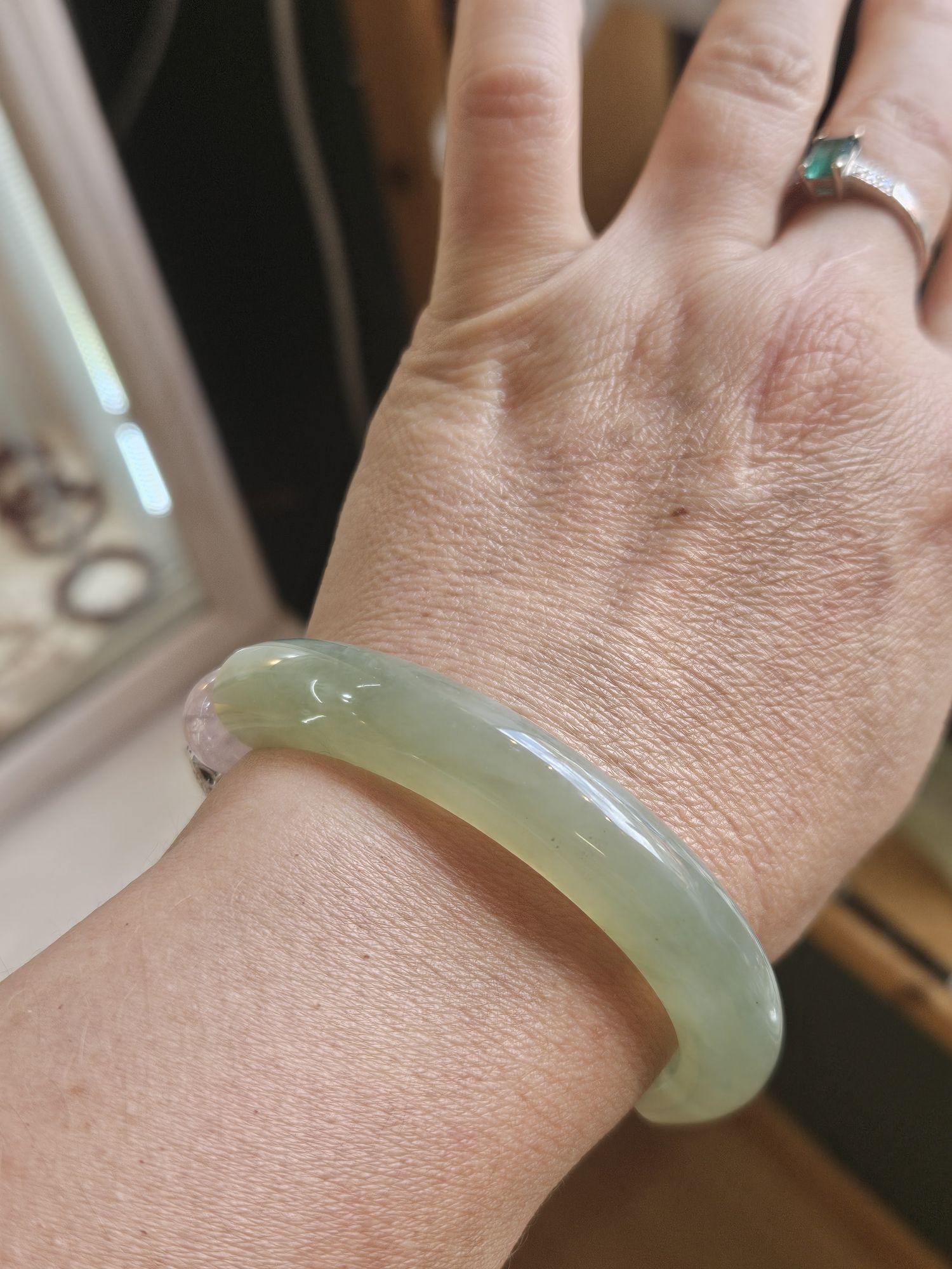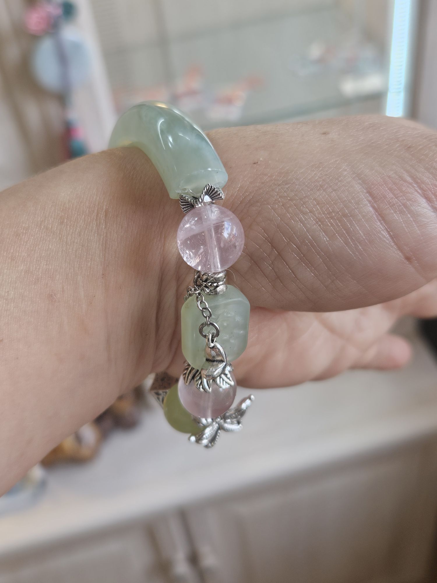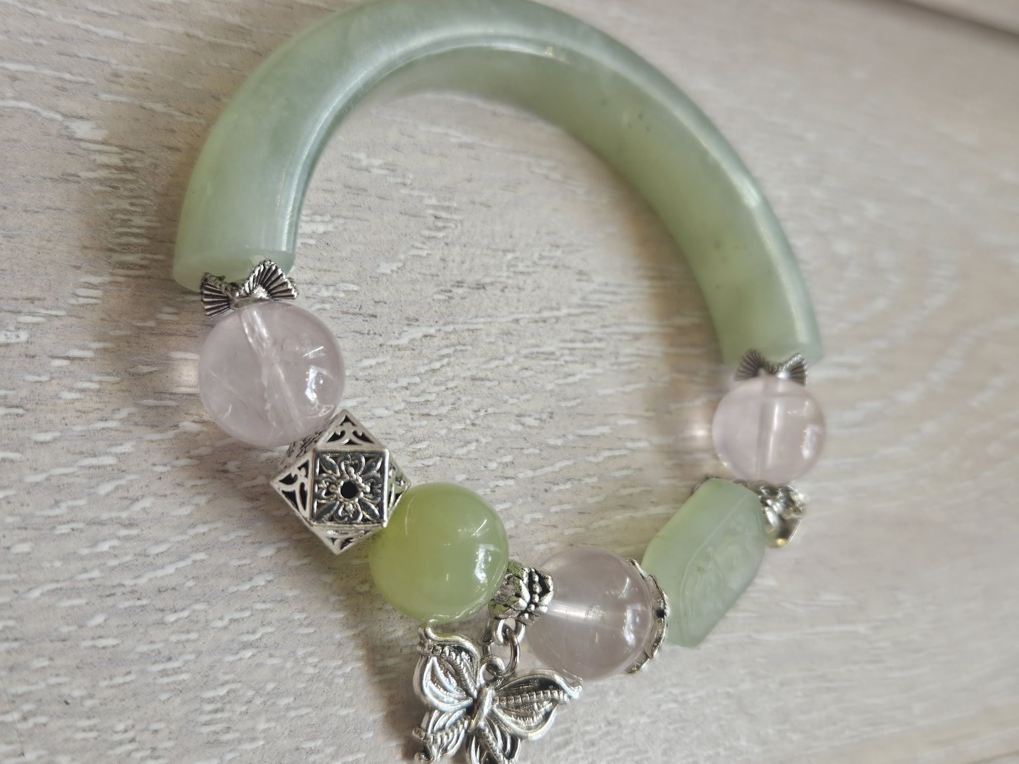 Half bangle style Xiu jade bracelet with 3 x 12mm rose quartz bead, 1 x 12mm Xiu jade bead, and 1 square Xiu jade embossed with flowers dwsigned and made in Scotland. £79