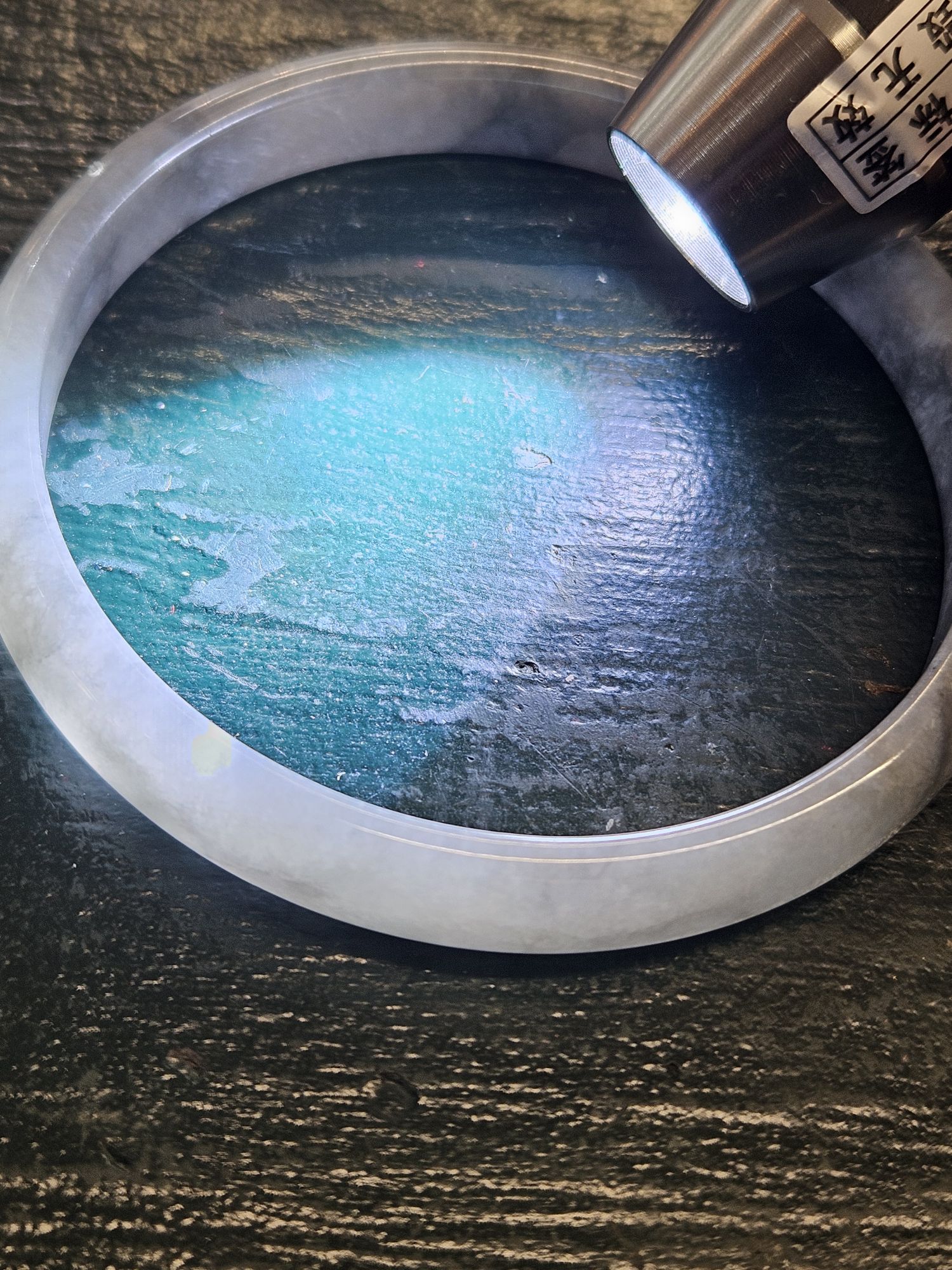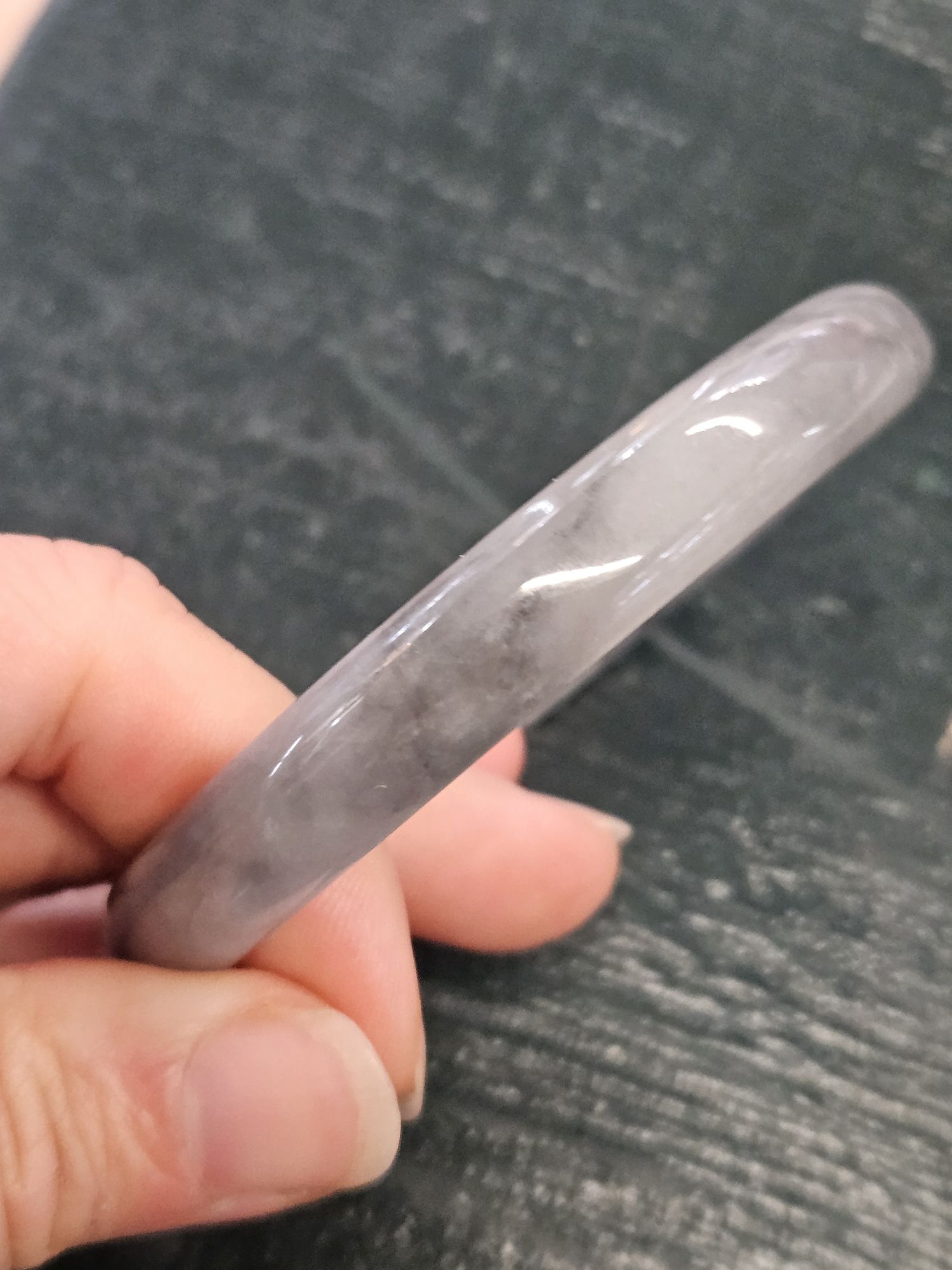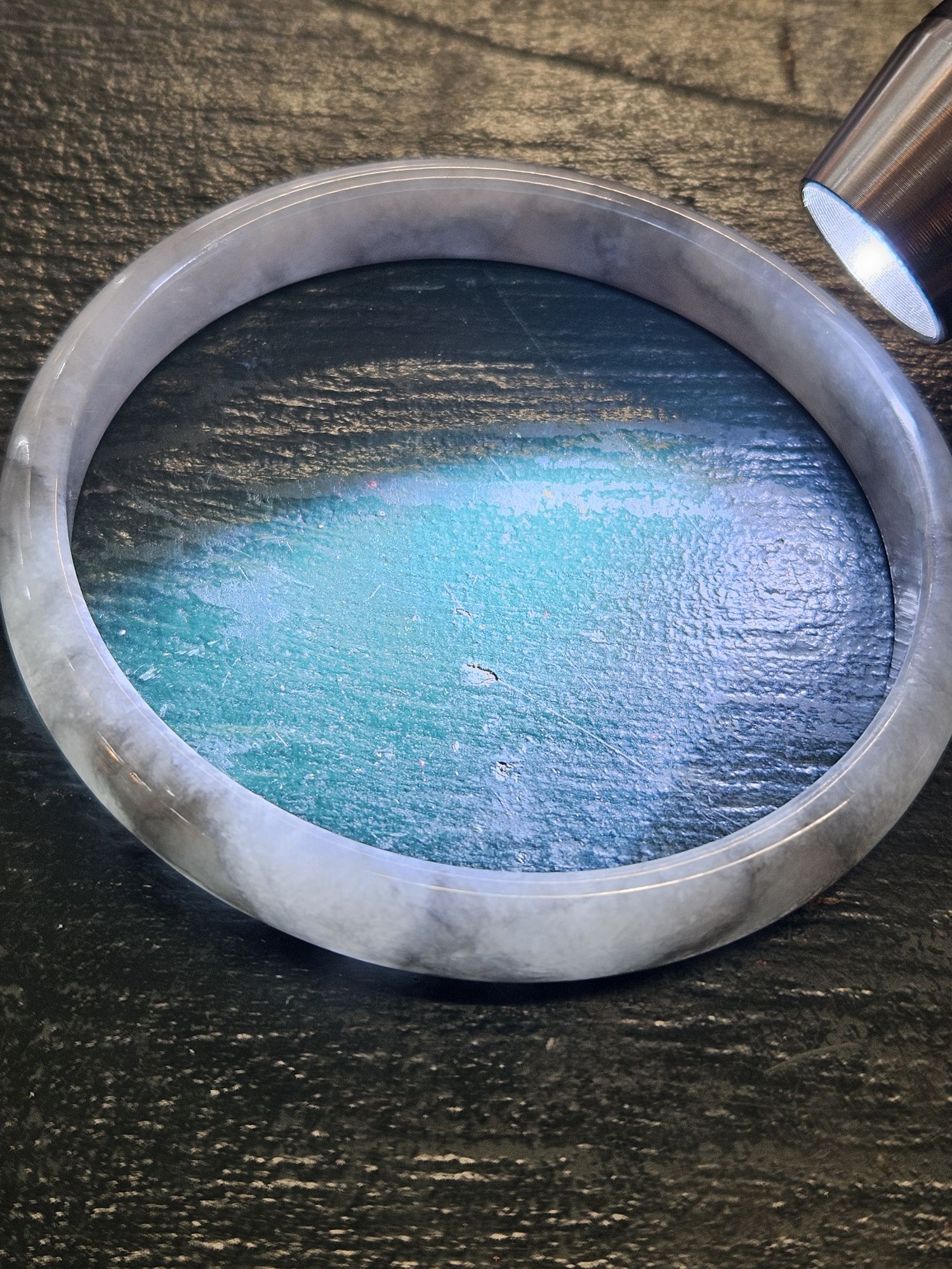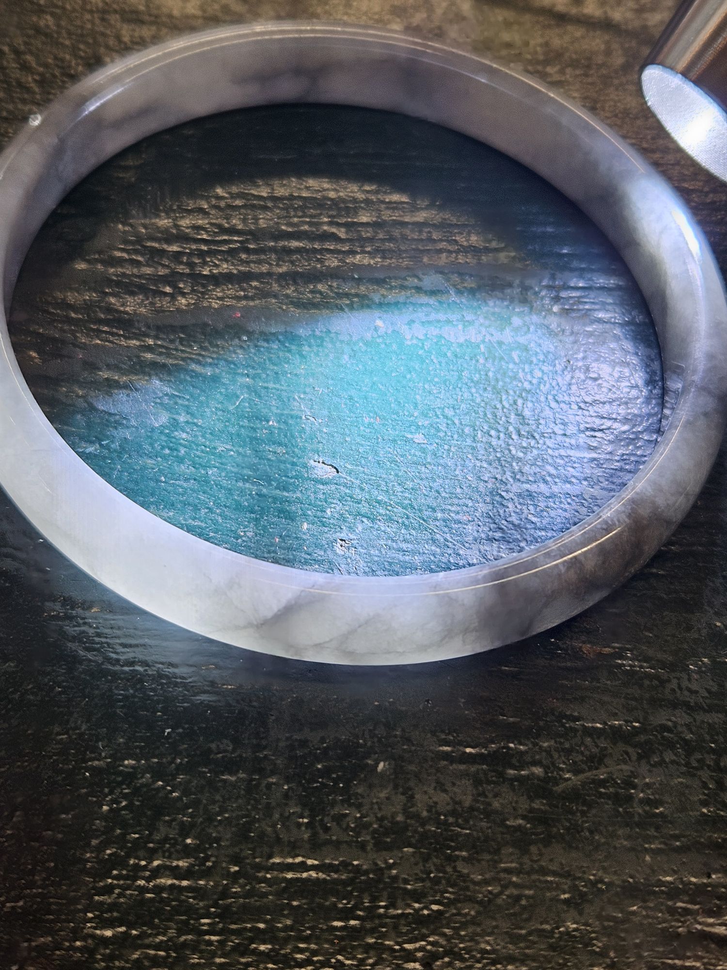 Beautiful slim smoky grey Burmese jadeite bangle, the colour is akin to a traditional chinese water colour painting. The darker grey are like clouds giving it a lovely look.