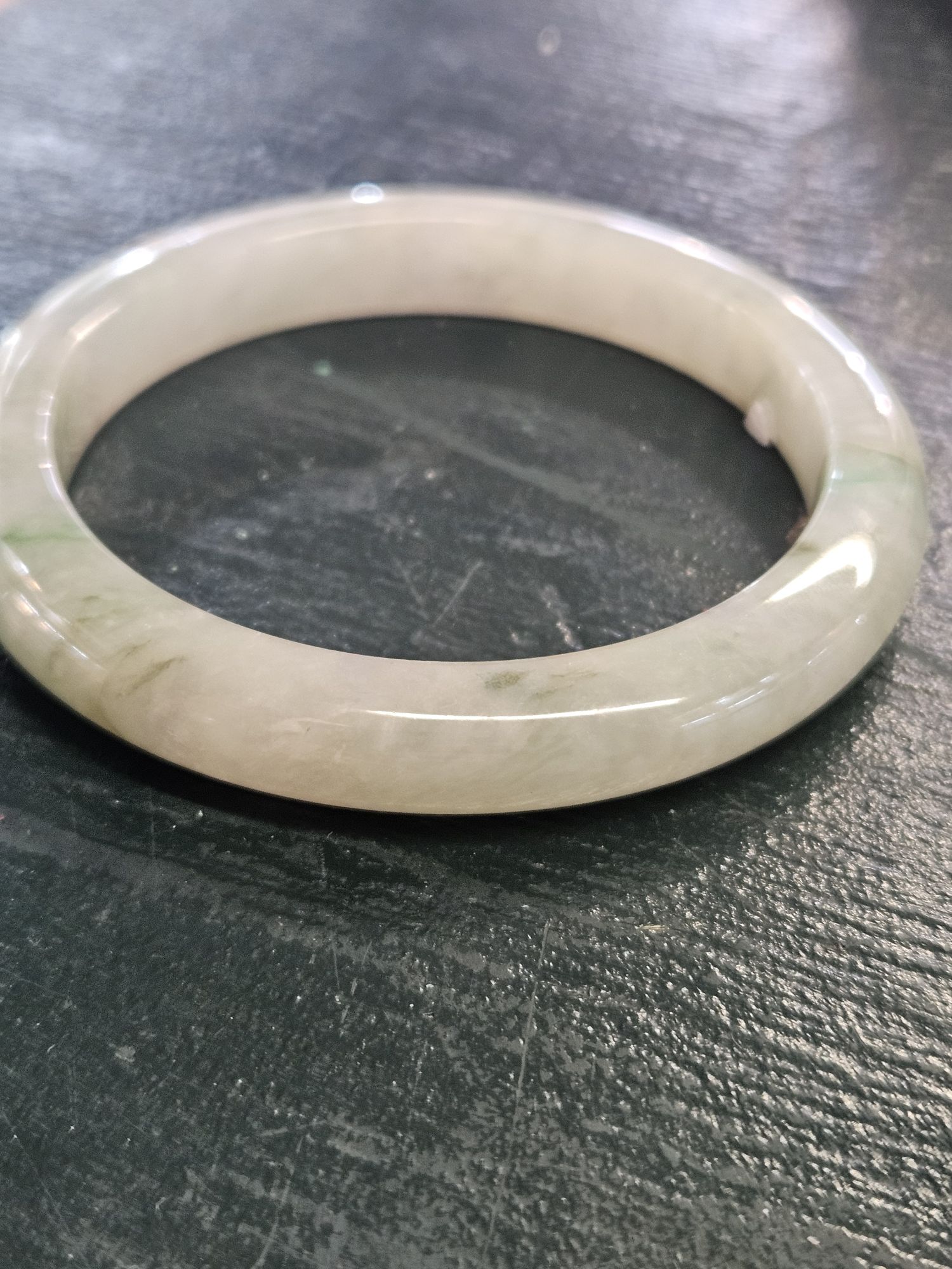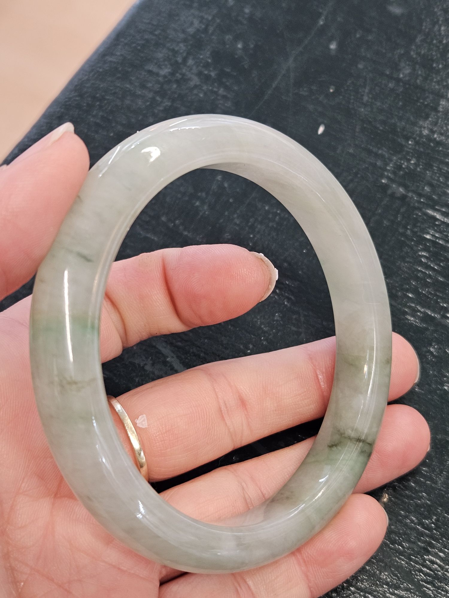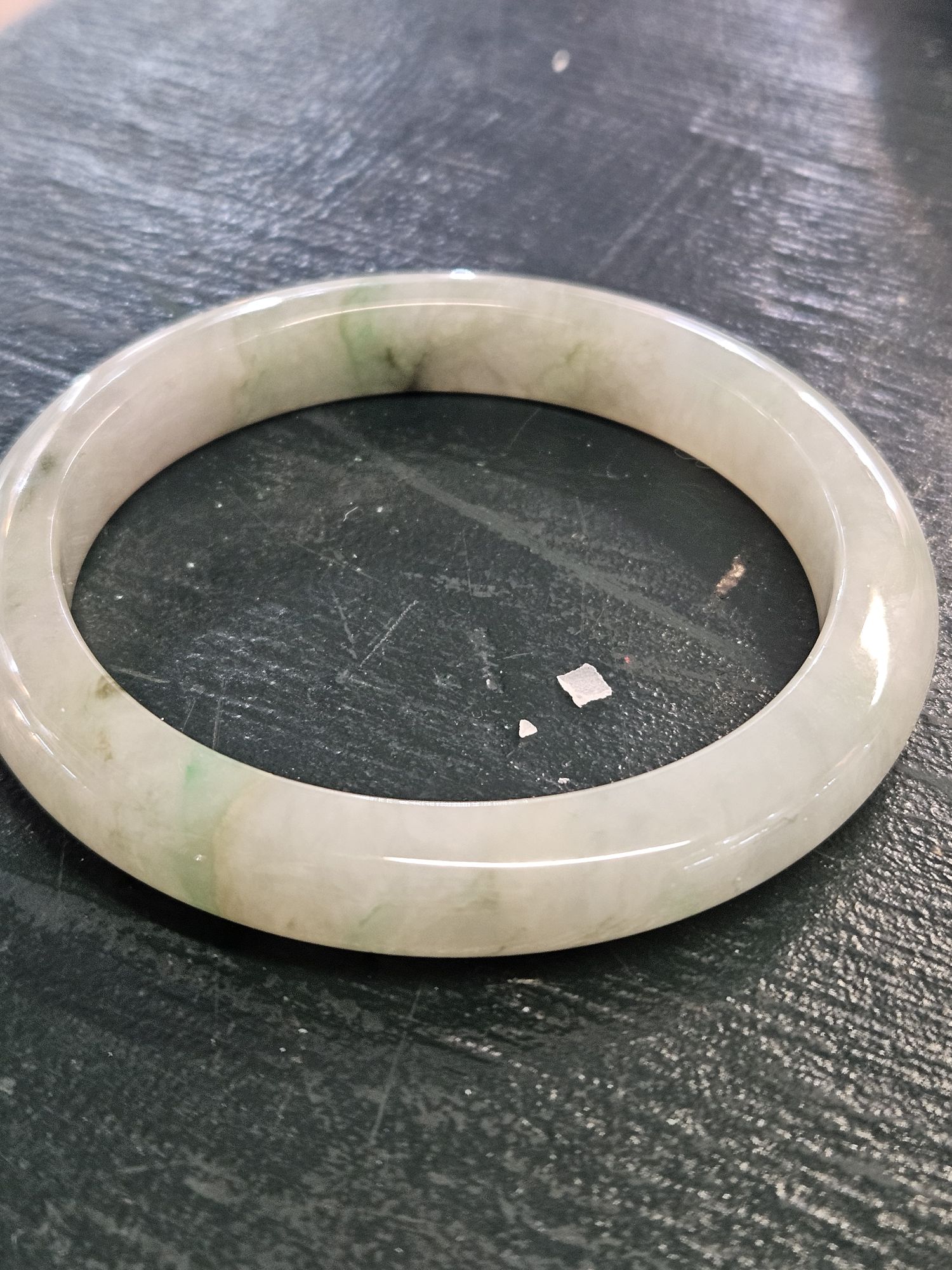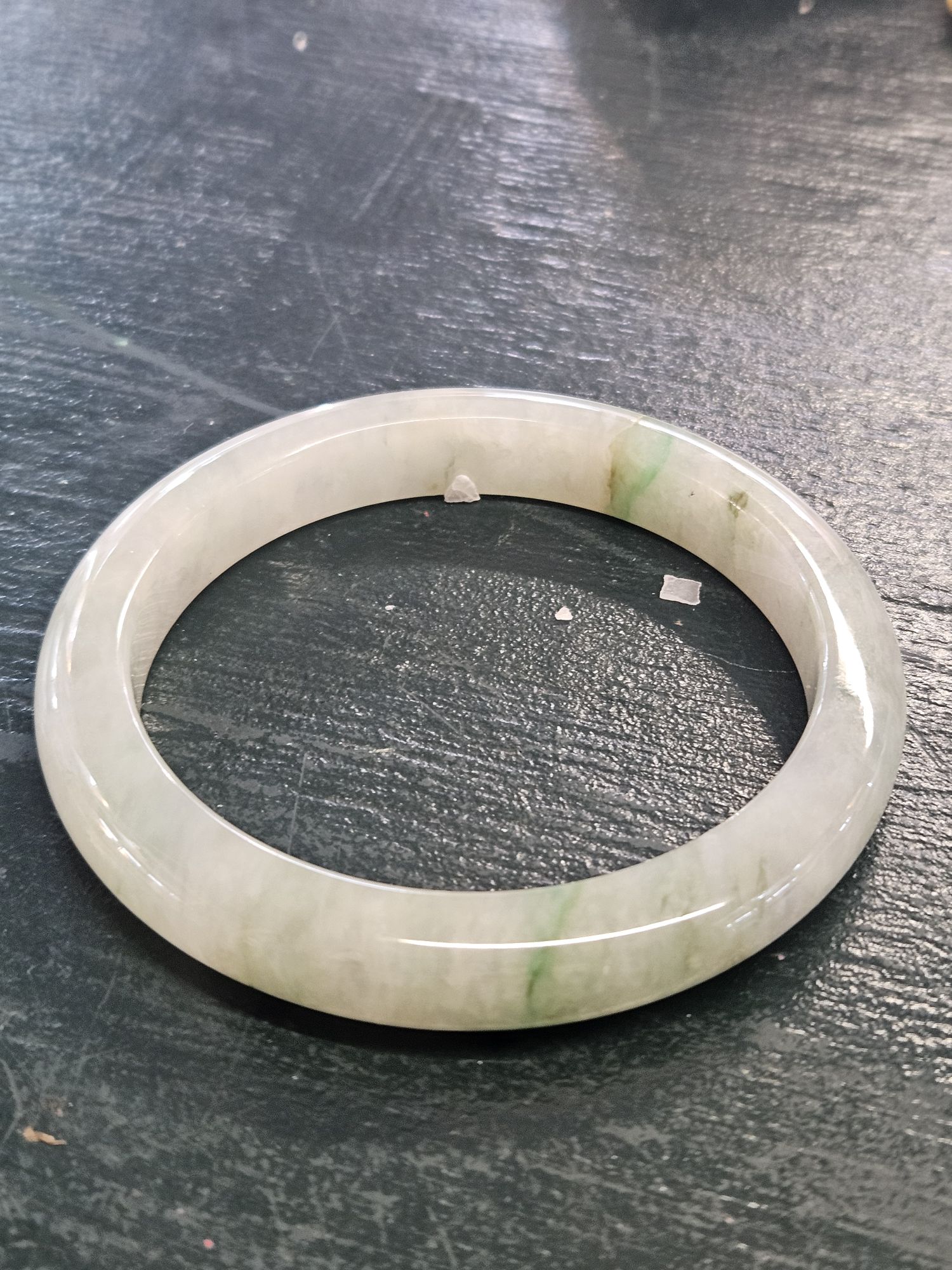 Lovely light green Burmese jadeite bangle with varied green blooms. Measures 61.2 x 10.5 x 9.6mm, weighs 56.65g, comes with a certificate of authenticity £288