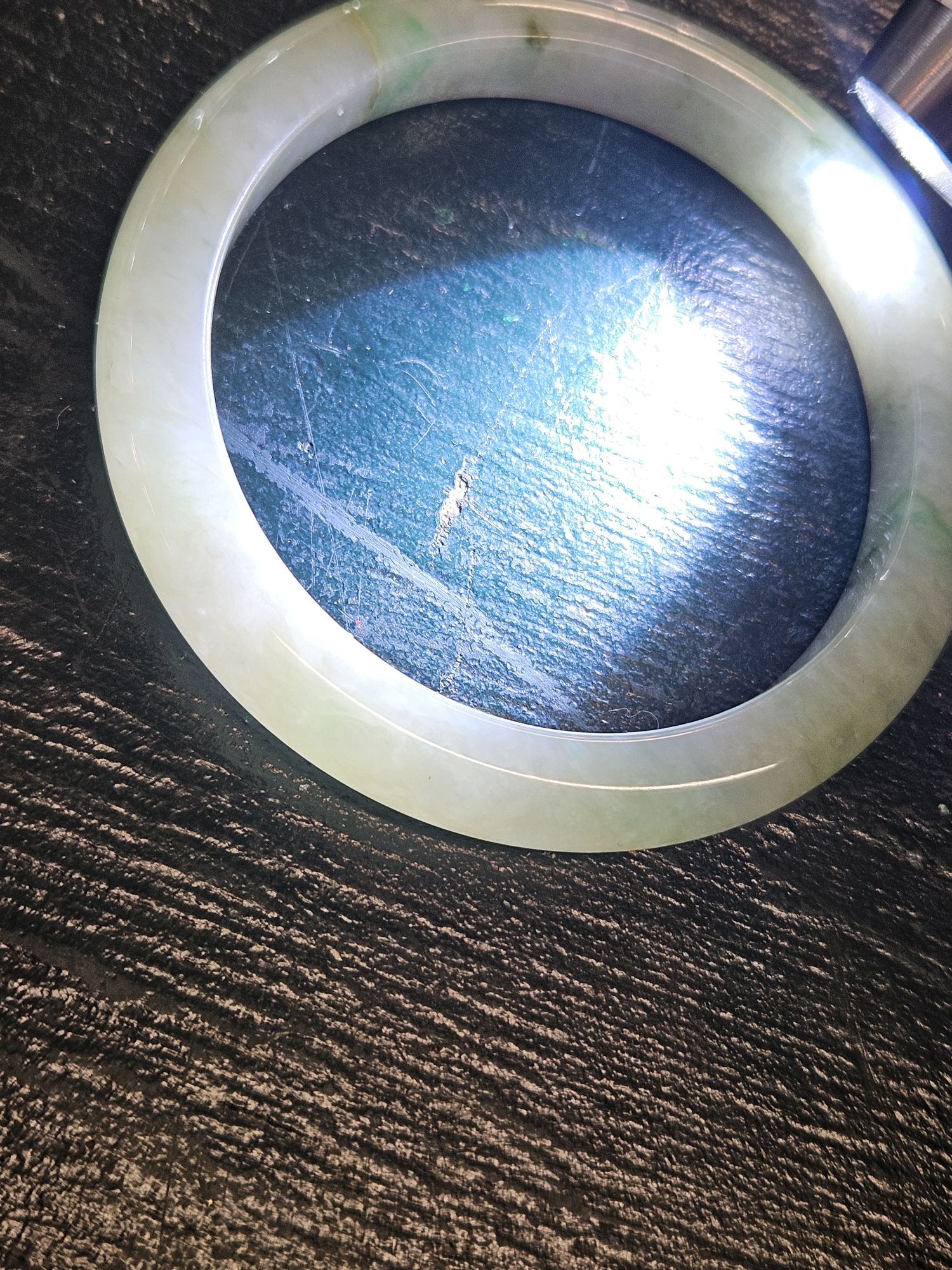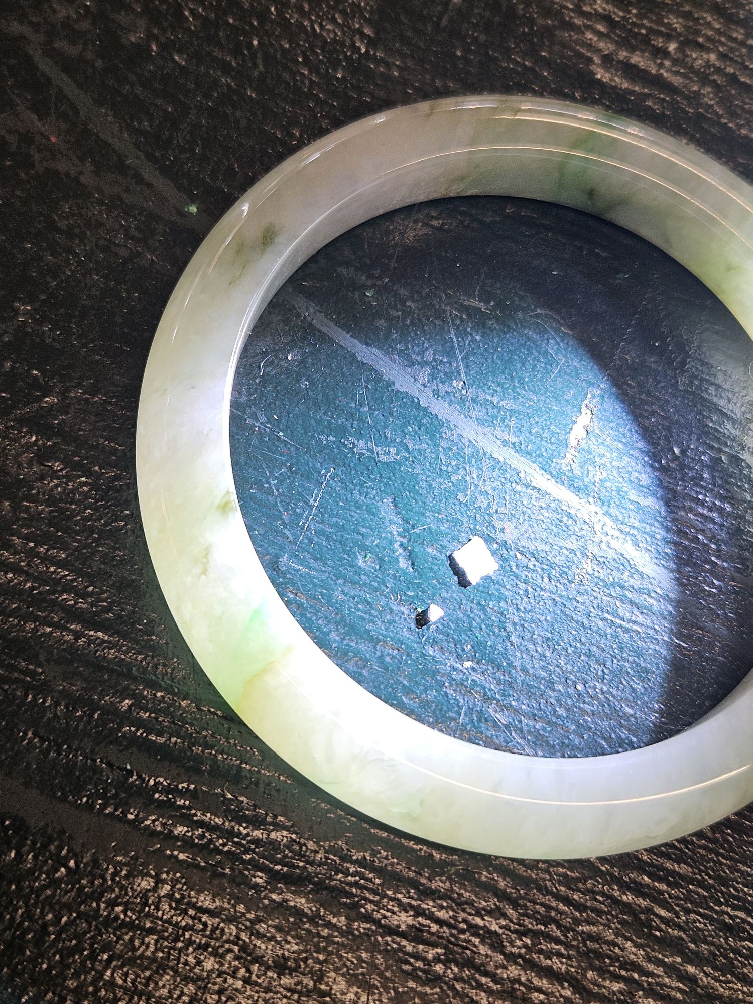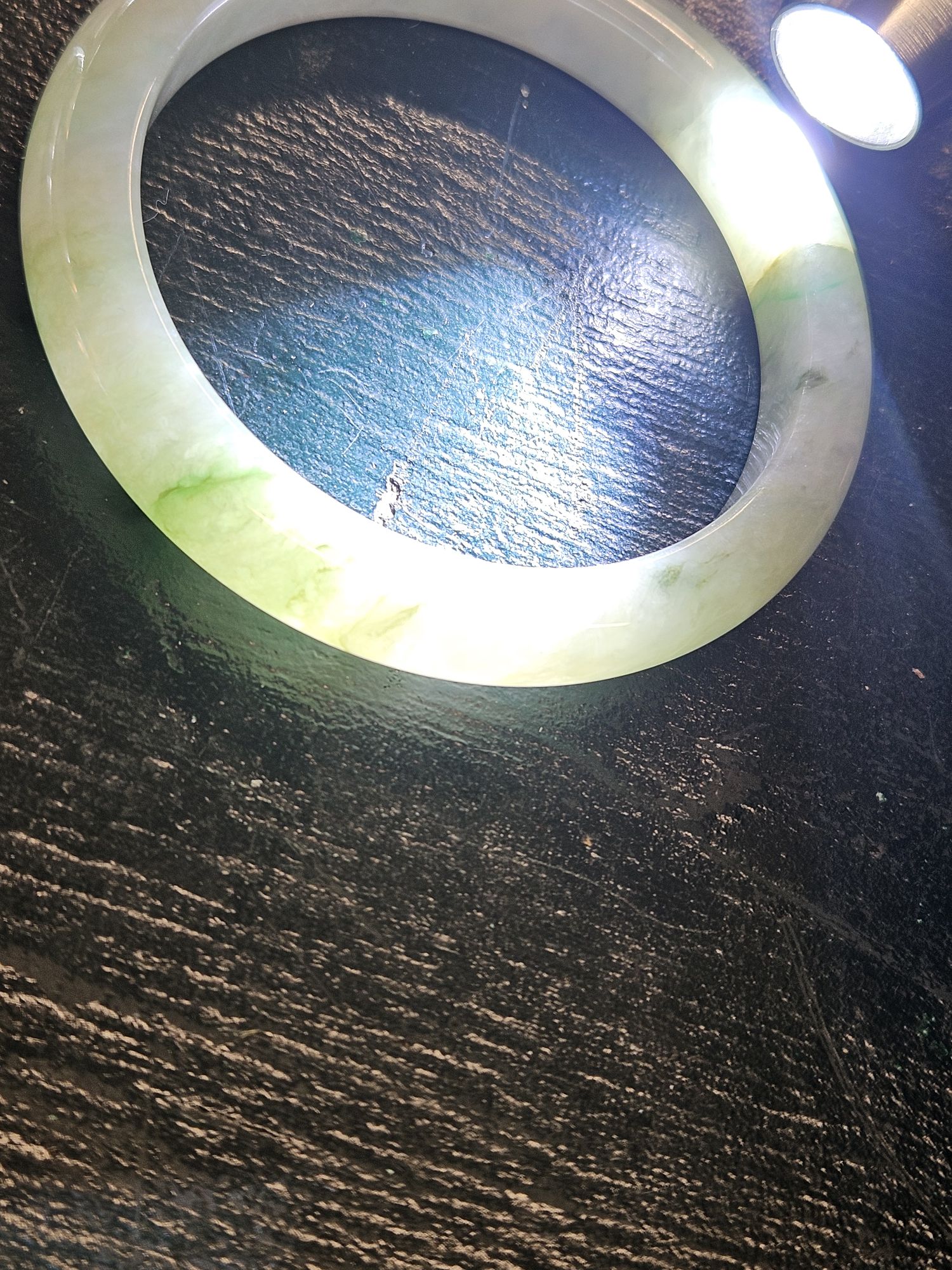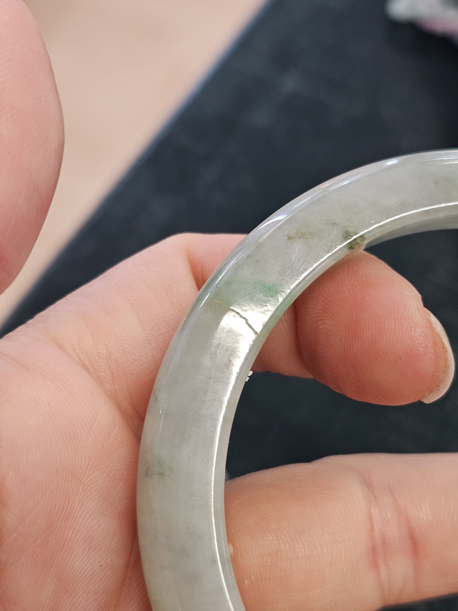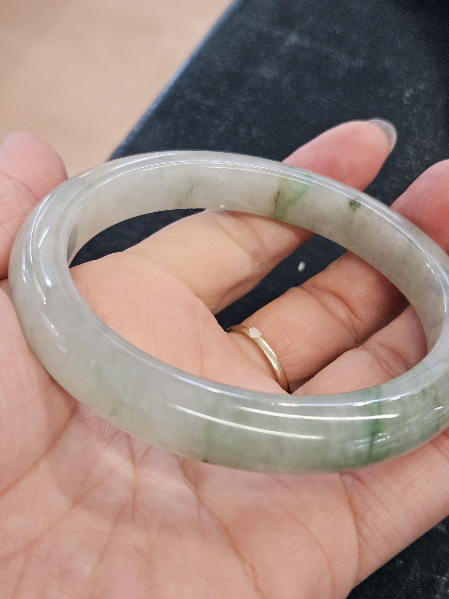 Lovely light green Burmese jadeite bangle with varied green blooms. Measures 61.2 x 10.5 x 9.6mm, weighs 56.65g, comes with a certificate of authenticity £288