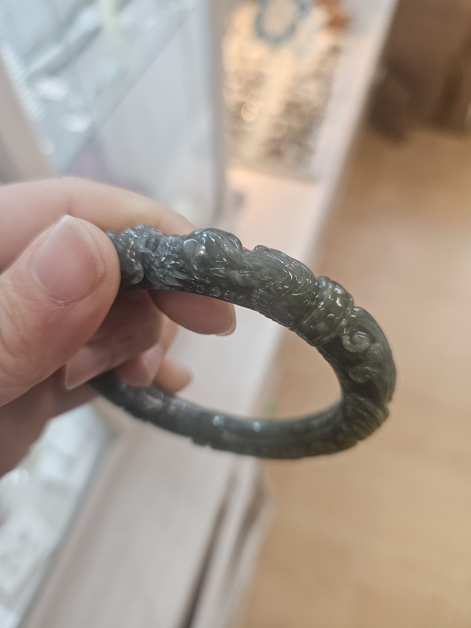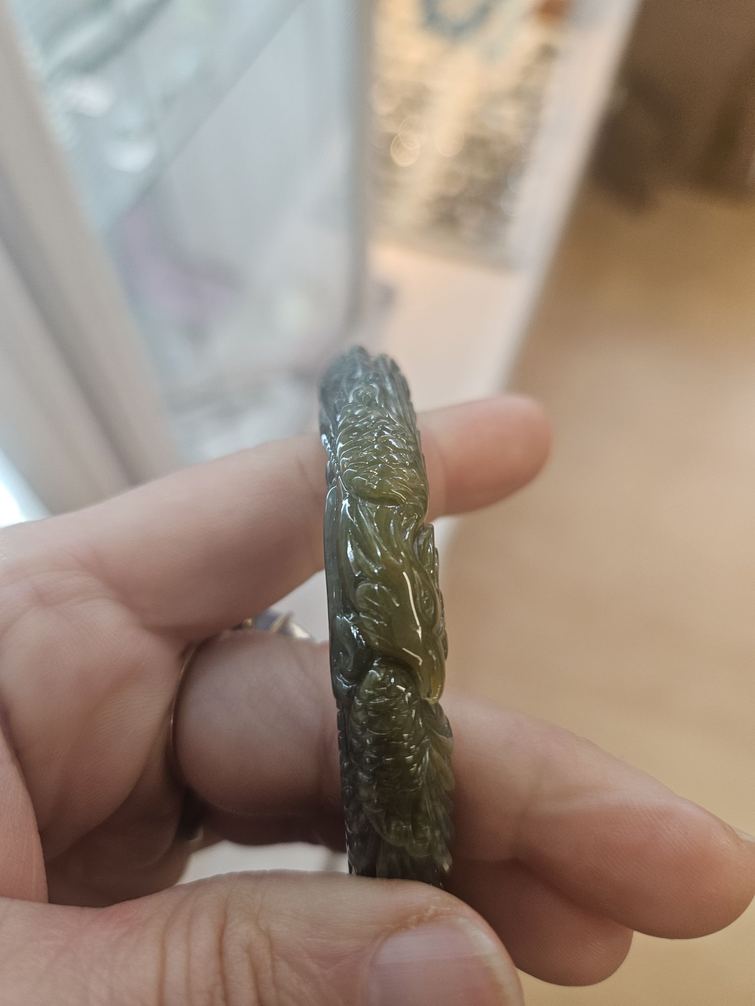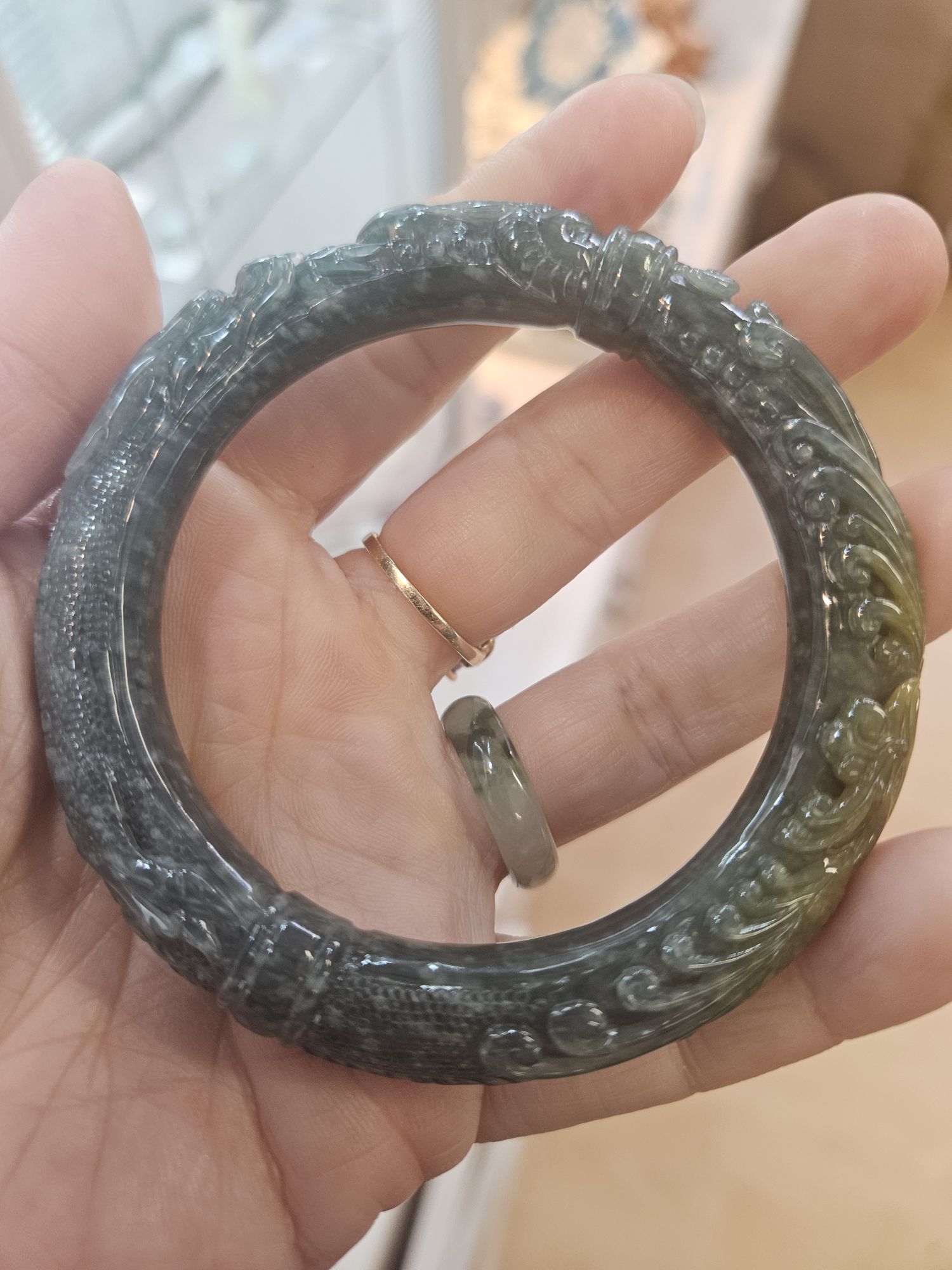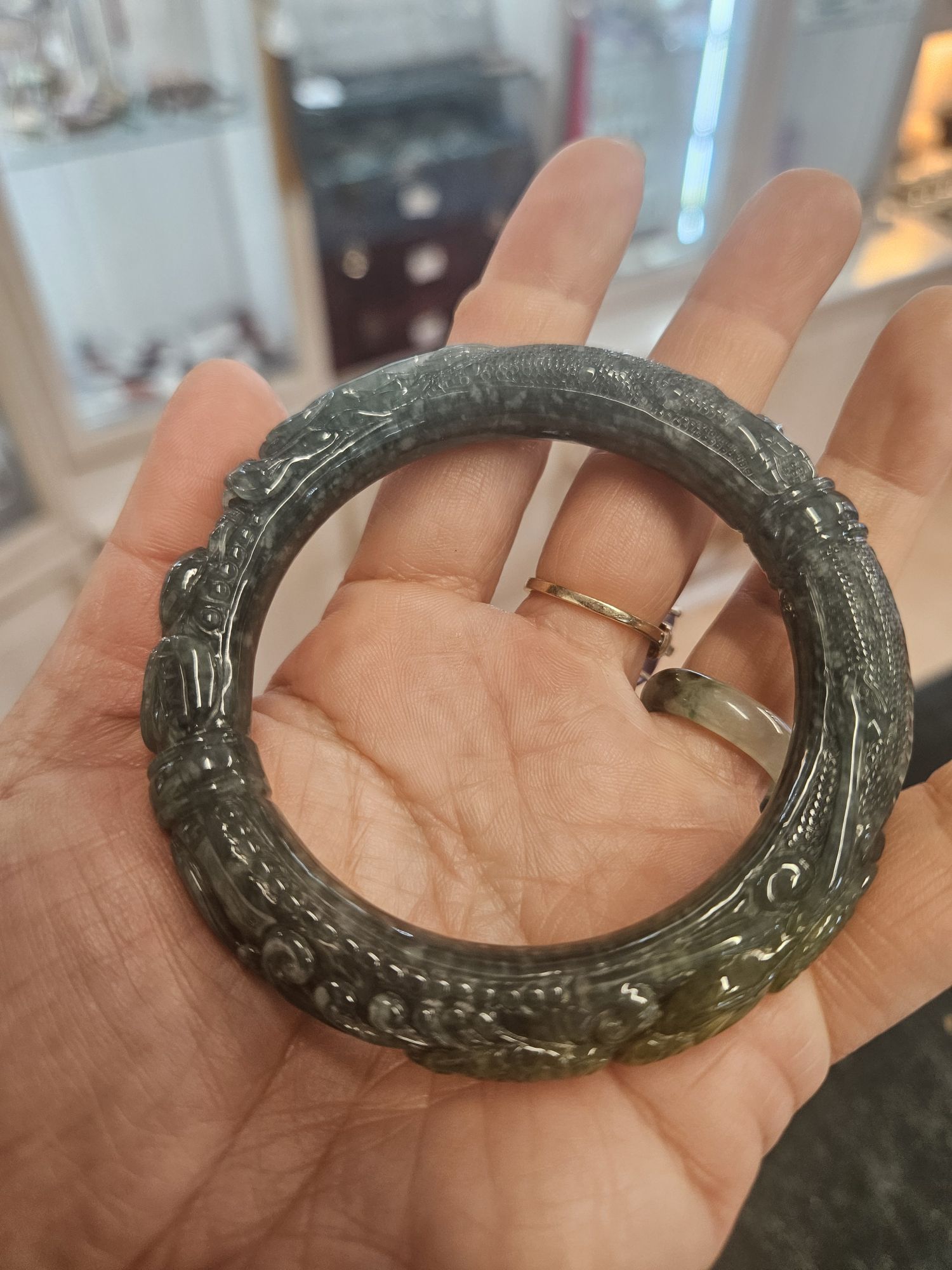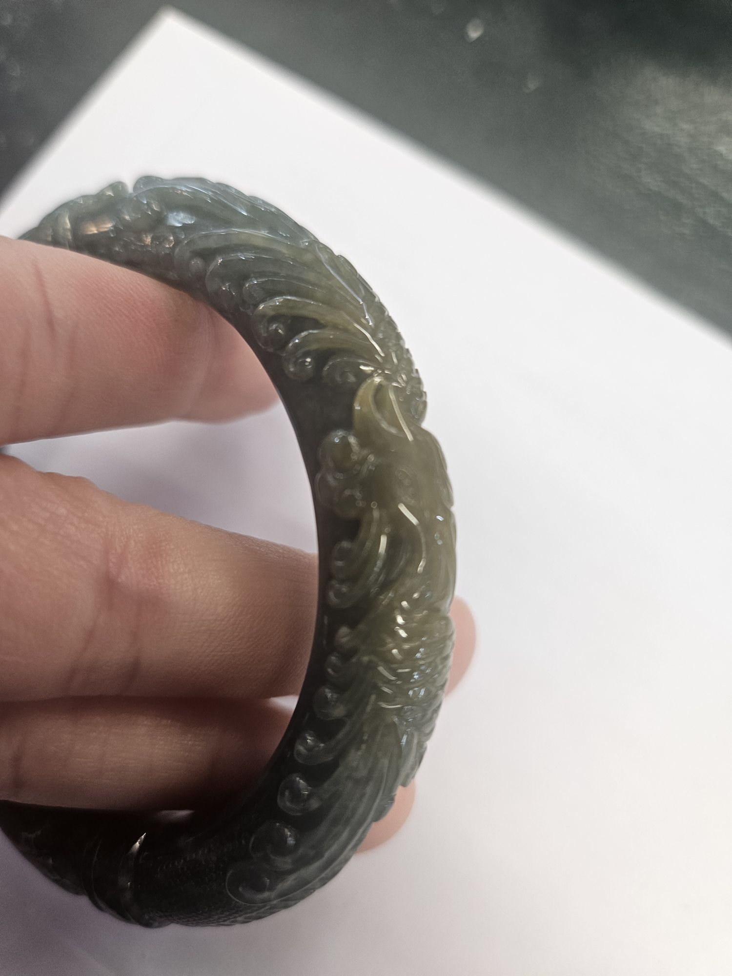 Made of Guatemala jadeite, fits up to 58mm, measures 56.8 x 10.3 x 11.2, weighs 58.71g, comes with a certificate of authenticity.