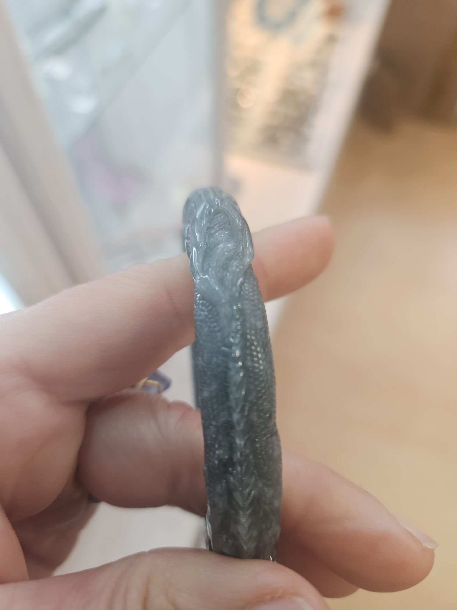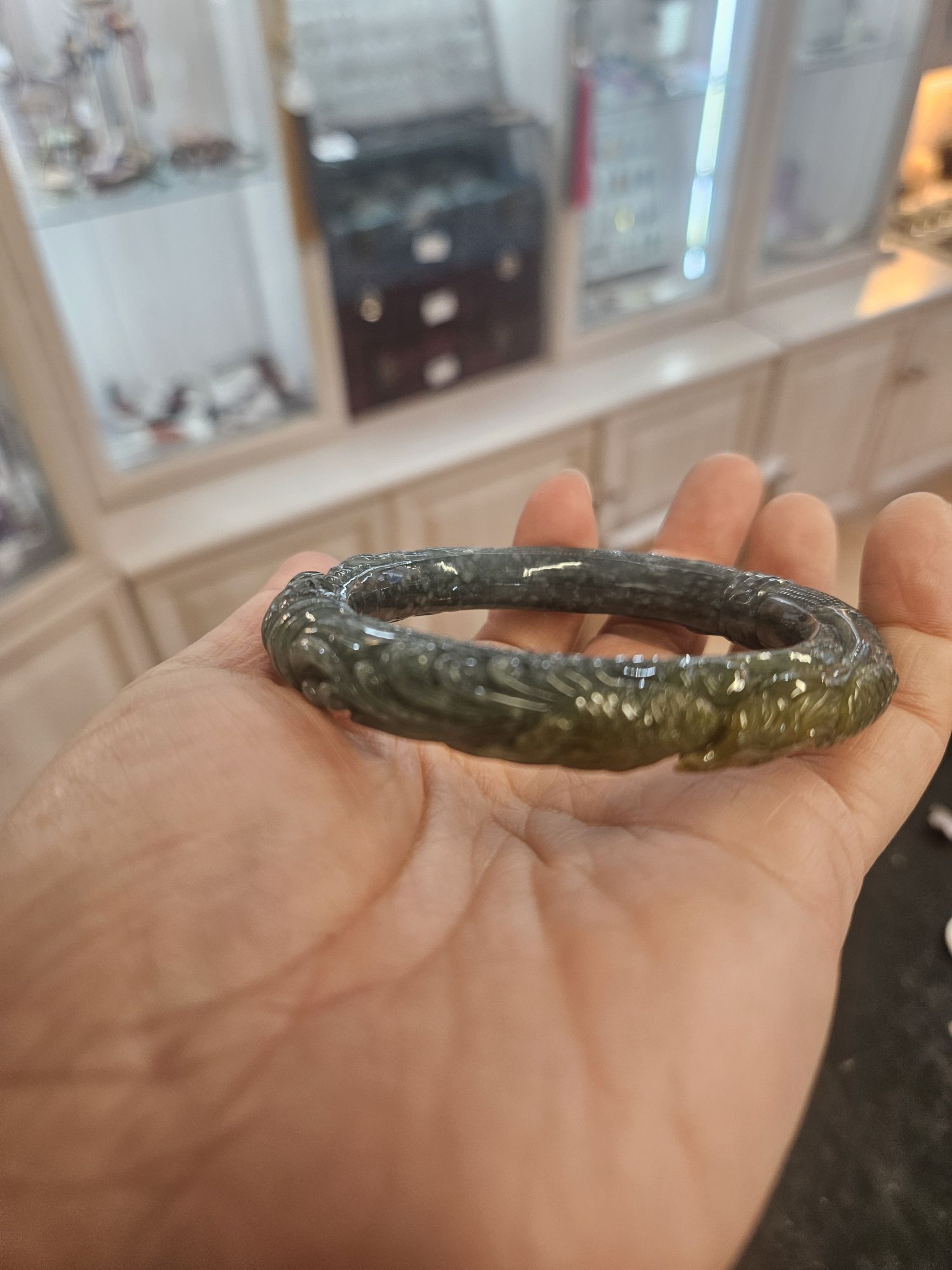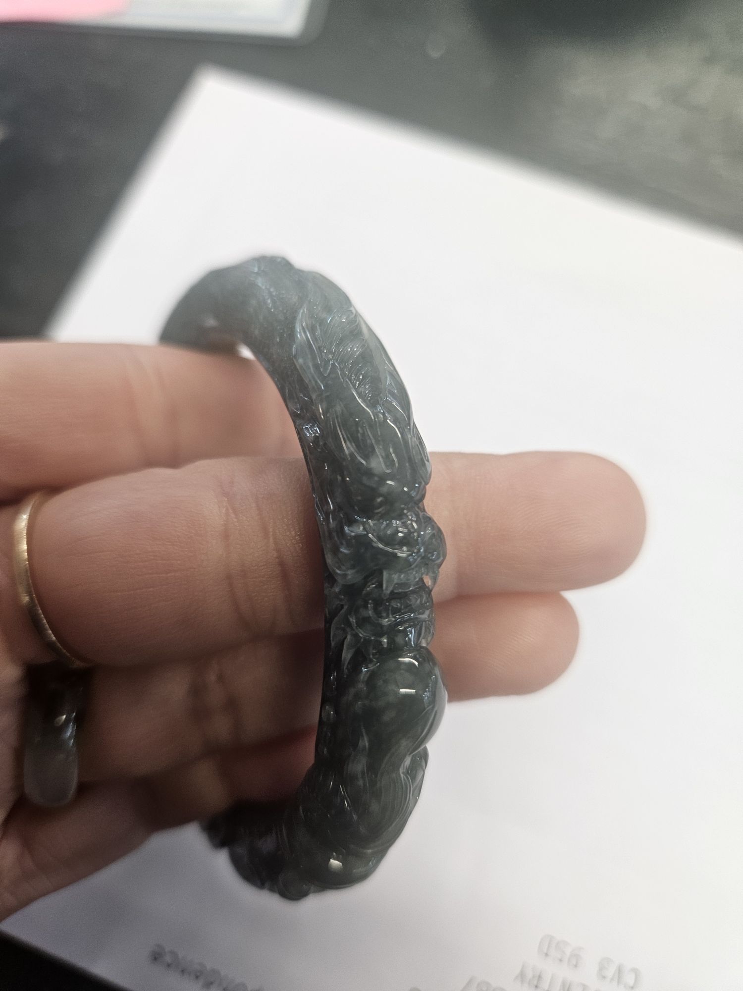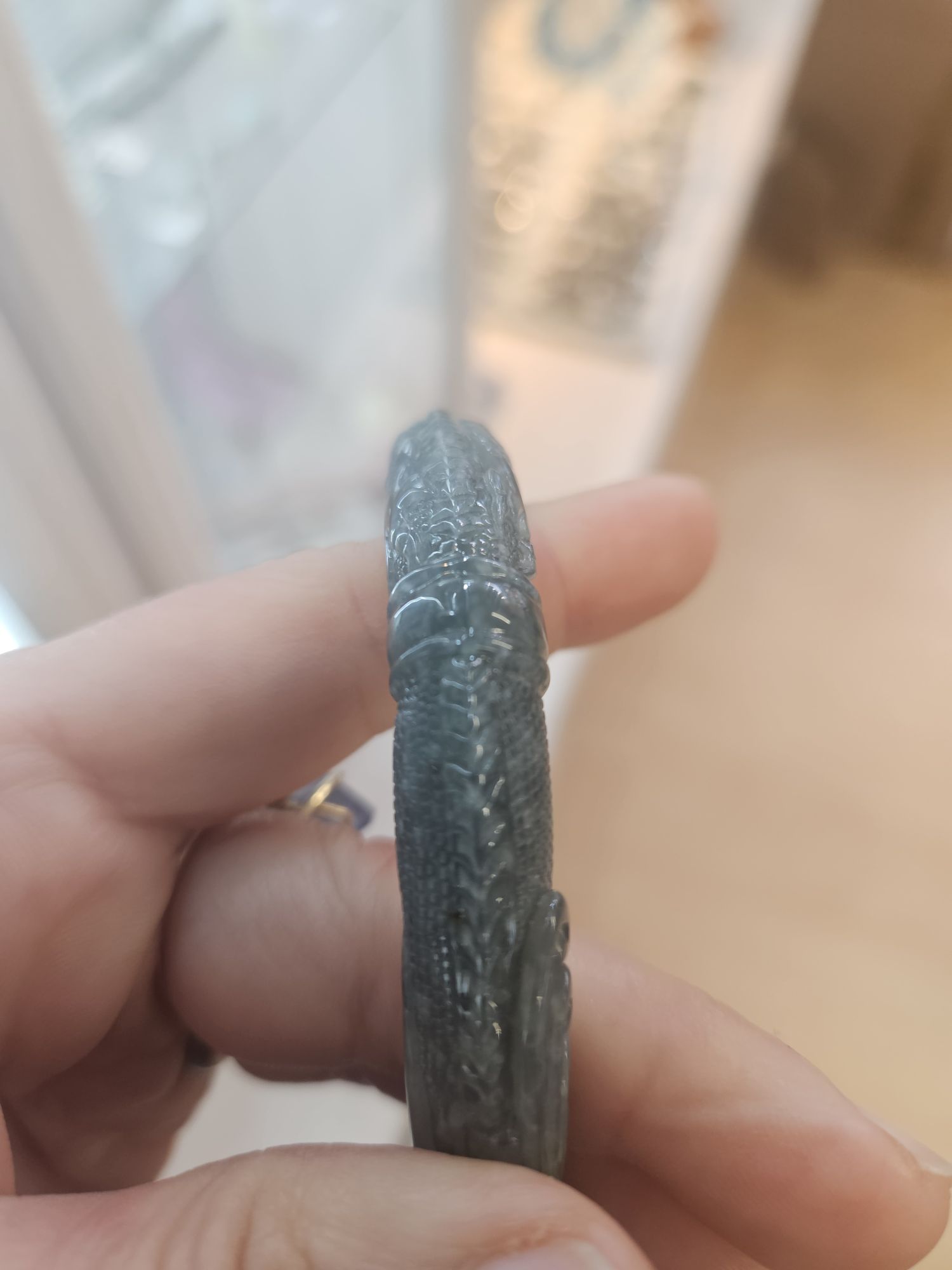 Made of Guatemala jadeite, fits up to 58mm, measures 56.8 x 10.3 x 11.2, weighs 58.71g, comes with a certificate of authenticity.