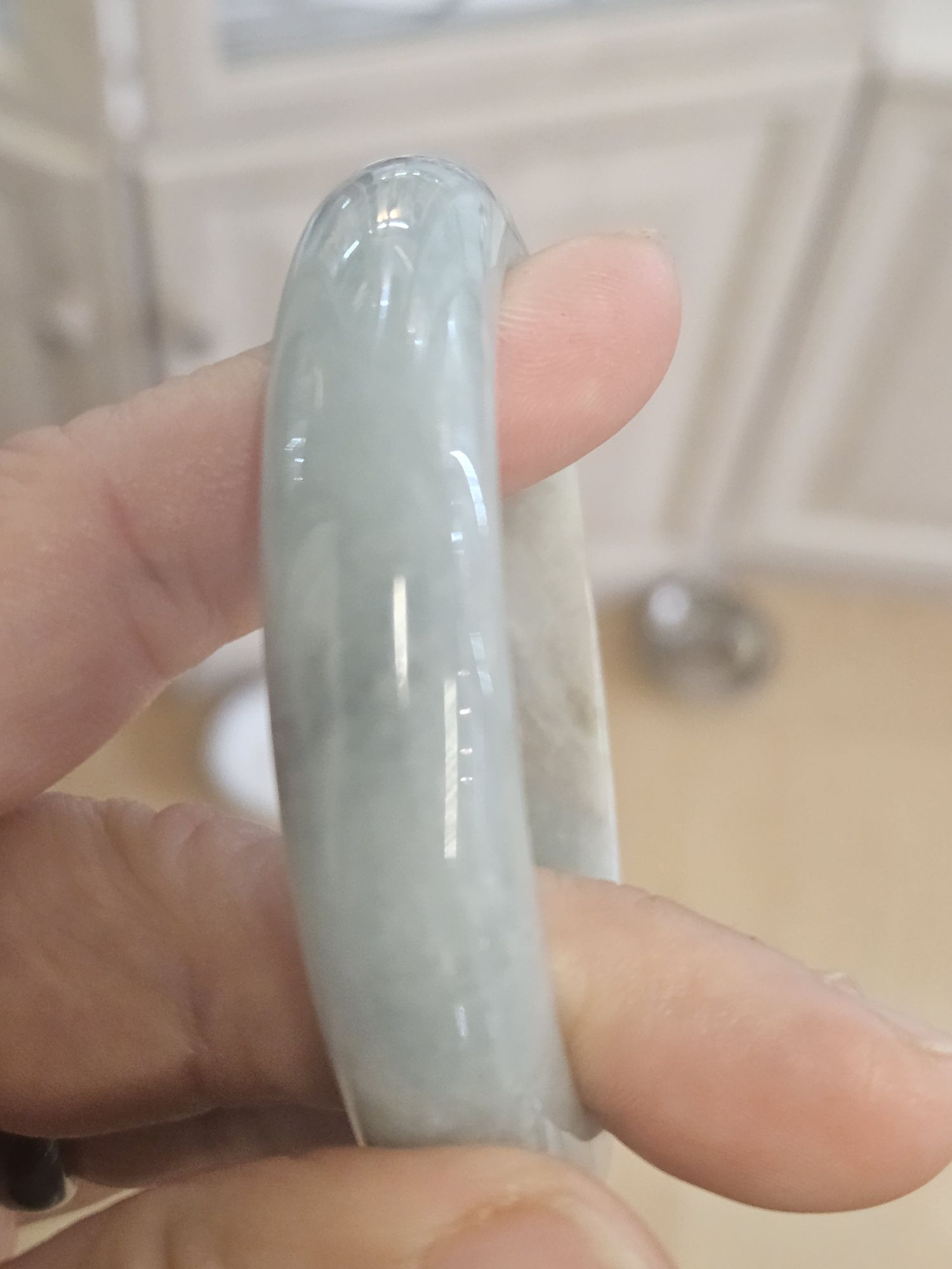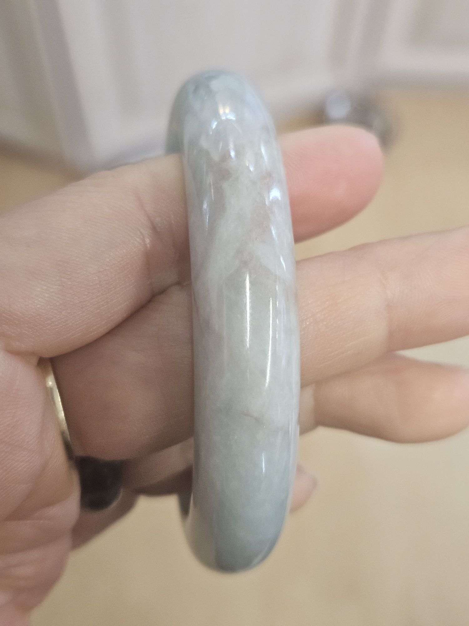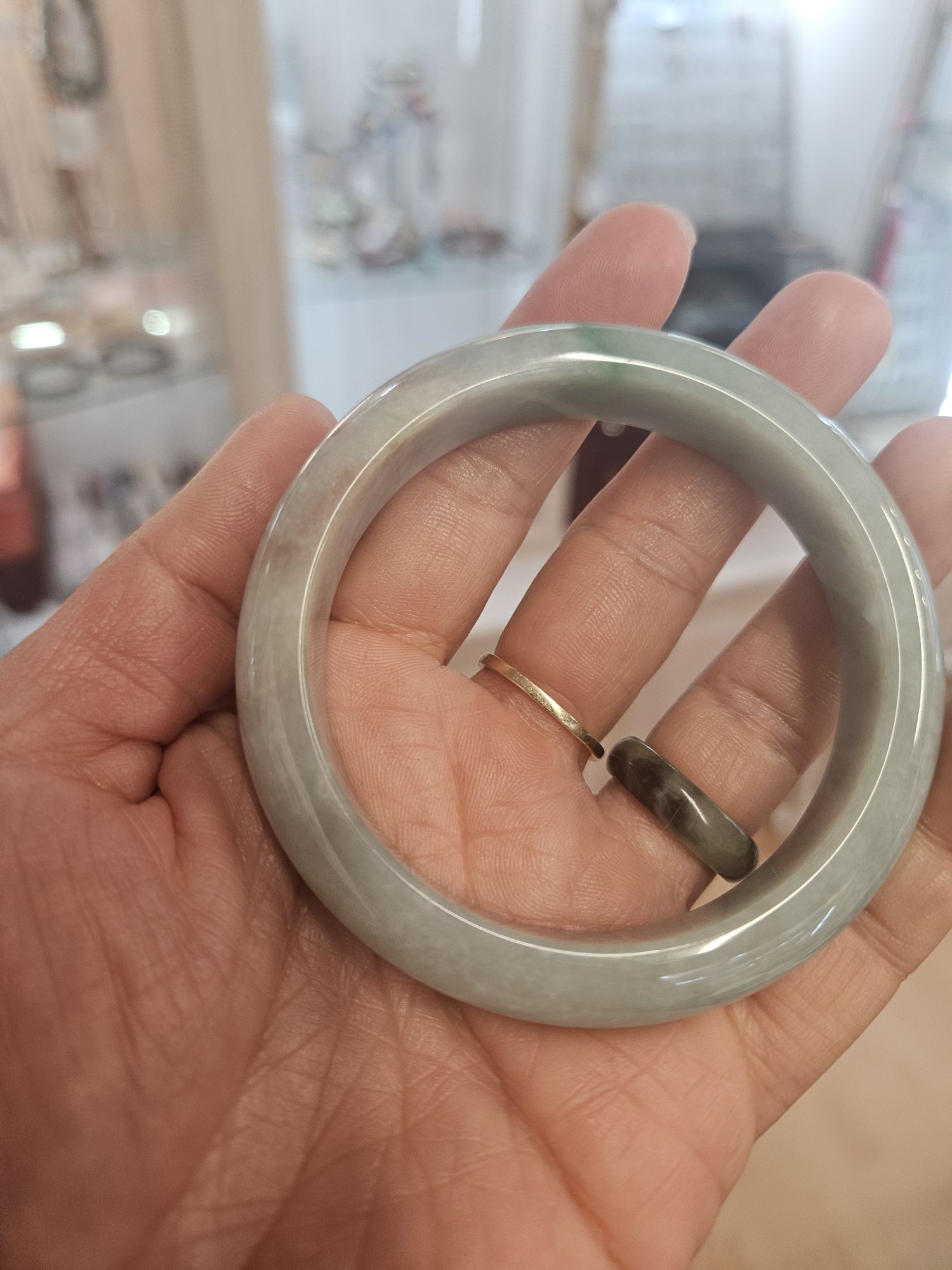 Lovely light green Burmese jadeite bangle with a ray of apple green and splash of red. The natural beauty of the stone is enhanced by the careful craftsmanship, creating a seamless and comfortable fit. Measures 56 x 12.9 x 8.3mm, weighs 56.88g, comes with a certificate of authenticity