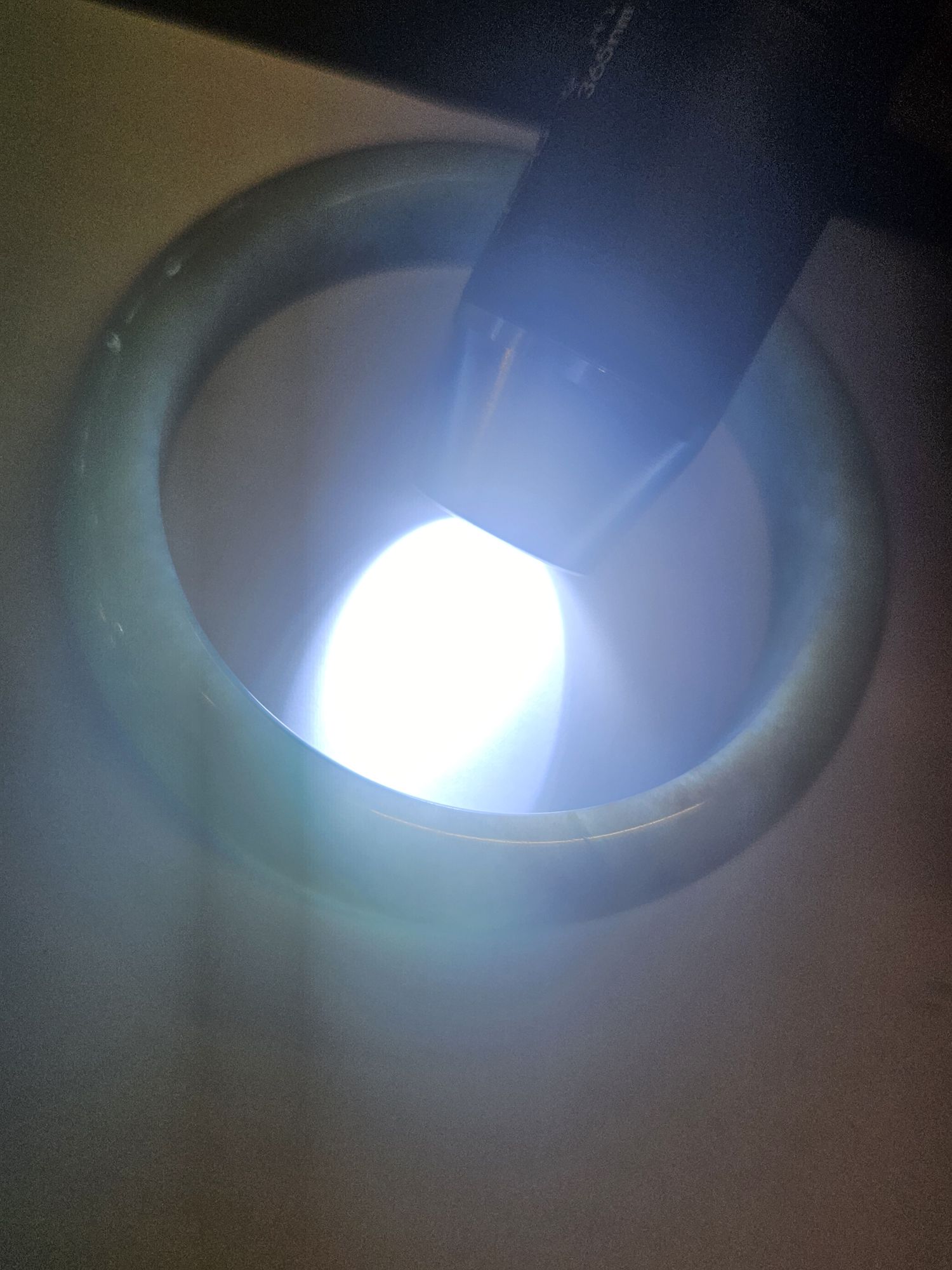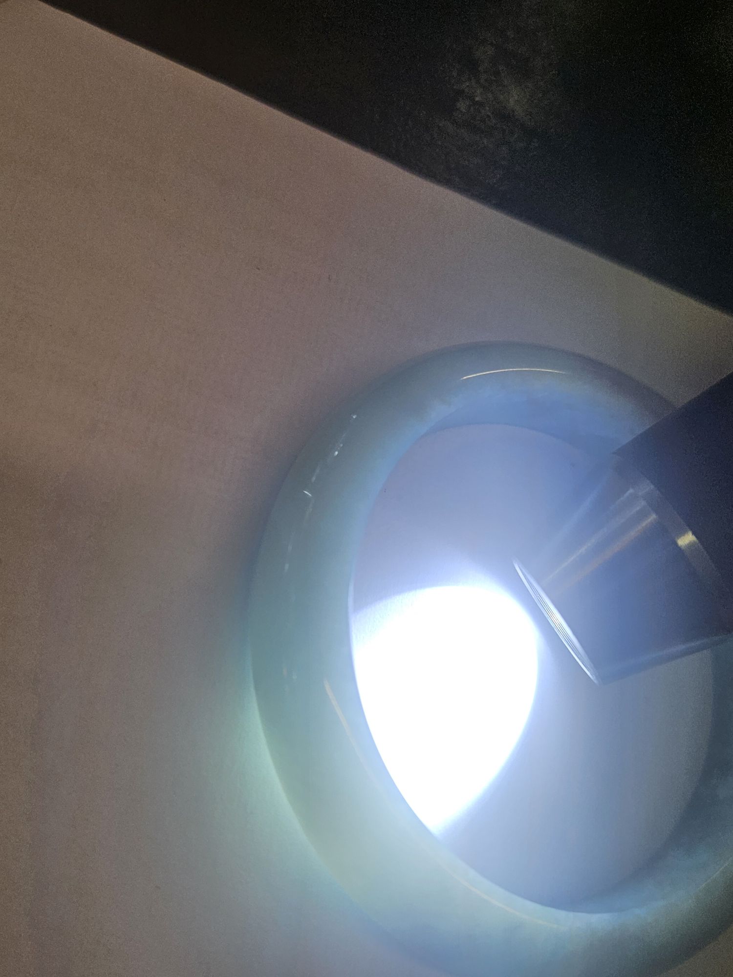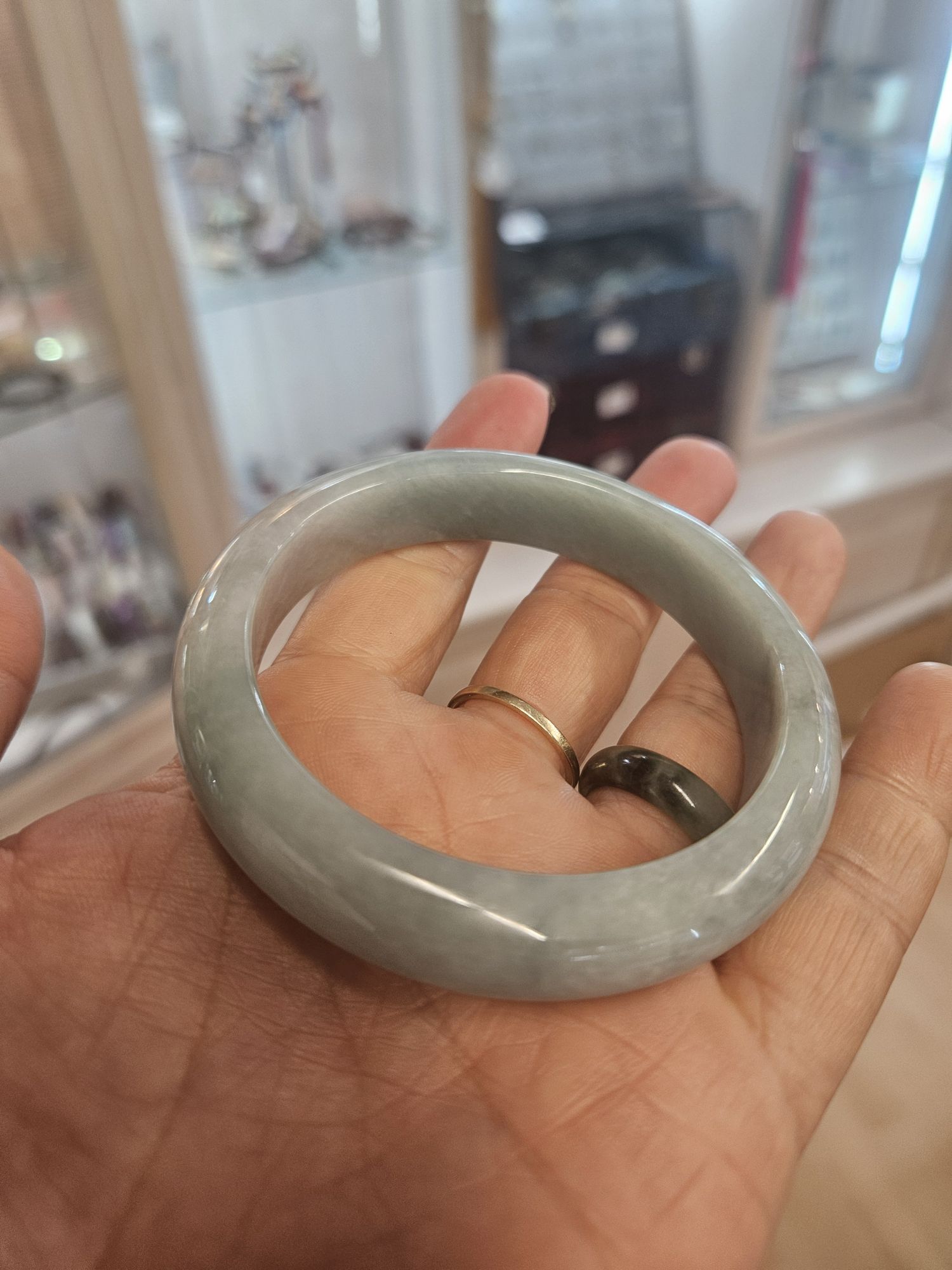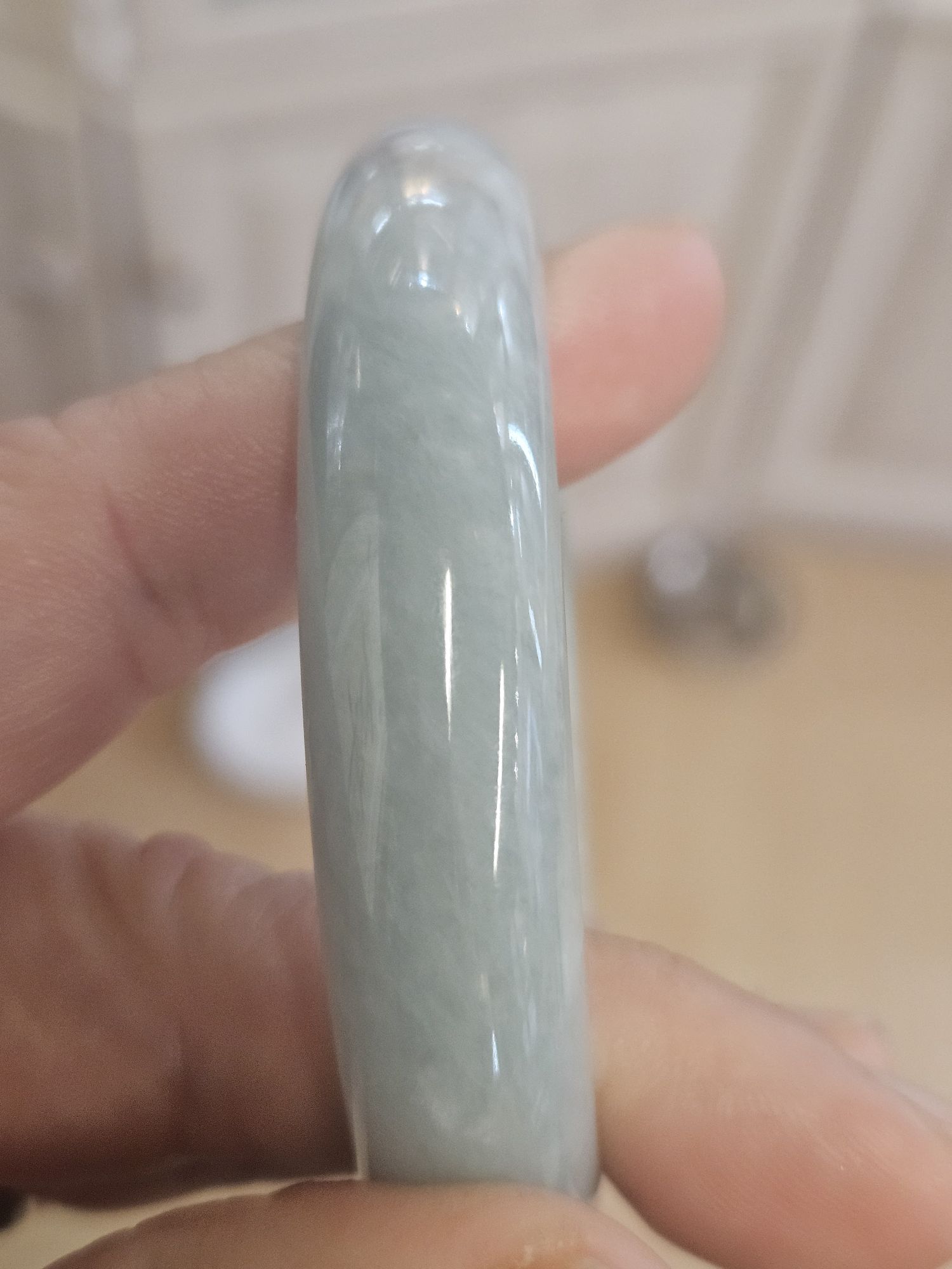 Lovely light green Burmese jadeite bangle with a ray of apple green and splash of red. The natural beauty of the stone is enhanced by the careful craftsmanship, creating a seamless and comfortable fit. Measures 56 x 12.9 x 8.3mm, weighs 56.88g, comes with a certificate of authenticity