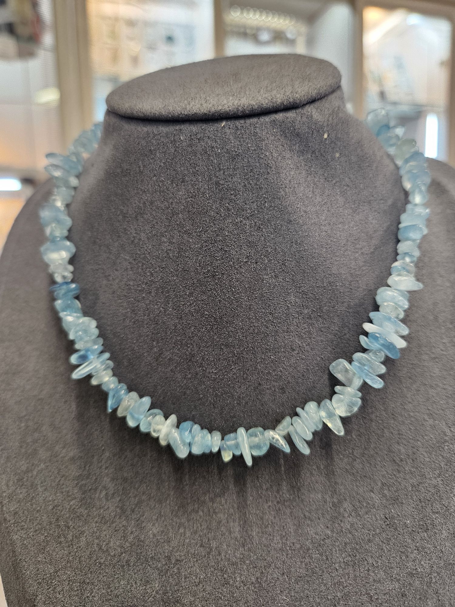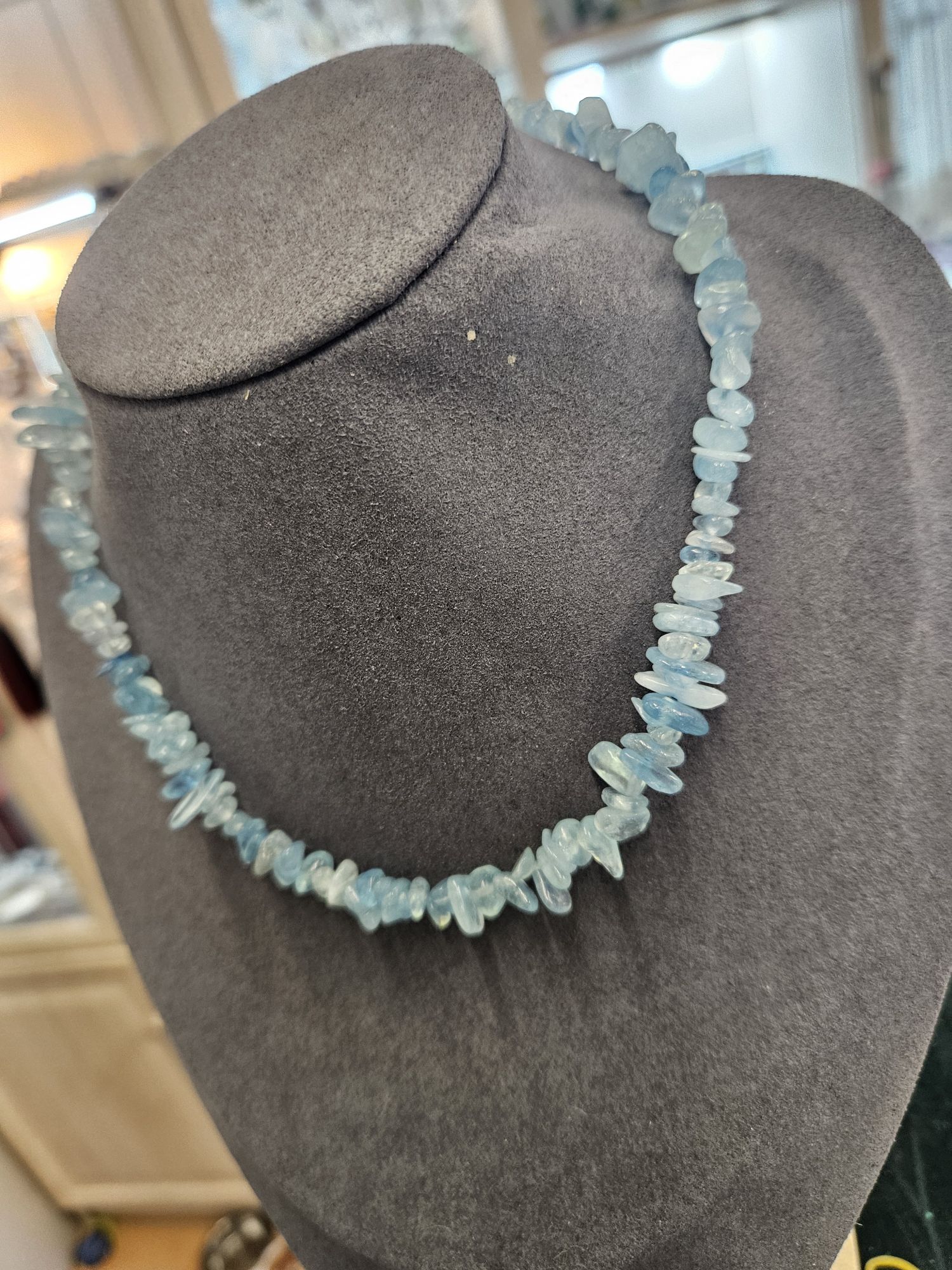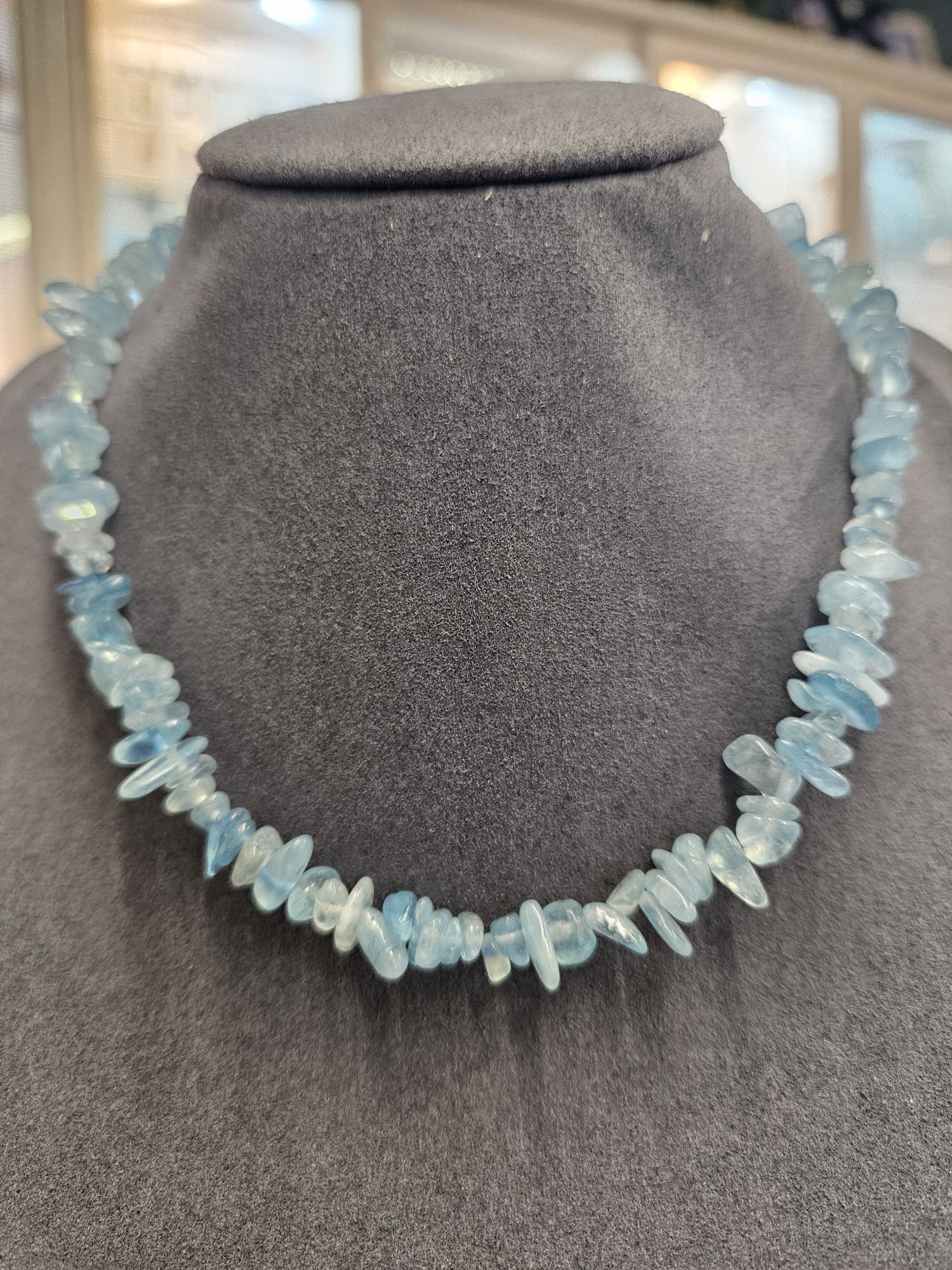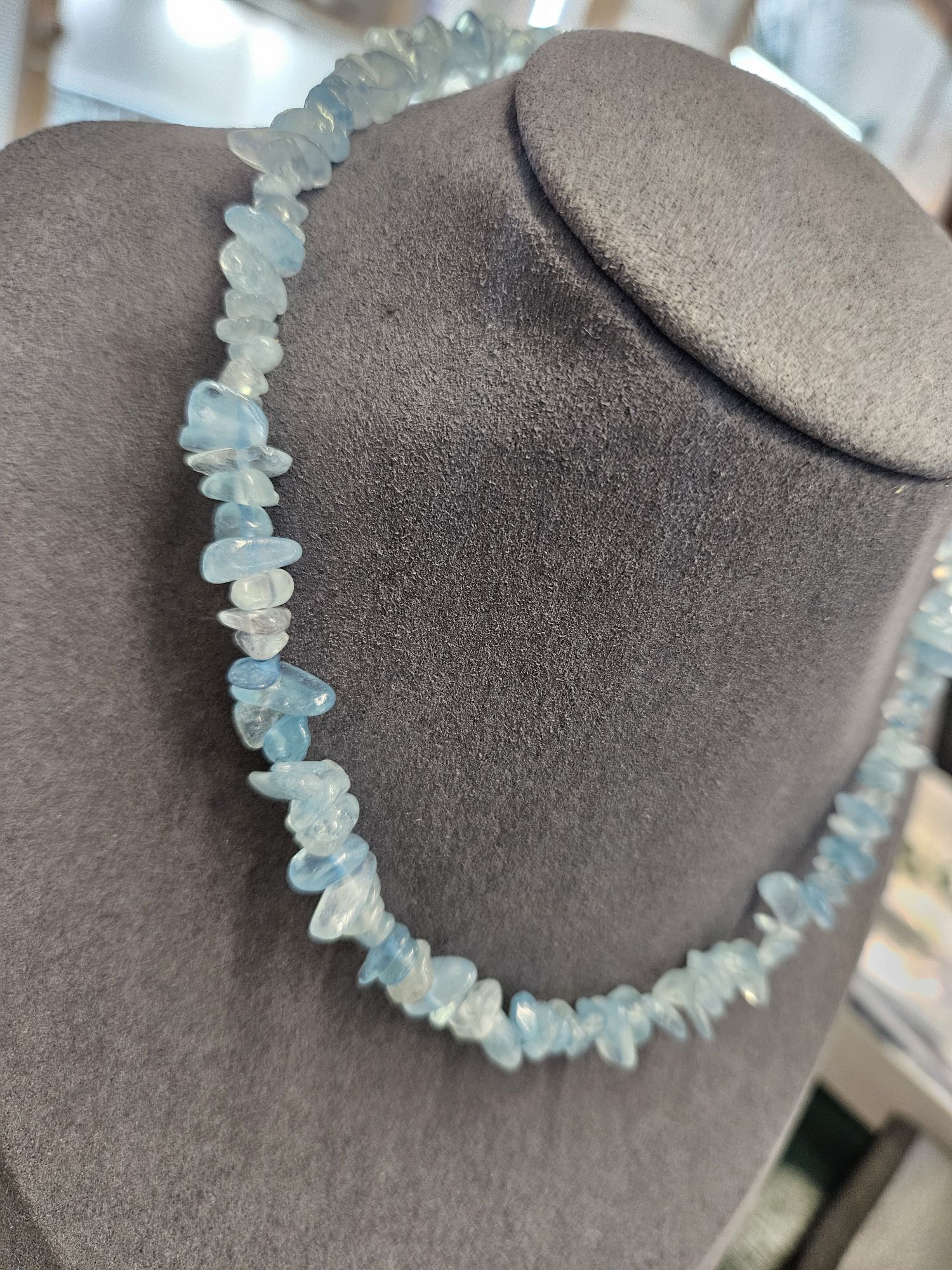 Fits up to 17inches with the extender, beautiful necklace made of natural aquamarine chips.