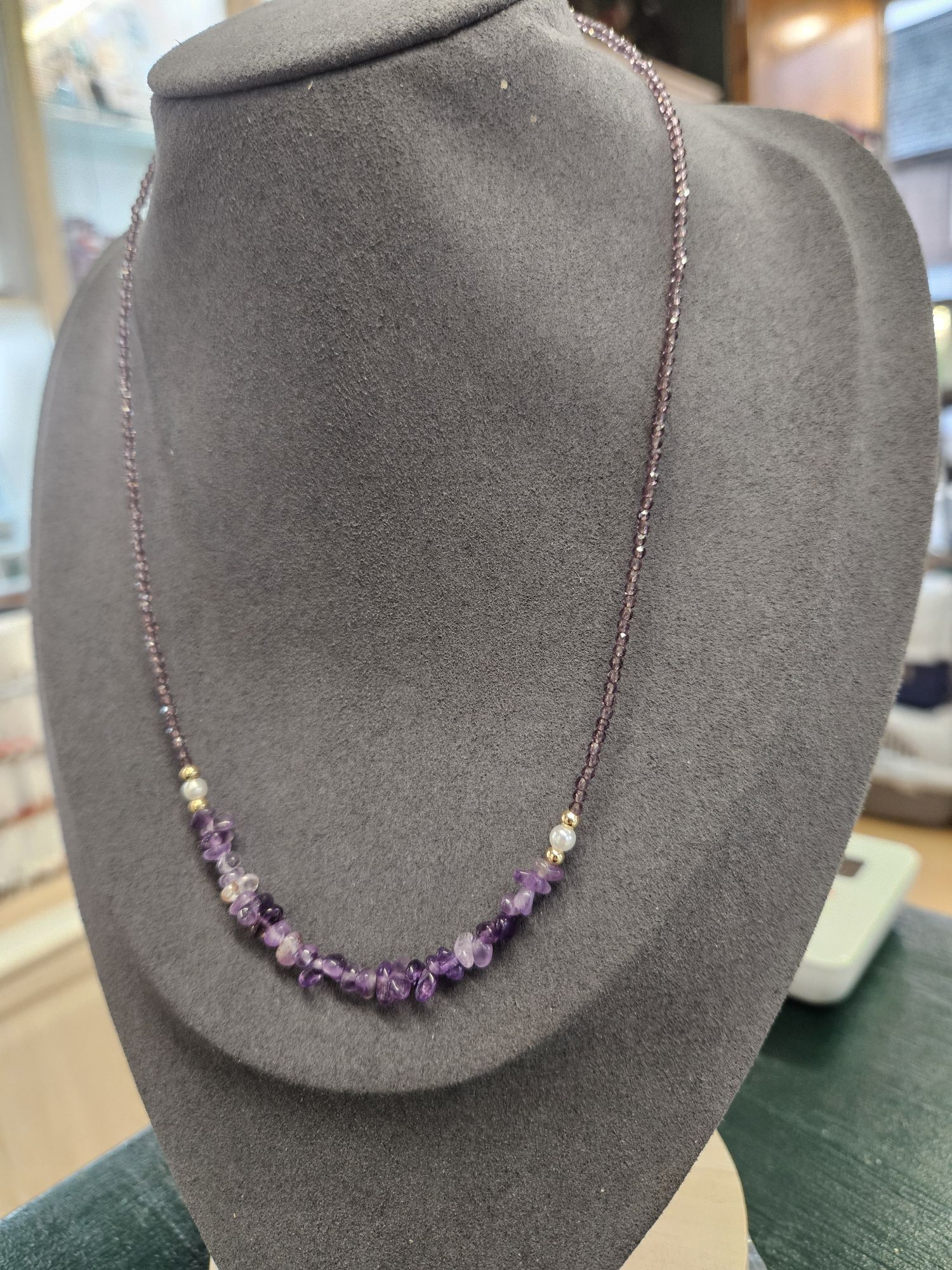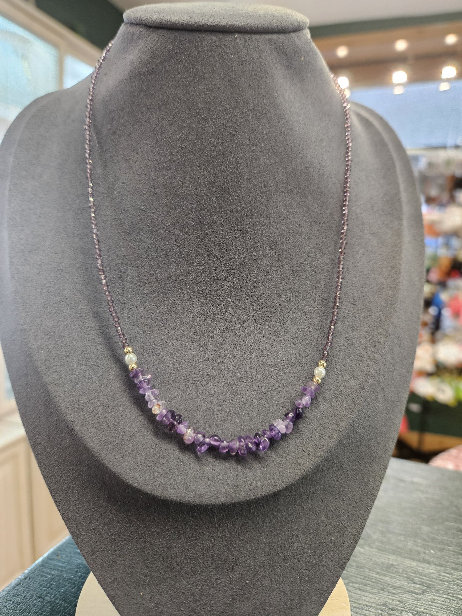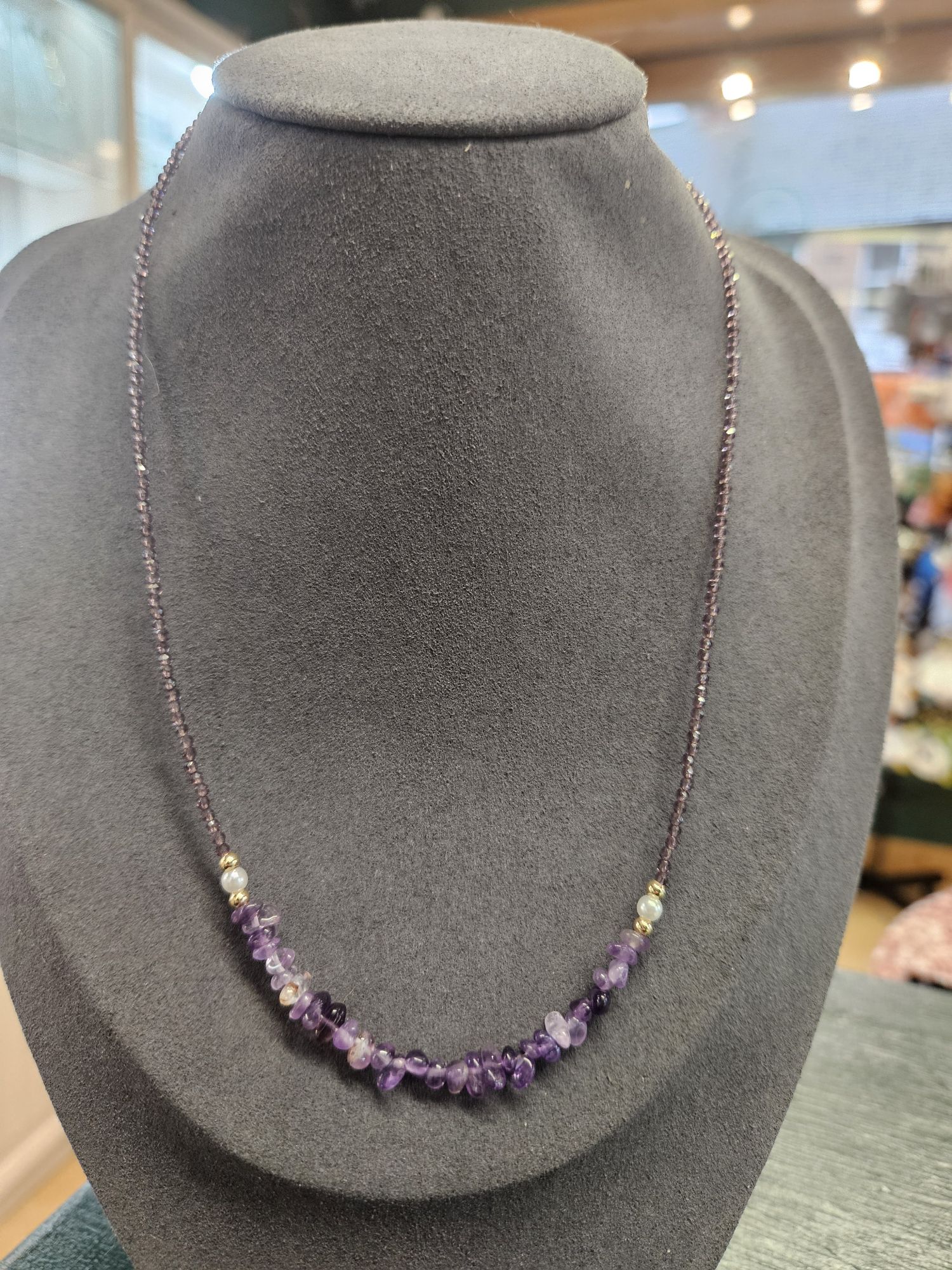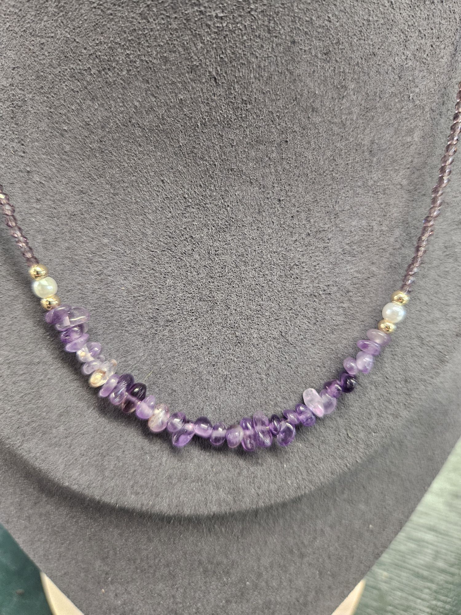 This is a gorgeous necklace made up of 2.3mm Amethyst beads, 2 shell pearls and amethyst chips.